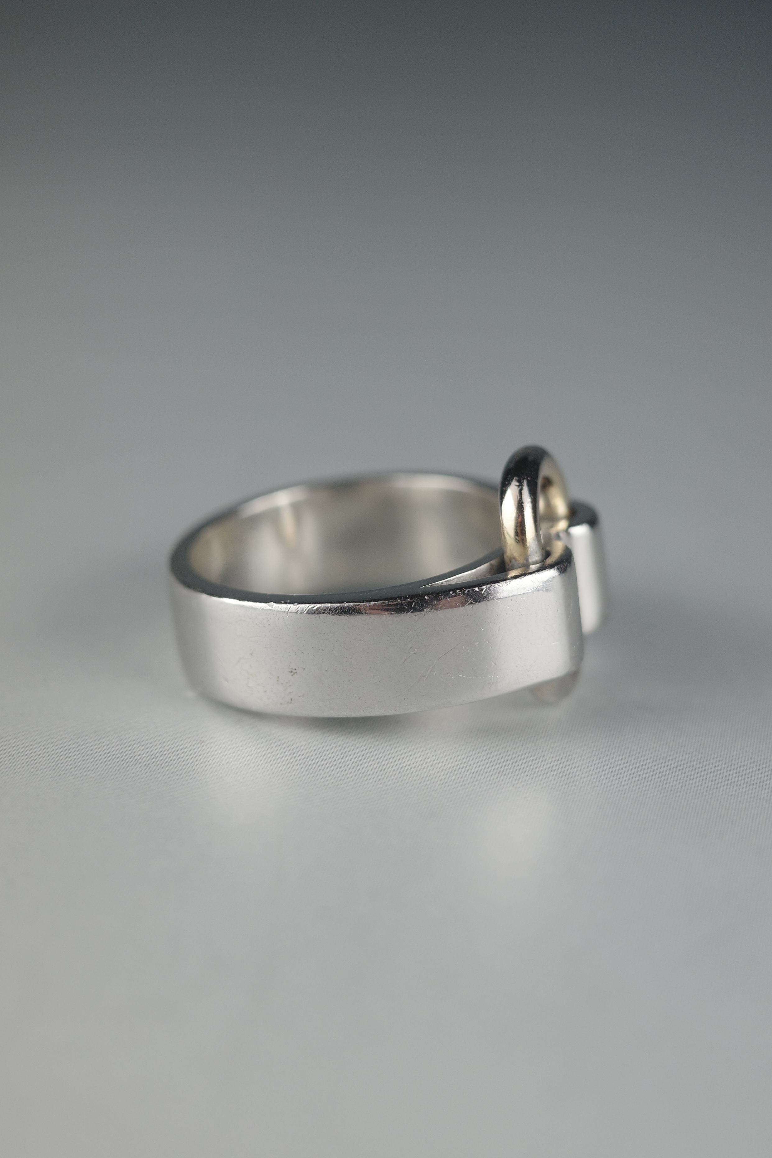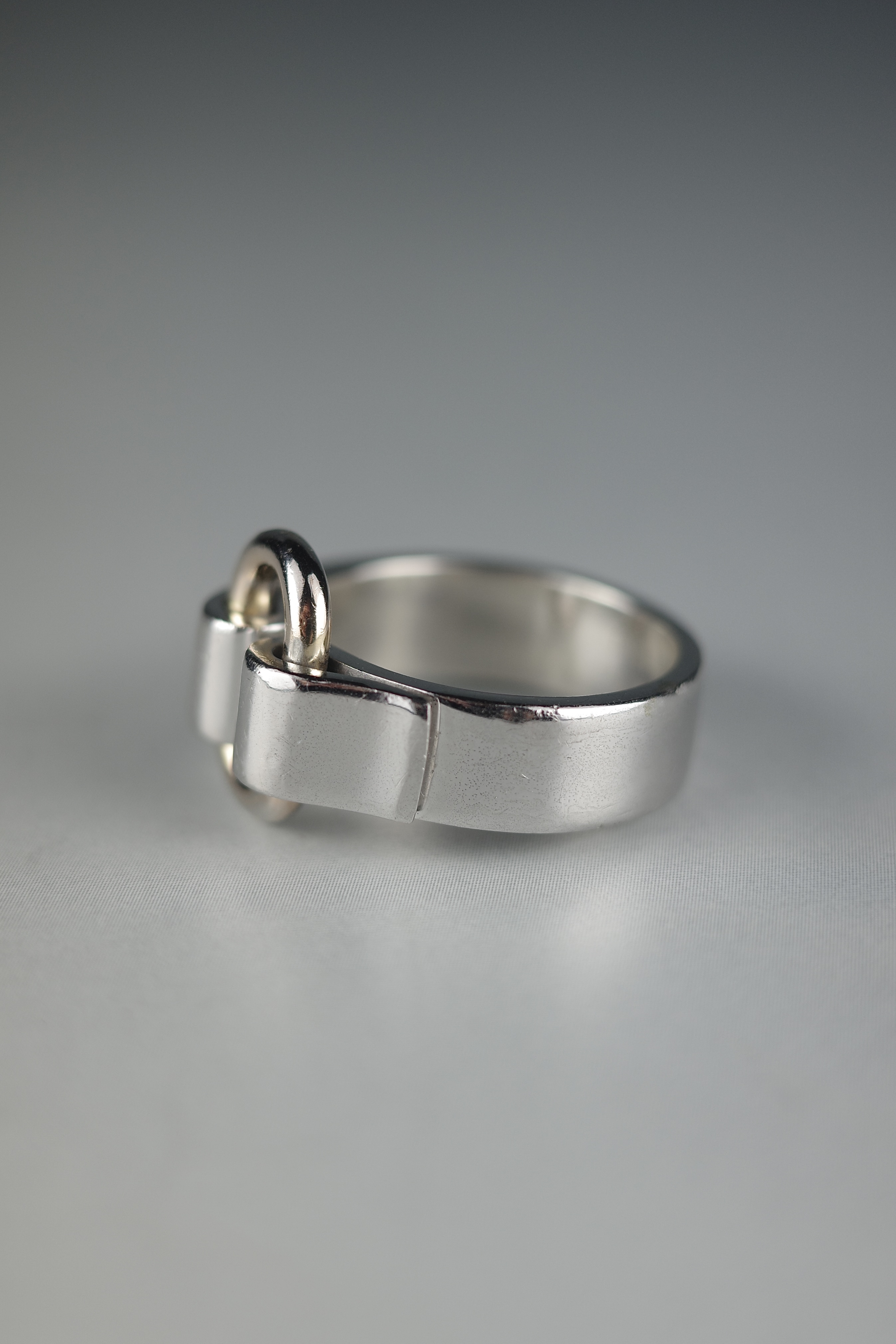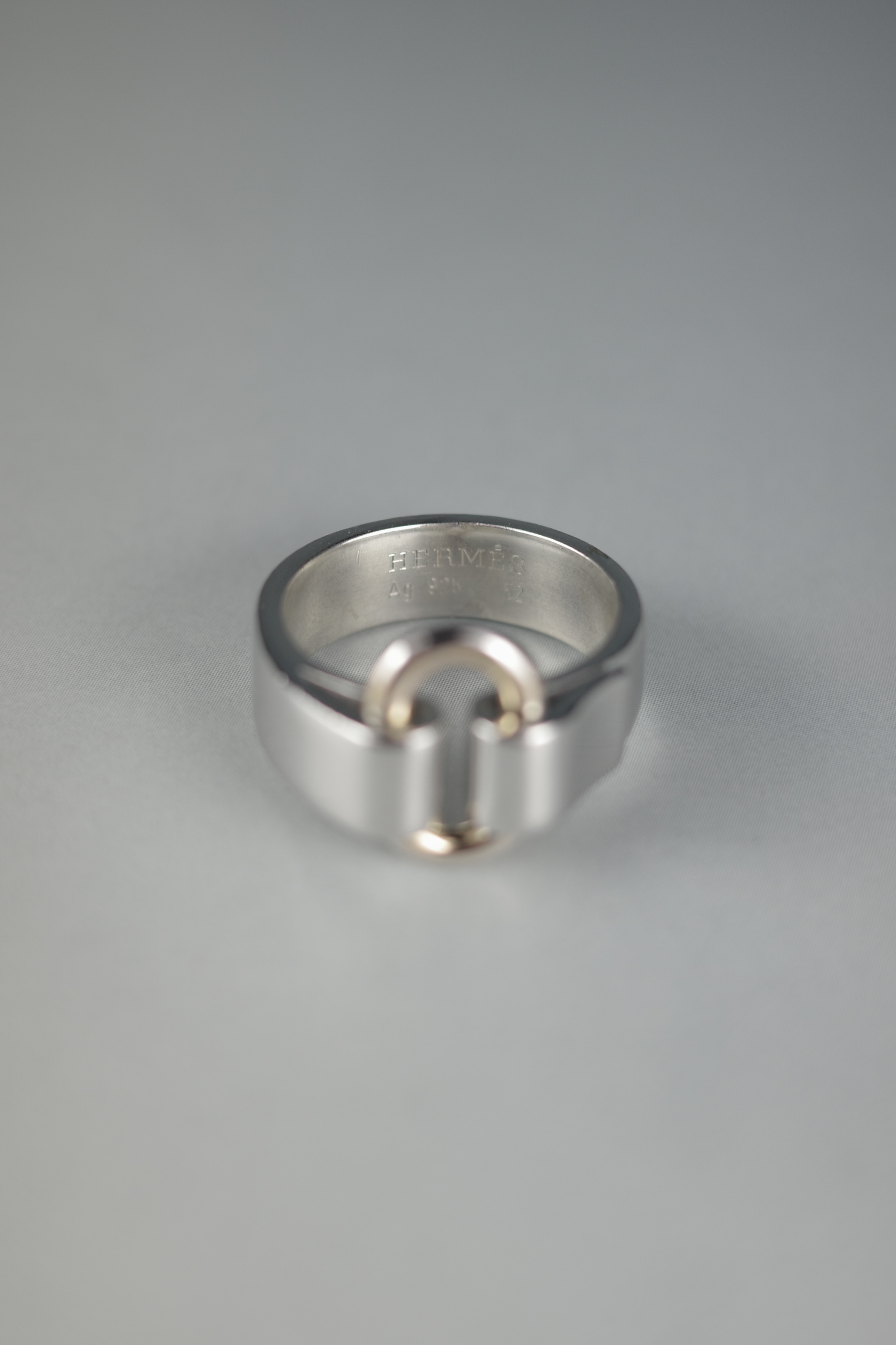 エルメスならではの洗練された存在感を放つ、コンビデザインのリング。無駄をそぎ落としたモダンなシルエットに、シルバーとゴールドの異素材が織りなすコントラストが、指先に上質なアクセントを添えるデザイン。ブランドが誇る卓越したクラフトマンシップが息づく、ジェンダーレスに着用できるタイムレスな逸品。