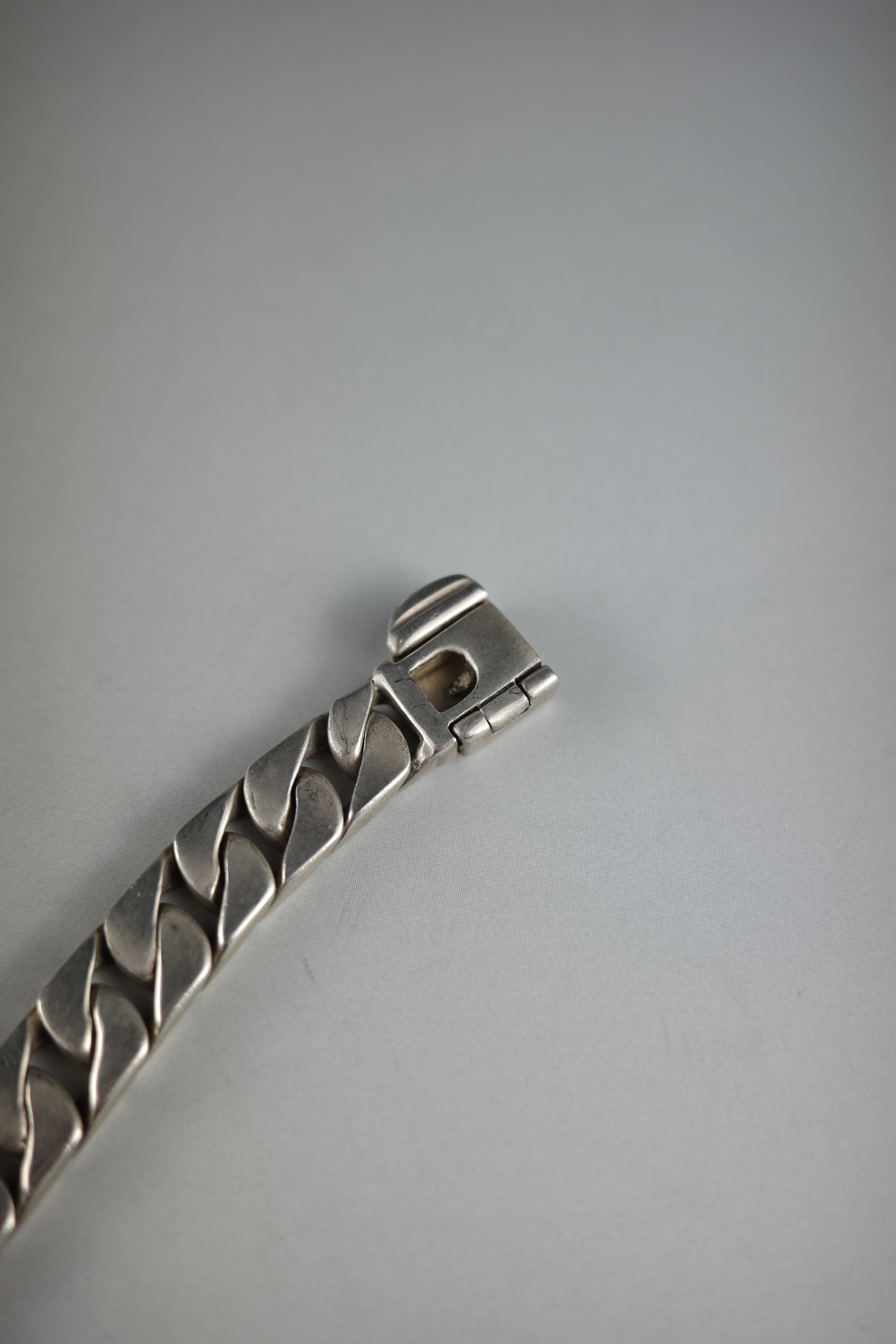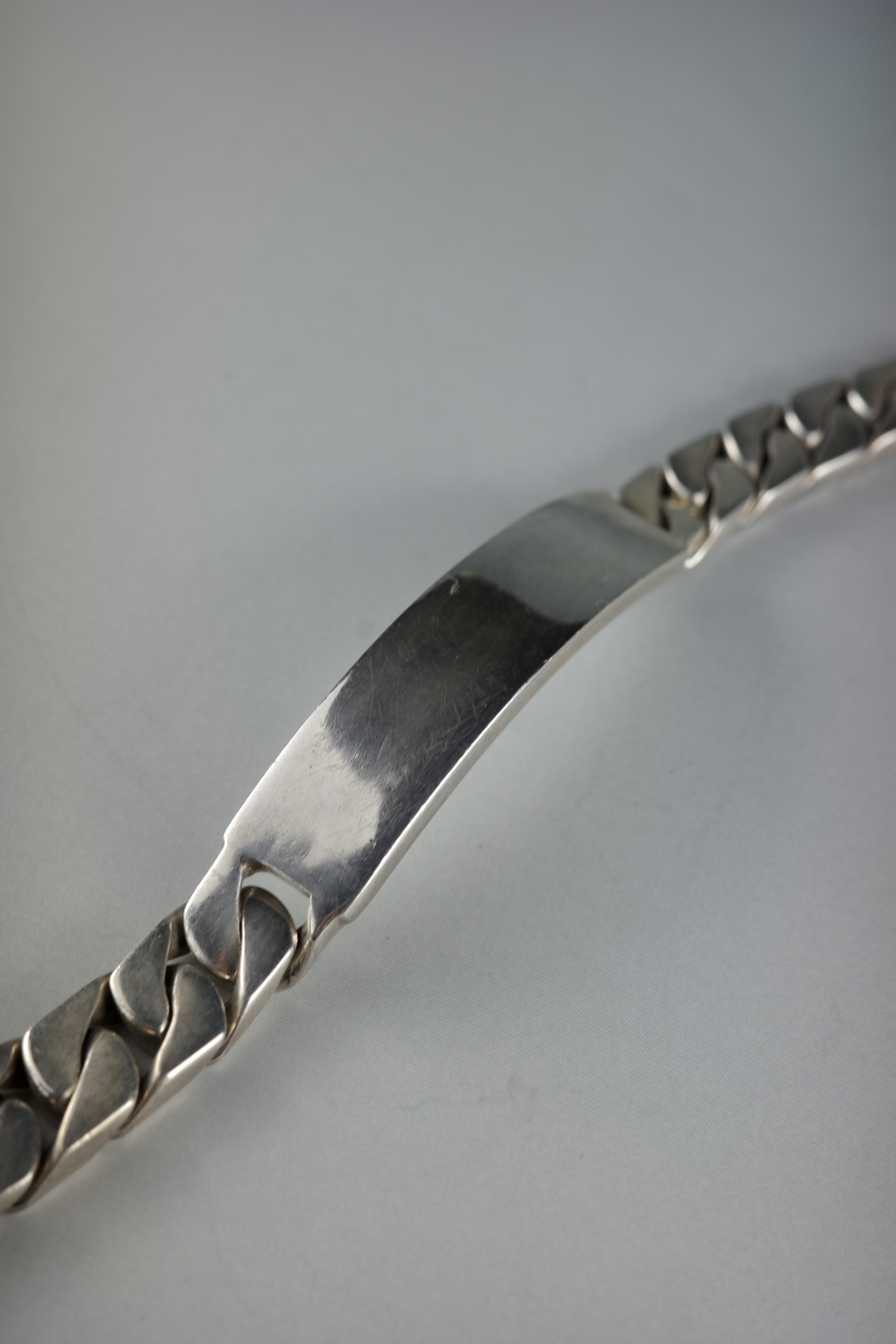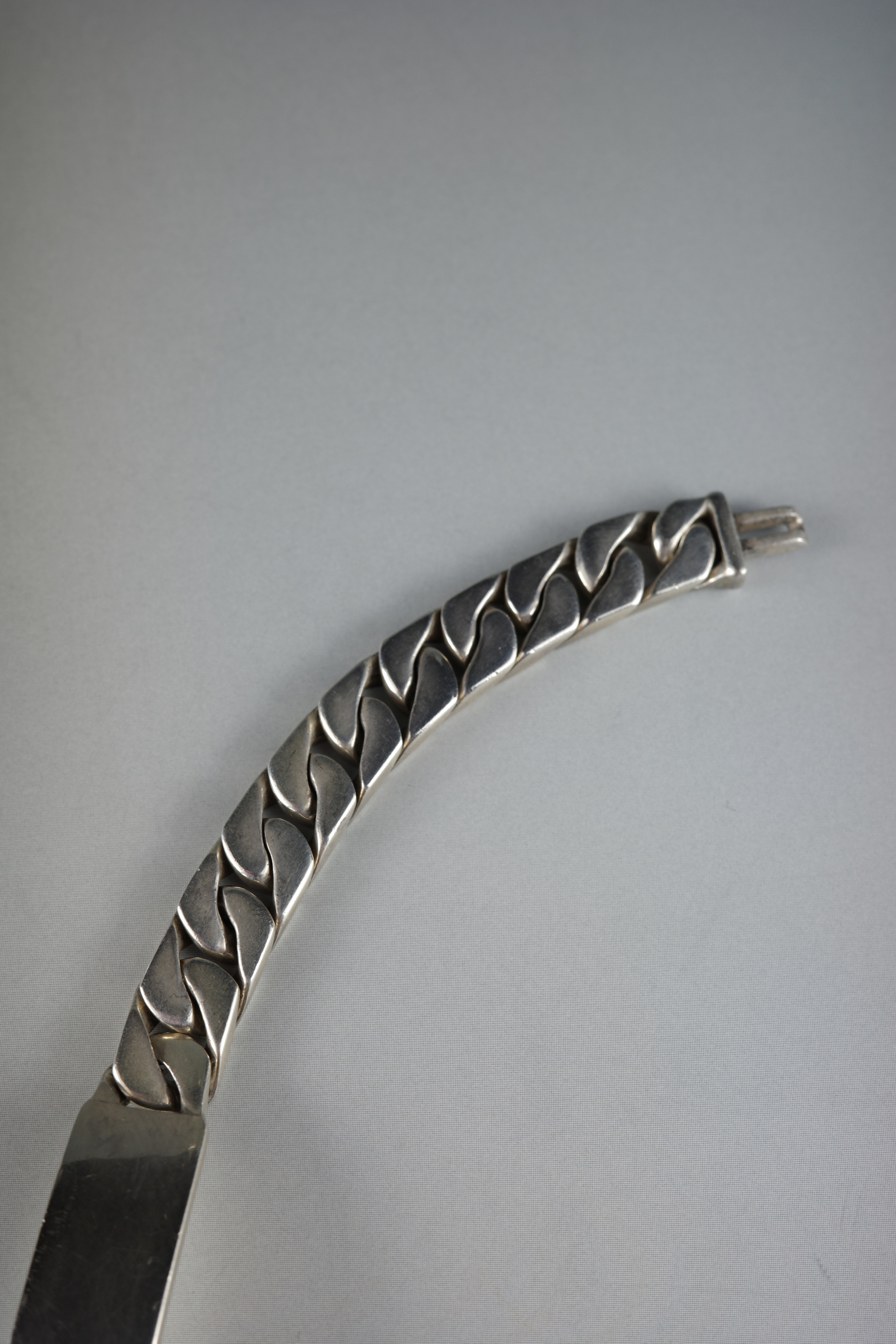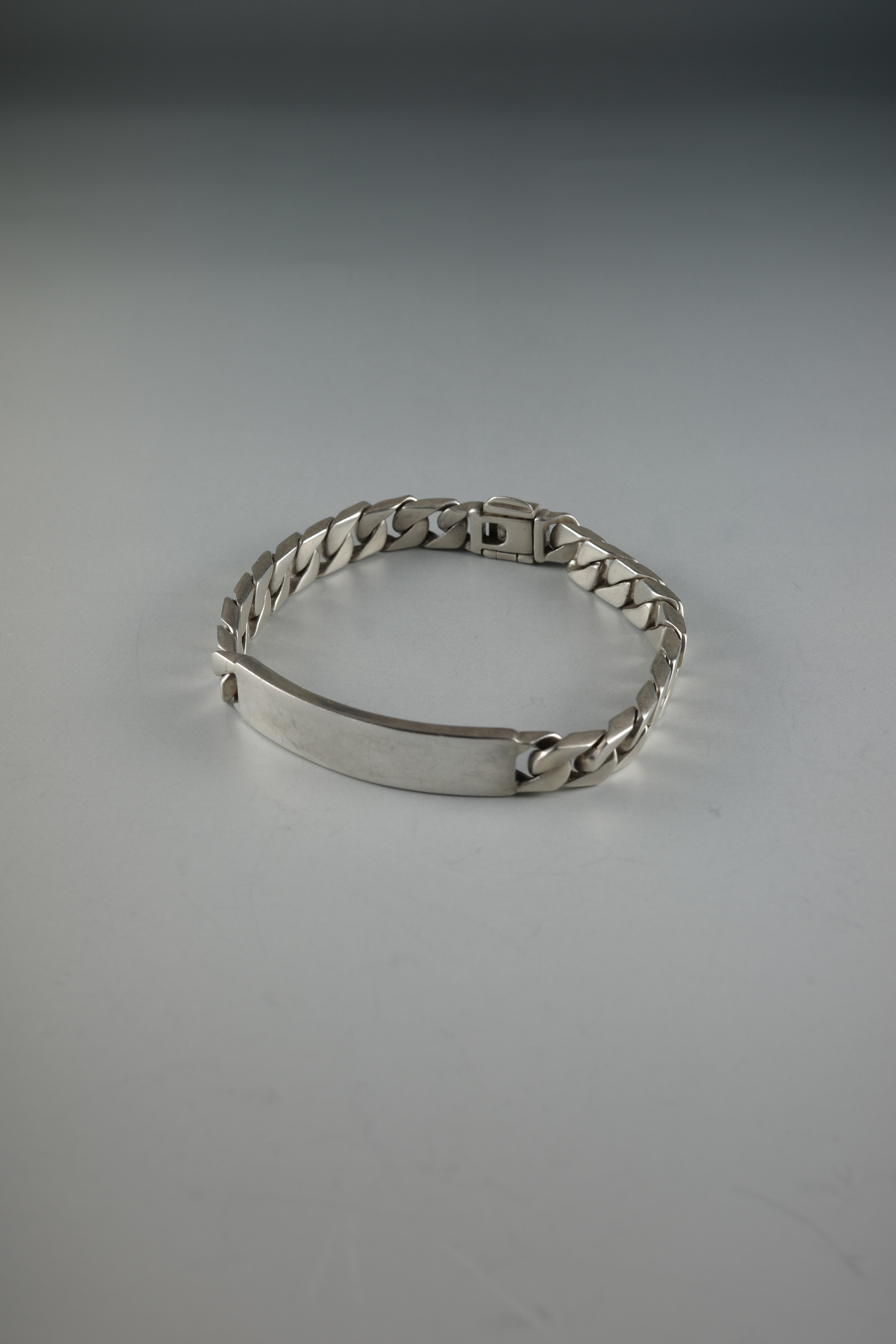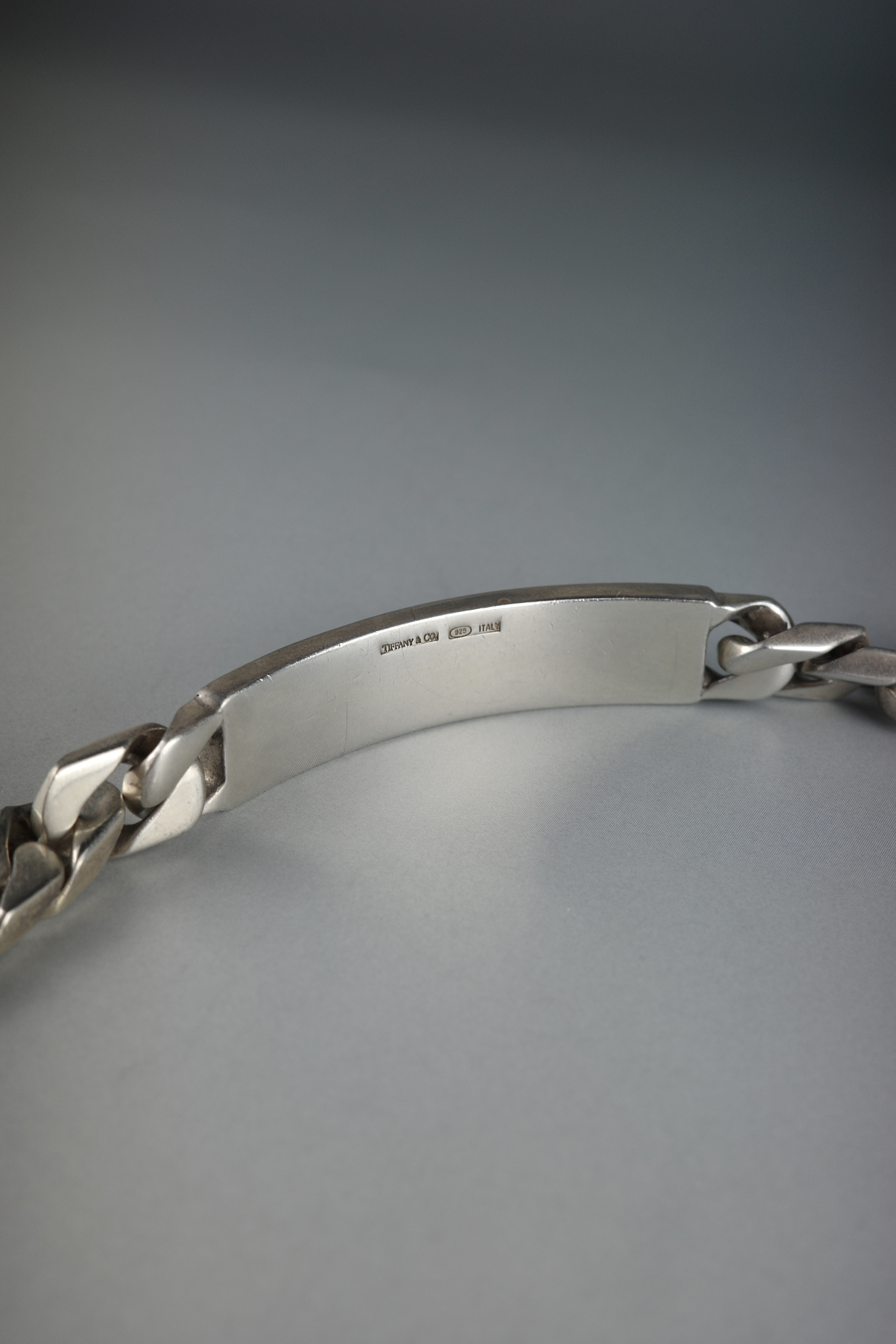 ティファニーのヴィンテージIDブレスレット。滑らかに磨き込まれたシルバーと重厚な喜平チェーンが織りなす存在感は、シンプルでありながら格別の気品を放ちます。長い時を経て纏った艶やかな風合いはヴィンテージならではの魅力で、現行モデルにはない奥ゆかしいラグジュアリーを感じさせる仕上がり。カジュアルからドレススタイルまで幅広く合わせられる、タイムレスな逸品です。