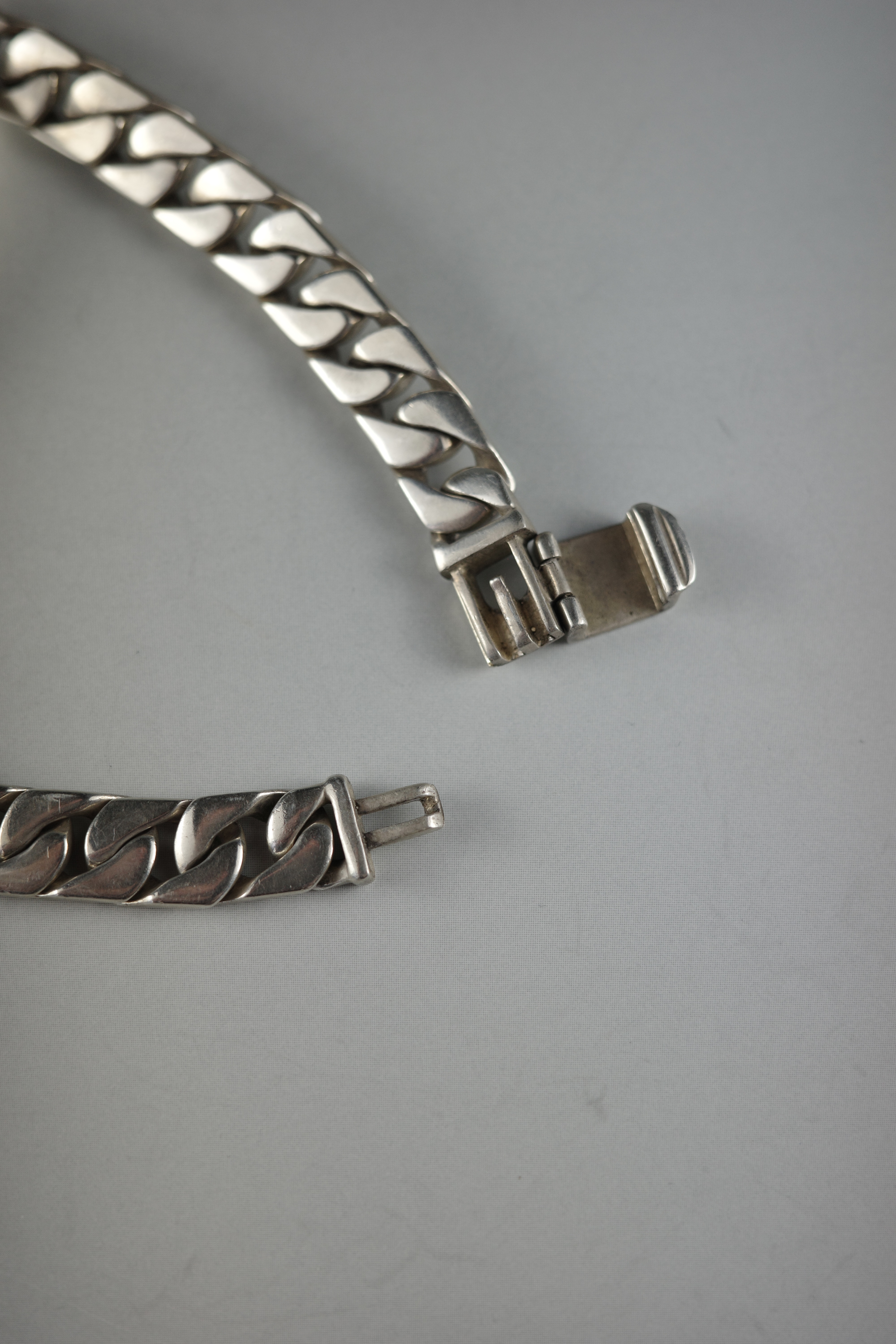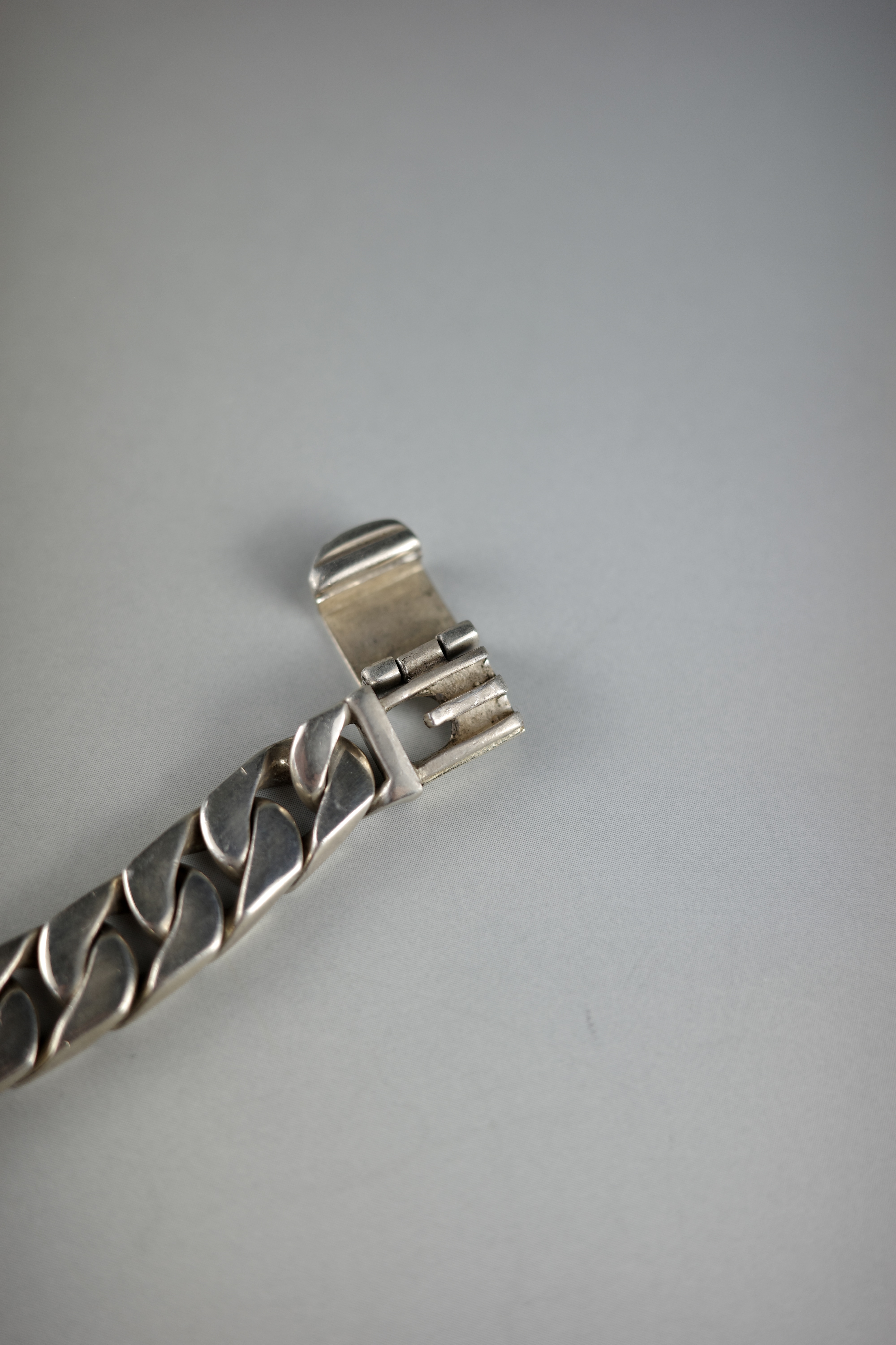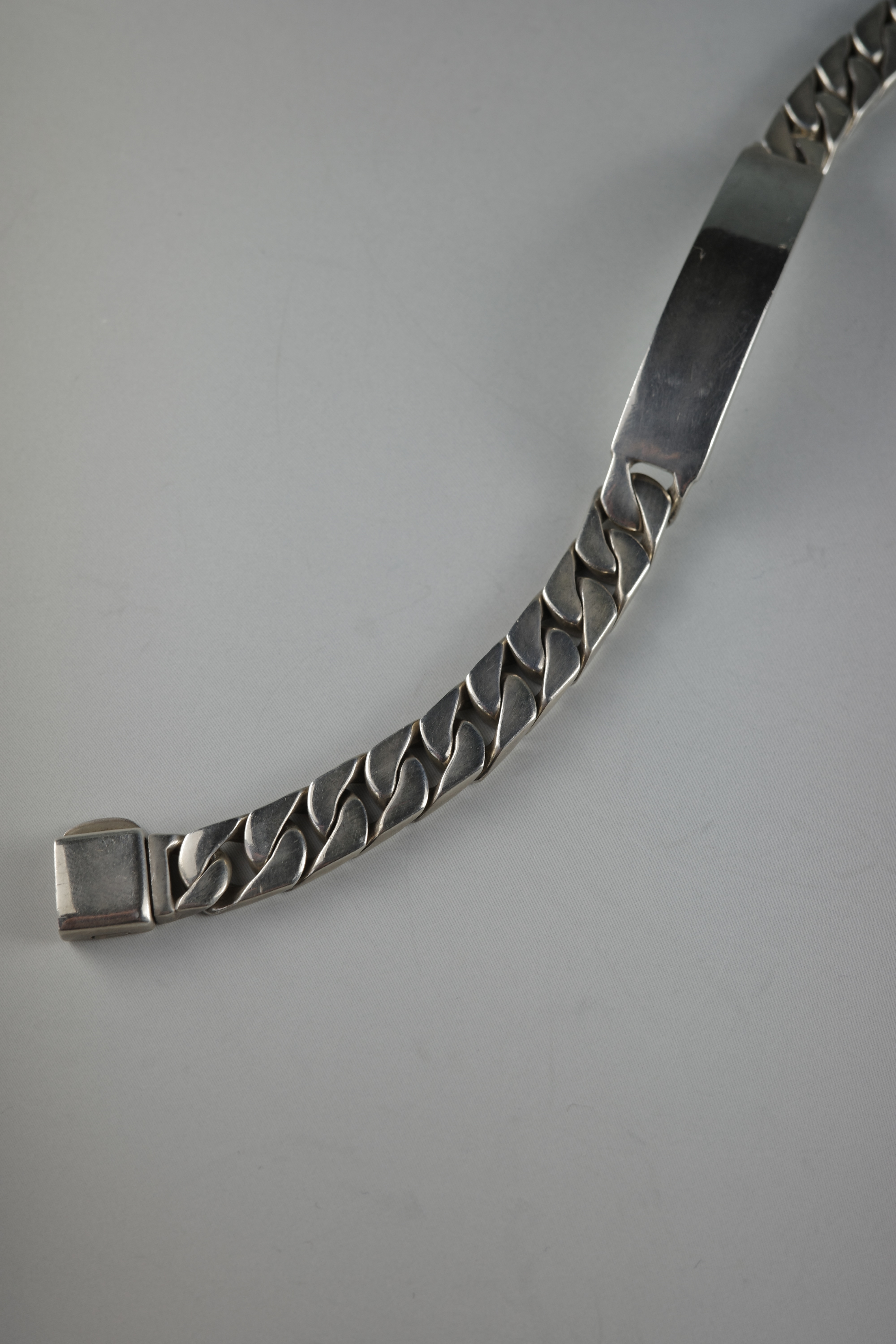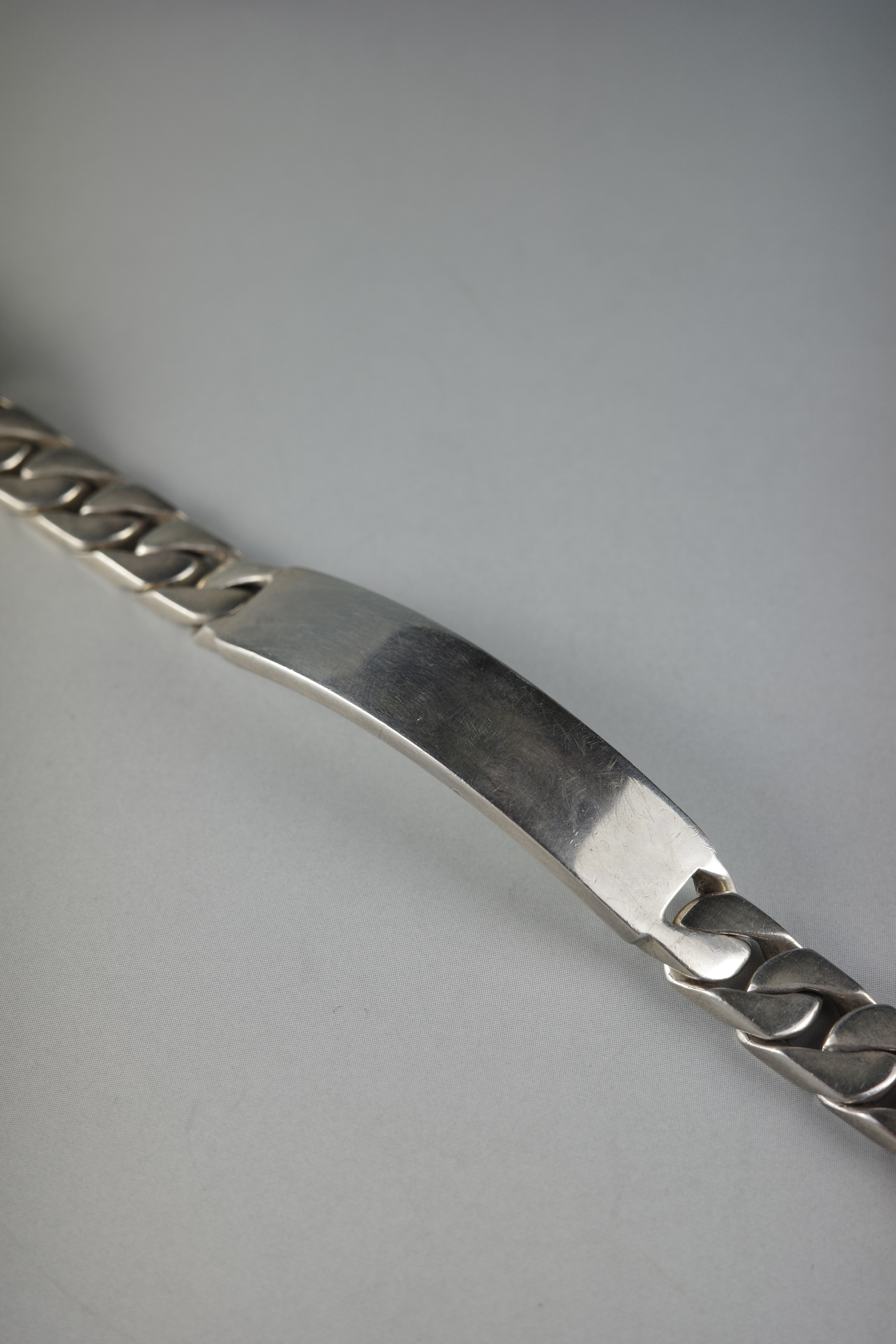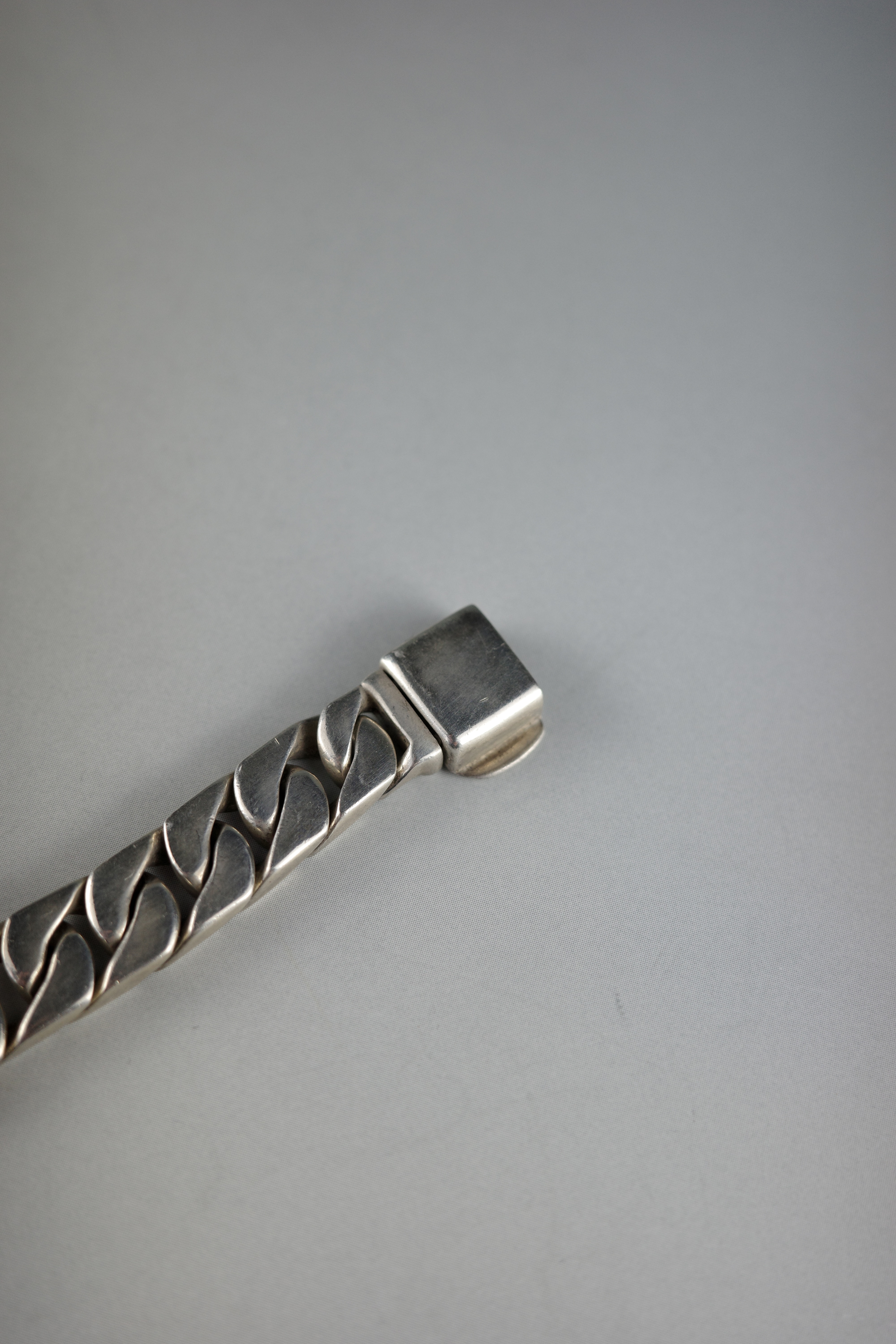 ティファニーのヴィンテージIDブレスレット。滑らかに磨き込まれたシルバーと重厚な喜平チェーンが織りなす存在感は、シンプルでありながら格別の気品を放ちます。長い時を経て纏った艶やかな風合いはヴィンテージならではの魅力で、現行モデルにはない奥ゆかしいラグジュアリーを感じさせる仕上がり。カジュアルからドレススタイルまで幅広く合わせられる、タイムレスな逸品です。