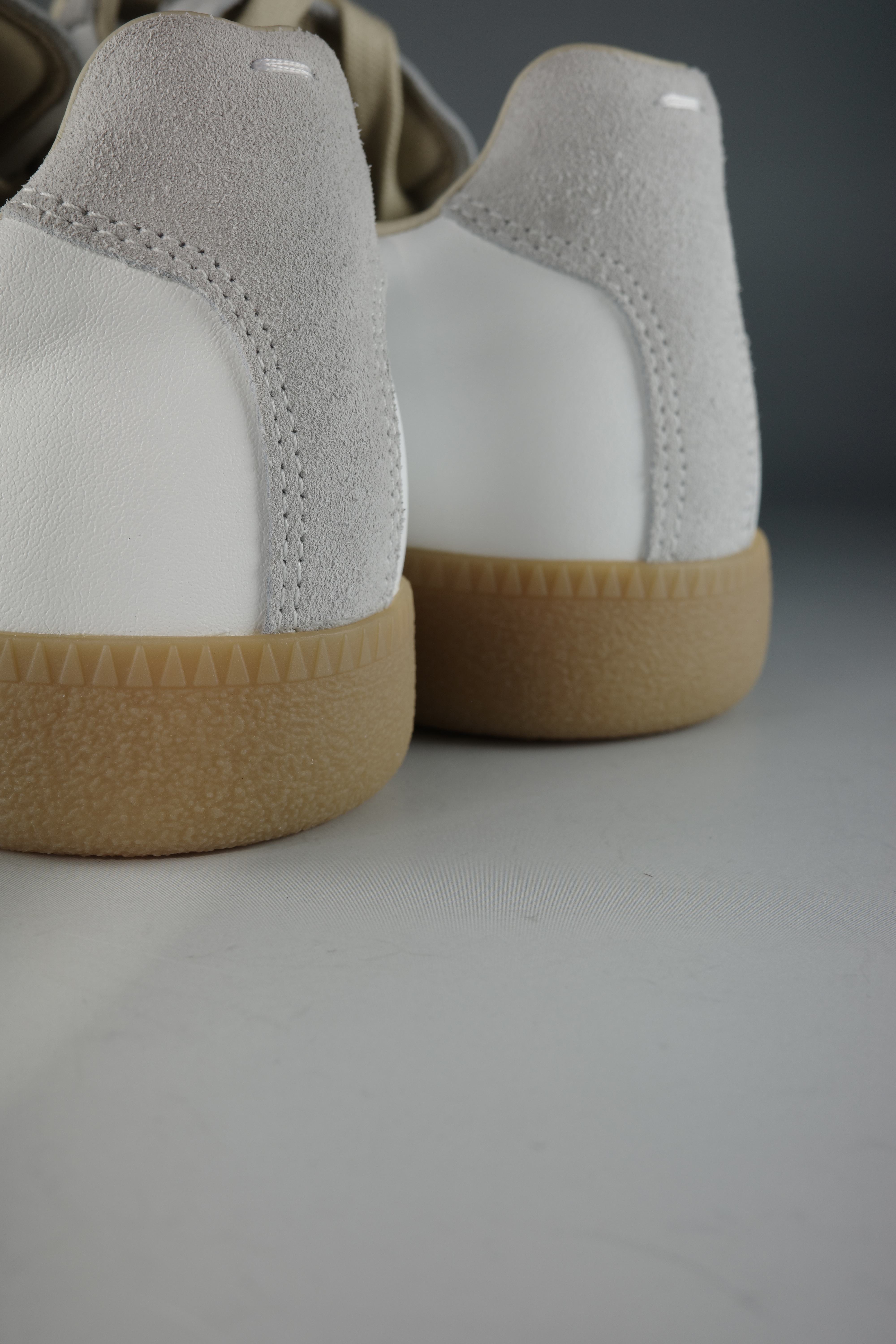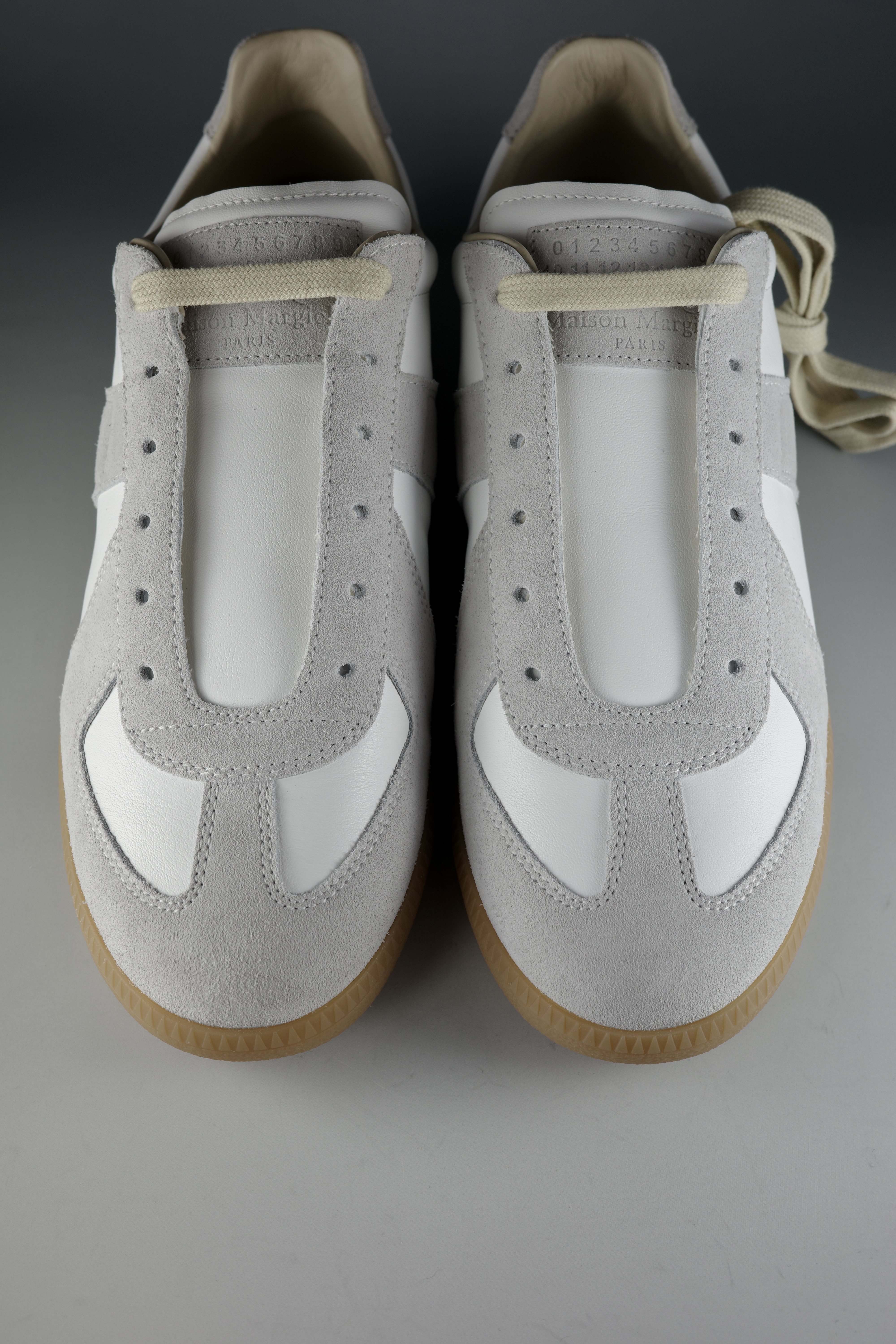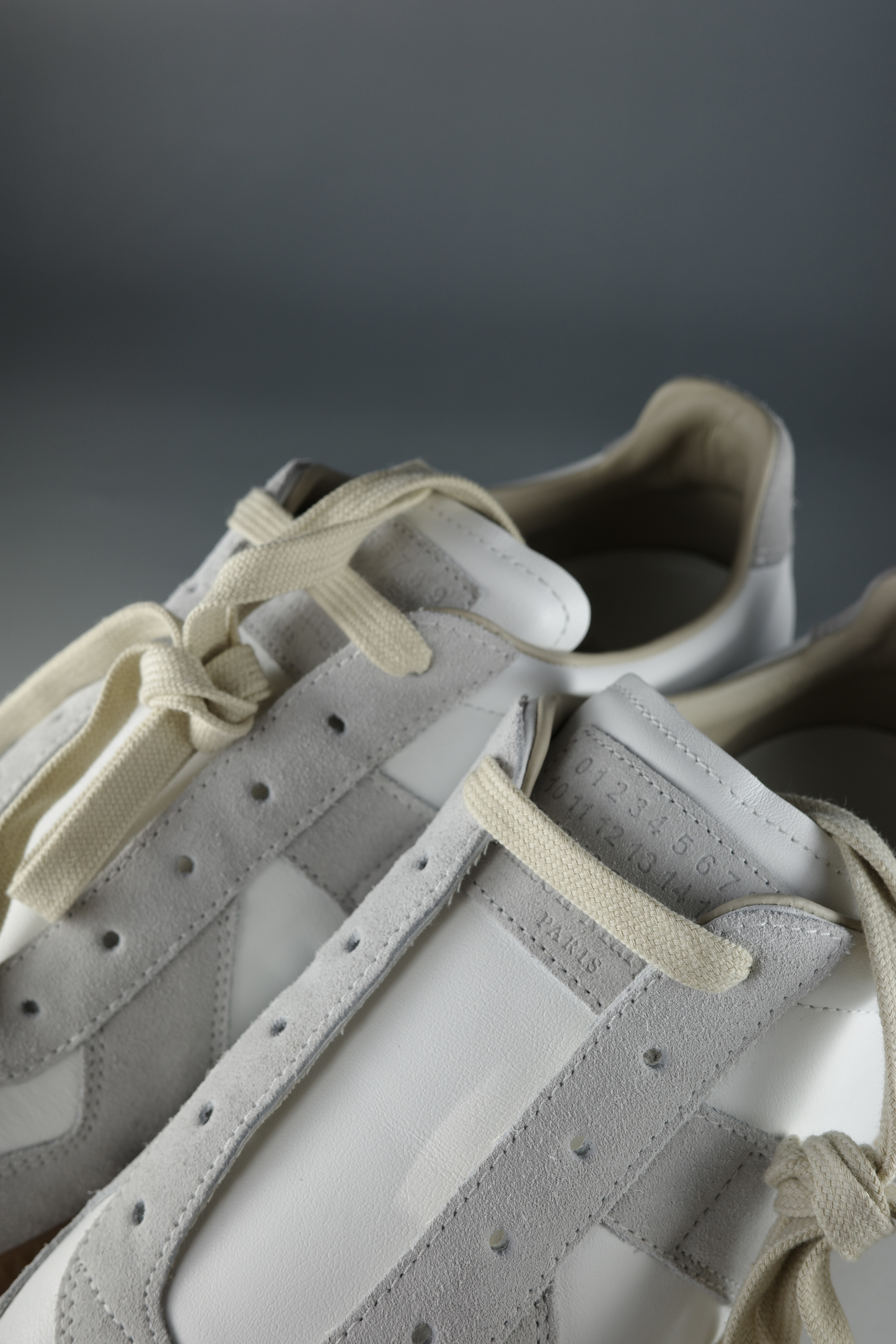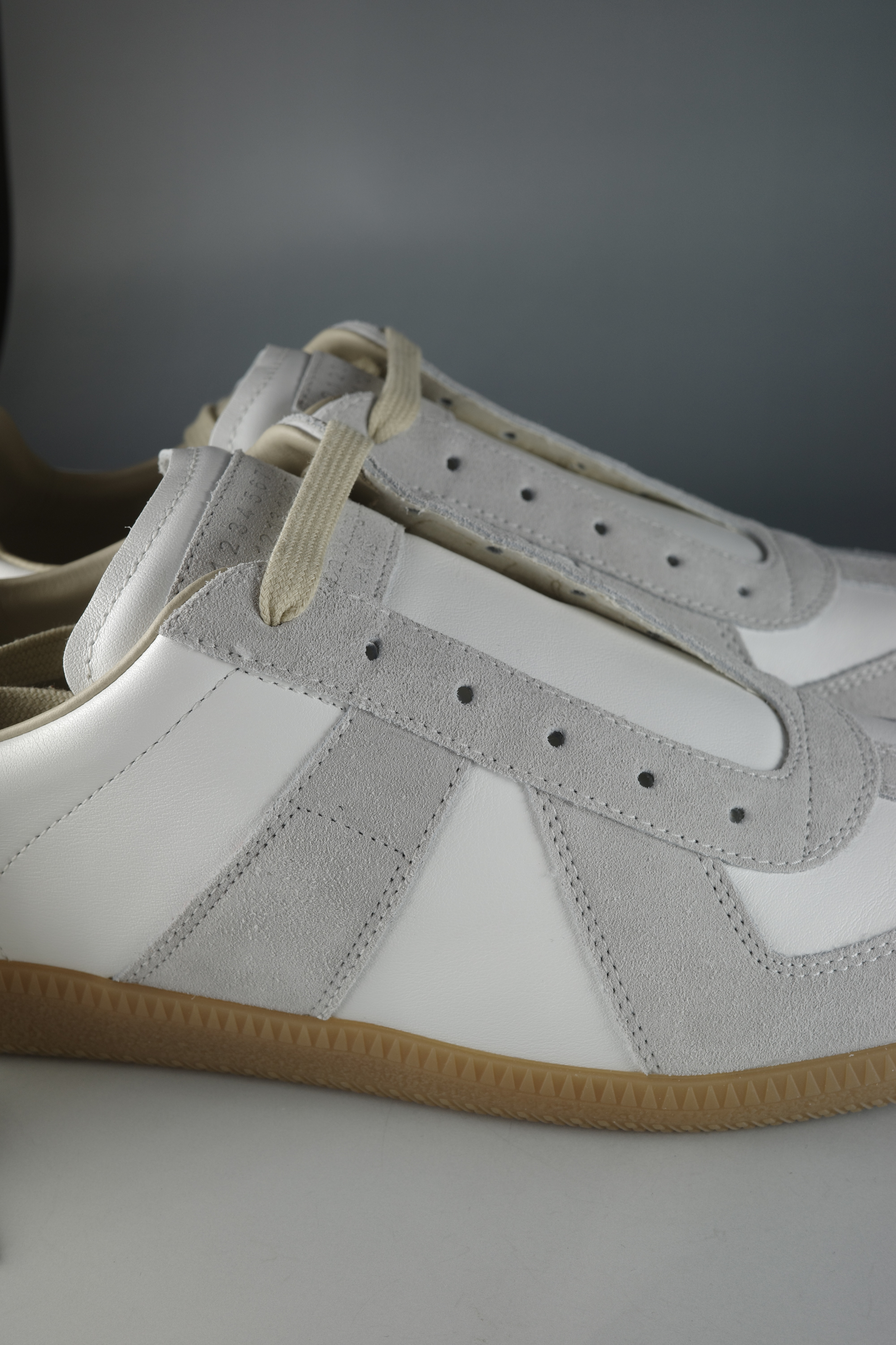 メゾンマルジェラを代表する定番スニーカー「ジャーマントレーナー」。1970年代に西ドイツ軍のトレーニング用シューズとして生まれたデザインを、マルジェラならではの解釈で再構築した一足です。上質なレザーとスエードを組み合わせたアッパーは、ミニマルでありながらも存在感を放ち、どんなスタイリングにも馴染む万能さが魅力。シュータン裏にはゴムバンドが内臓されている為、紐無しでスリッポンとしても使用可能です。