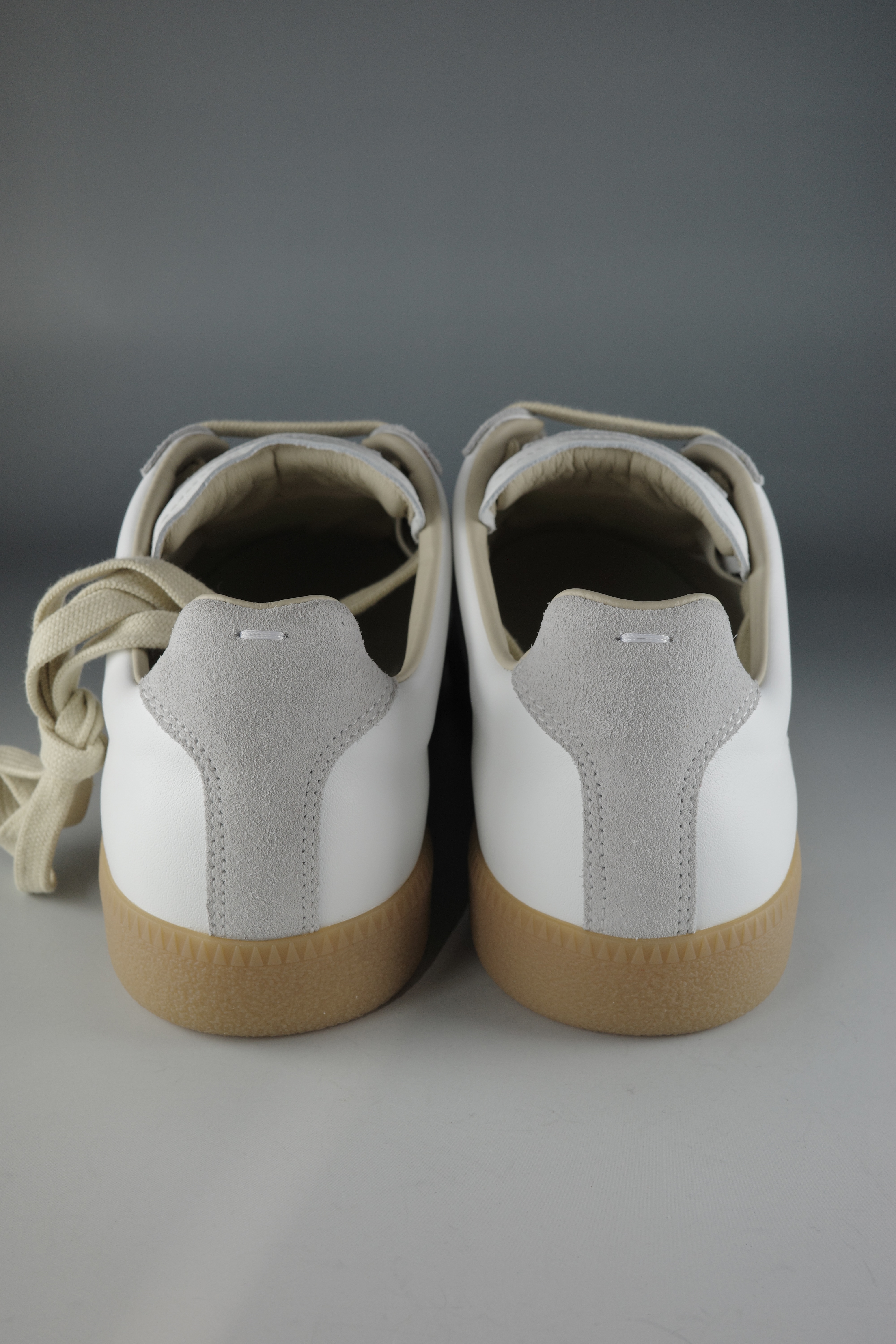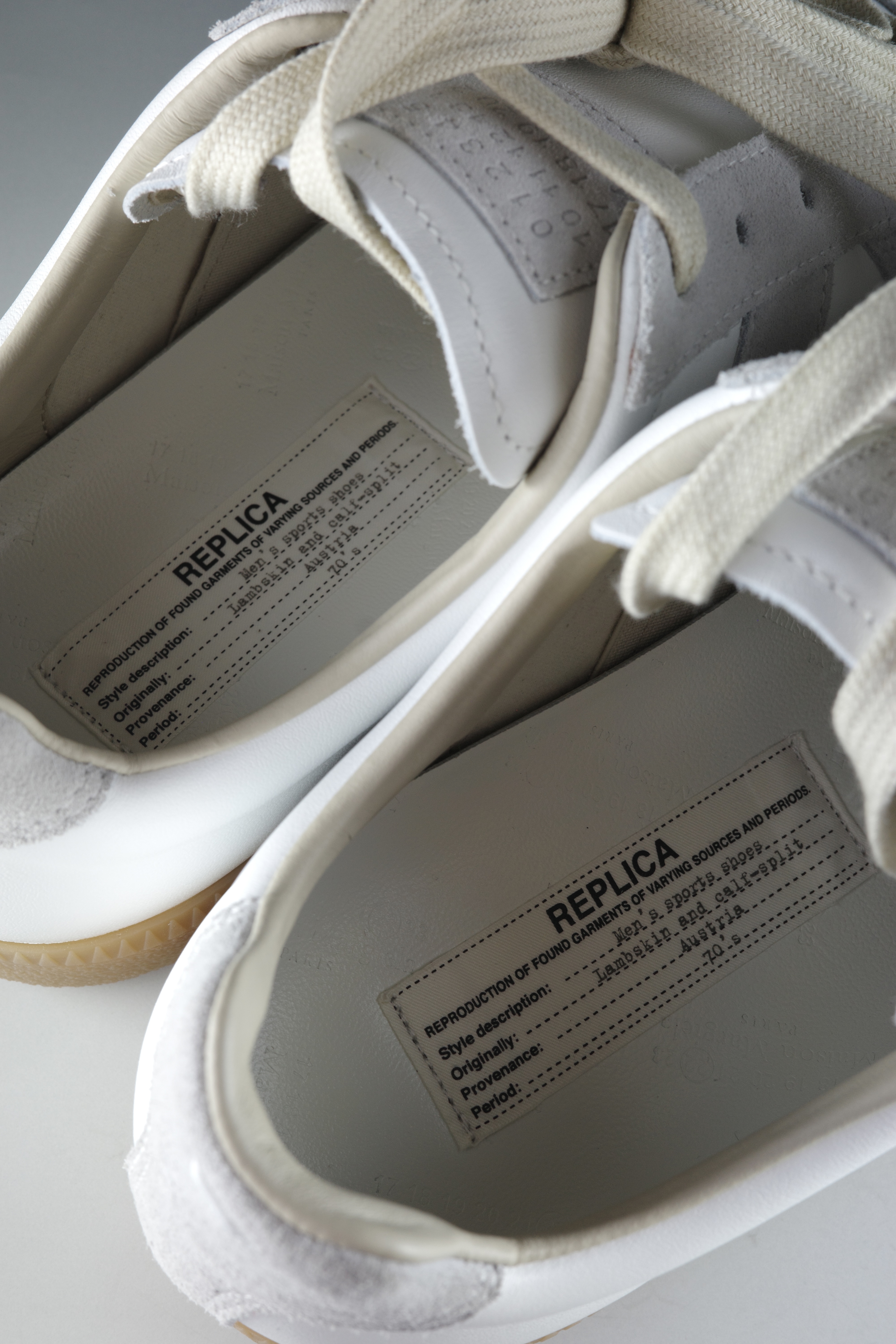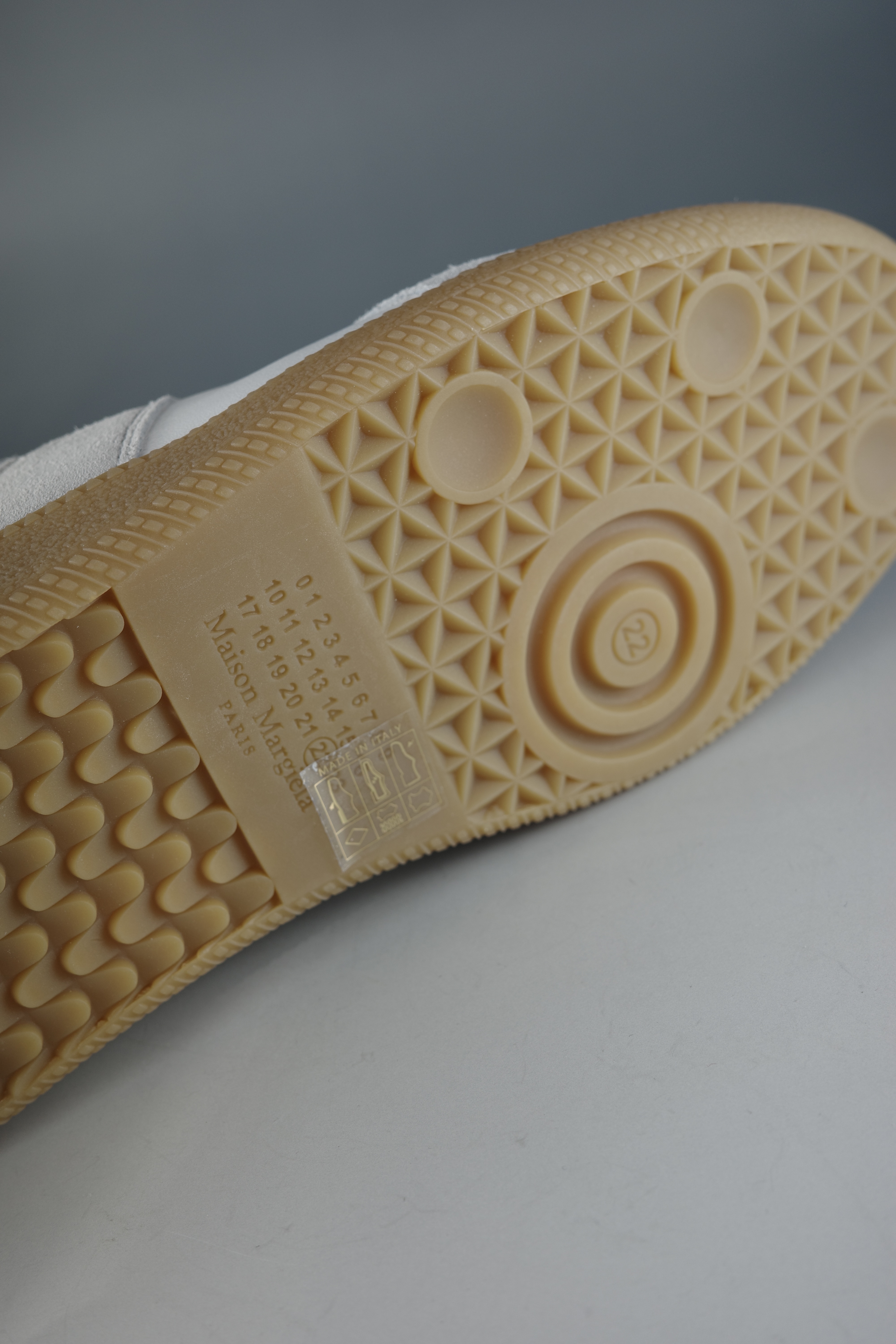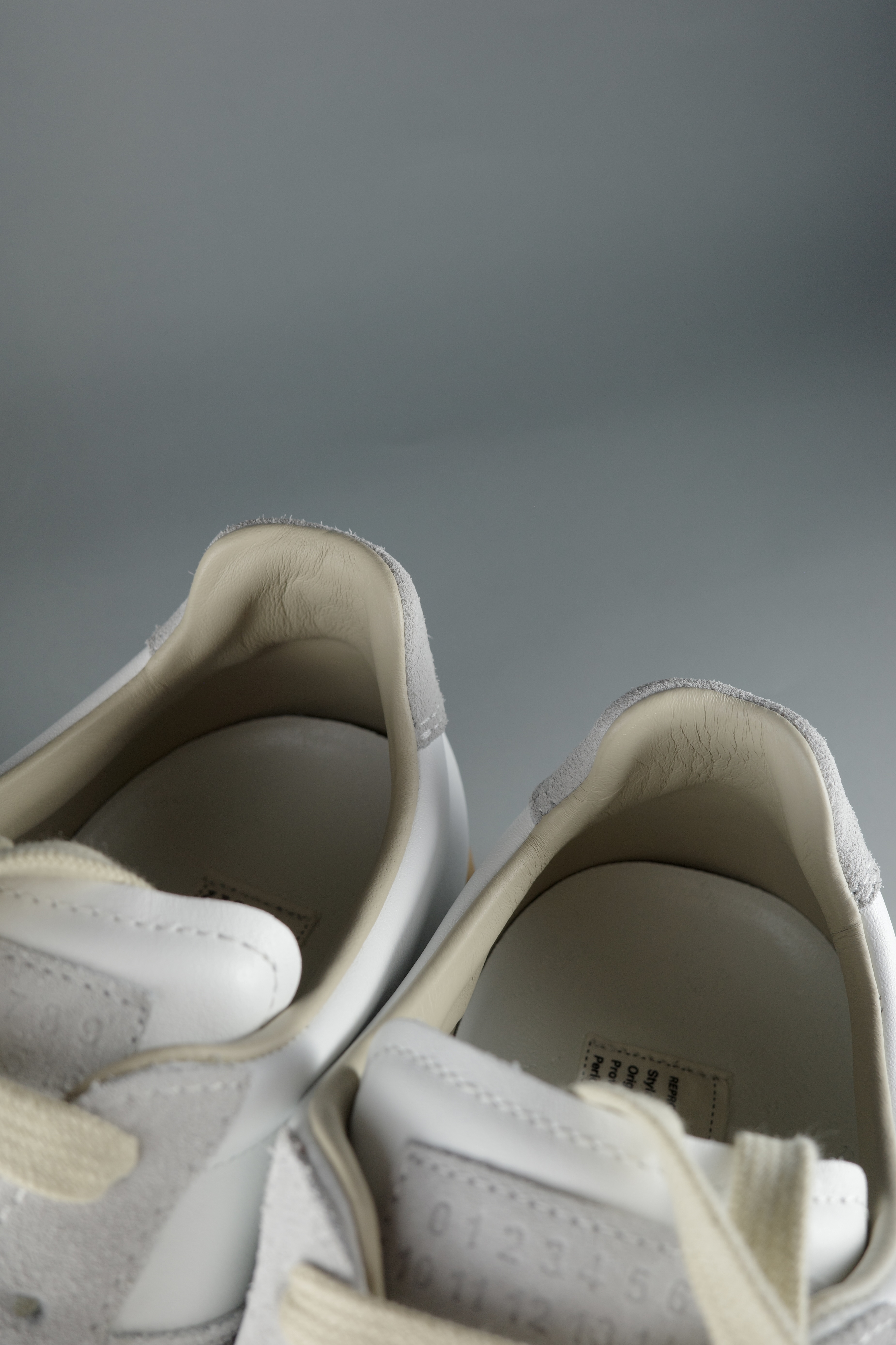 メゾンマルジェラを代表する定番スニーカー「ジャーマントレーナー」。1970年代に西ドイツ軍のトレーニング用シューズとして生まれたデザインを、マルジェラならではの解釈で再構築した一足です。上質なレザーとスエードを組み合わせたアッパーは、ミニマルでありながらも存在感を放ち、どんなスタイリングにも馴染む万能さが魅力。シュータン裏にはゴムバンドが内臓されている為、紐無しでスリッポンとしても使用可能です。