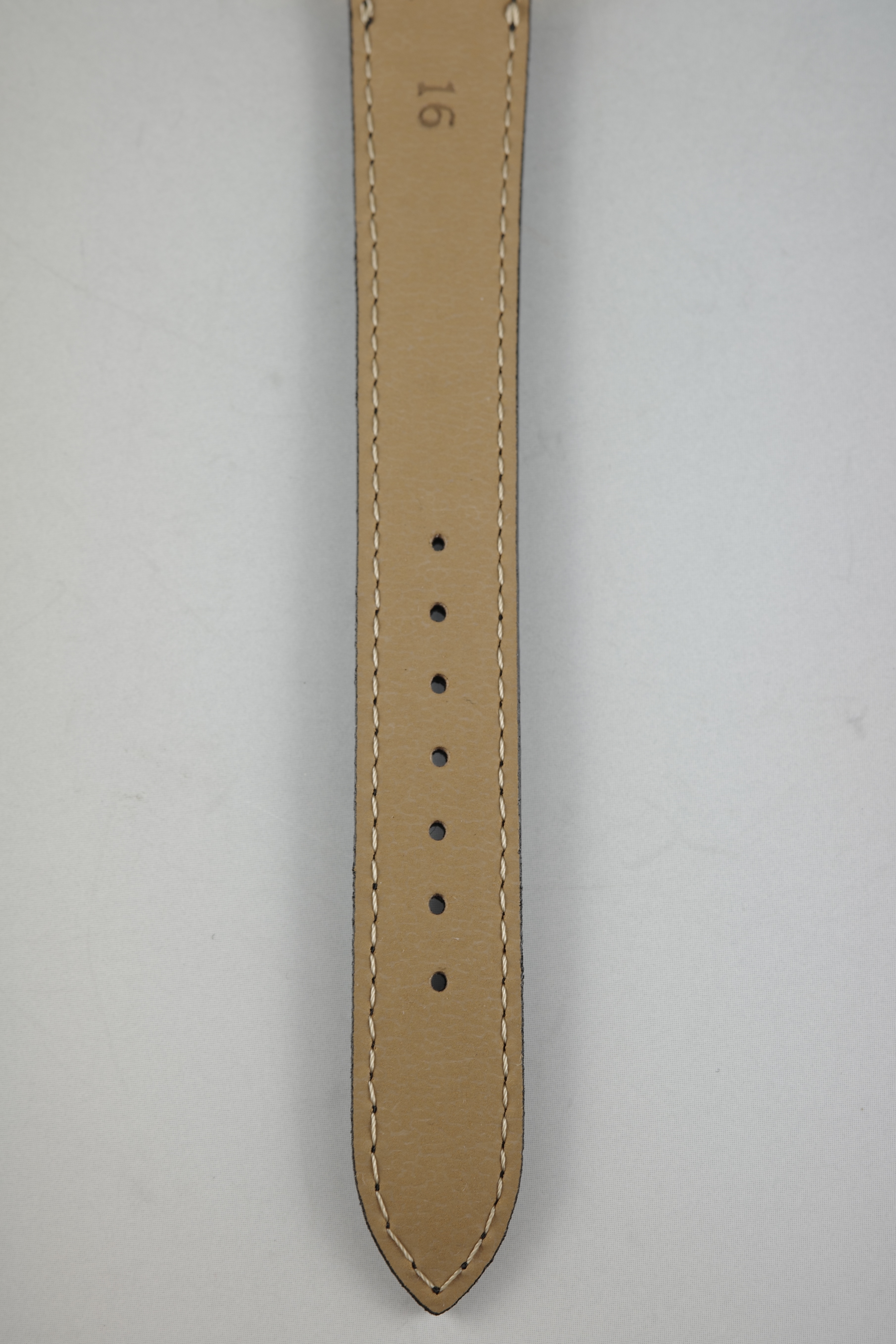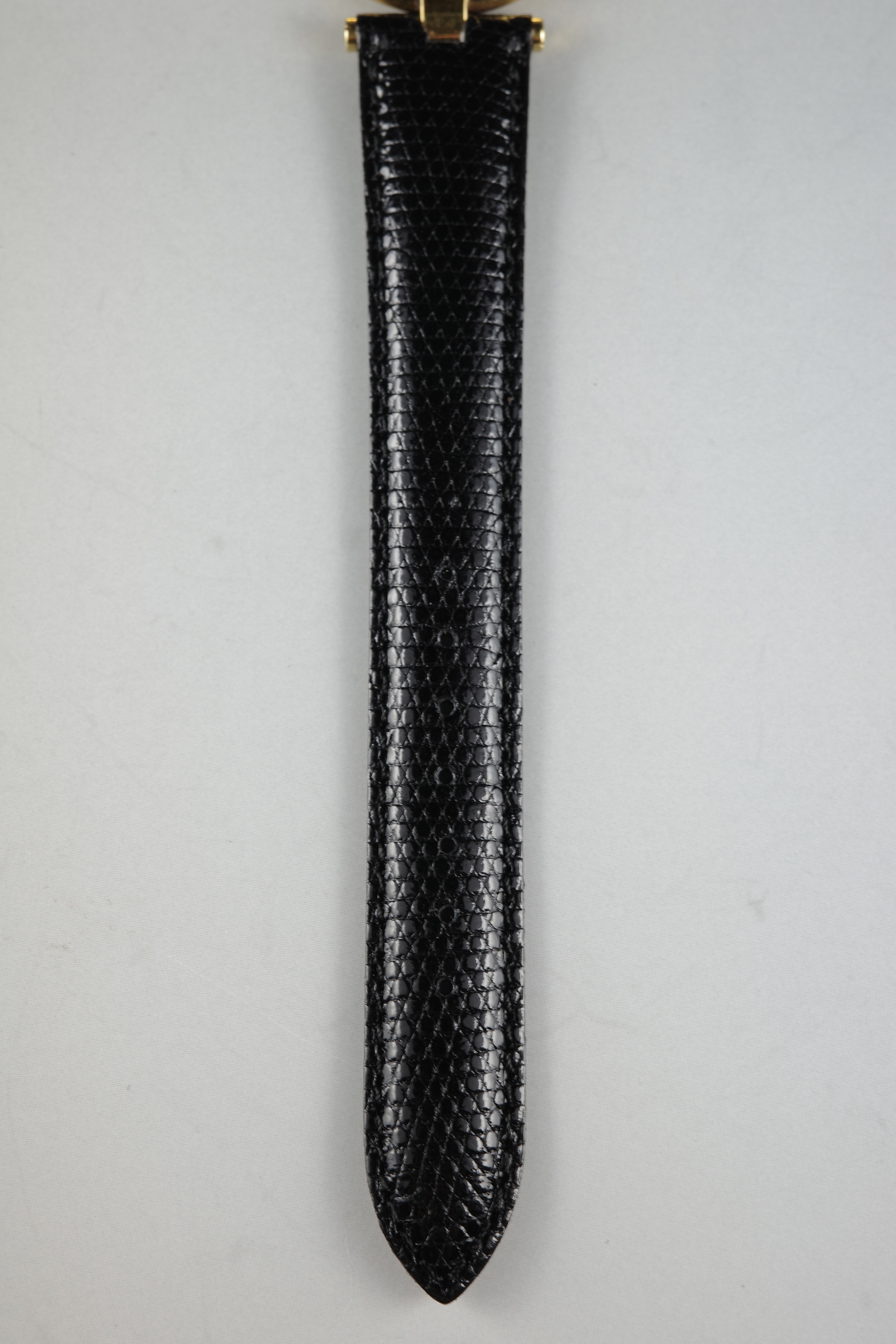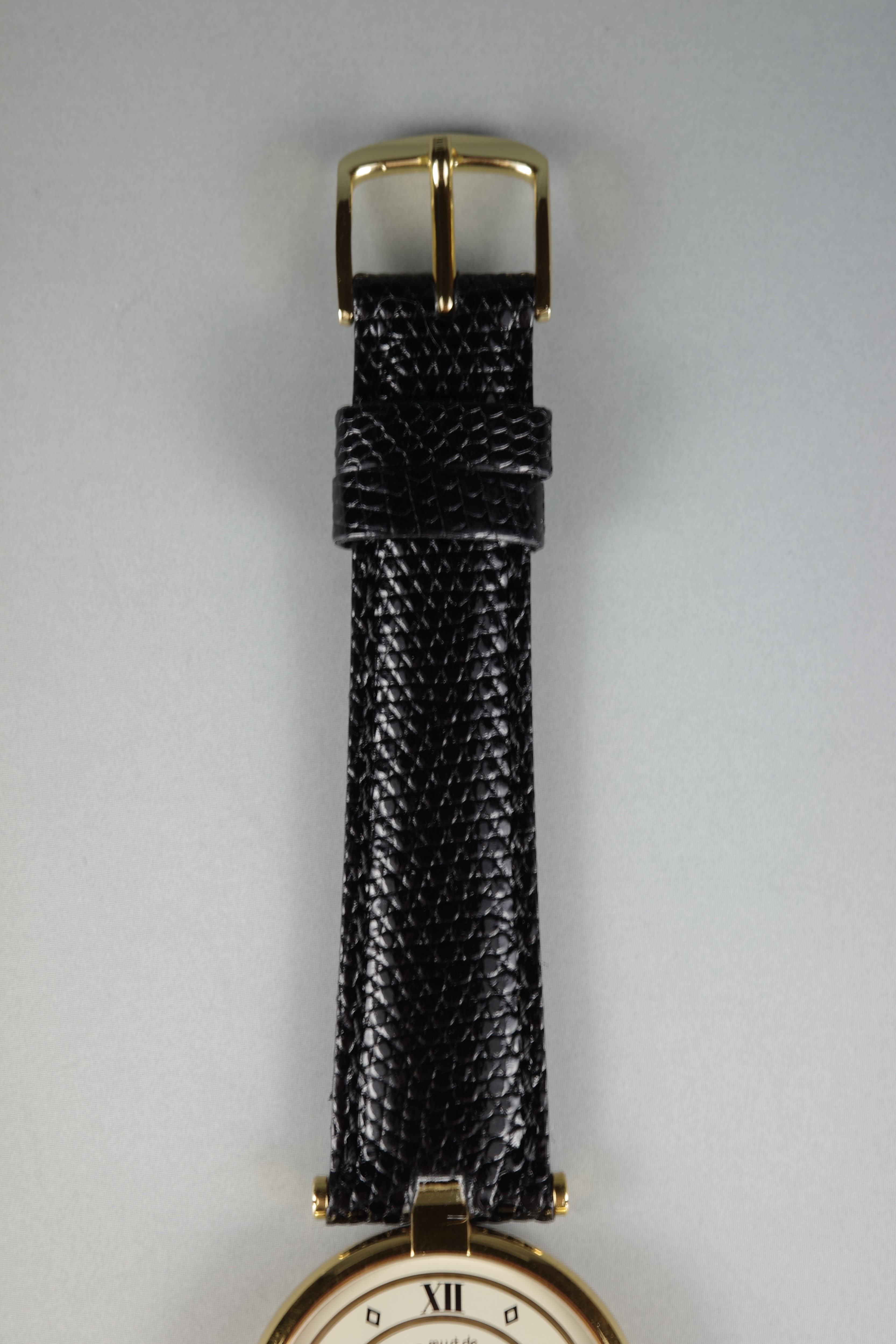 カルティエのエレガンスを象徴するクラシックウォッチ「マストヴァンドーム」。ラウンドフェイスにローマンインデックスを配したシンプルで気品あるデザインで、ゴールドケースと深みのあるブラックレザーストラップのコントラストが、手元を上品に引き立てる一本。リューズにはカルティエを象徴するブルーサファイアカボションをセット。流行に左右されないタイムレスな佇まいで、ジュエリーのような存在感を放ちます。ヴィンテージならではの柔らかな艶感と、現行にはない繊細なサイズバランスが魅力のアイテム。