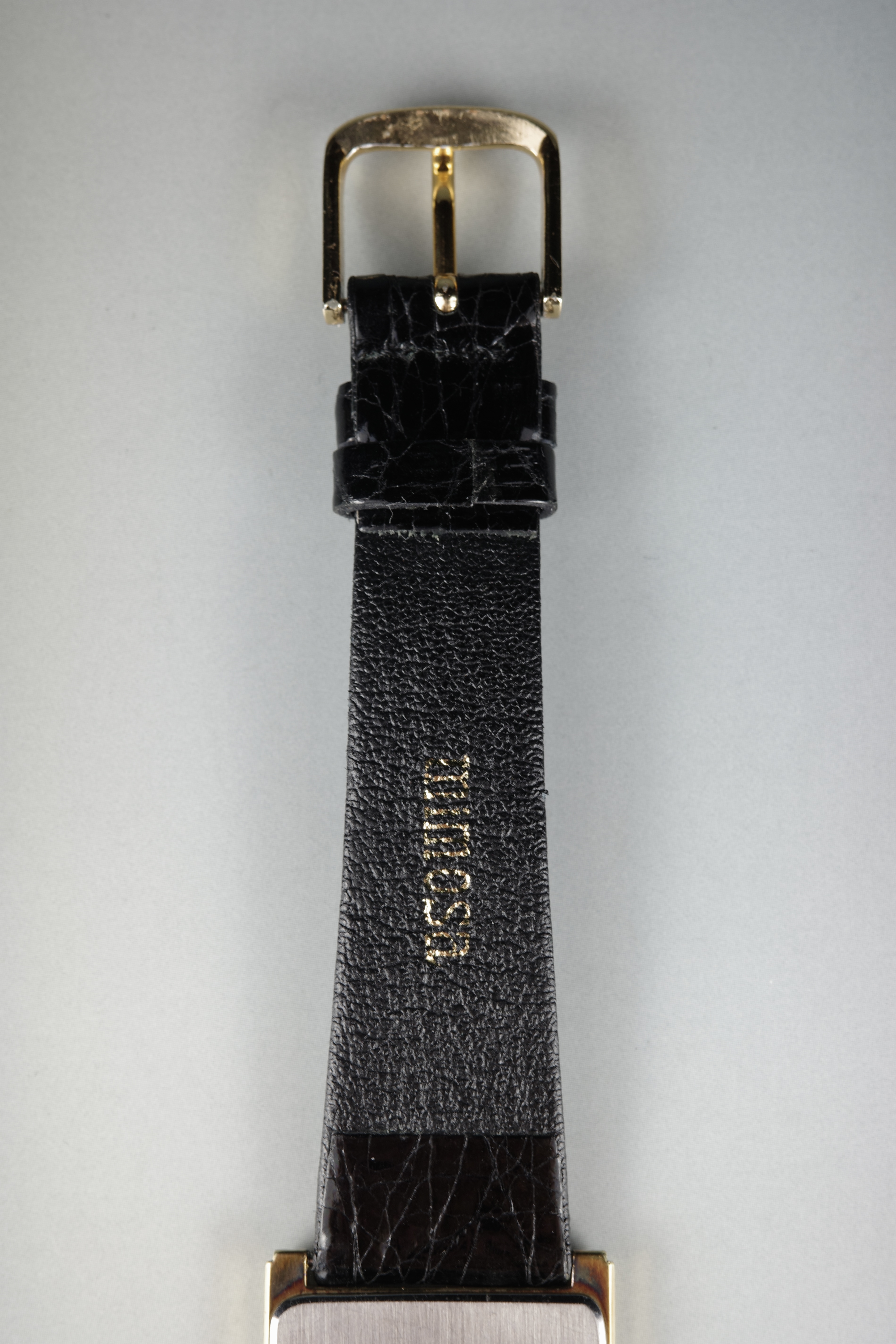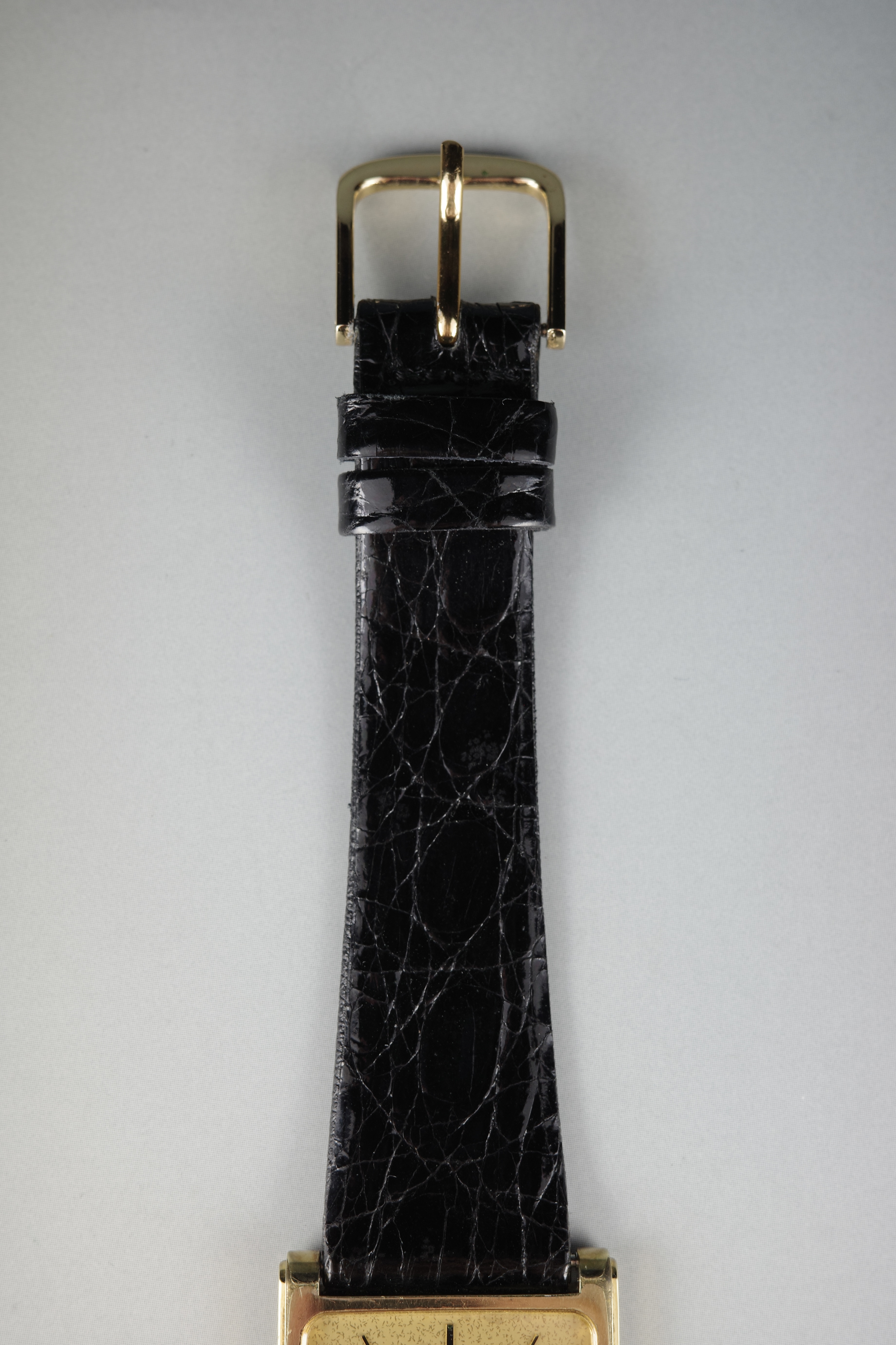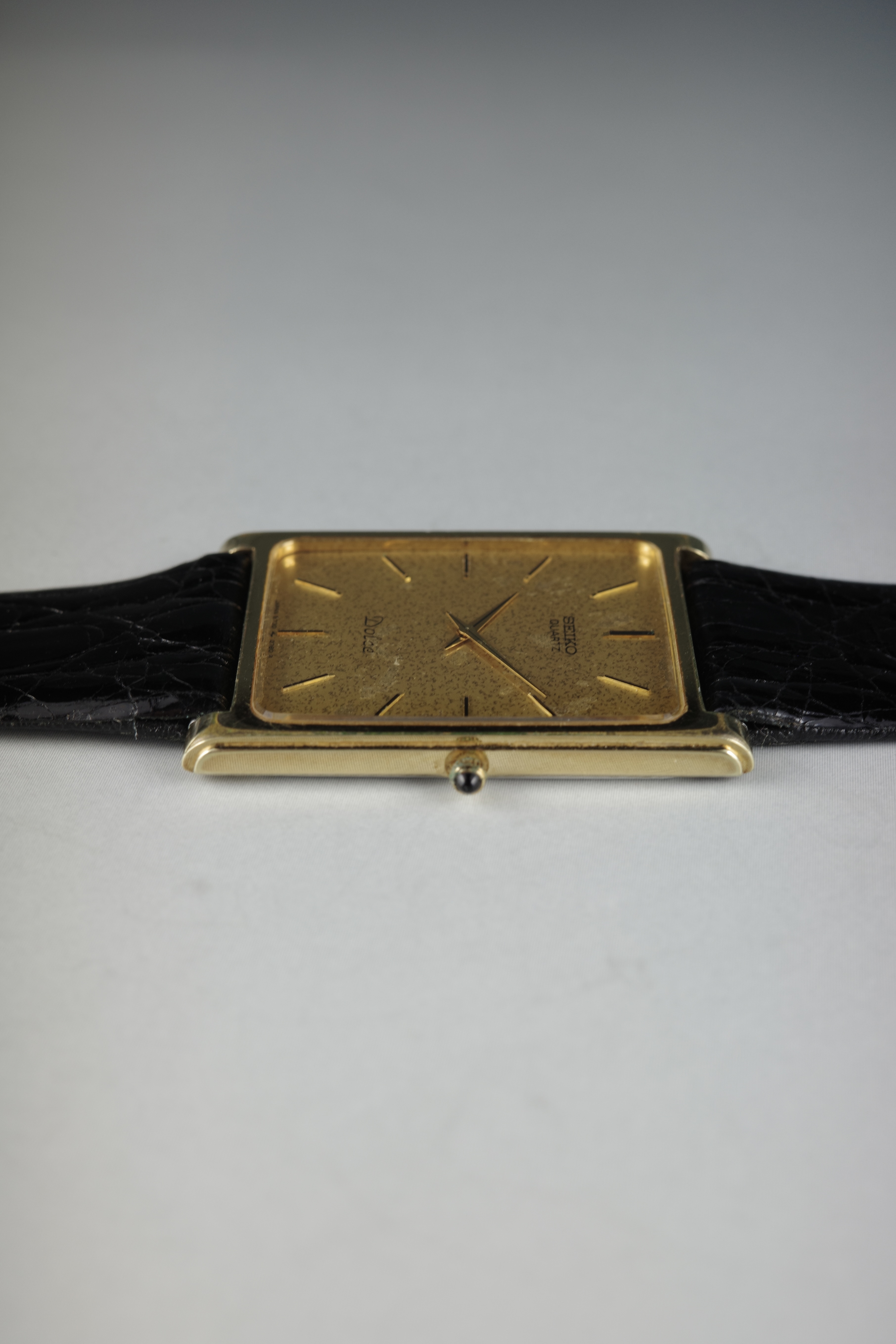 1980〜1990年代頃のセイコー「ドルチェ」ヴィンテージドレスウォッチ。シンプルで洗練された佇まいの中に、当時の国産時計が持つ確かな品質と美意識が息づく一本です。ゴールドトーンの極薄レクタンギュラーケースに、ブラックレザーのストラップが全体を引き締め、クラシカルかつモードな印象のアイテム。