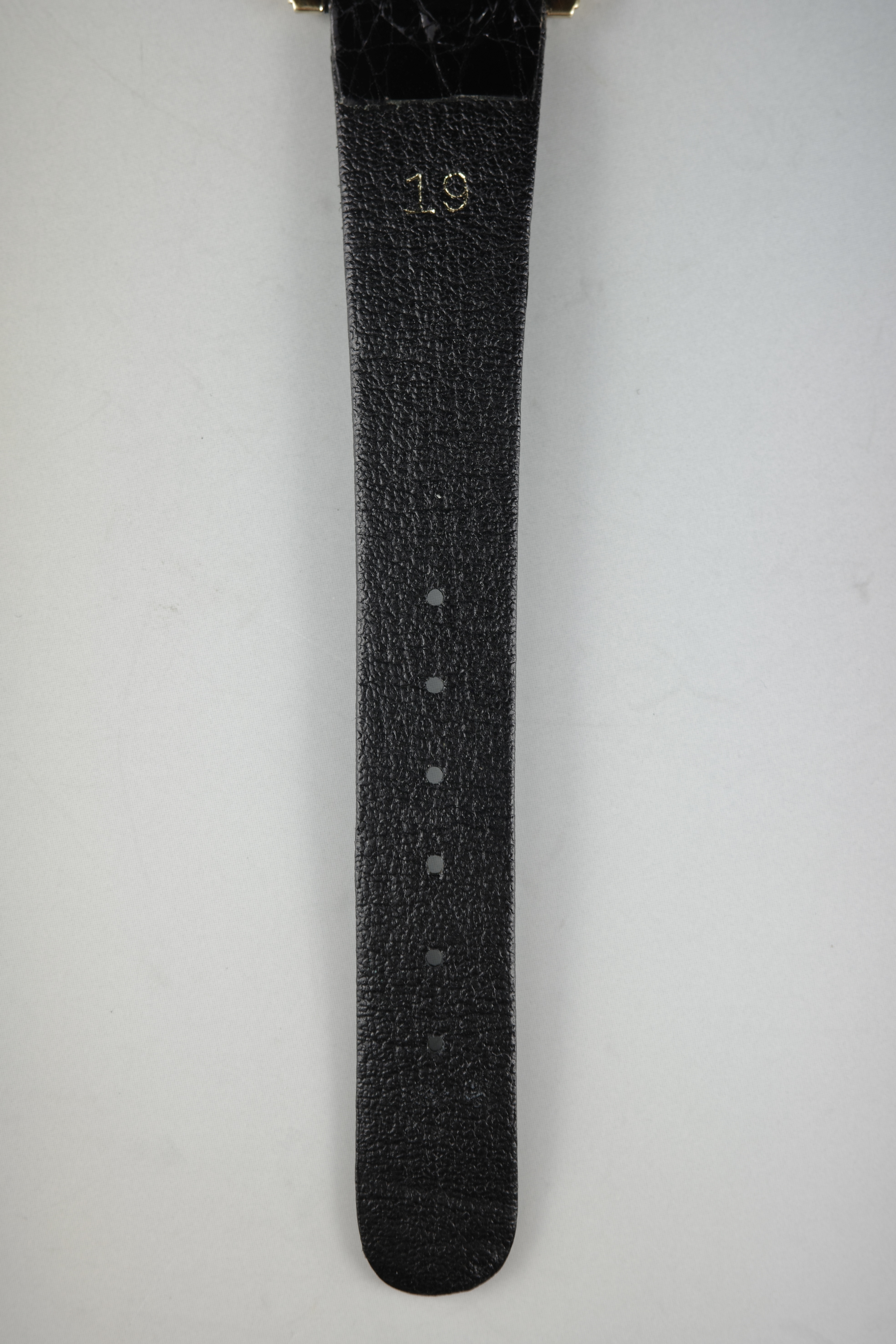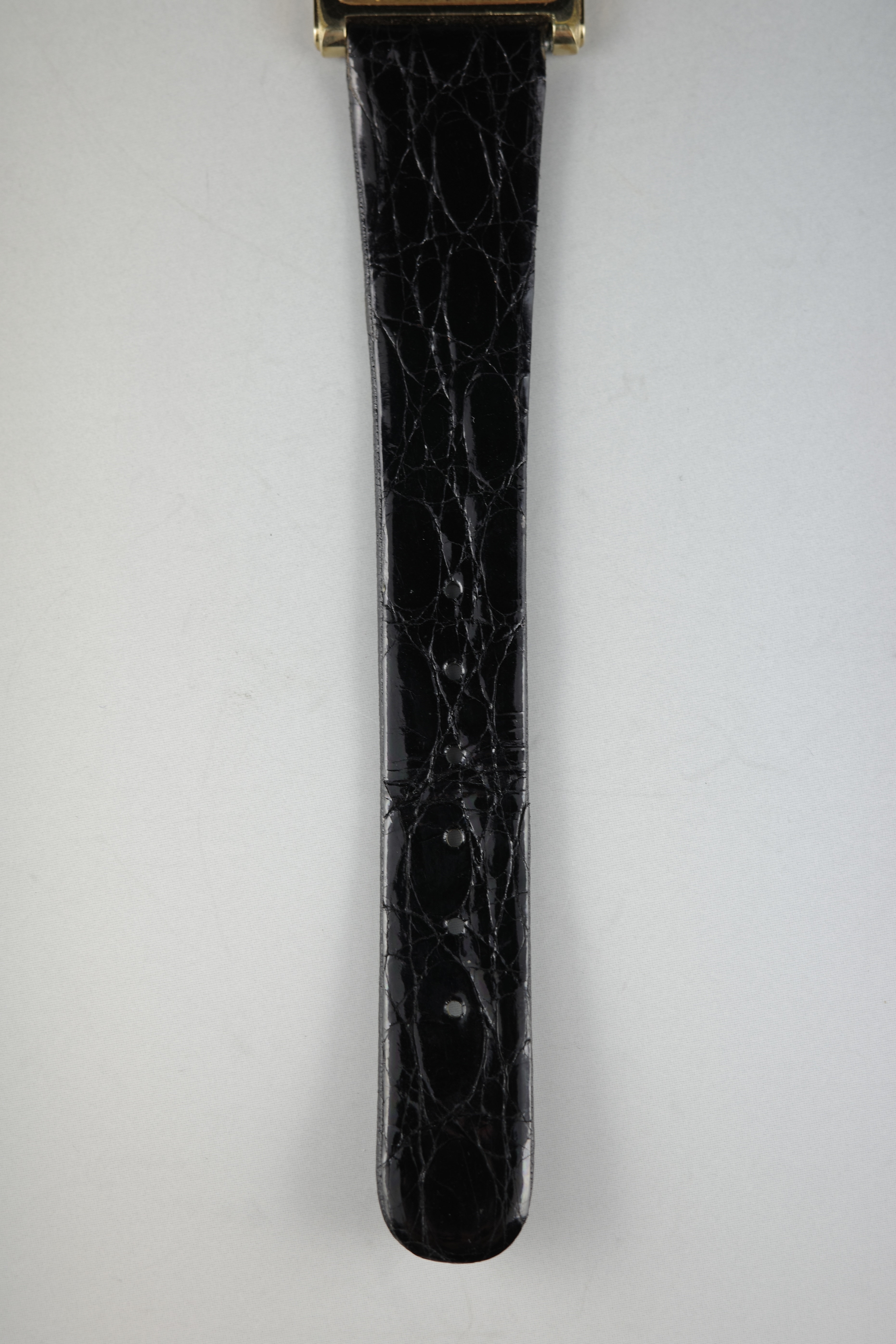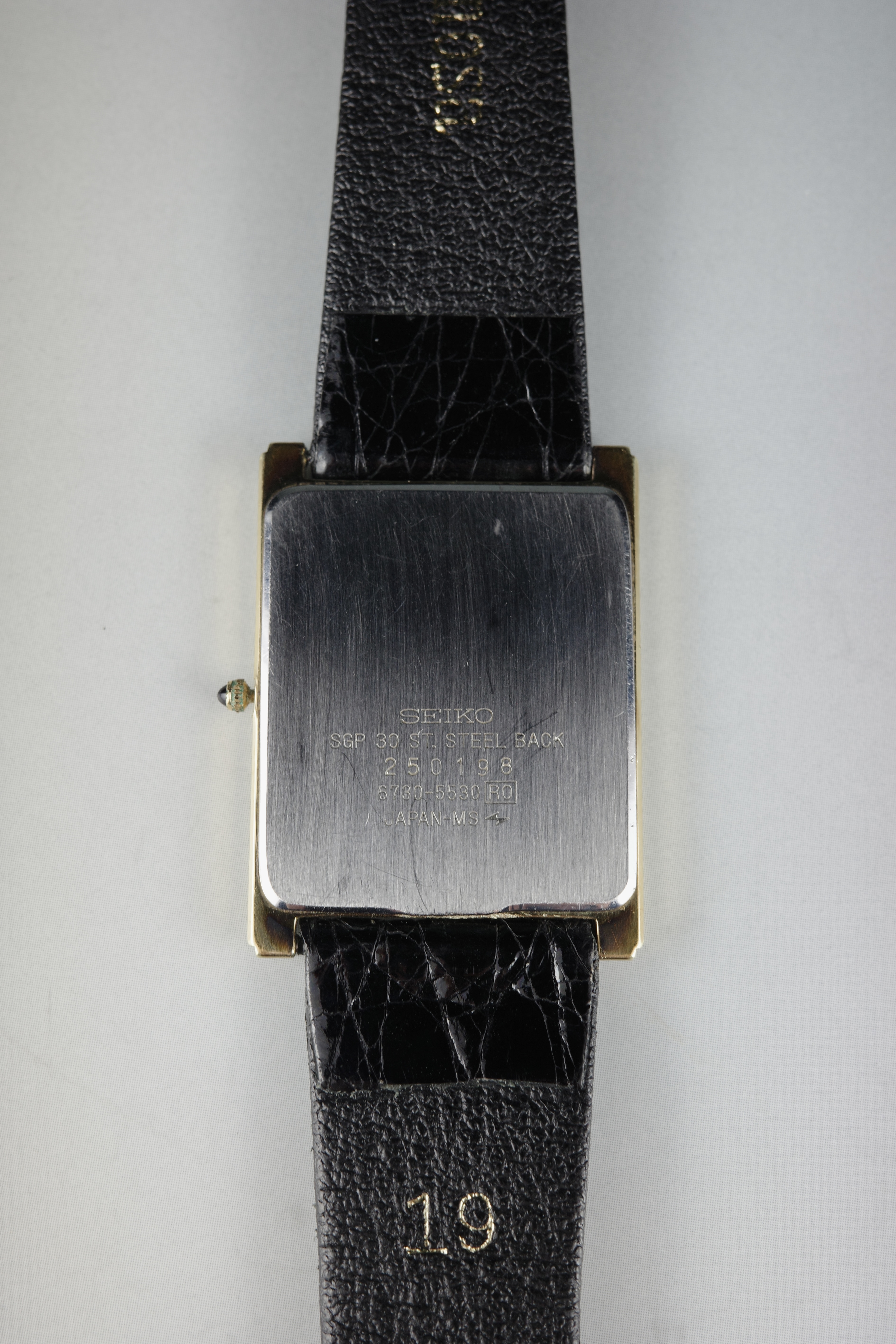 1980〜1990年代頃のセイコー「ドルチェ」ヴィンテージドレスウォッチ。シンプルで洗練された佇まいの中に、当時の国産時計が持つ確かな品質と美意識が息づく一本です。ゴールドトーンの極薄レクタンギュラーケースに、ブラックレザーのストラップが全体を引き締め、クラシカルかつモードな印象のアイテム。