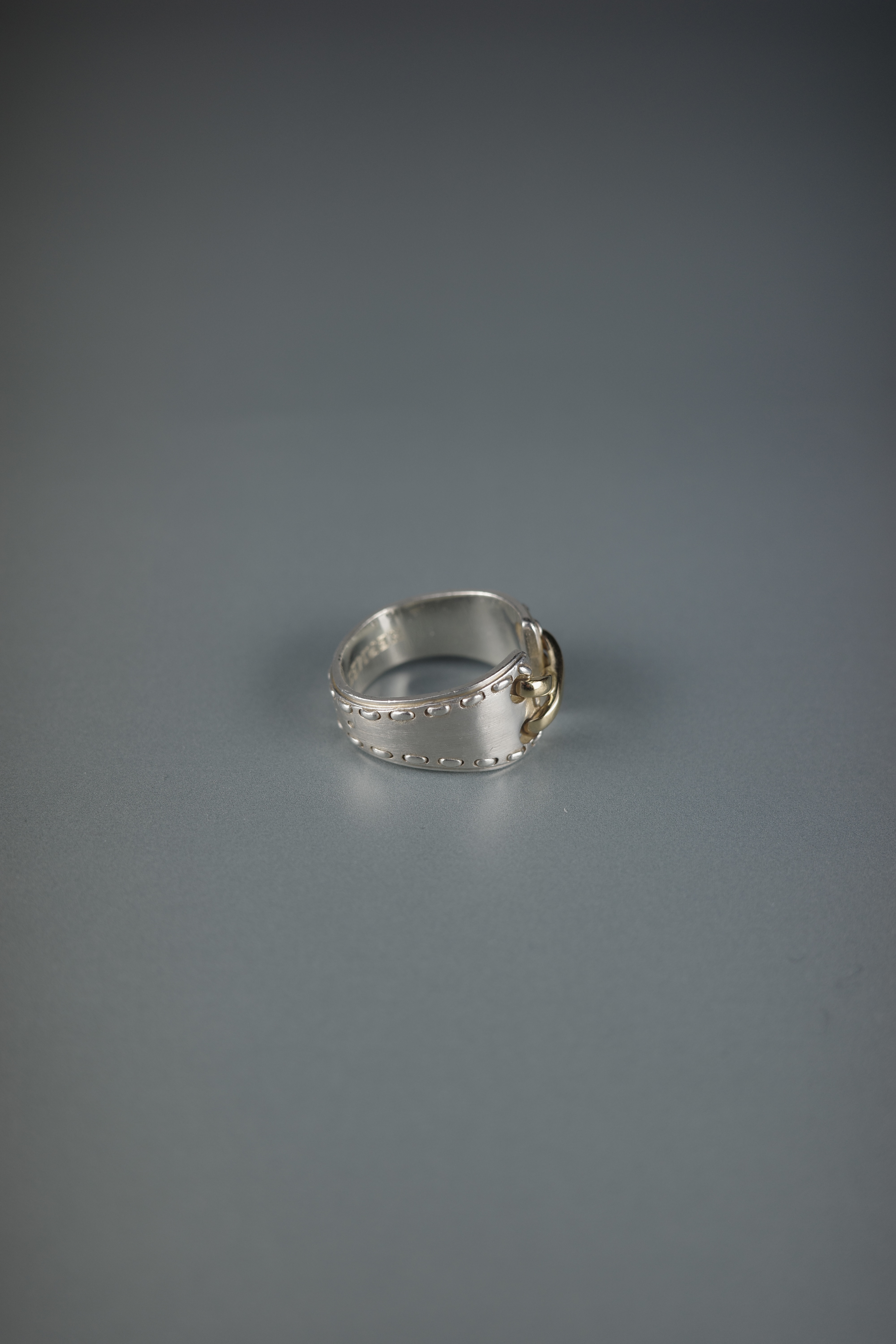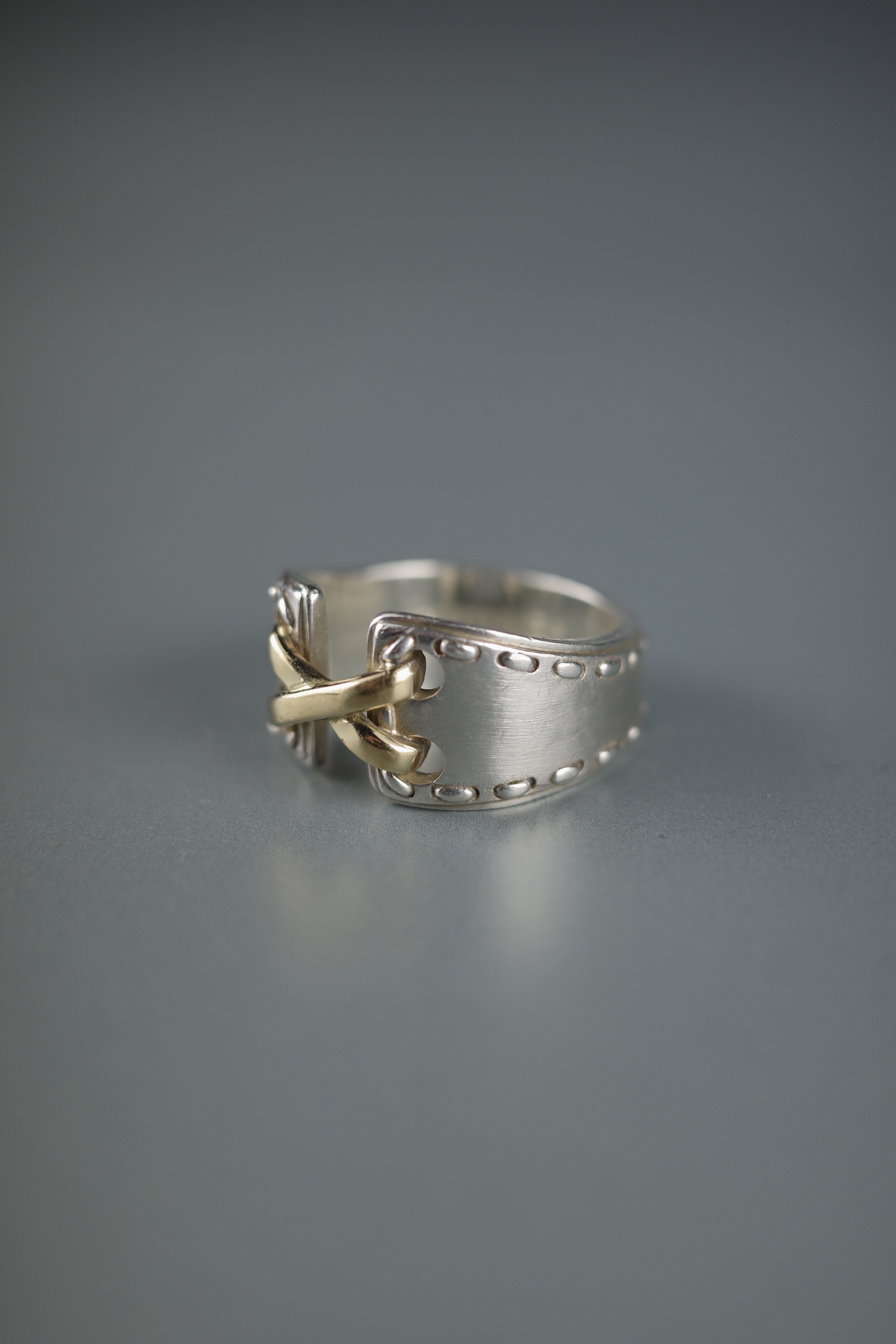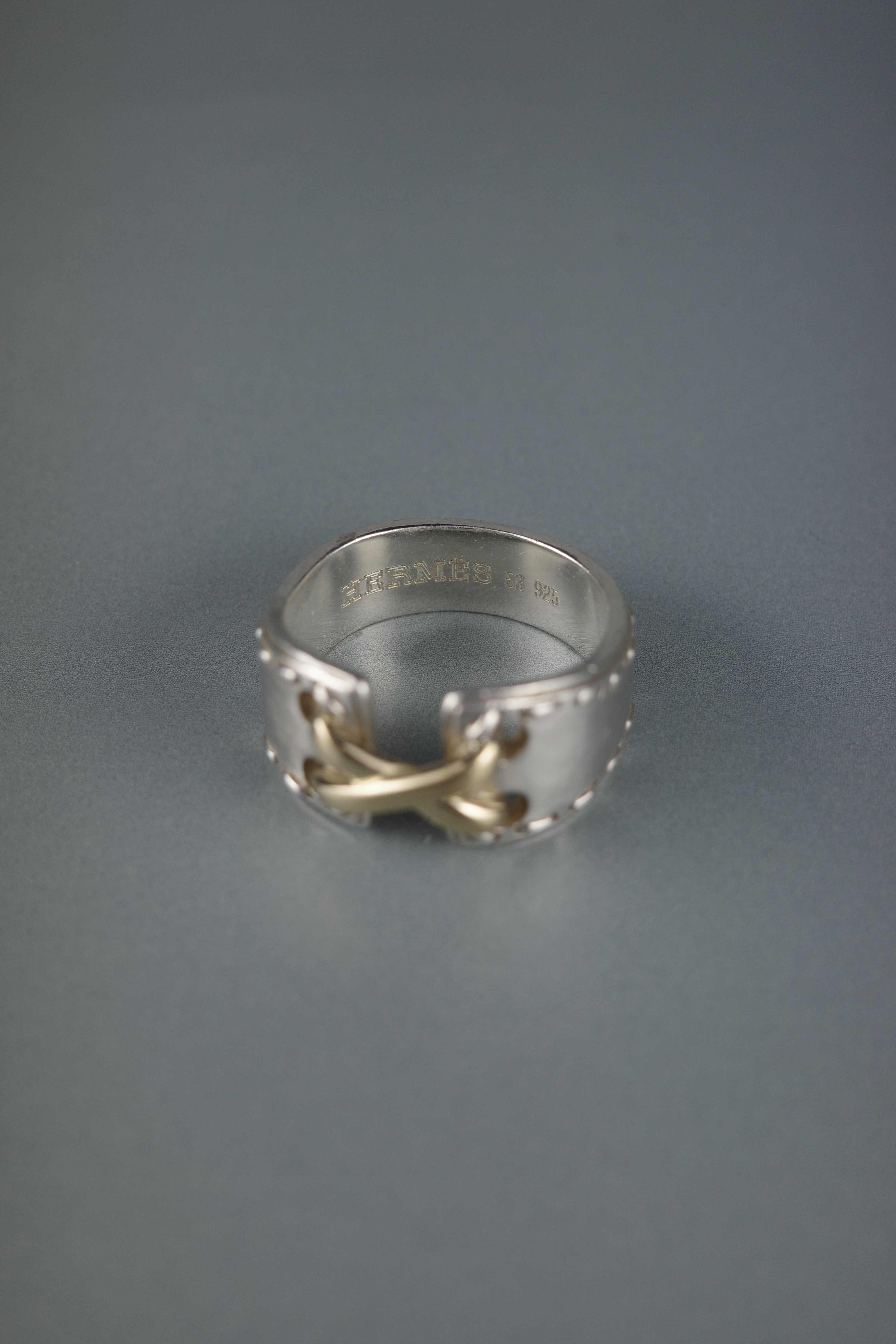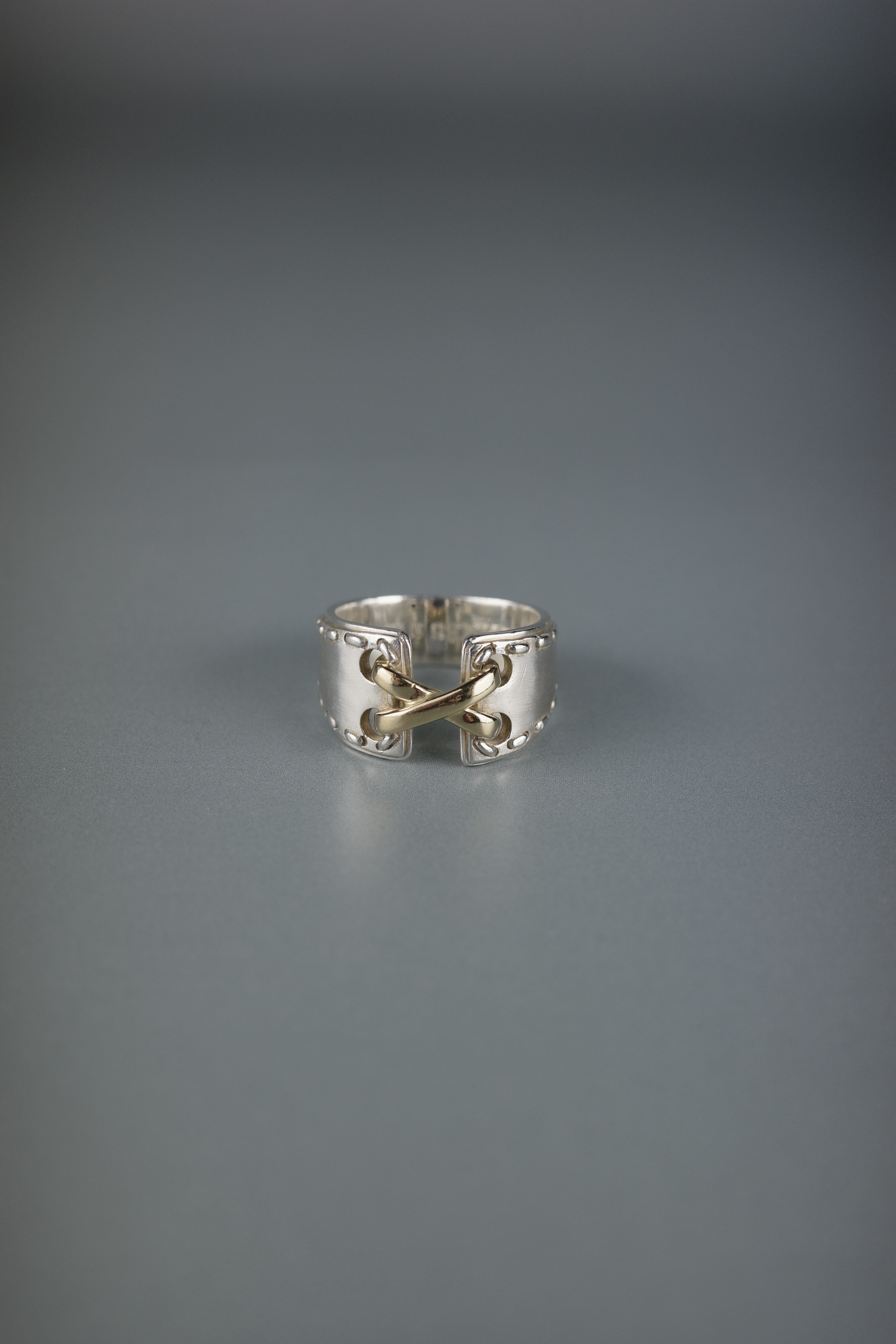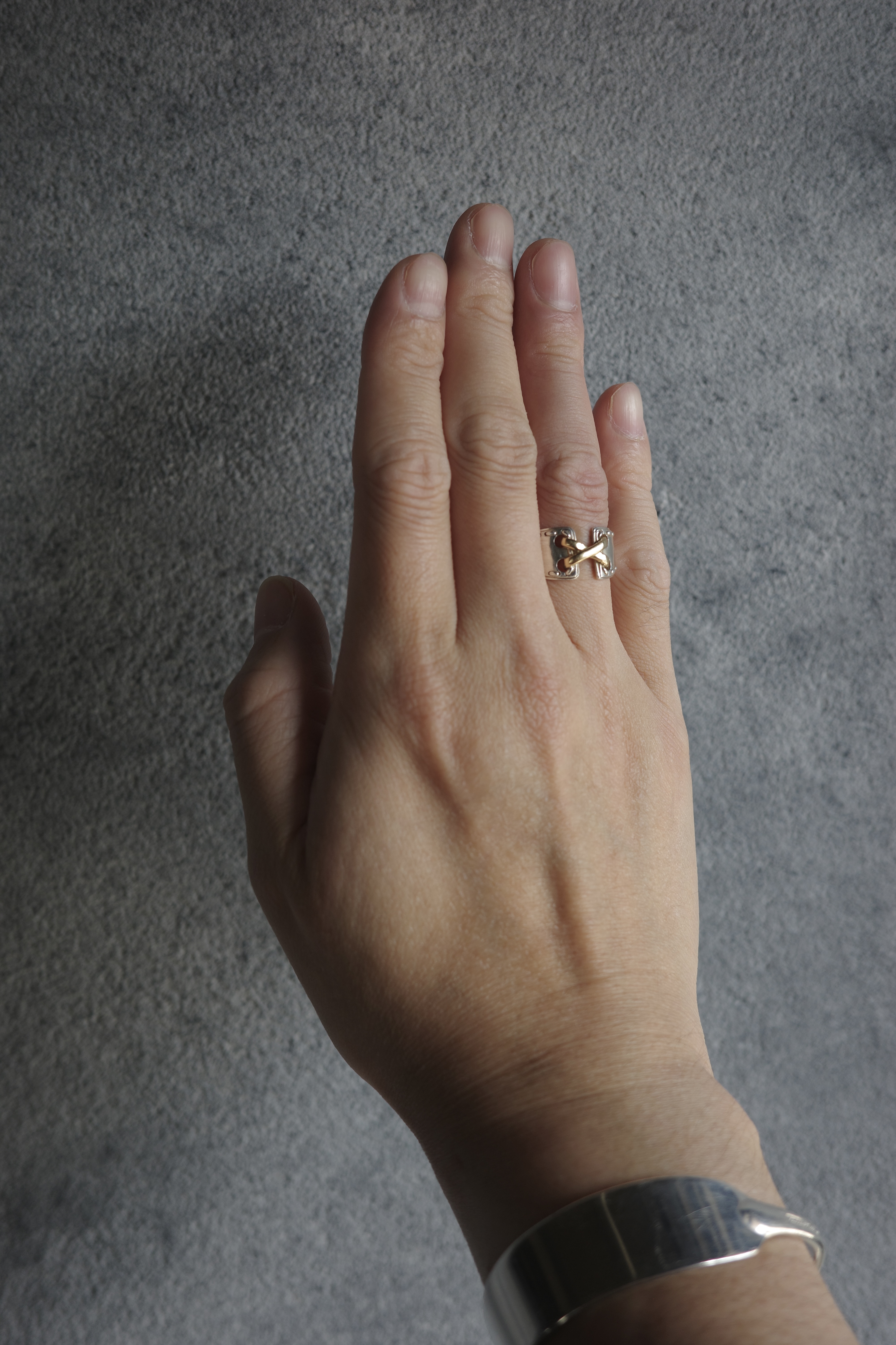エルメスの名作リング「Mexico(メキシコ)」。ドレスのコルセットを思わせる構築的なディテールが魅力のヴィンテージコンビリング。シルバーのボディを左右から締め上げるように、ゴールドバーがクロスして留められたデザインは、まさにエレガントなコルセットをジュエリーとして再解釈したもの。指元に置くだけでクラシックとモードの両方を感じられるバランスが秀逸なアイテム。
