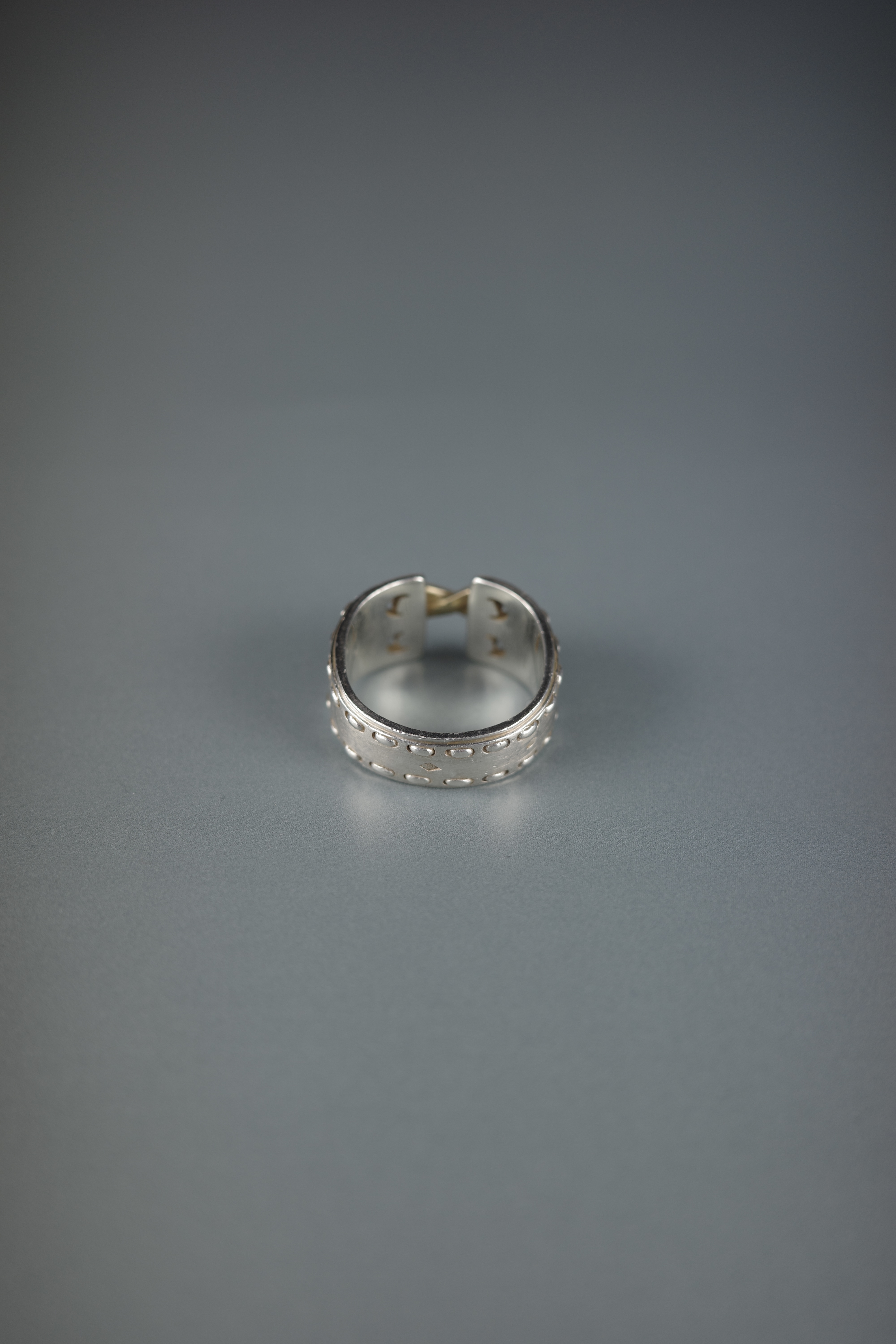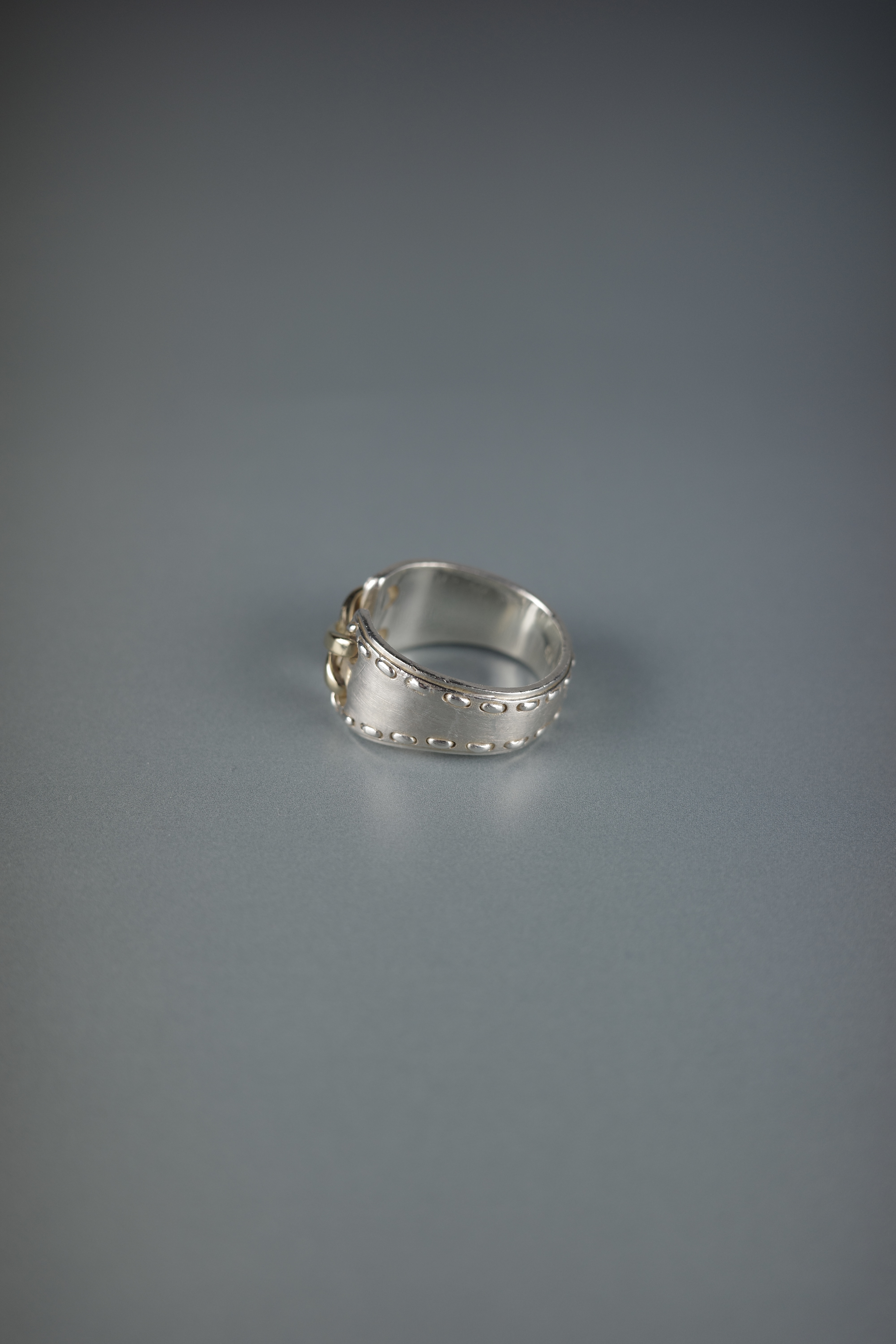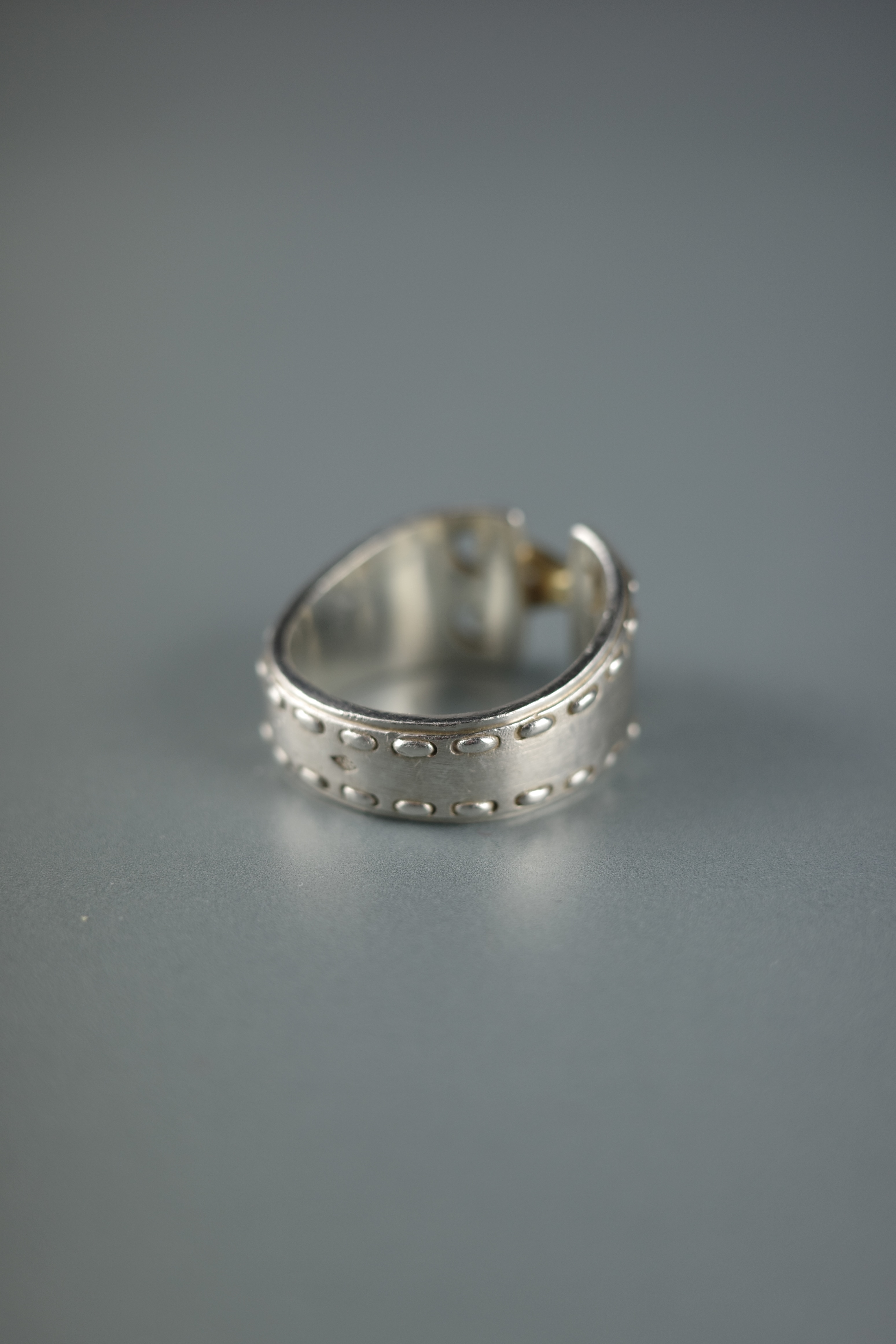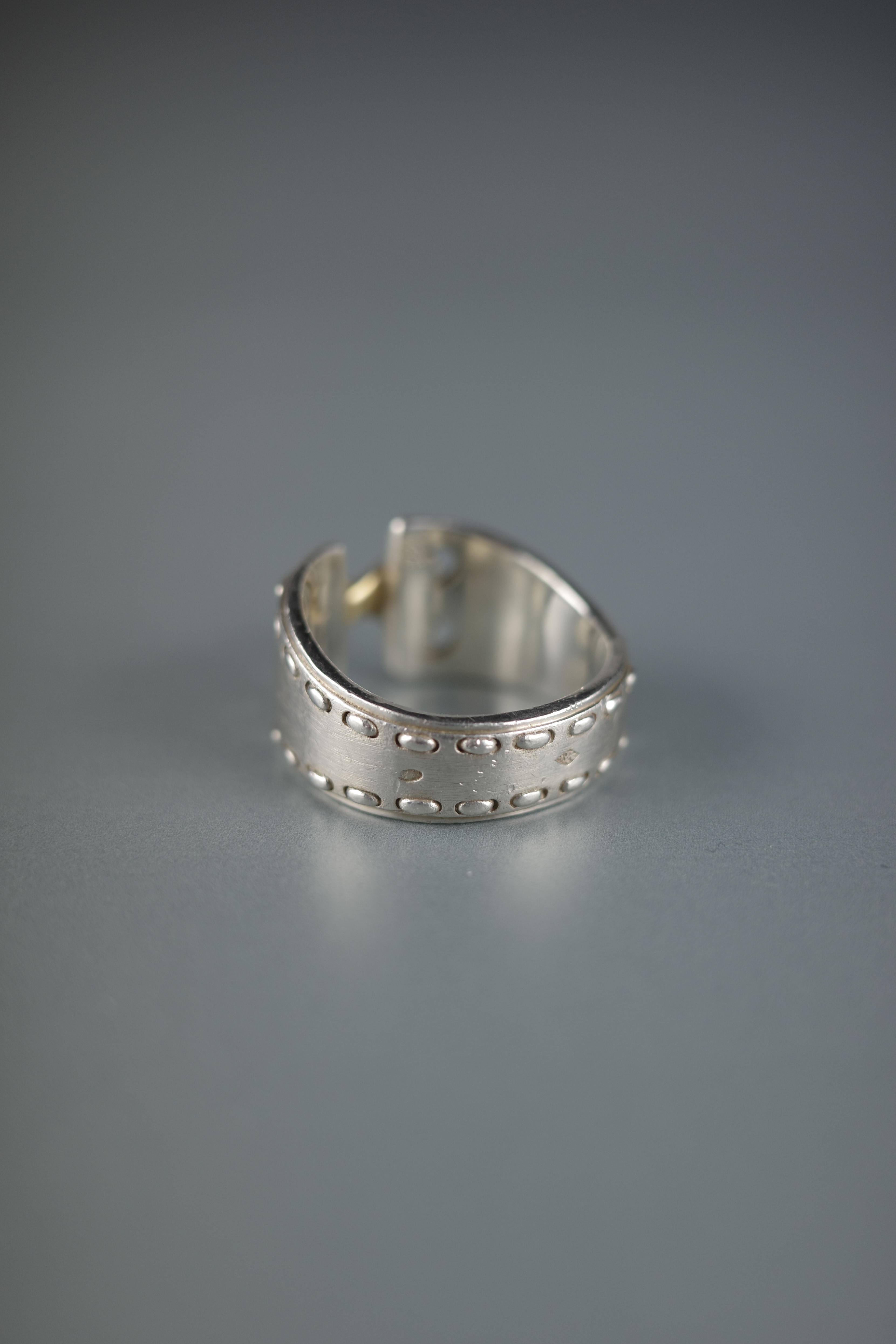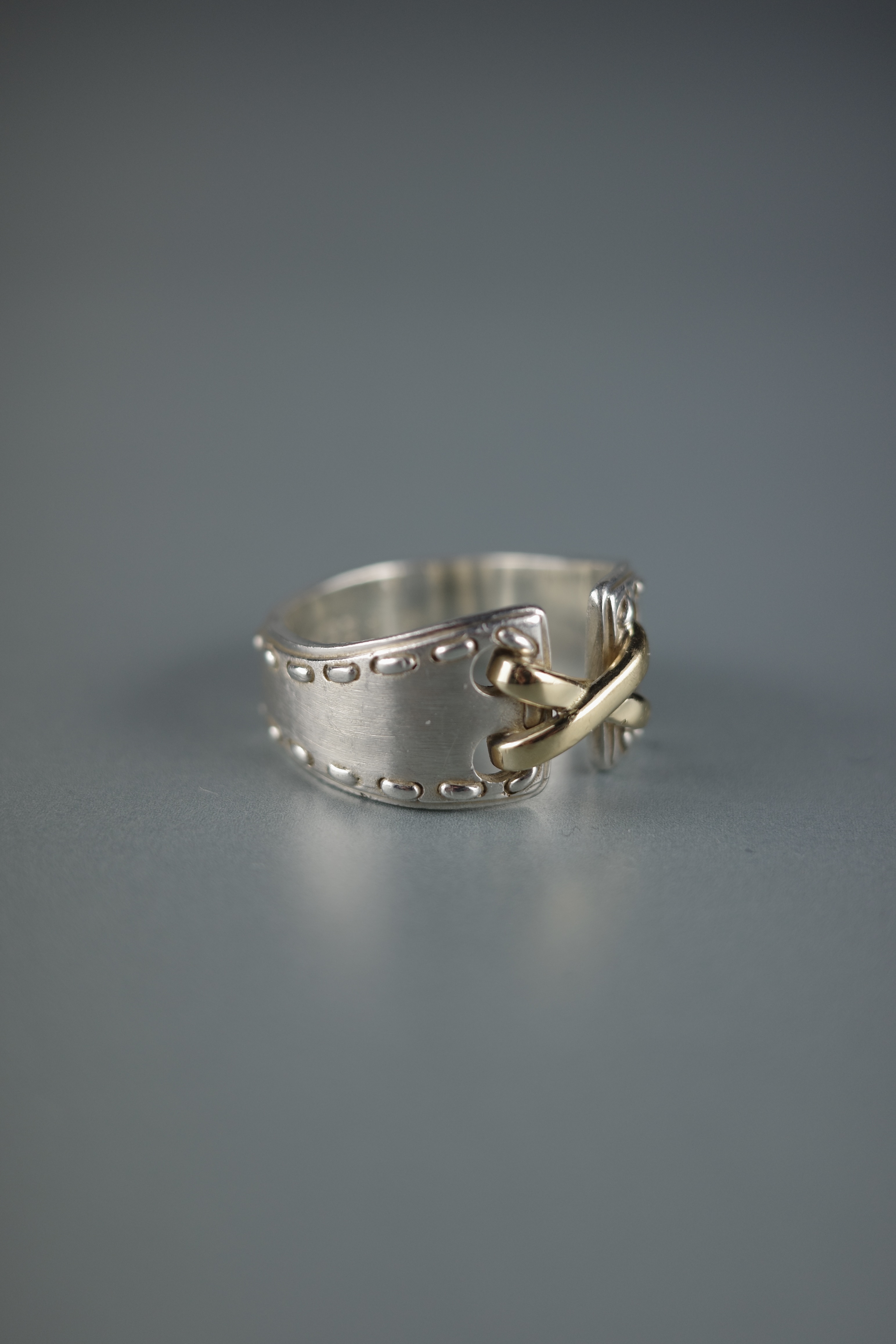 エルメスの名作リング「Mexico(メキシコ)」。ドレスのコルセットを思わせる構築的なディテールが魅力のヴィンテージコンビリング。シルバーのボディを左右から締め上げるように、ゴールドバーがクロスして留められたデザインは、まさにエレガントなコルセットをジュエリーとして再解釈したもの。指元に置くだけでクラシックとモードの両方を感じられるバランスが秀逸なアイテム。