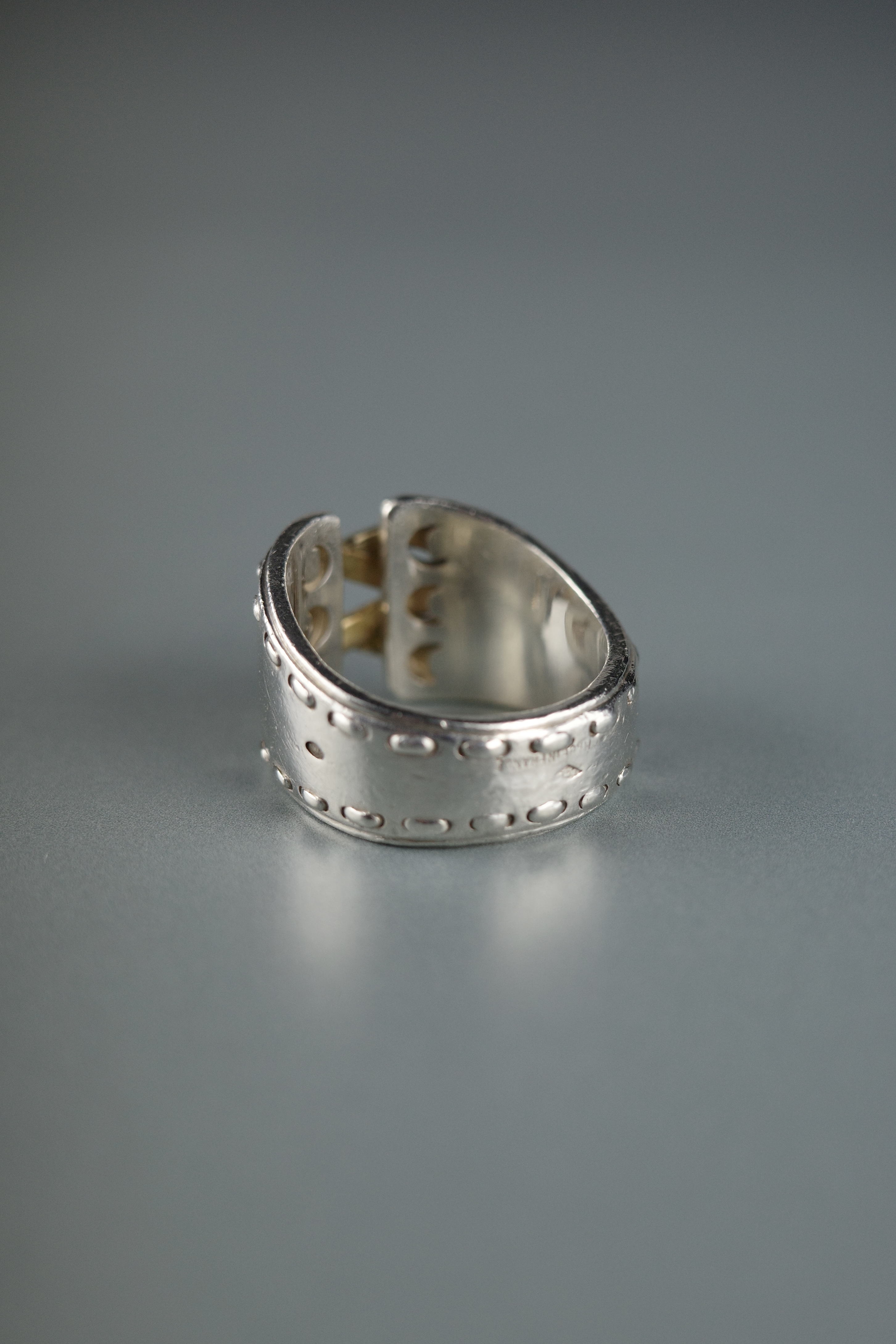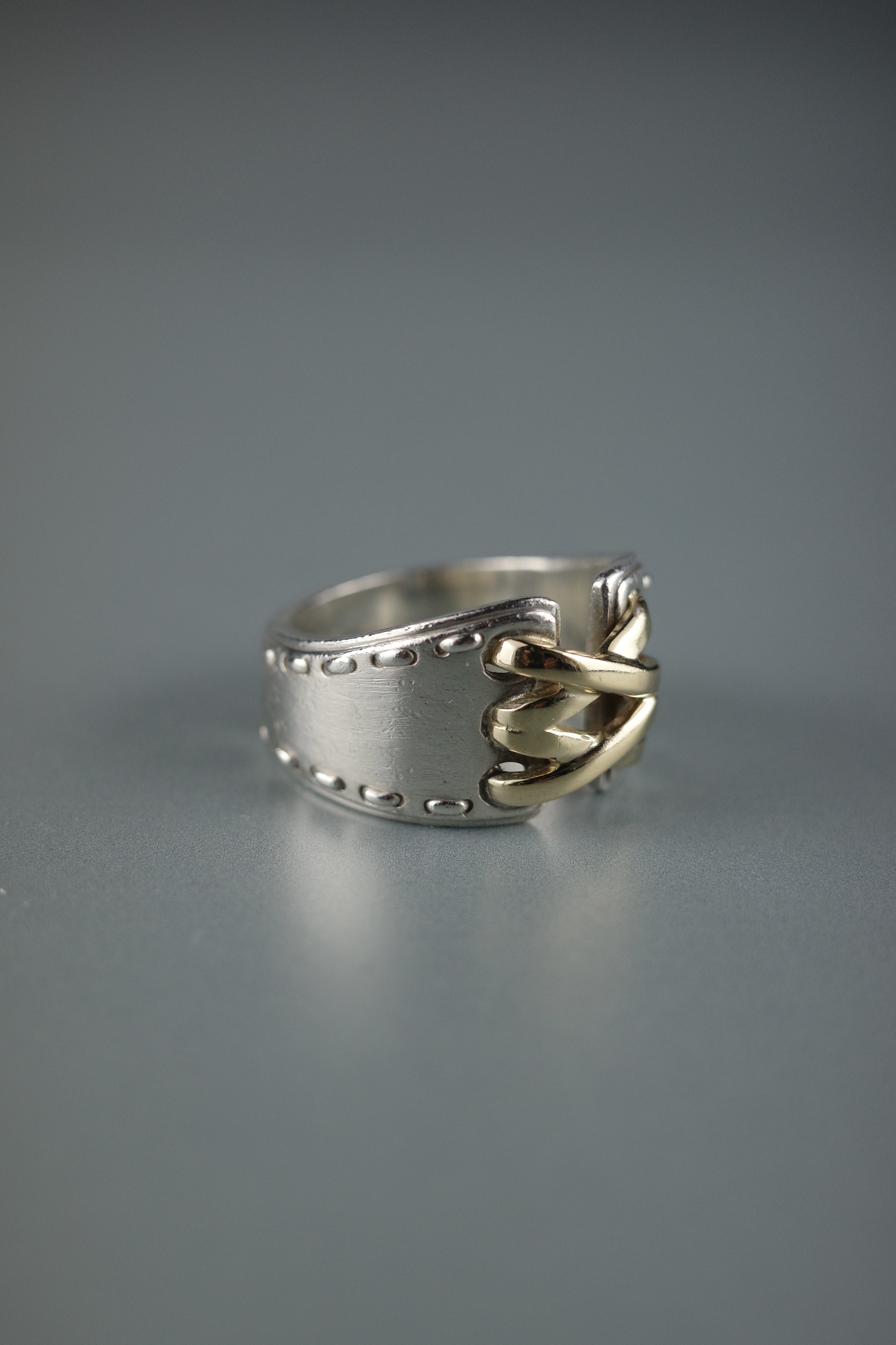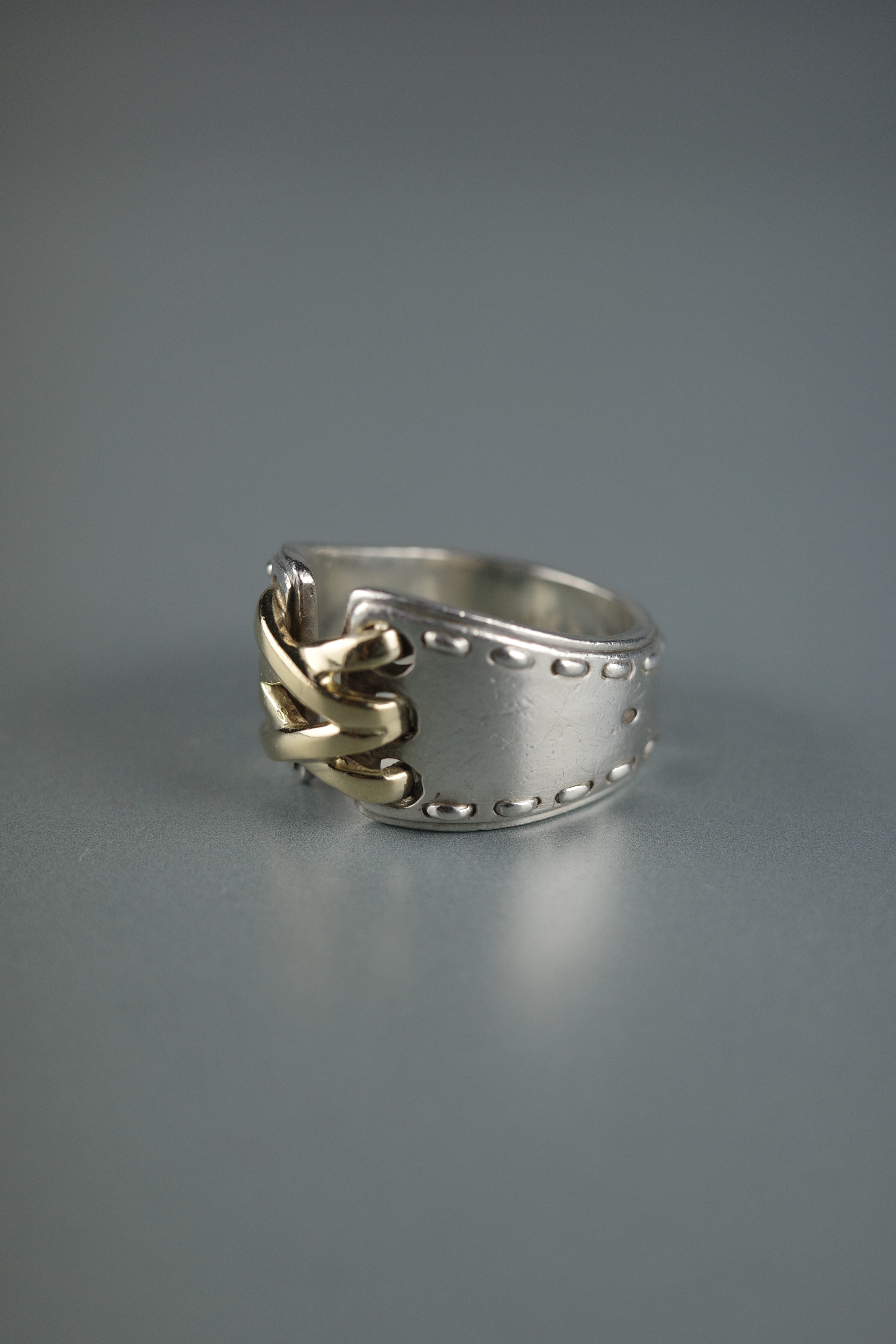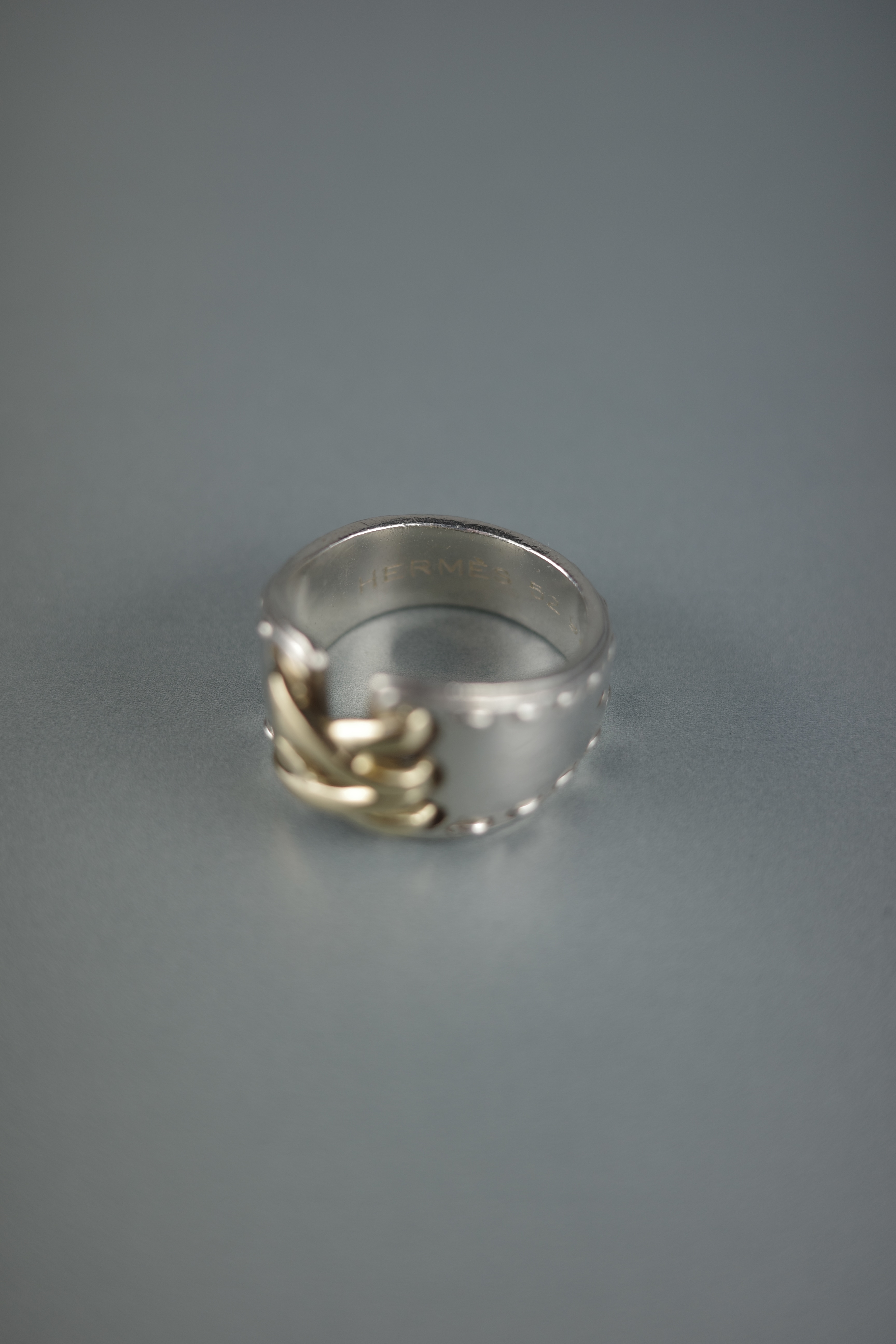 エルメスの人気アーカイブ「Mexico(メキシコ)」シリーズの、留め具が二重になった希少なヴィンテージリング。ドレスのコルセットを思わせるフロントのダブルクラスプが特徴で、立体的なフォルムが指元にしっかり存在感を与えてくれます。重厚なシルバーにゴールドパーツが映えるクラシックかつモードな一本。生産終了モデルの中でも特に流通の少ない“ダブル”仕様で、コレクションにもおすすめのアイテム。