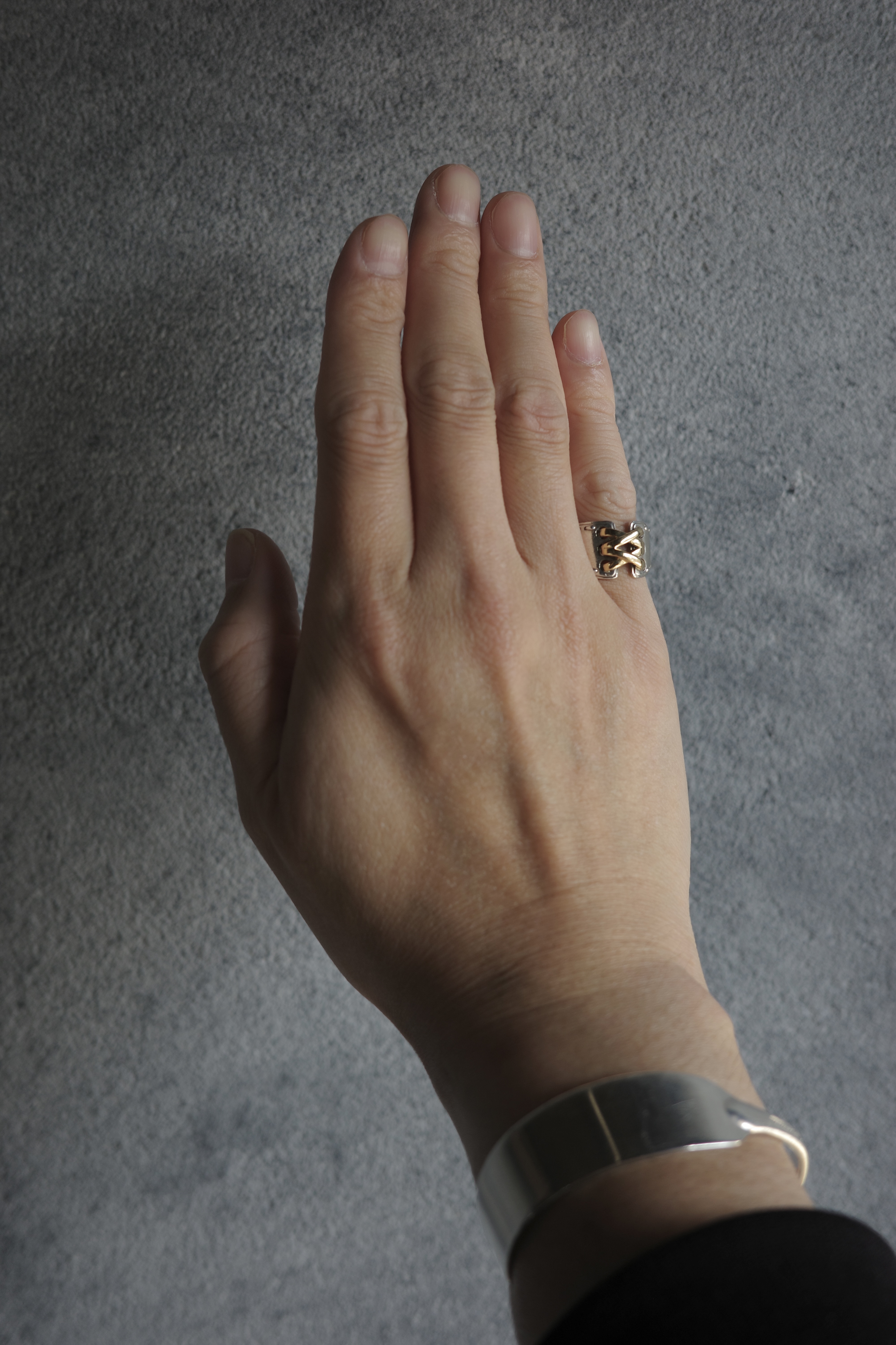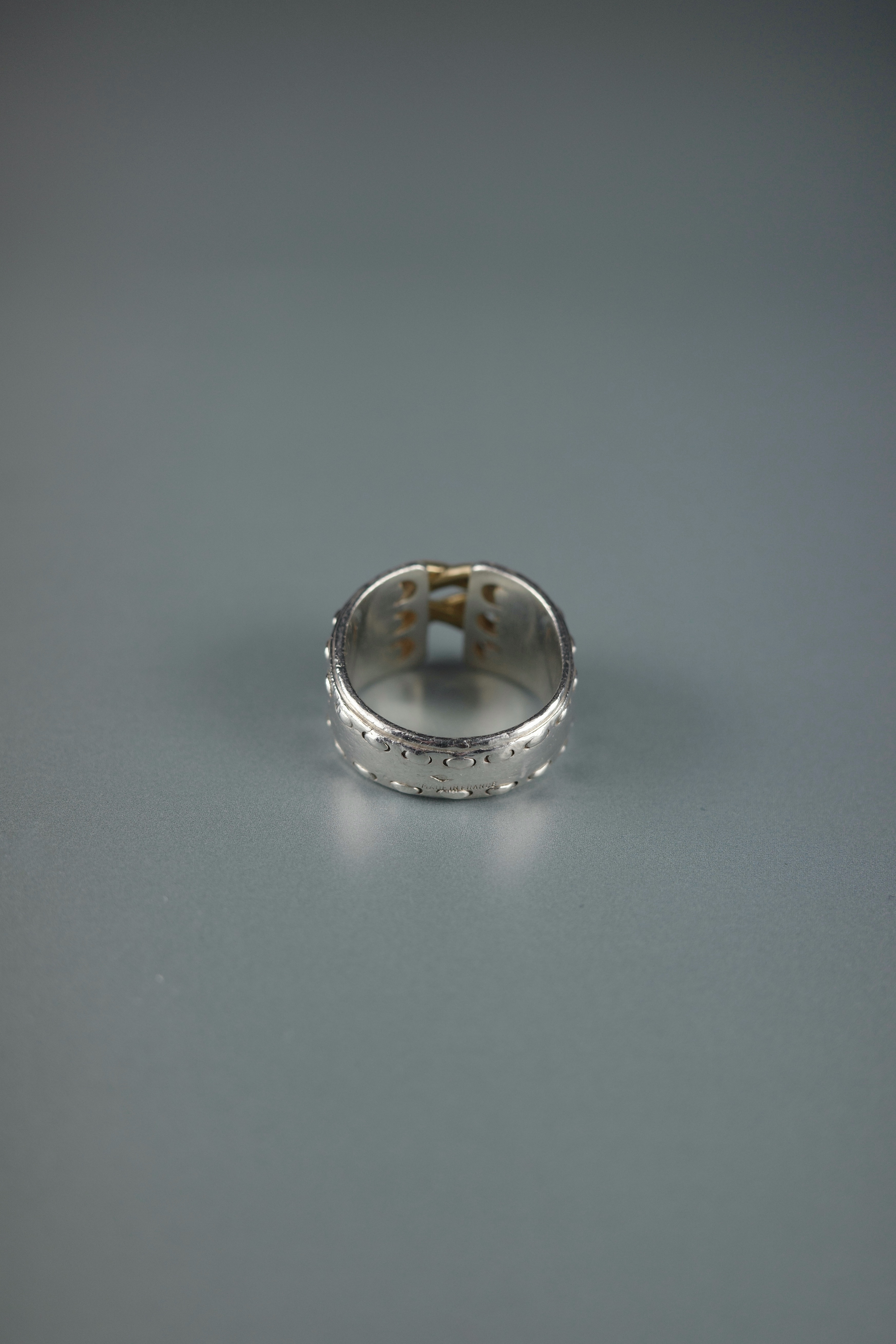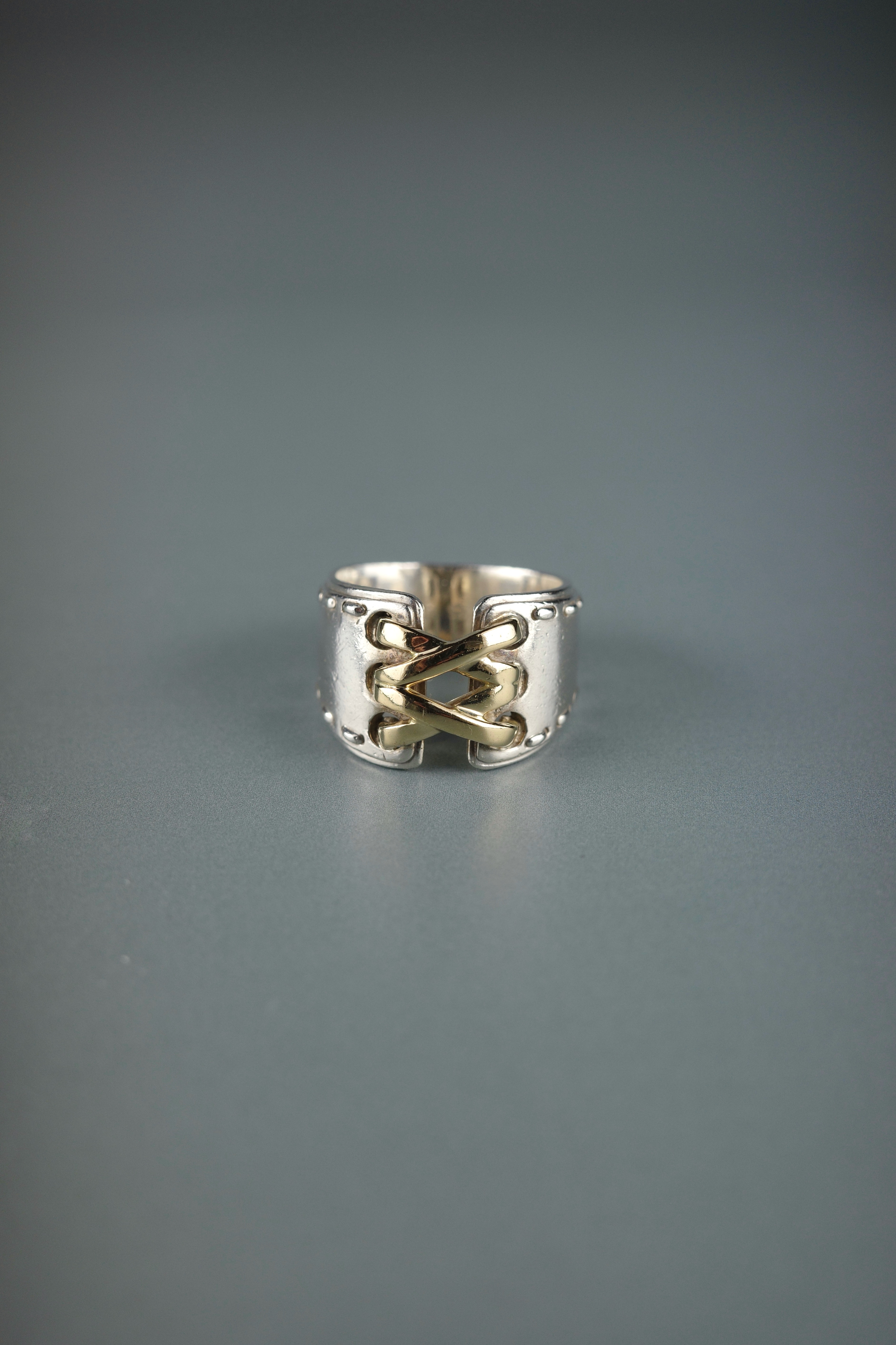 エルメスの人気アーカイブ「Mexico(メキシコ)」シリーズの、留め具が二重になった希少なヴィンテージリング。ドレスのコルセットを思わせるフロントのダブルクラスプが特徴で、立体的なフォルムが指元にしっかり存在感を与えてくれます。重厚なシルバーにゴールドパーツが映えるクラシックかつモードな一本。生産終了モデルの中でも特に流通の少ない“ダブル”仕様で、コレクションにもおすすめのアイテム。