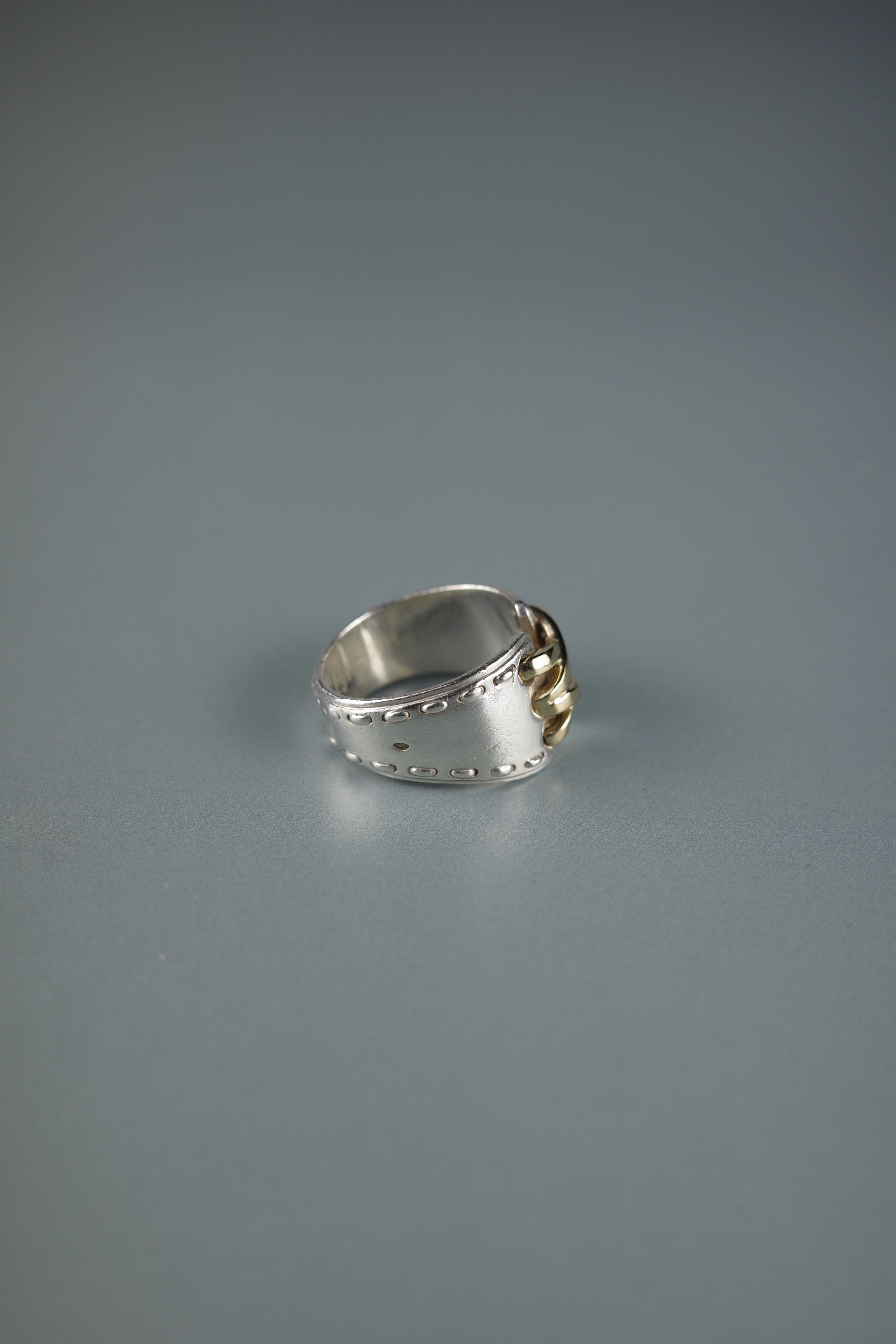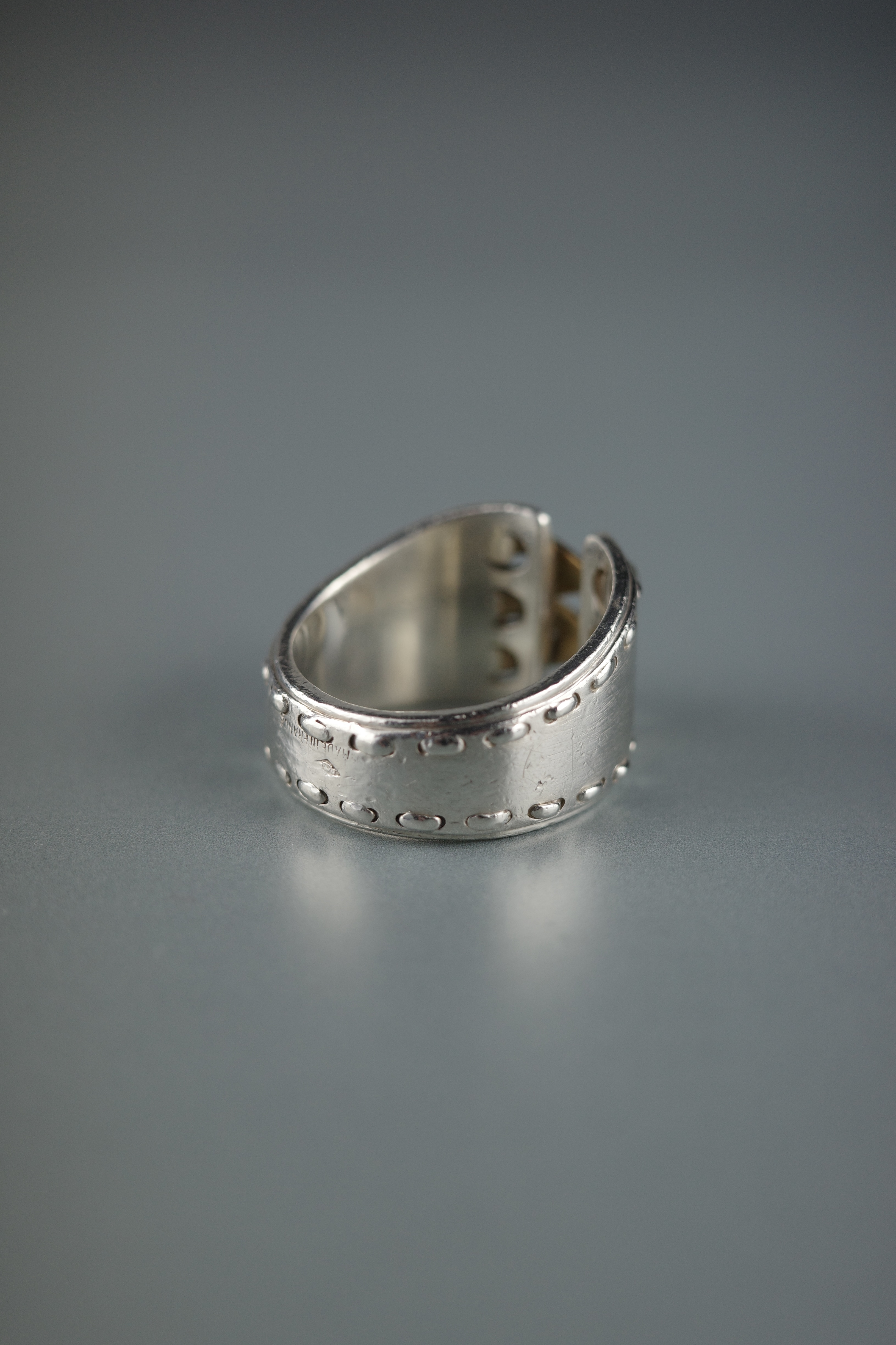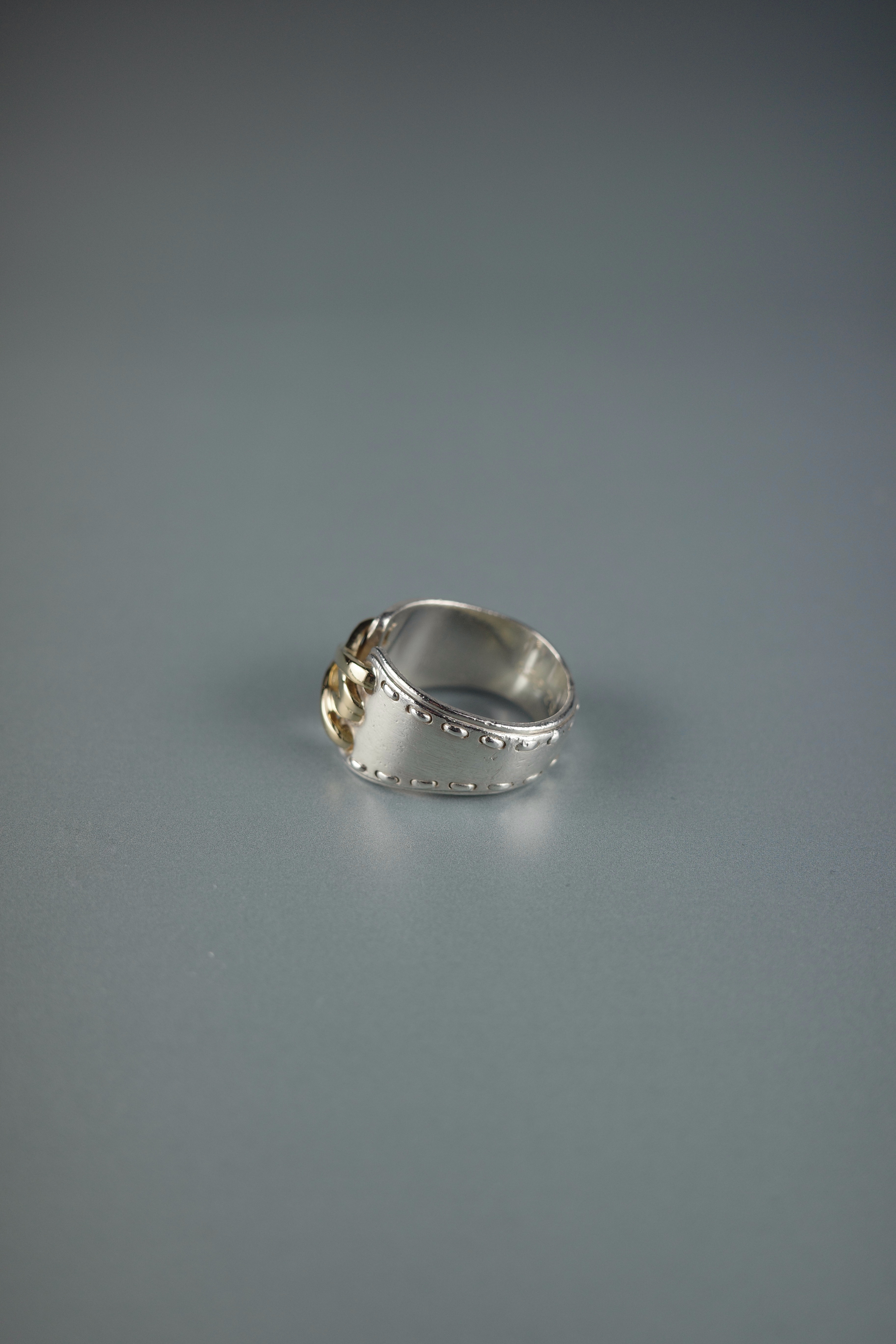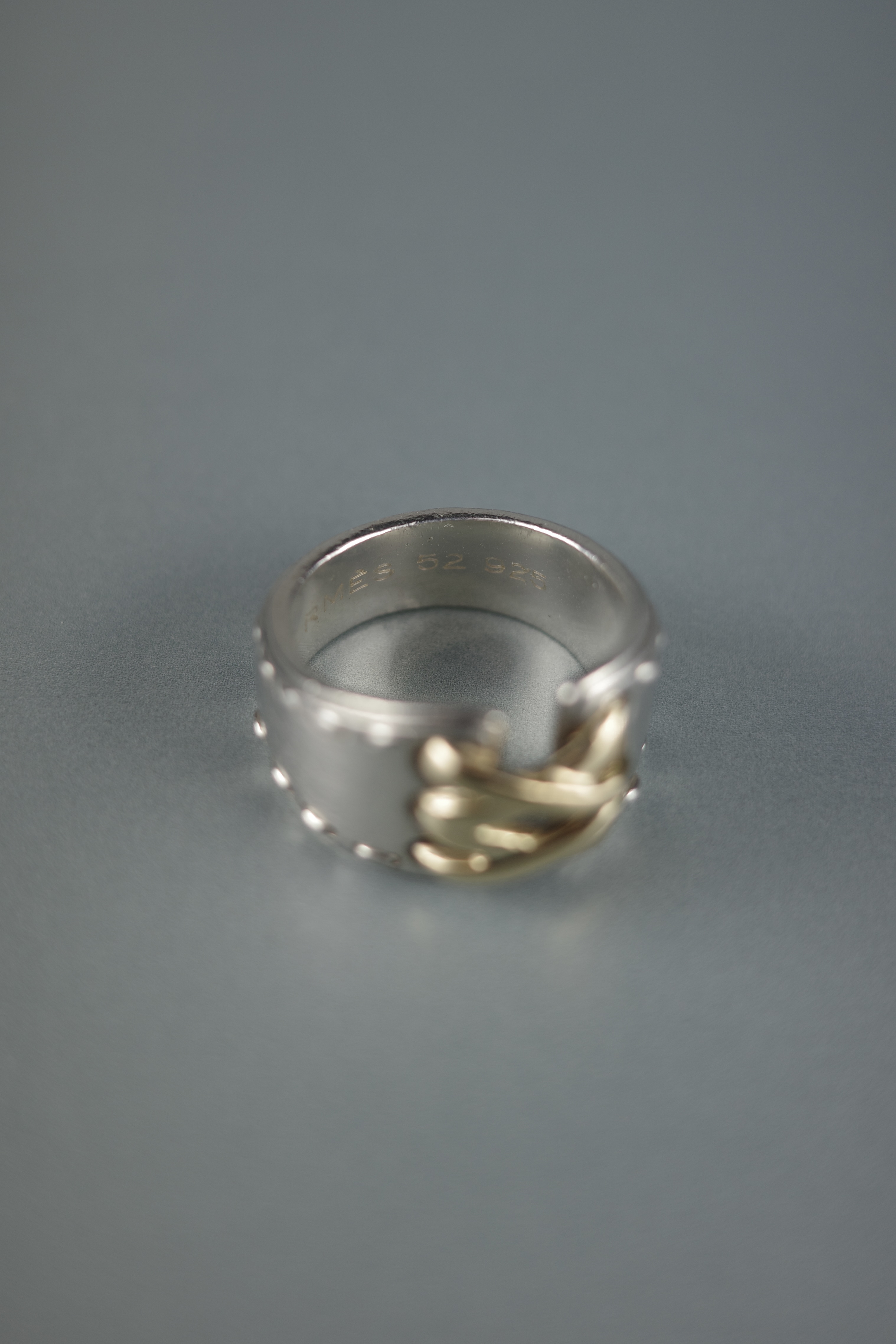 エルメスの人気アーカイブ「Mexico(メキシコ)」シリーズの、留め具が二重になった希少なヴィンテージリング。ドレスのコルセットを思わせるフロントのダブルクラスプが特徴で、立体的なフォルムが指元にしっかり存在感を与えてくれます。重厚なシルバーにゴールドパーツが映えるクラシックかつモードな一本。生産終了モデルの中でも特に流通の少ない“ダブル”仕様で、コレクションにもおすすめのアイテム。