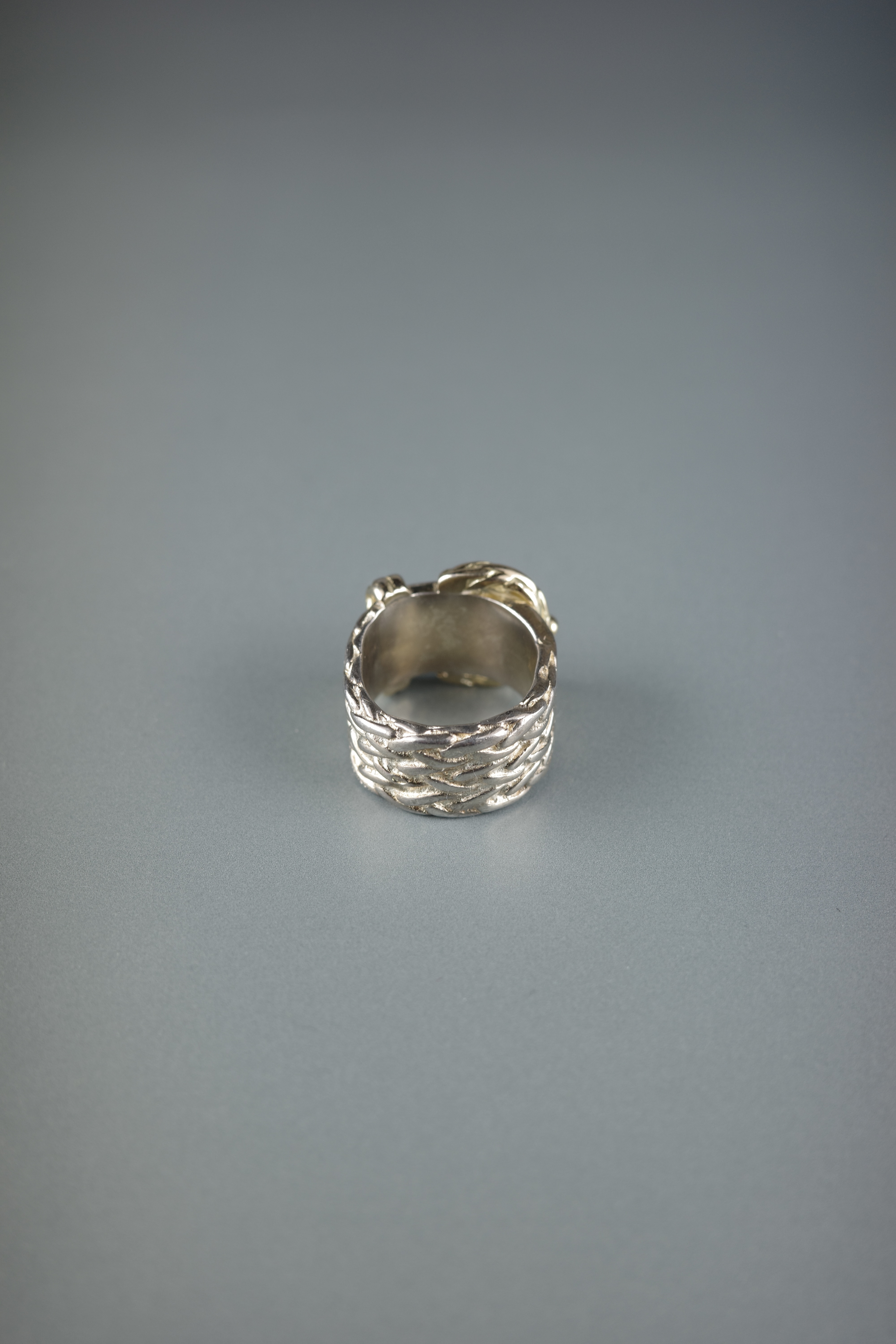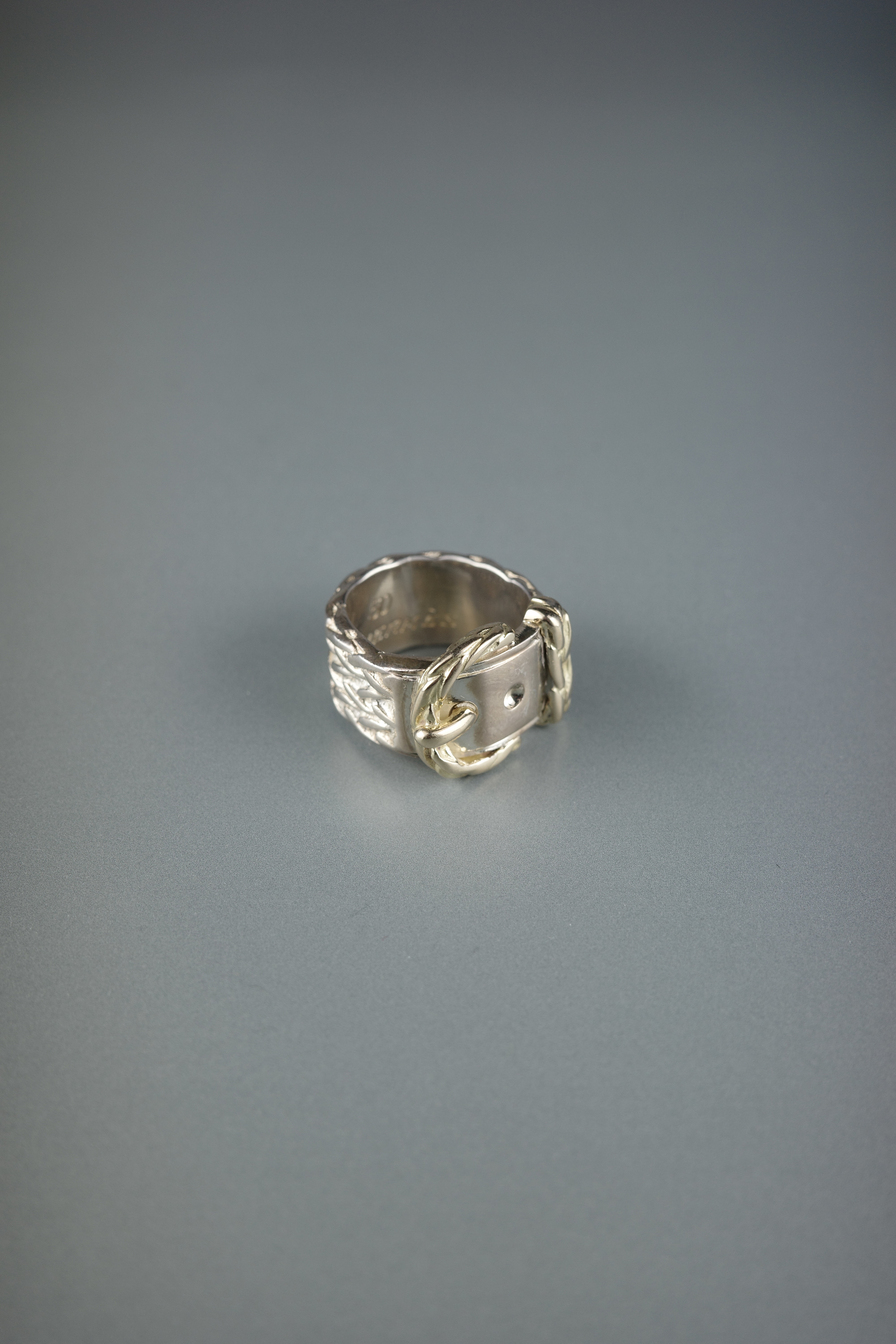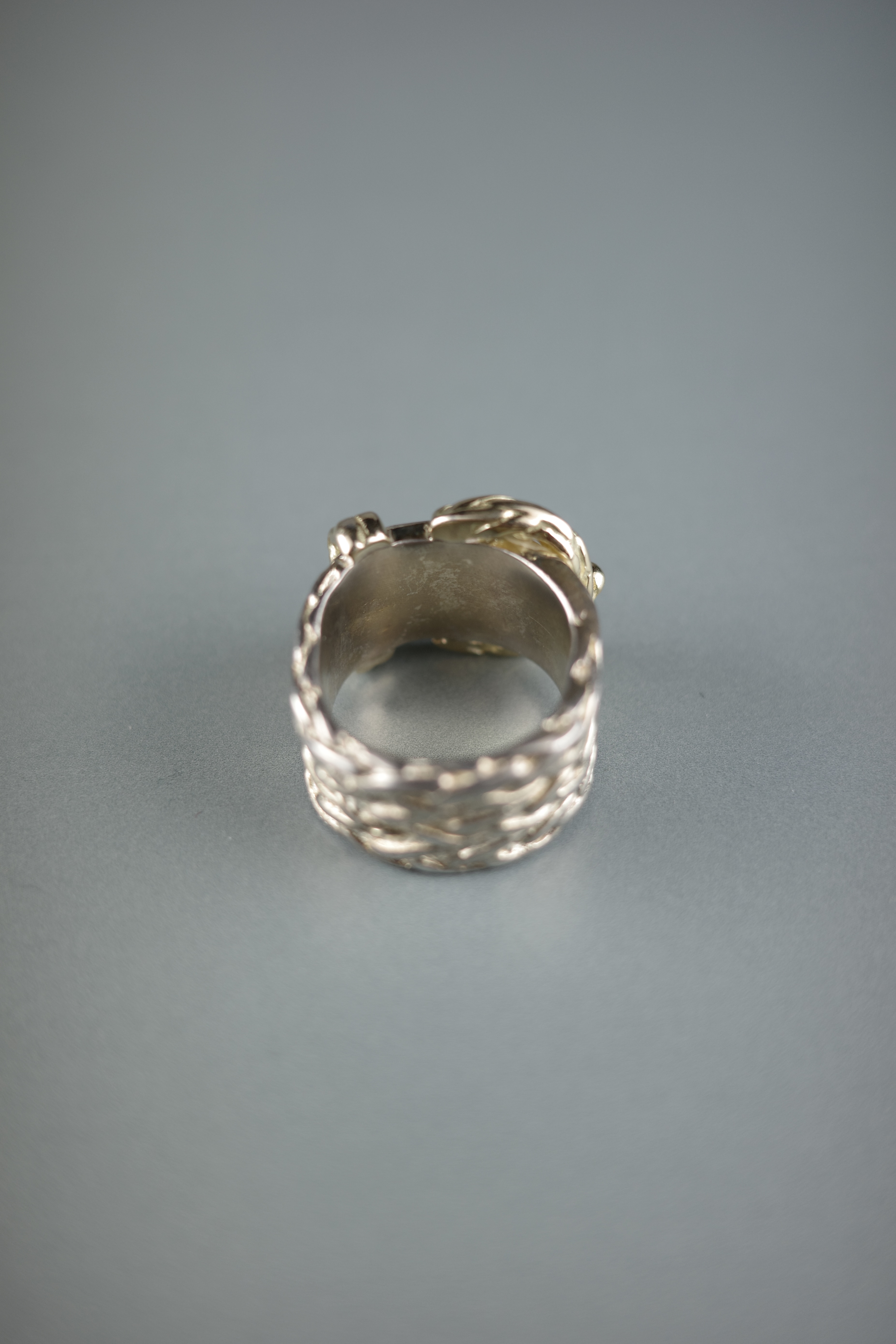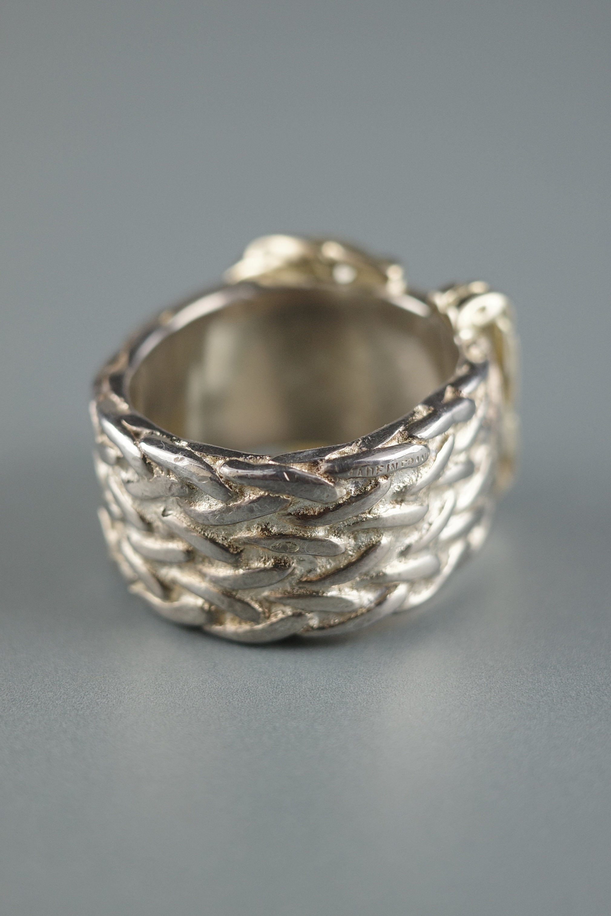 エルメスの名作アーカイヴ、“Diane(ディアンヌ)” のコンビリング。立体的に編み込まれたようなモチーフが一周ぐるりと施された、彫刻作品のような存在感が特徴。 およそ1970年代〜1980年代ごろに製造されていたヴィンテージモデルで、エルメスらしい品の良さと重厚感がありながら、デイリーユースにも馴染む万能リングです。