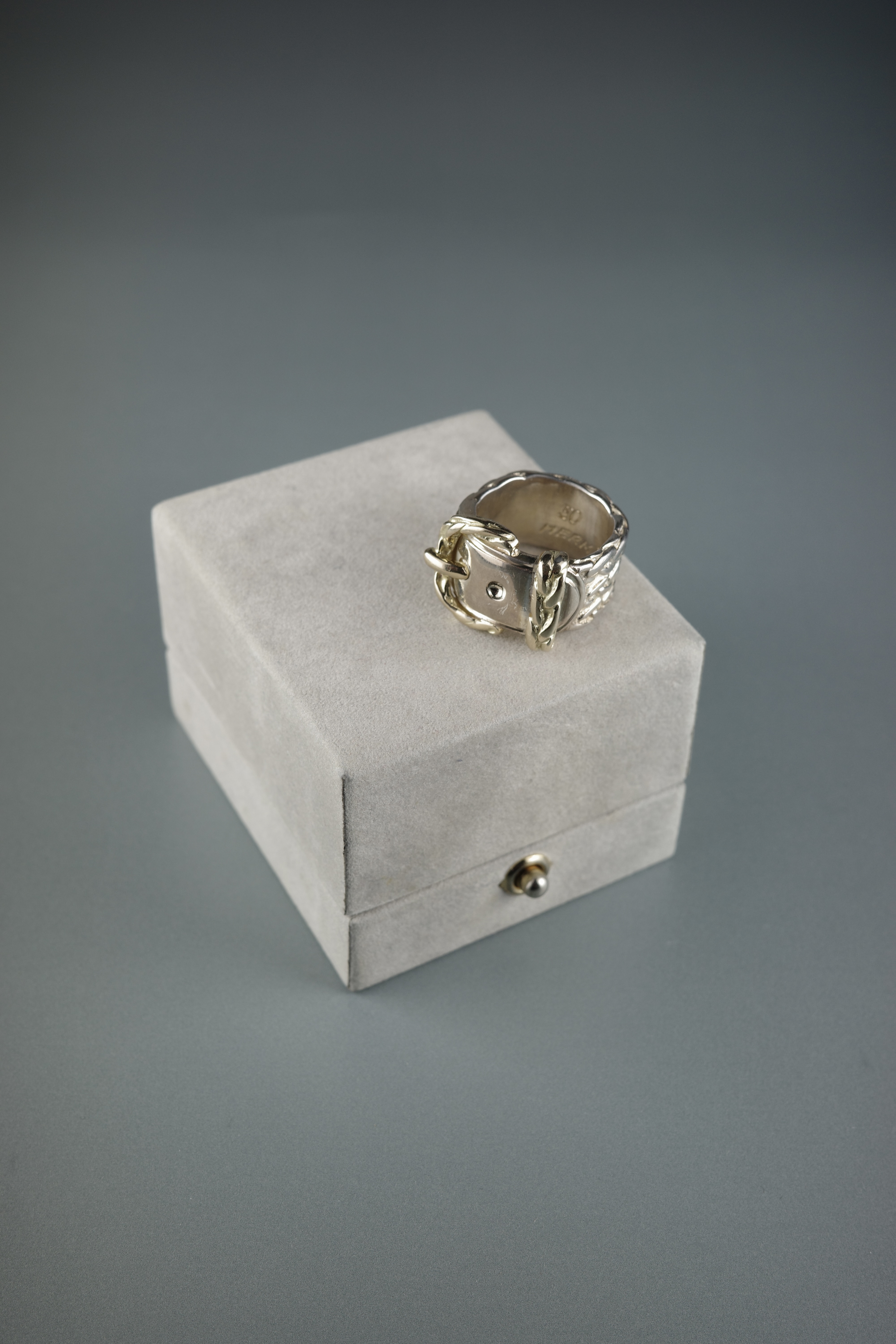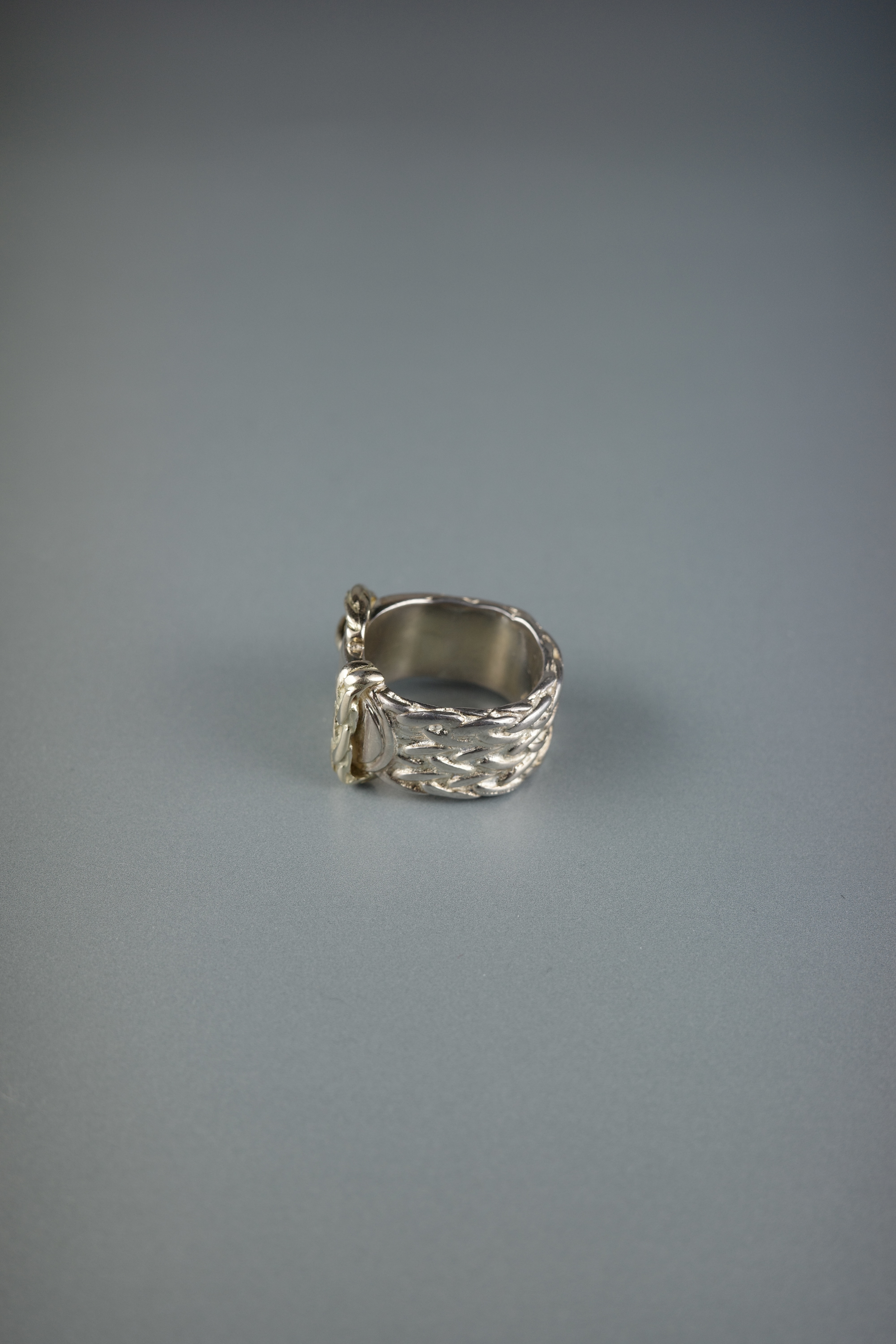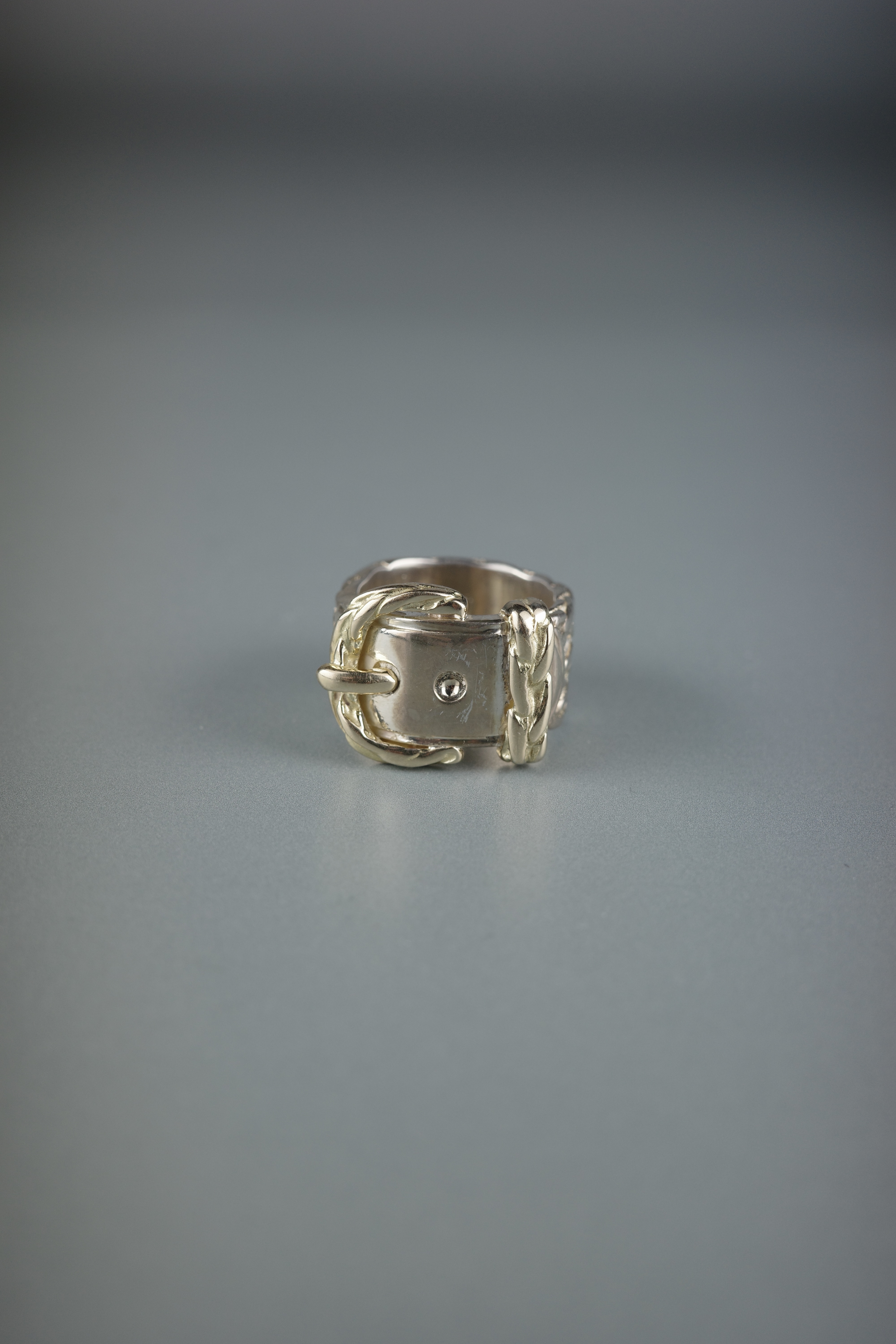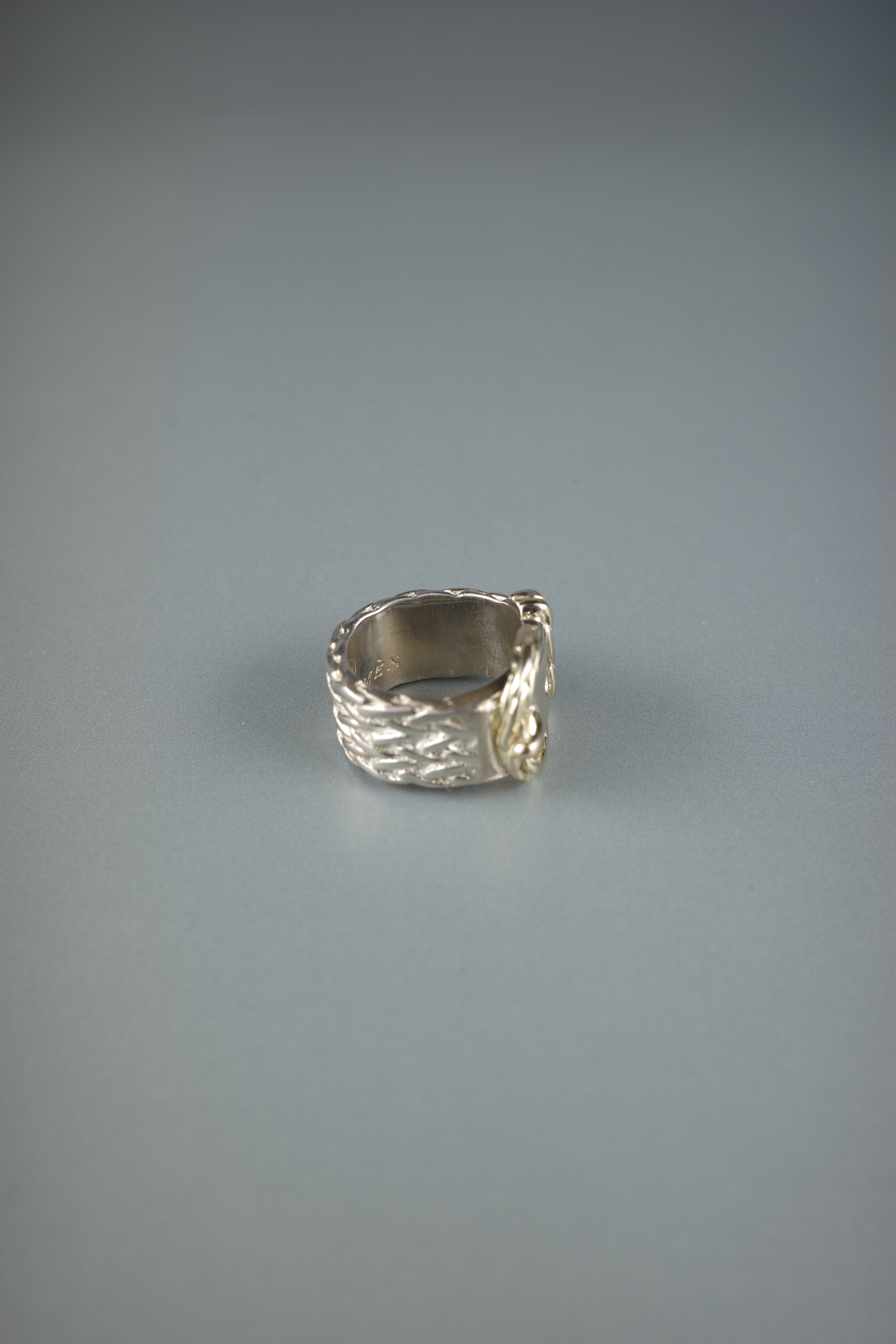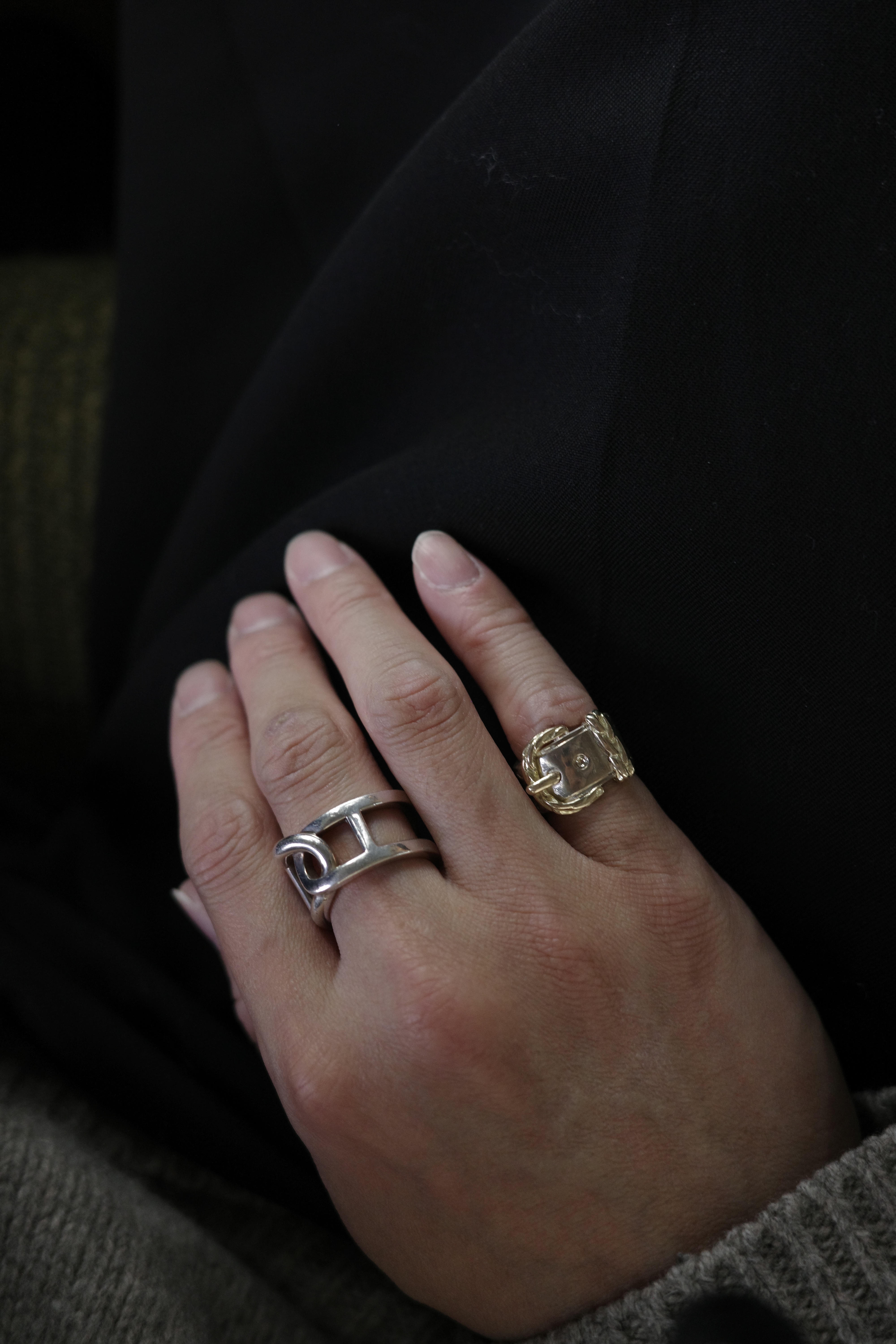 エルメスの名作アーカイヴ、“Diane(ディアンヌ)” のコンビリング。立体的に編み込まれたようなモチーフが一周ぐるりと施された、彫刻作品のような存在感が特徴。 およそ1970年代〜1980年代ごろに製造されていたヴィンテージモデルで、エルメスらしい品の良さと重厚感がありながら、デイリーユースにも馴染む万能リングです。