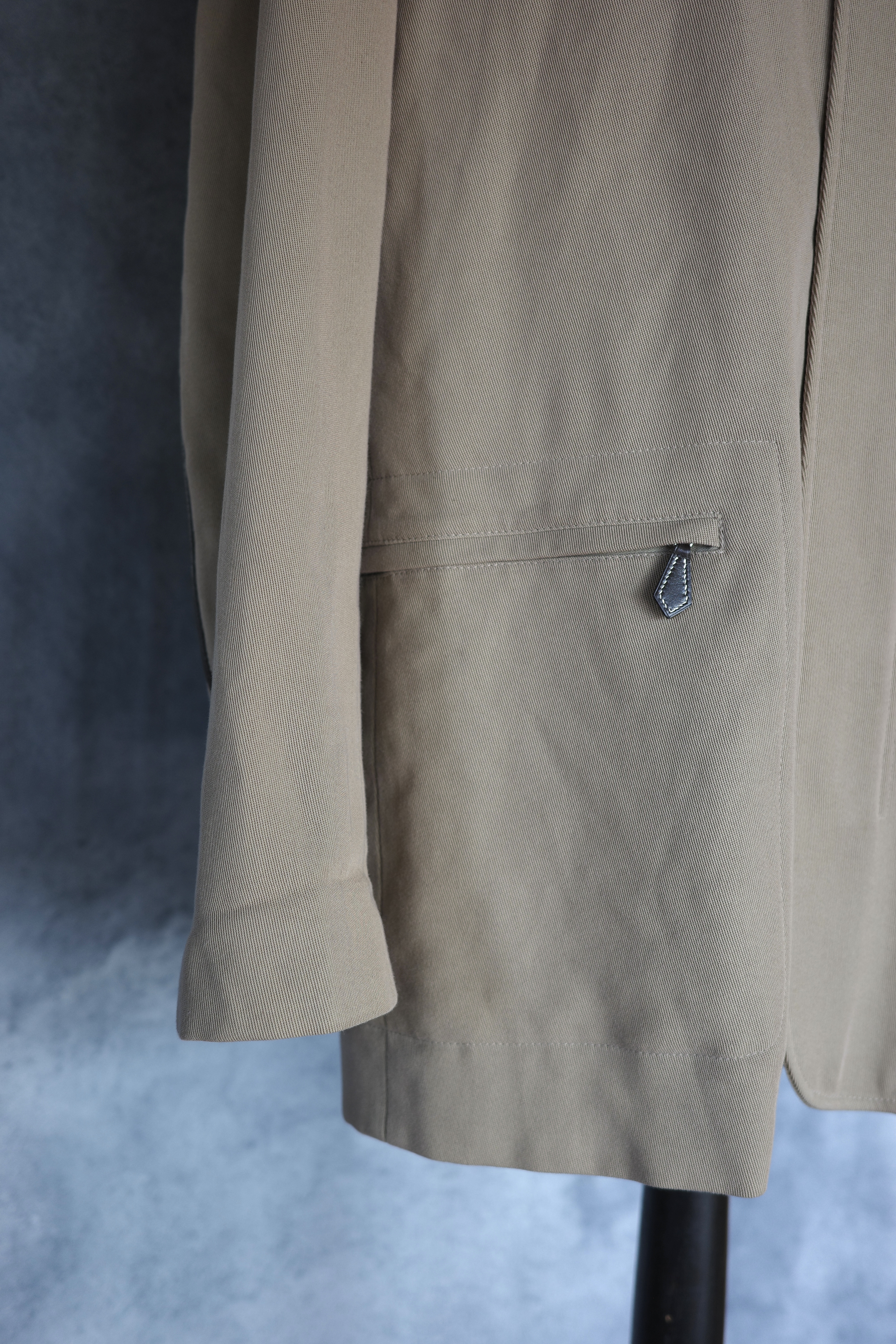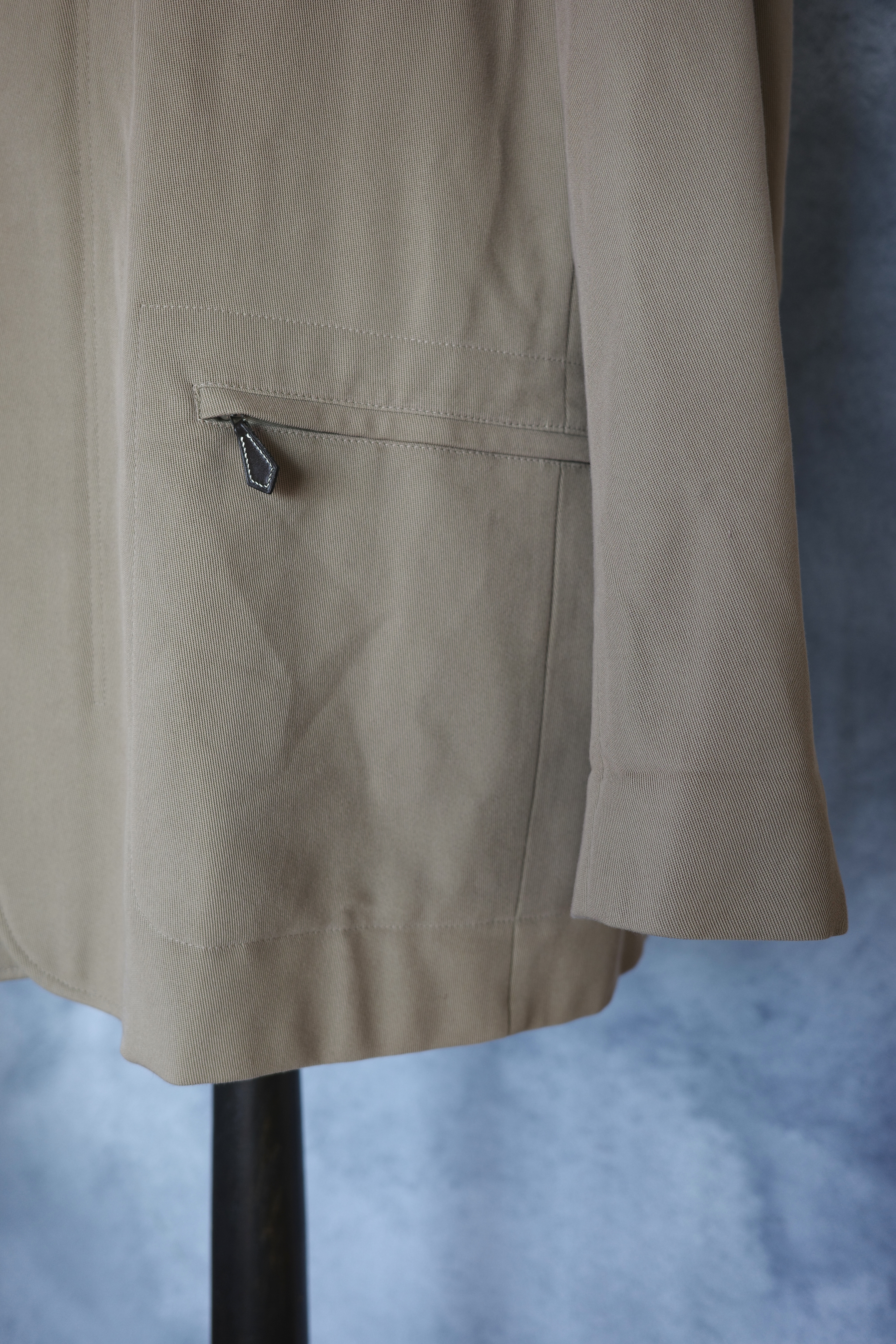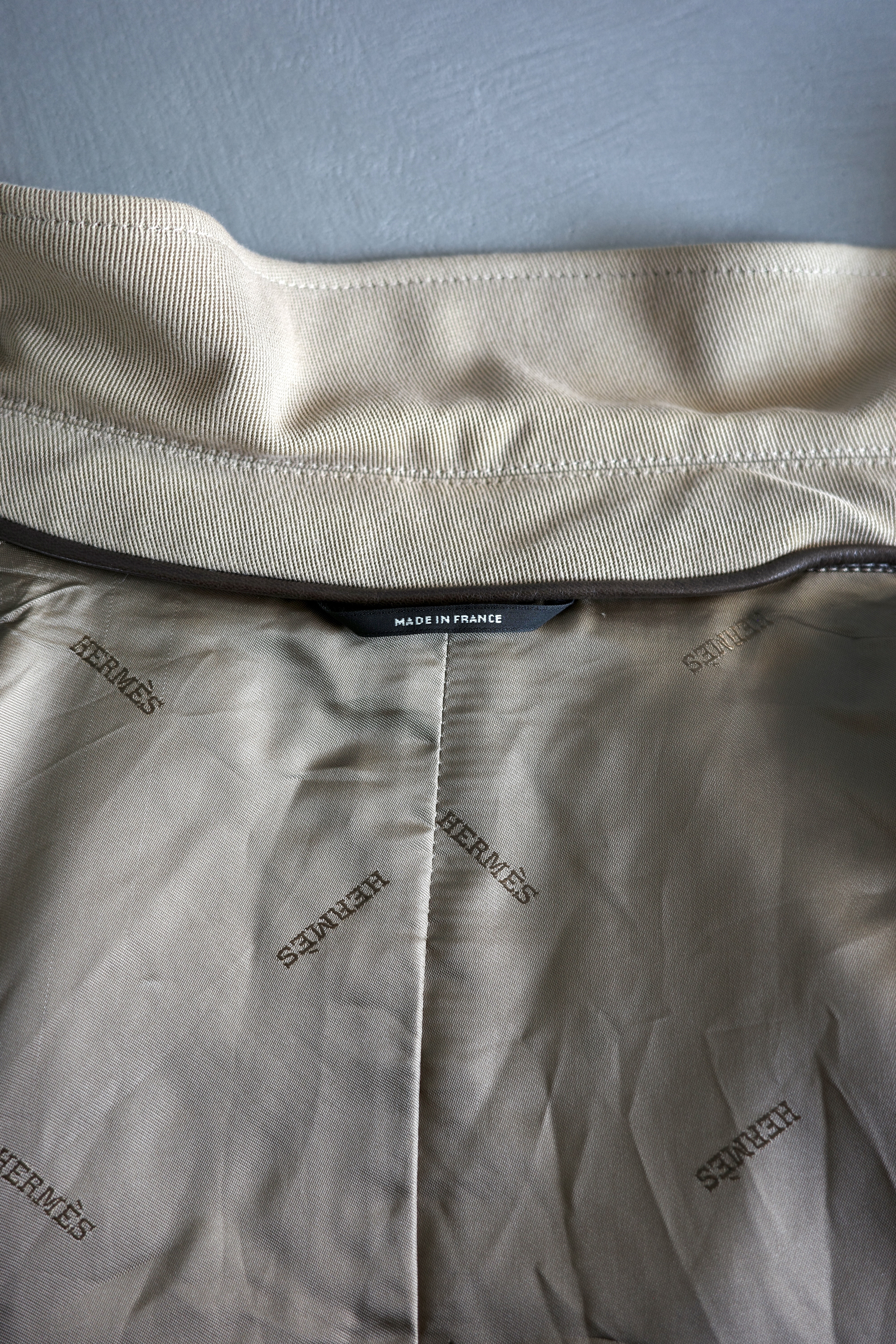 ミニマルな佇まいの中に、エルメスらしい仕立ての良さが際立つジップフロントジャケット。フロントはすっきりとしたジップ仕様で、羽織った際のシルエットも非常に美しい一着。アーム内側にはレザーのパイピングが施され、動きに合わせてさりげなく覗く異素材使いが上品なアクセント。本アイテムは「ジャン=ポール・ゴルチエ」がエルメスのクリエイティブ・ディレクターを手掛けていた時代(2004–2011年)のプロダクト。実用性の中にエレガンスを感じさせる、ゴルチエ期らしい洗練されたデザインが魅力のアーカイブピース。
