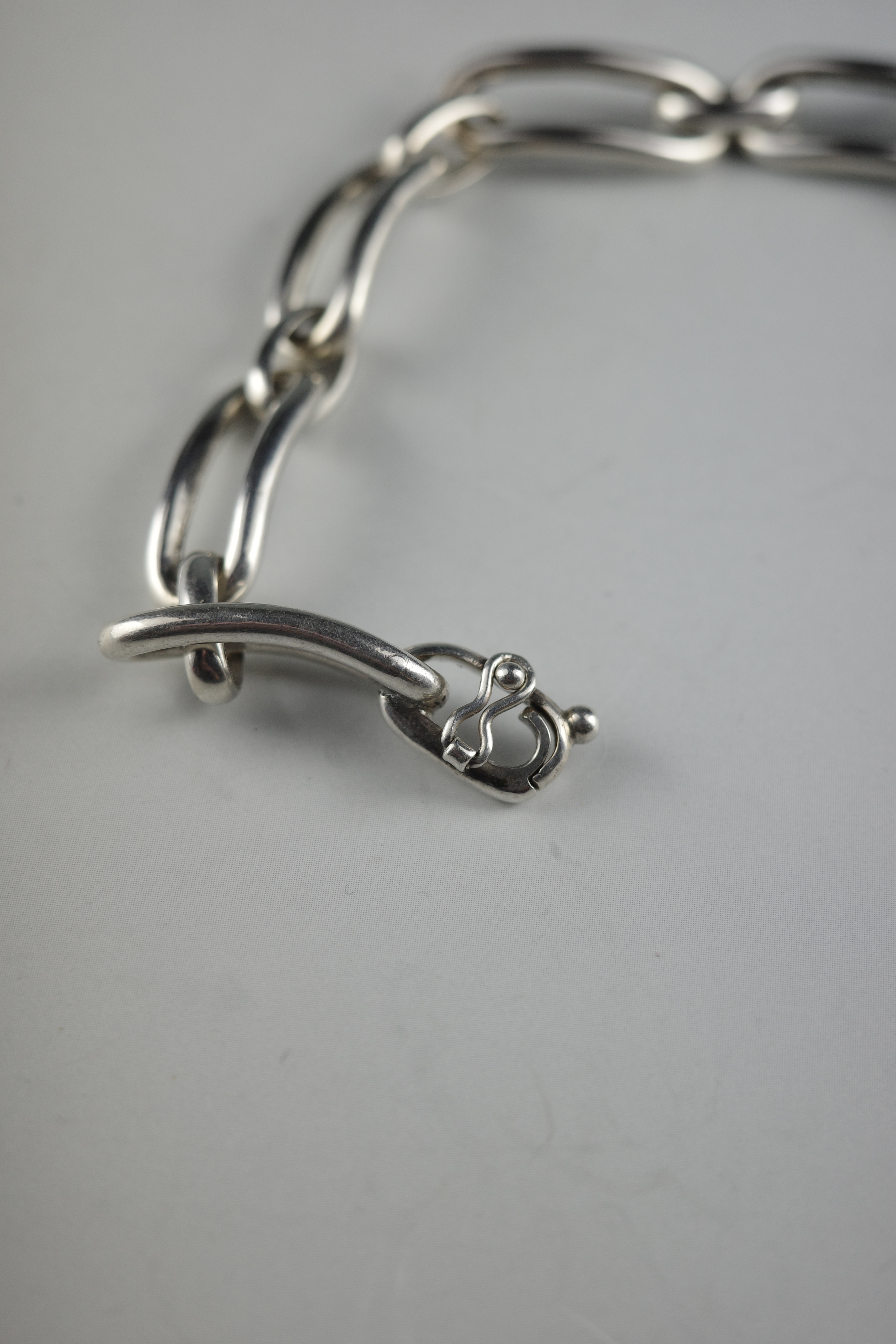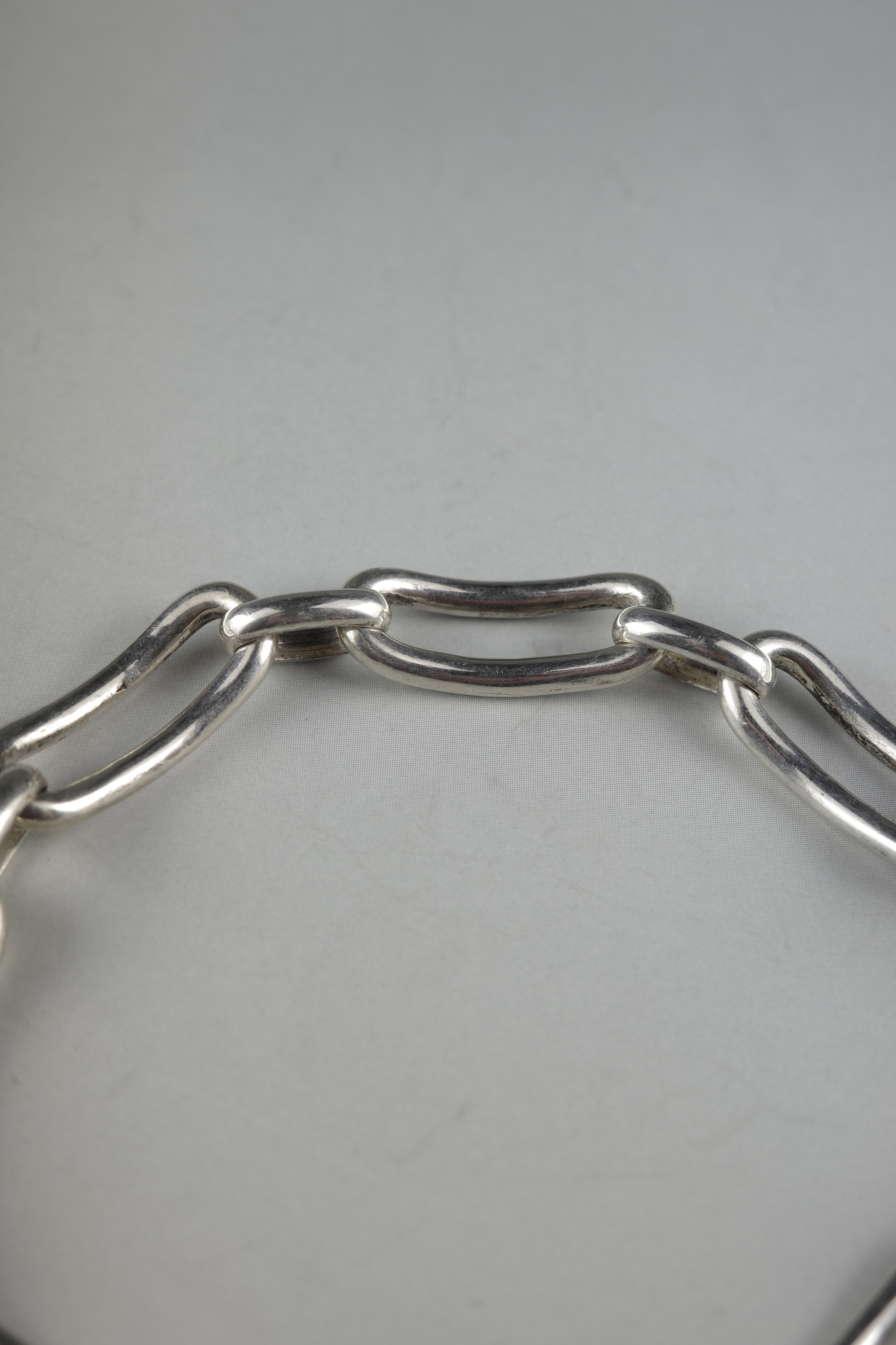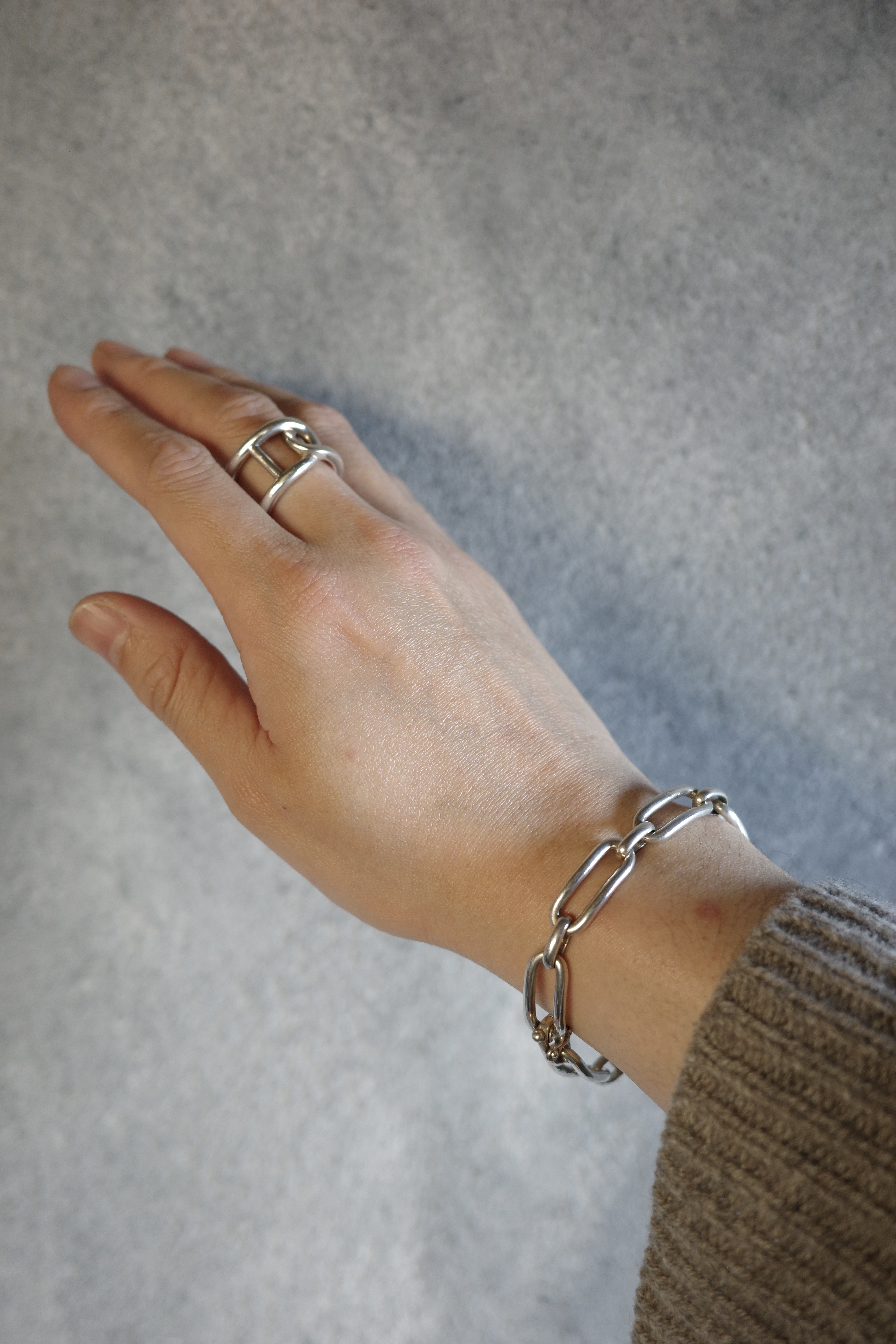 ヴィンテージエルメスジュエリーの中でも流通数が非常に少ない、オーバルリンクデザインのブレスレット。丸みを帯びた楕円形リンクを重ねた構成のデザインは、シンプルでありながら適度なボリューム感があり、手元に存在感を与えます。留め具付近には蟹刻印が確認でき、年代は1960〜70年代頃と推察されるヴィンテージアイテム。現行のエルメスジュエリーとは異なる、ヴィンテージシルバー特有の風合いが魅力です。市場流通も非常に少ない希少なコレクターズピース。