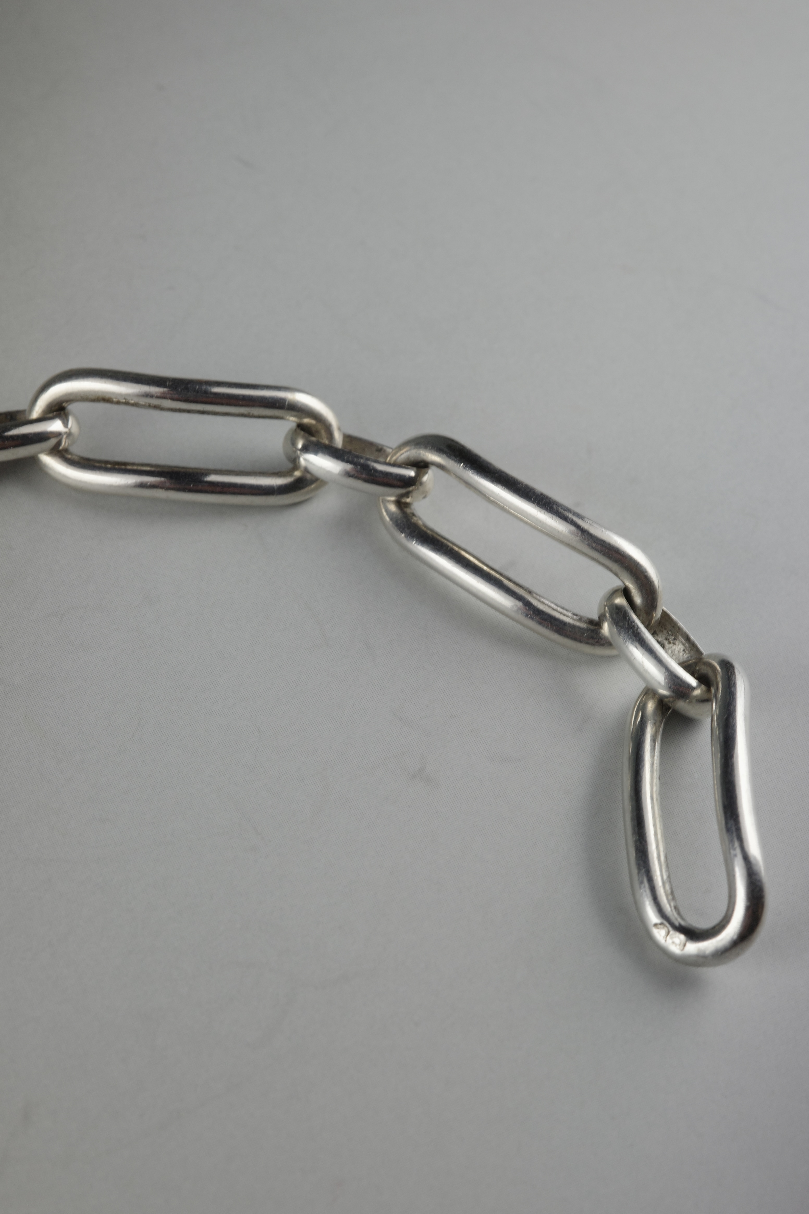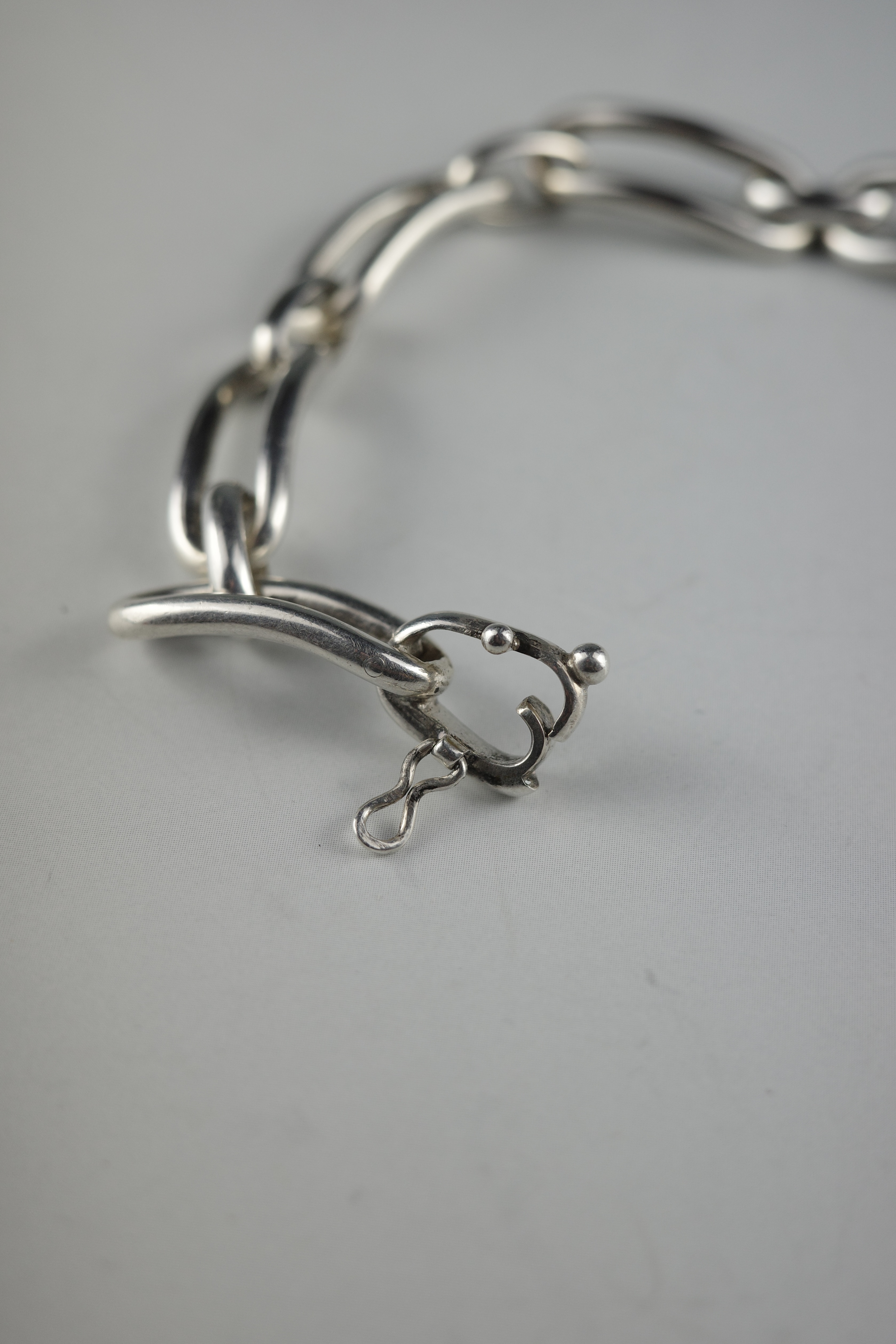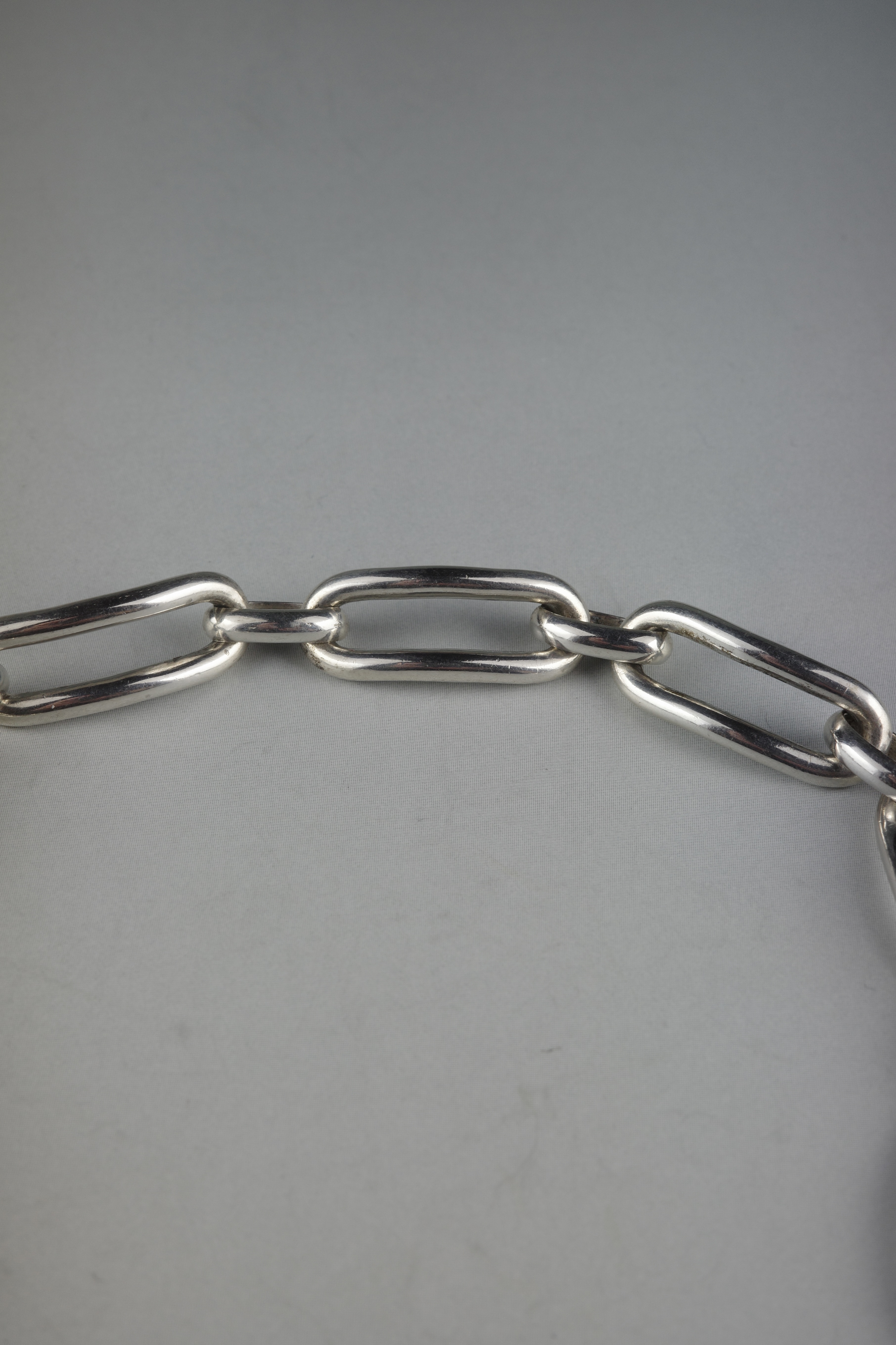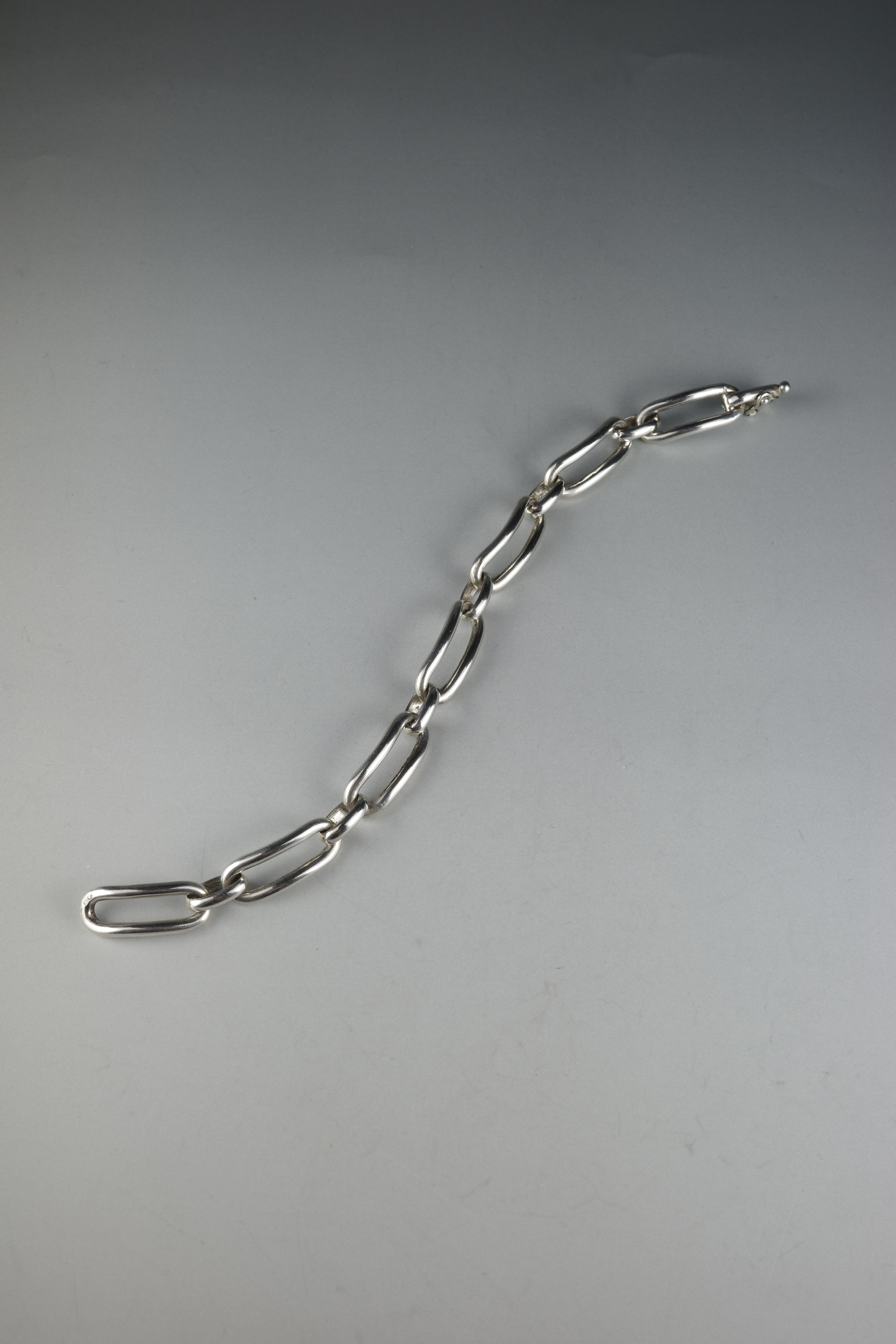 ヴィンテージエルメスジュエリーの中でも流通数が非常に少ない、オーバルリンクデザインのブレスレット。丸みを帯びた楕円形リンクを重ねた構成のデザインは、シンプルでありながら適度なボリューム感があり、手元に存在感を与えます。留め具付近には蟹刻印が確認でき、年代は1960〜70年代頃と推察されるヴィンテージアイテム。現行のエルメスジュエリーとは異なる、ヴィンテージシルバー特有の風合いが魅力です。市場流通も非常に少ない希少なコレクターズピース。