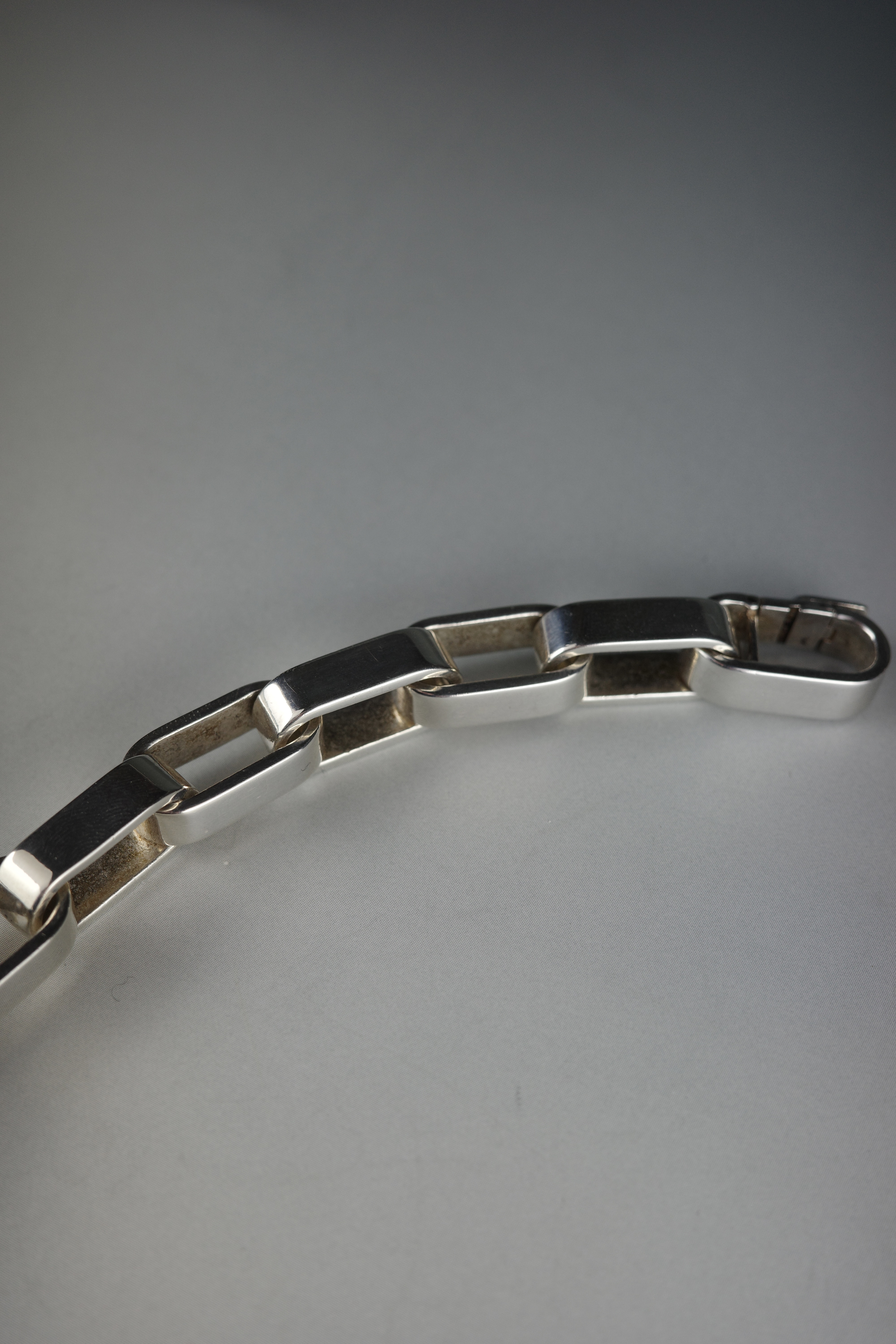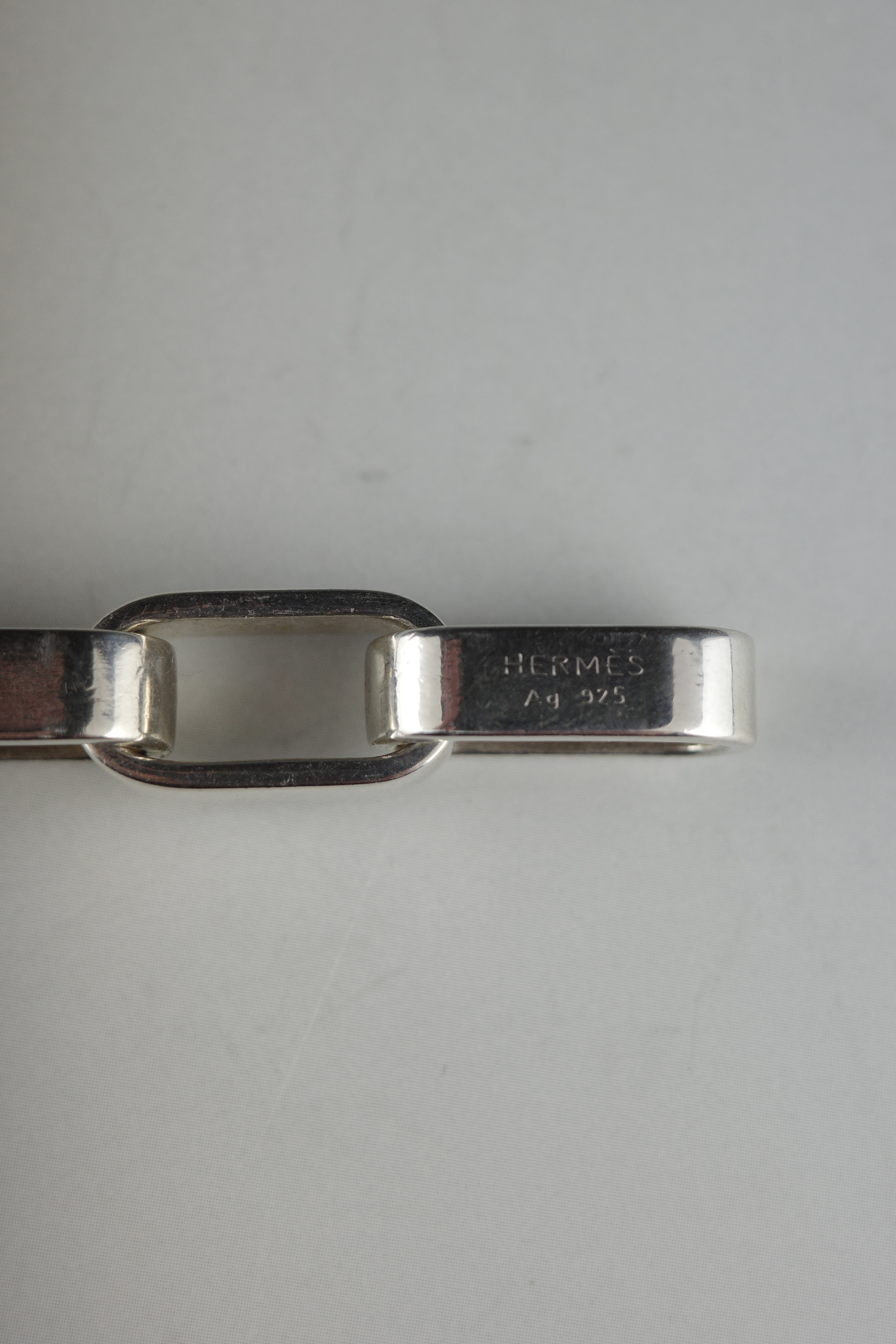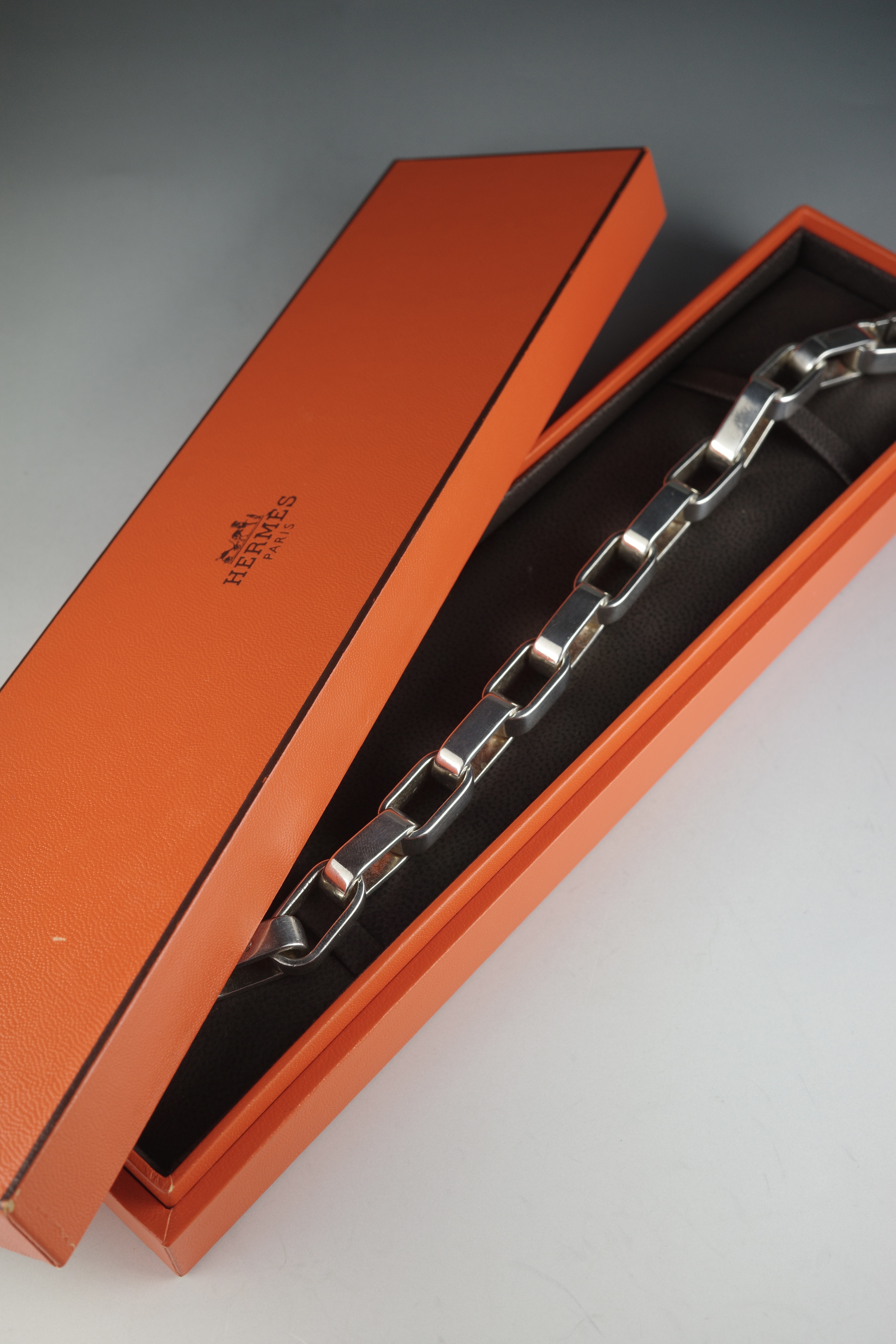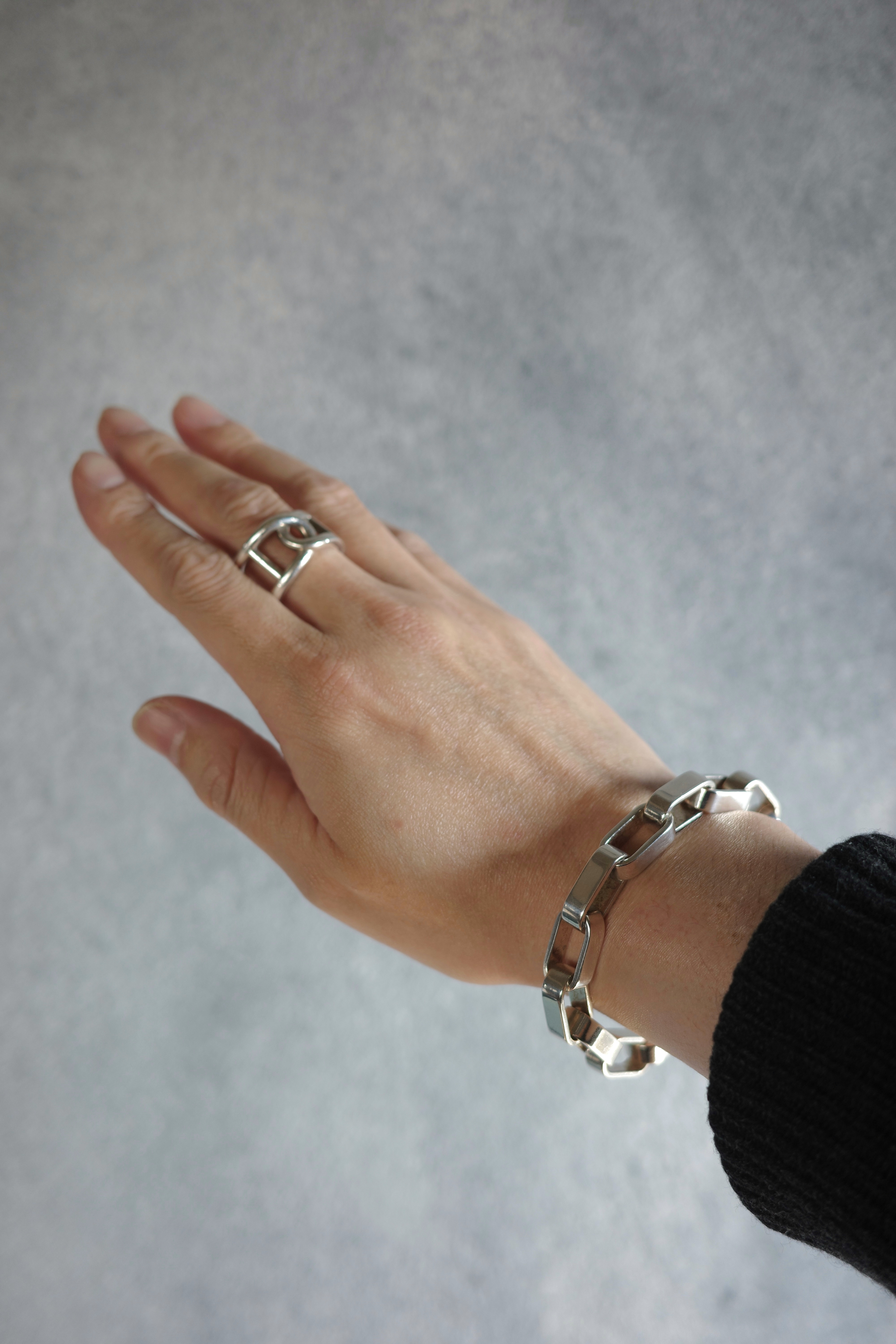 エルメスのヴィンテージブレスレット「Darius(ダリウス)」。直線的で角を落とした長方形リンクを連ねたデザインは、クラシックな意匠を踏襲しながらも、構築的でモダンな表情を備えています。程よいボリューム感と重量感を持ち、装飾性を抑えたミニマルな佇まいが手元に存在感を演出する一本。現行モデルには見られない、90年代後半〜2000年代初頭のエルメス特有のエッジ感と、シルバーの経年変化もヴィンテージならではの魅力。近年流通数も少なくなっている希少なアーカイブピース。