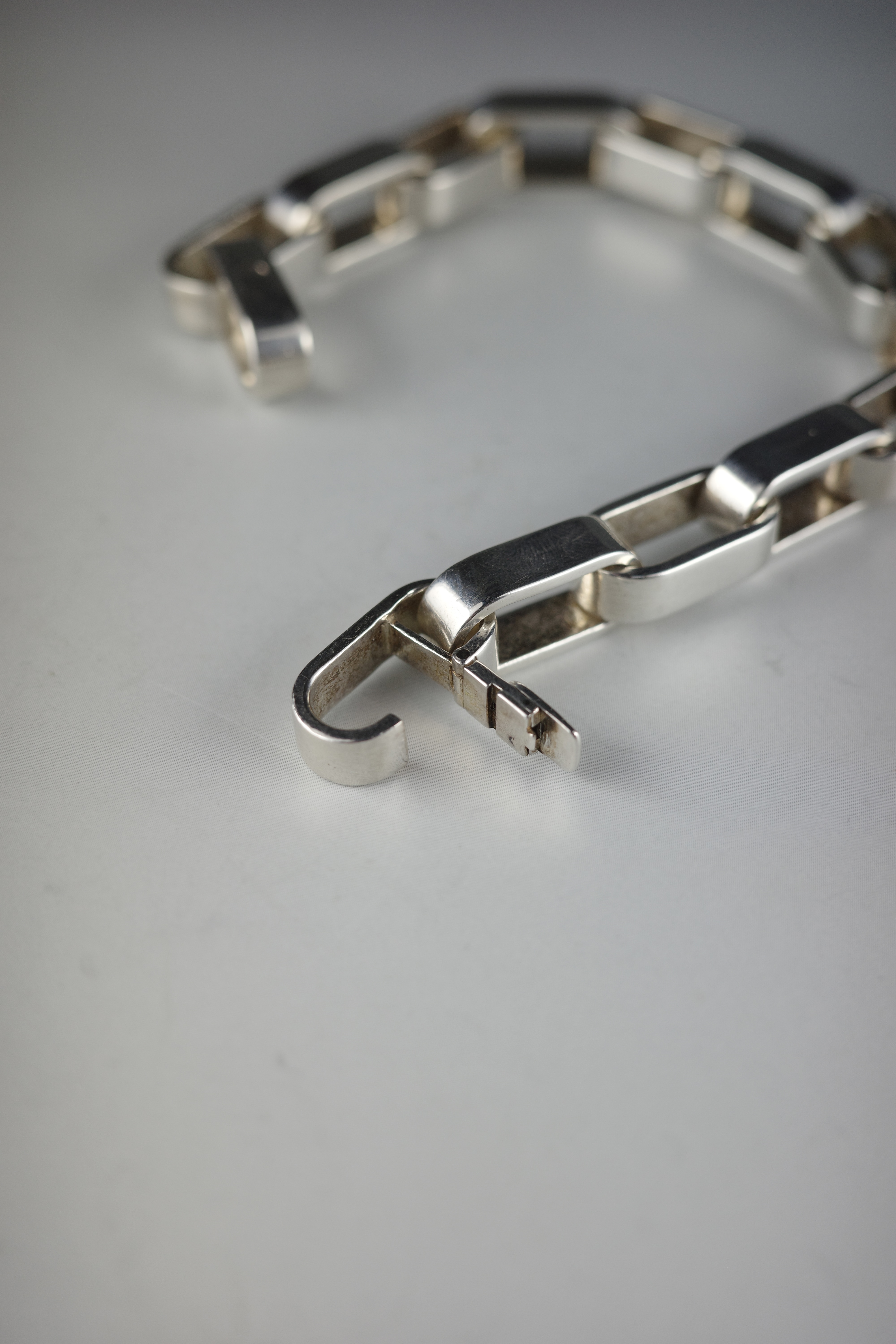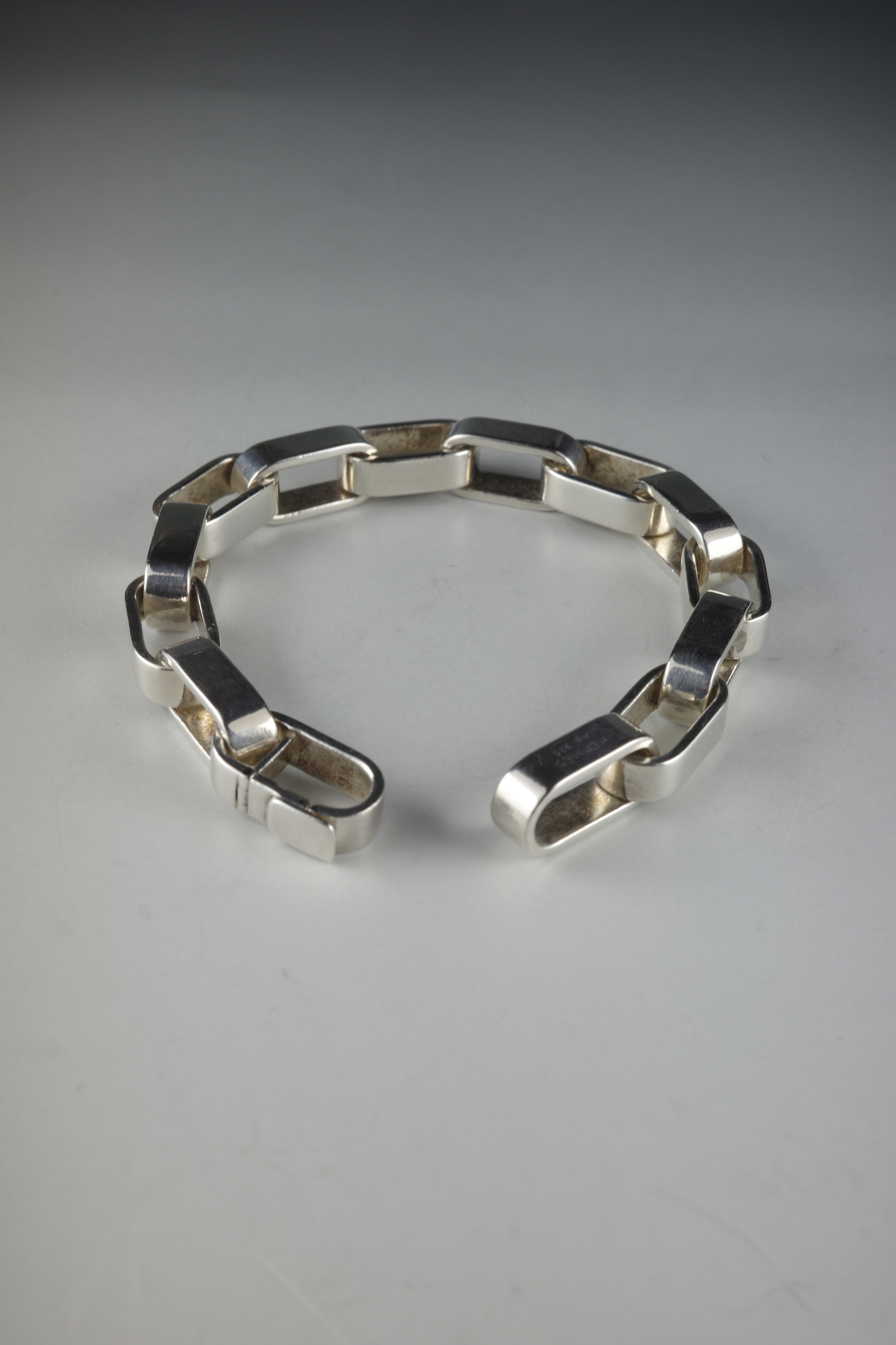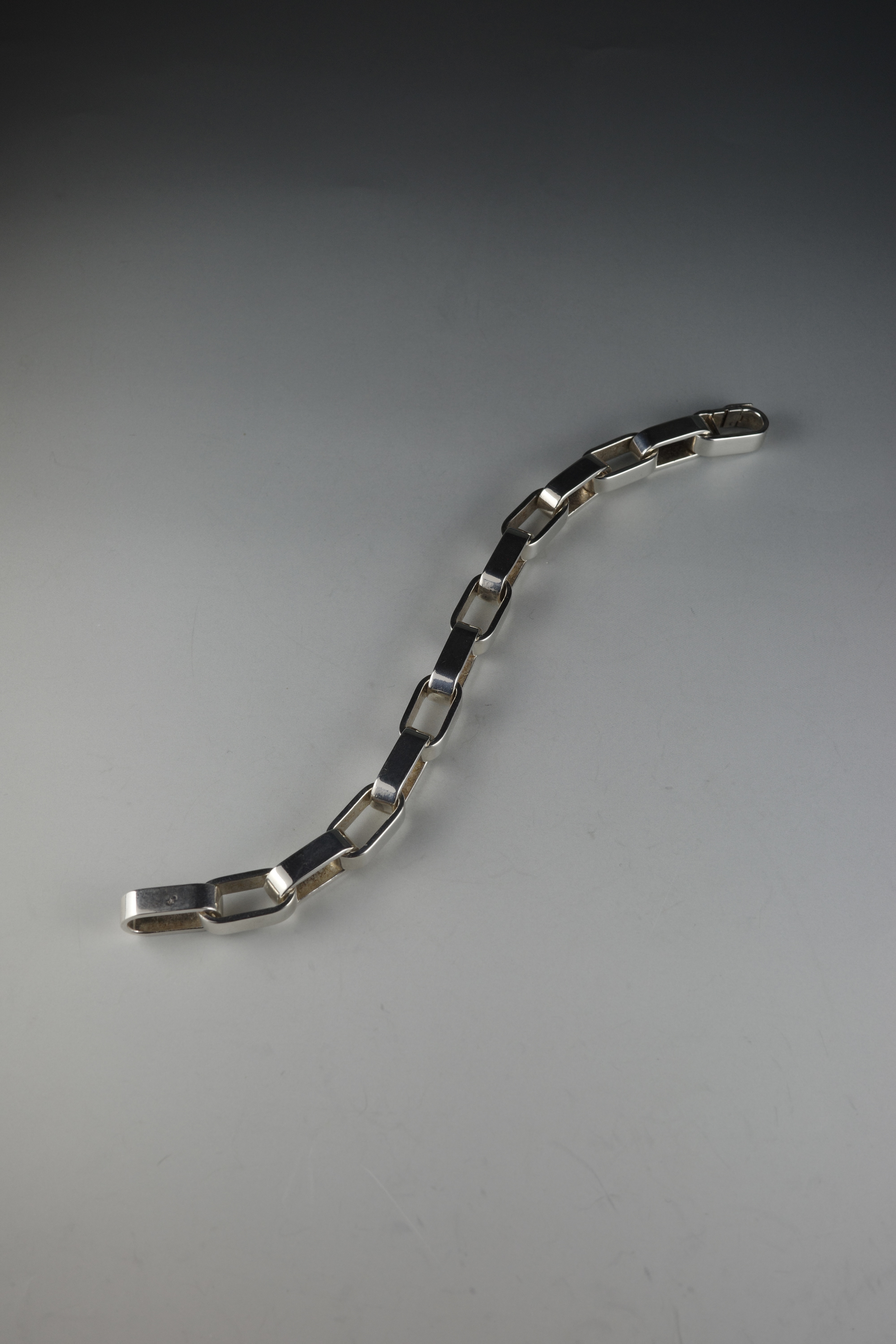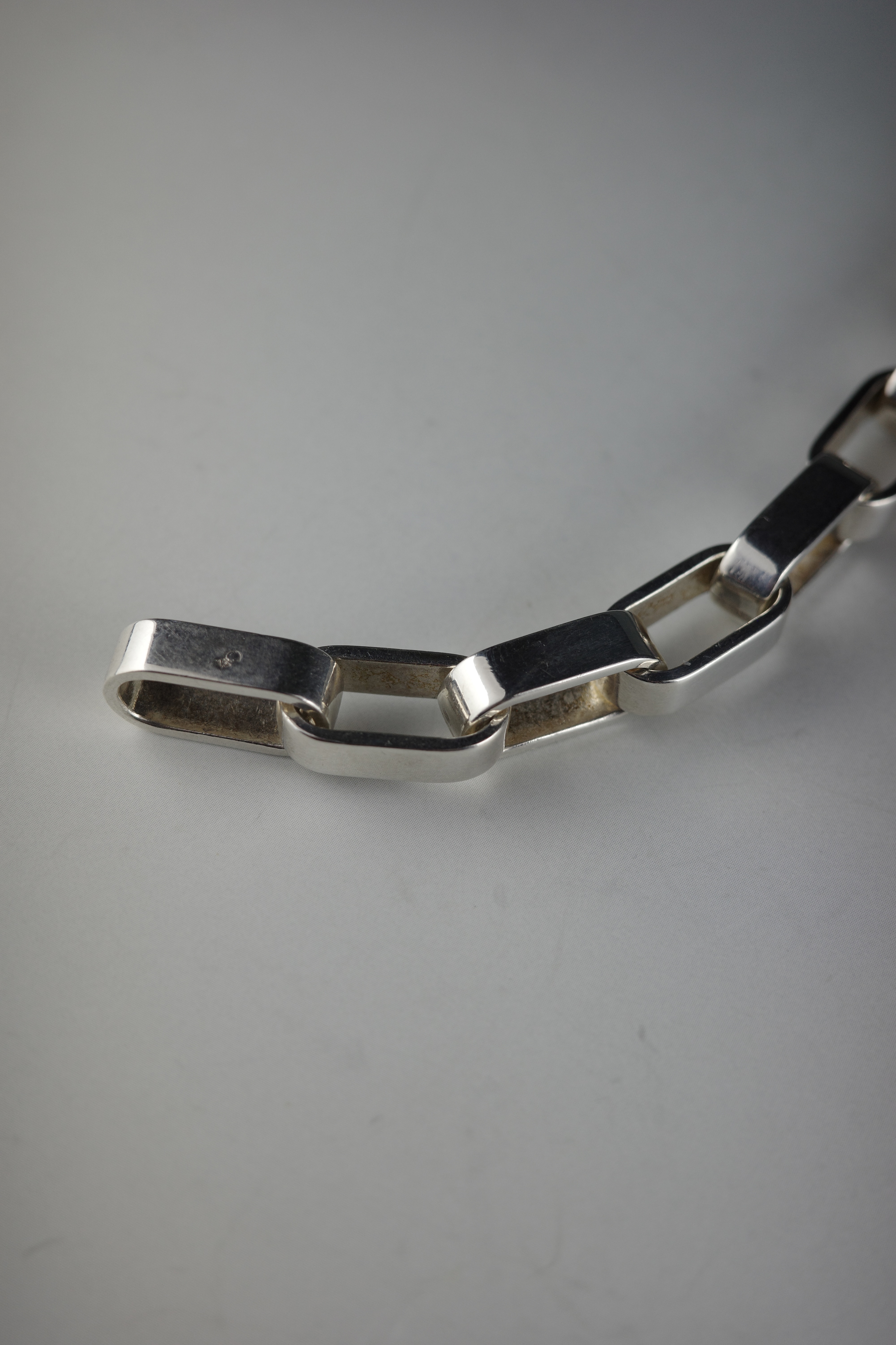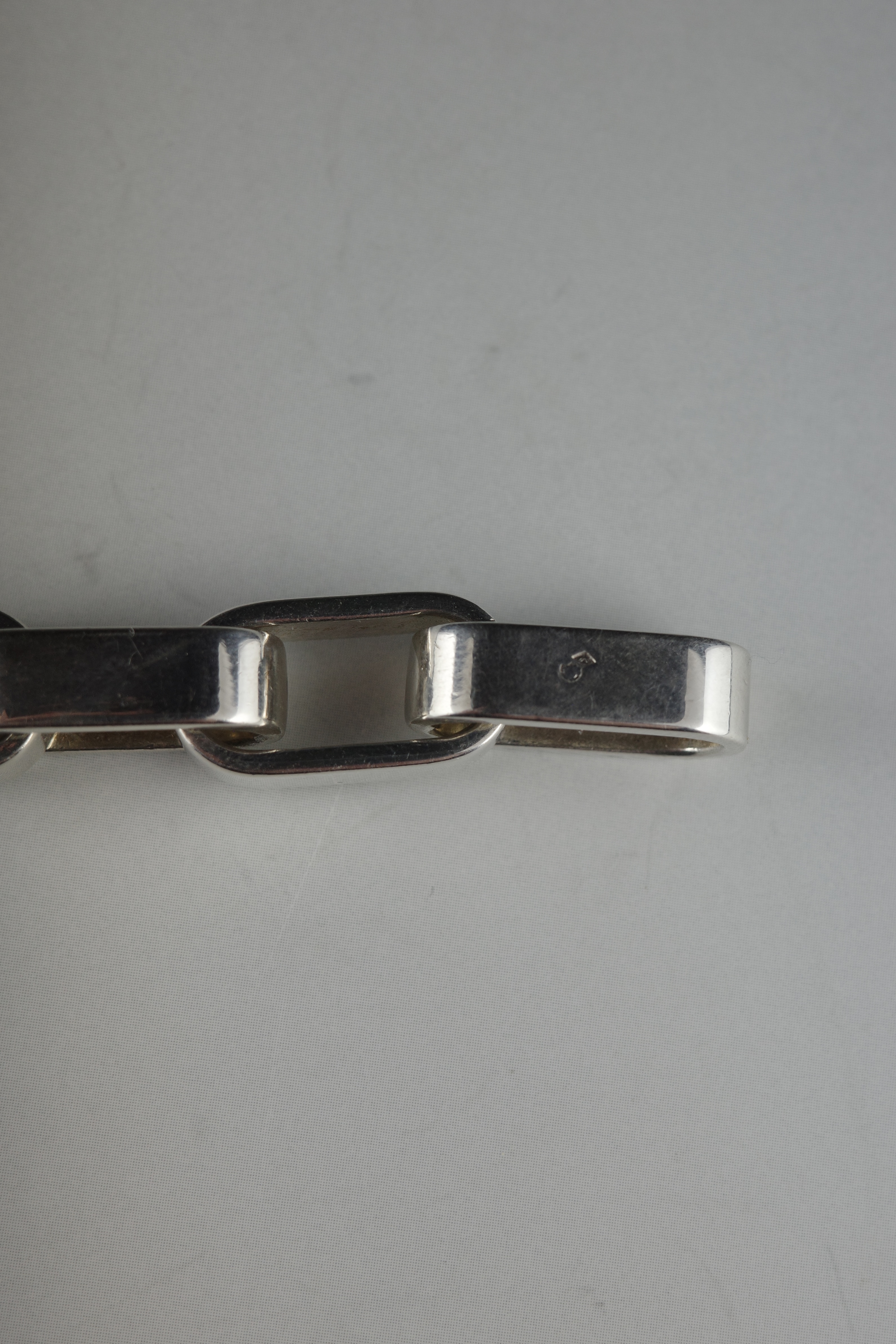 エルメスのヴィンテージブレスレット「Darius(ダリウス)」。直線的で角を落とした長方形リンクを連ねたデザインは、クラシックな意匠を踏襲しながらも、構築的でモダンな表情を備えています。程よいボリューム感と重量感を持ち、装飾性を抑えたミニマルな佇まいが手元に存在感を演出する一本。現行モデルには見られない、90年代後半〜2000年代初頭のエルメス特有のエッジ感と、シルバーの経年変化もヴィンテージならではの魅力。近年流通数も少なくなっている希少なアーカイブピース。