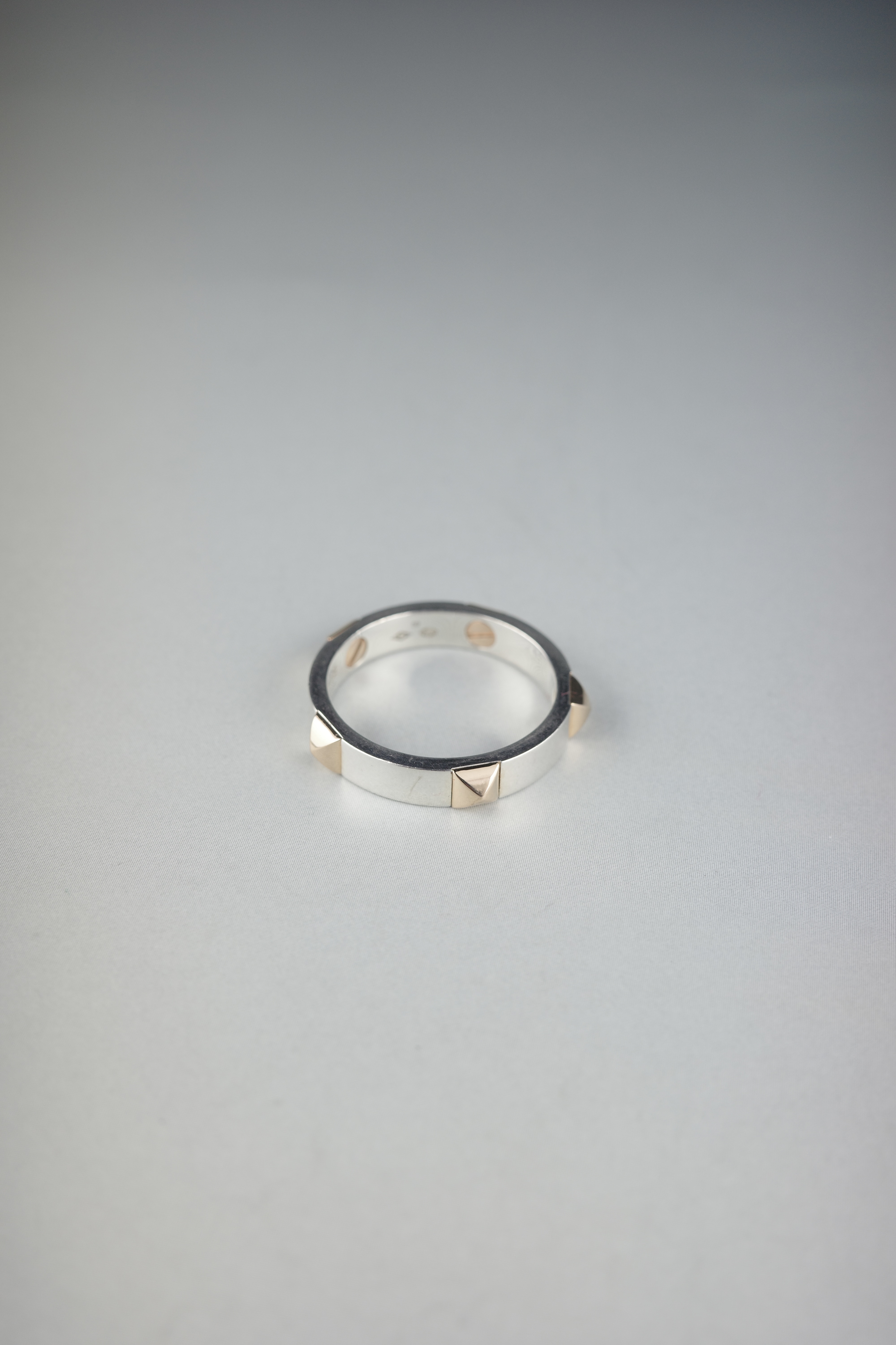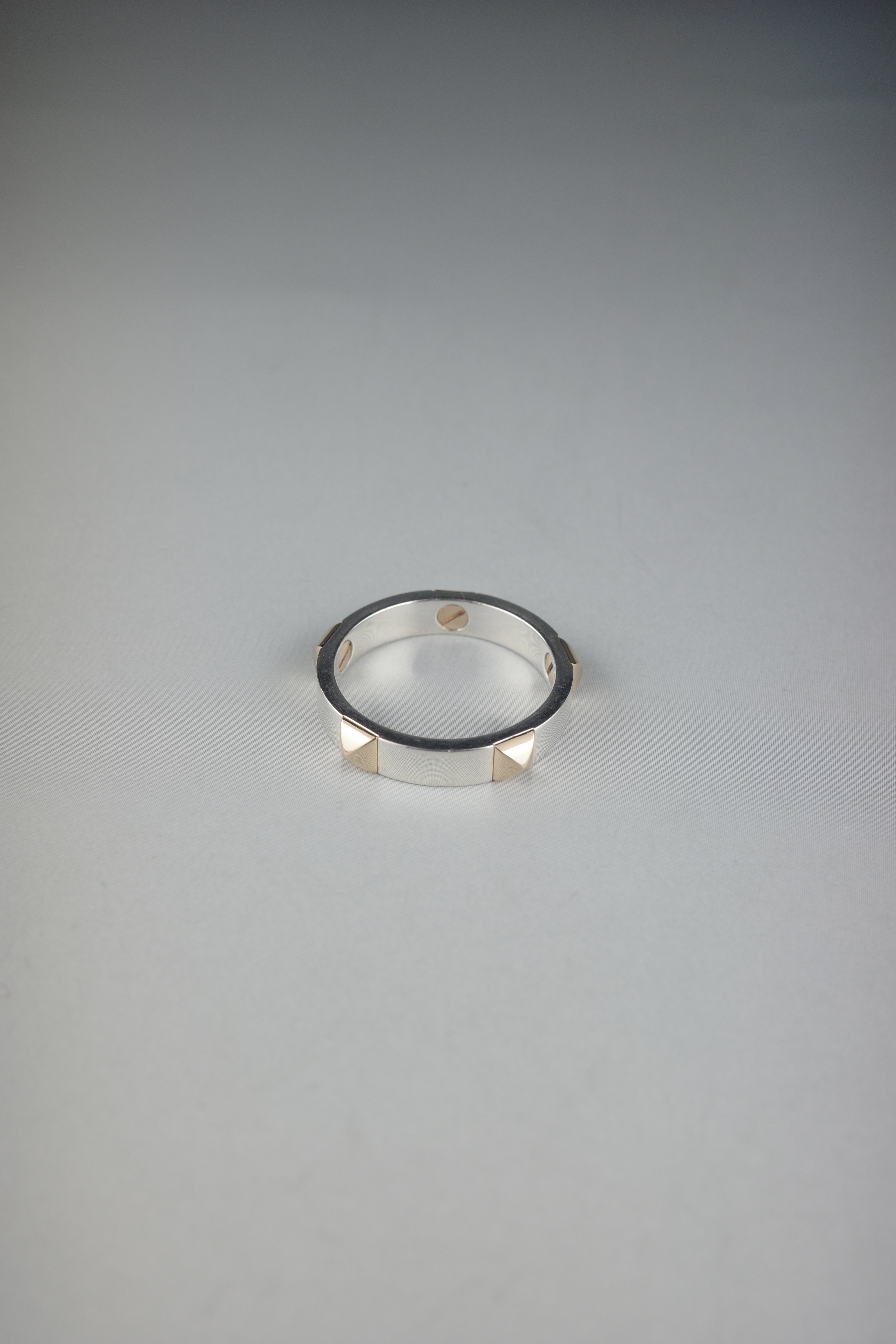 ピラミッド型のクルー(鋲)がセットされた「クルー・ドゥ・H」リング。無駄を削ぎ落としたミニマルなフォルムの中に、メゾンらしい造形美と緻密な仕上げが際立つデザイン。単体ではもちろん、重ね付けにも適した汎用性の高いリングで、性別やスタイルを問わず着用可能。シンプルかつエッジの効いたデザインと、ピンクゴールドとシルバーのコントラストが際立つモダンな印象のアイテムです。