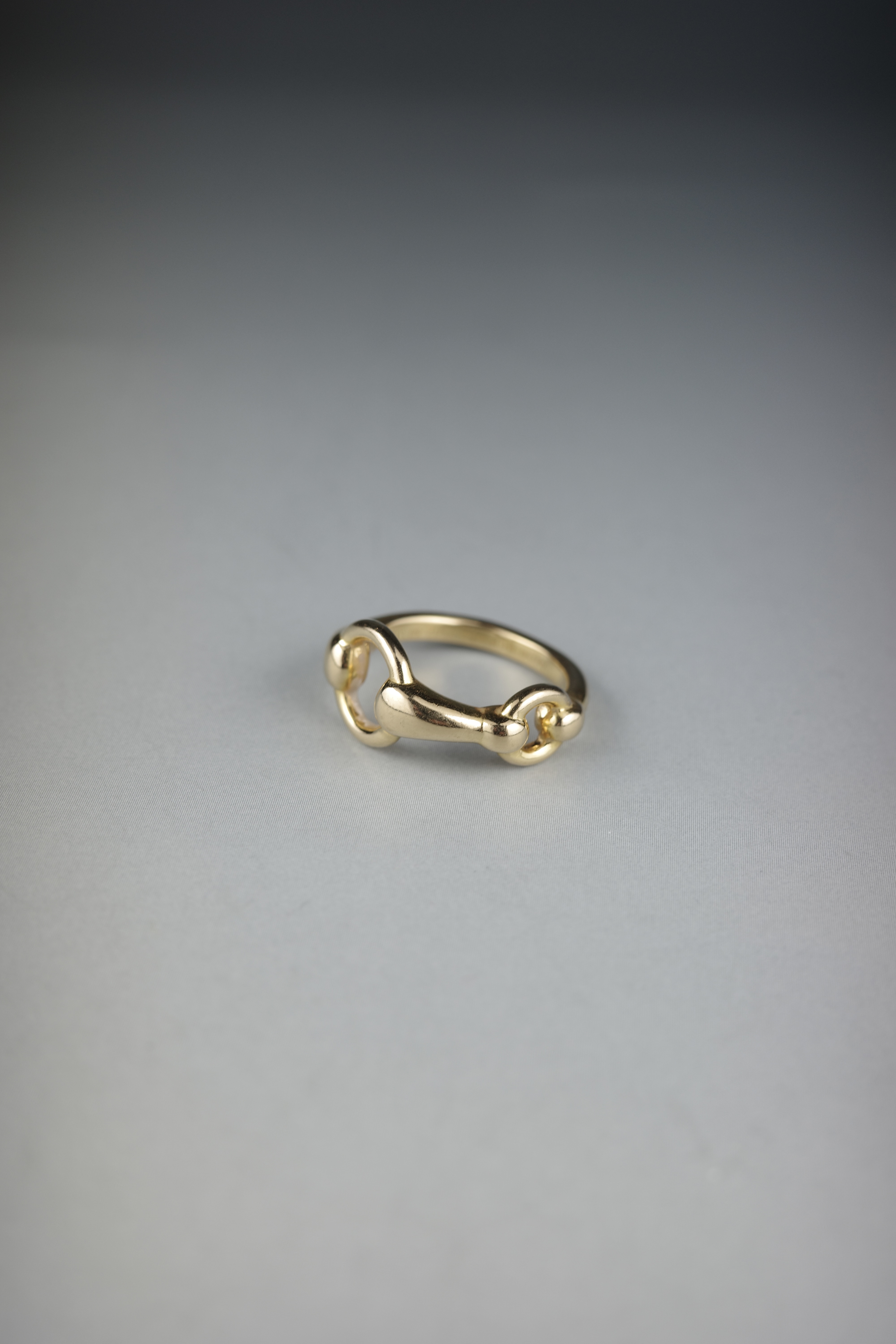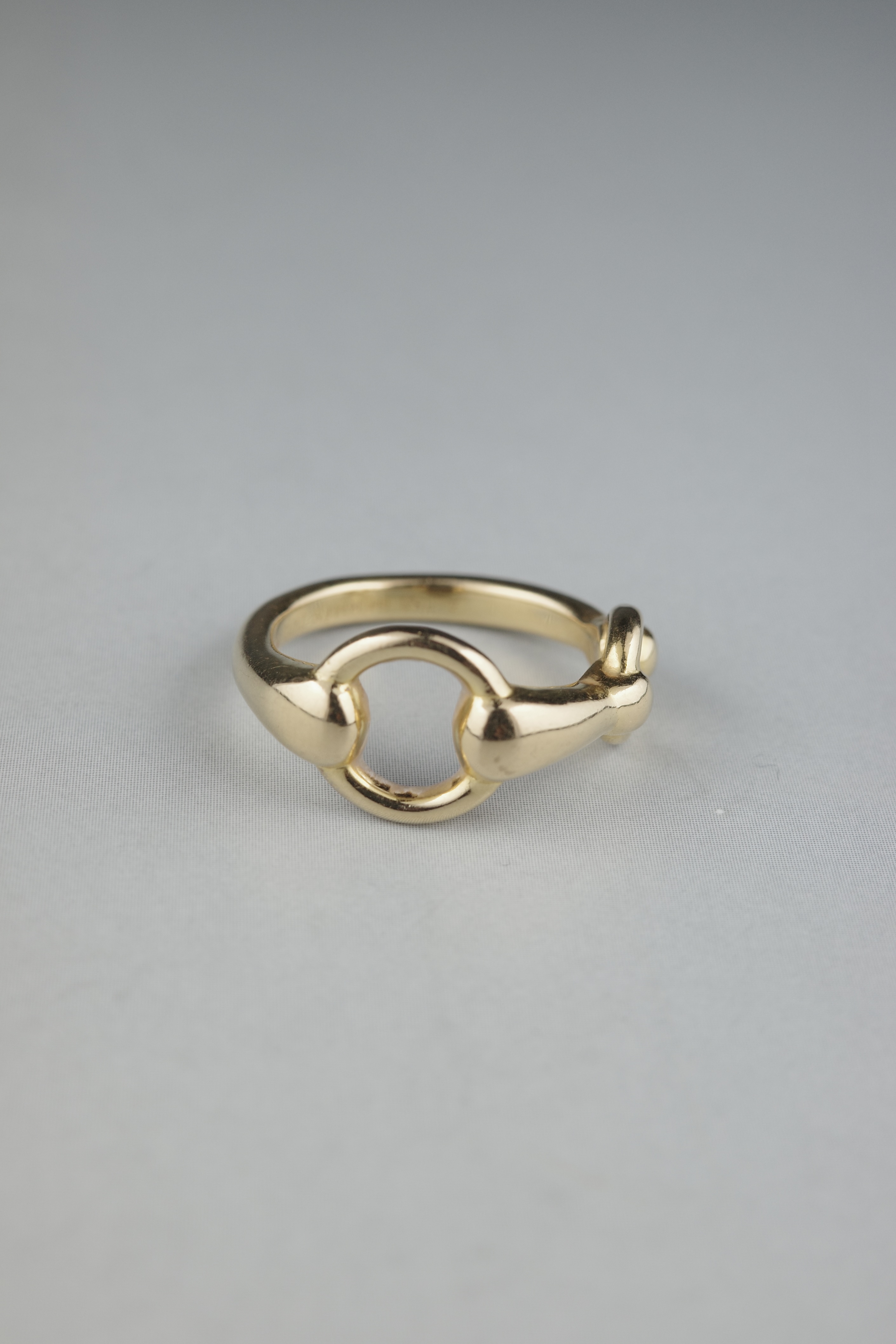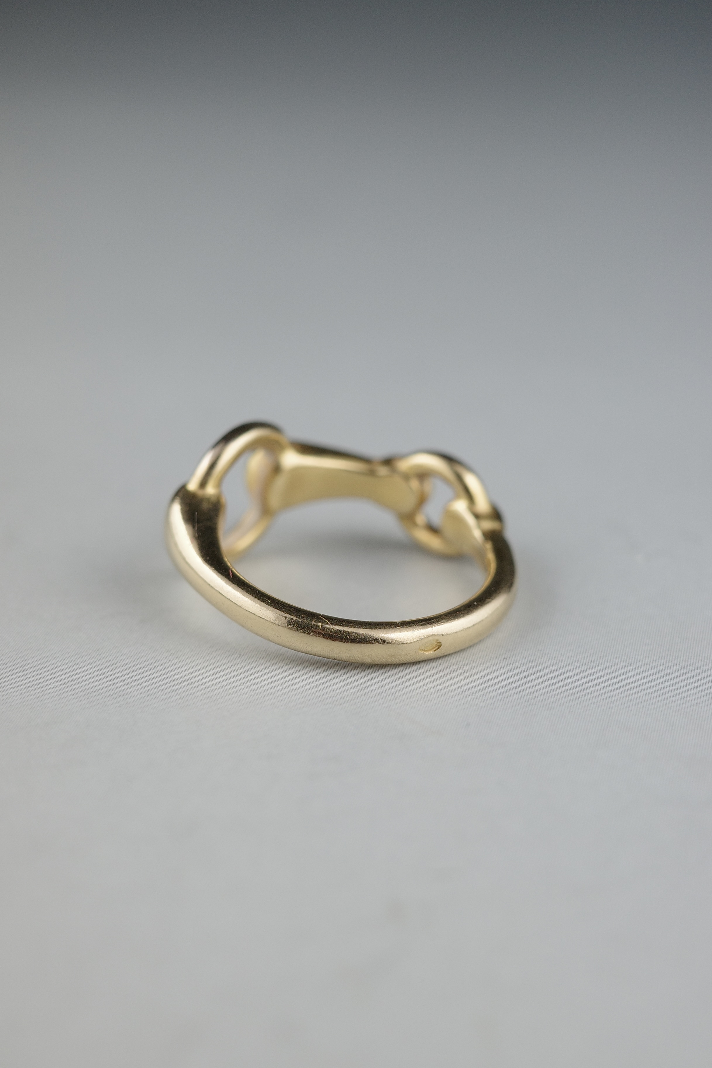 18金で仕立てられたヴィンテージエルメスの「ホースビット」リング。ブランドの原点である馬具の「馬銜(ハミ)」をモチーフにしたアシンメトリーなデザインが特徴的なデザイン。18金イエローゴールドモデル特有の圧倒的な気品は、シルバーとは一線を画す輝きを放ちます。当時限られた顧客にしかオーダー出来なかったとされる、極めて希少なヴィンテージピース。