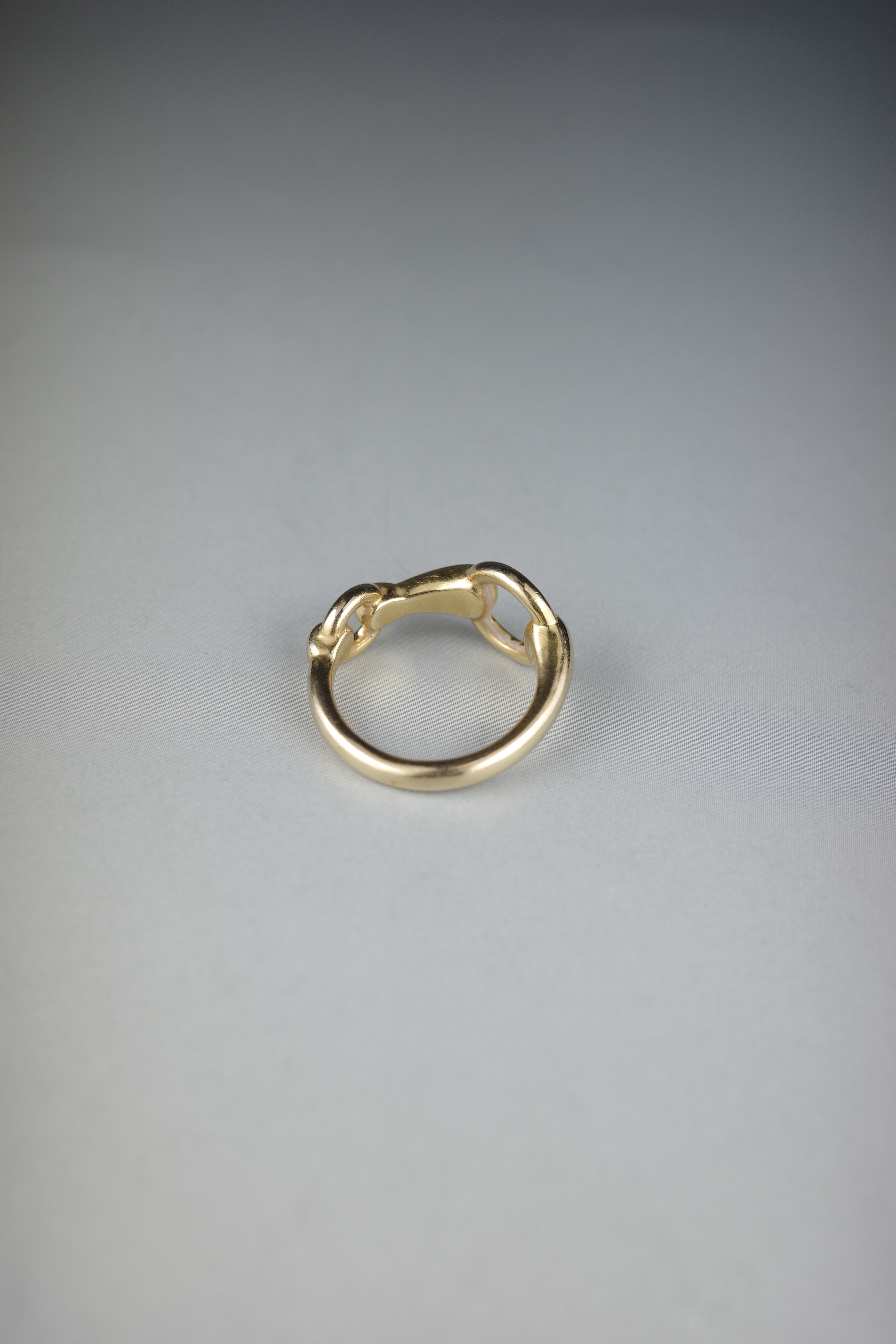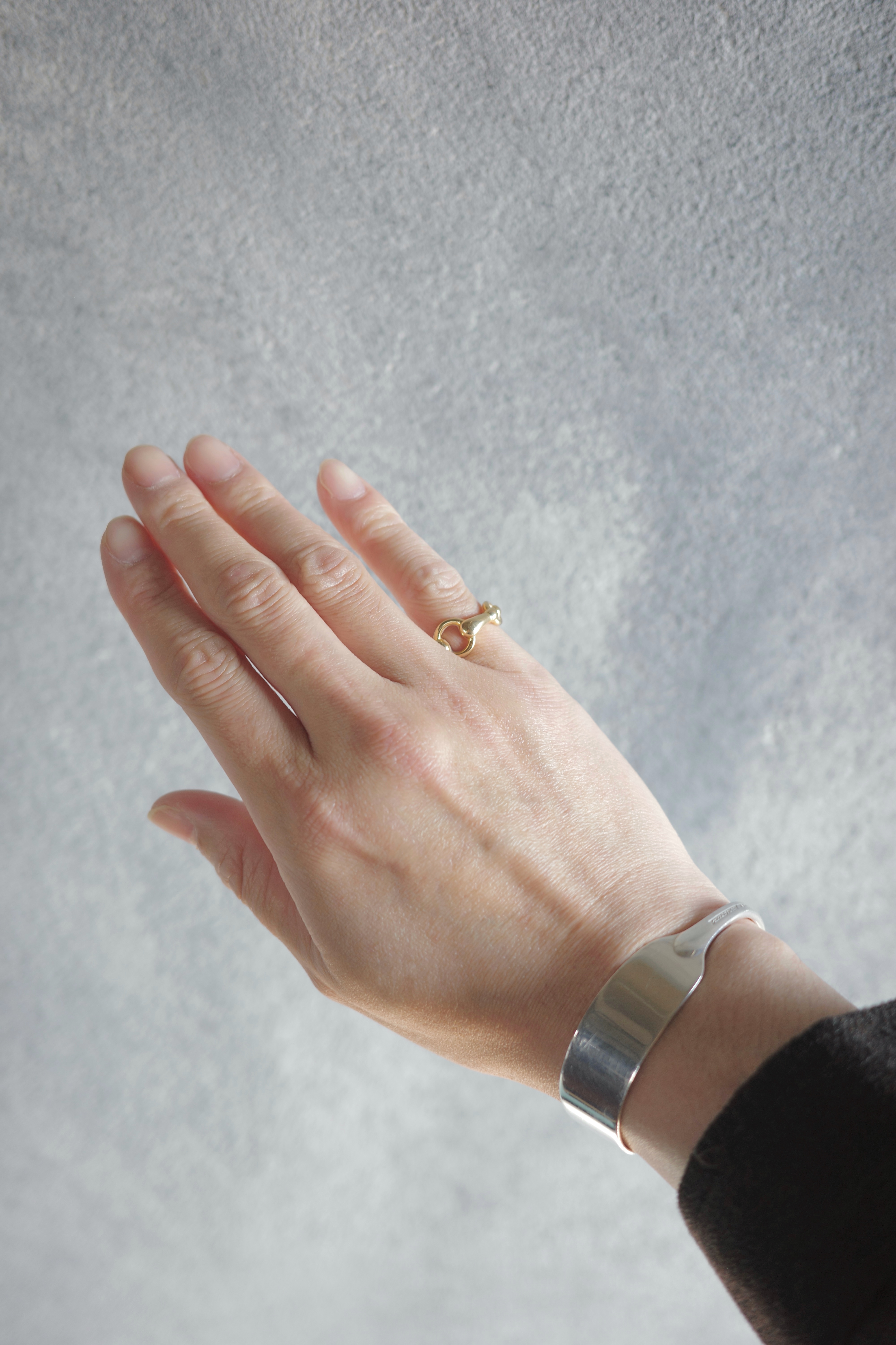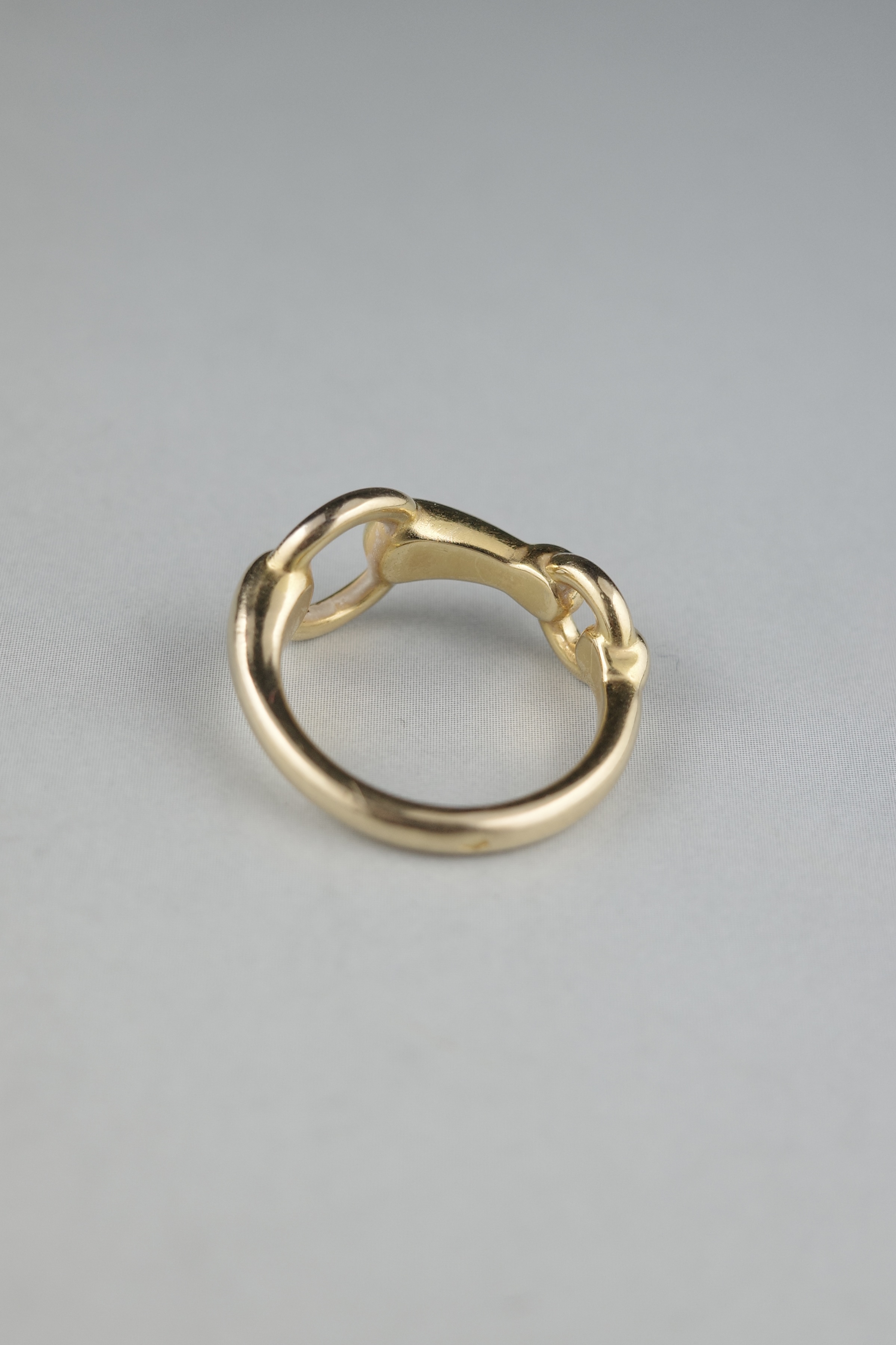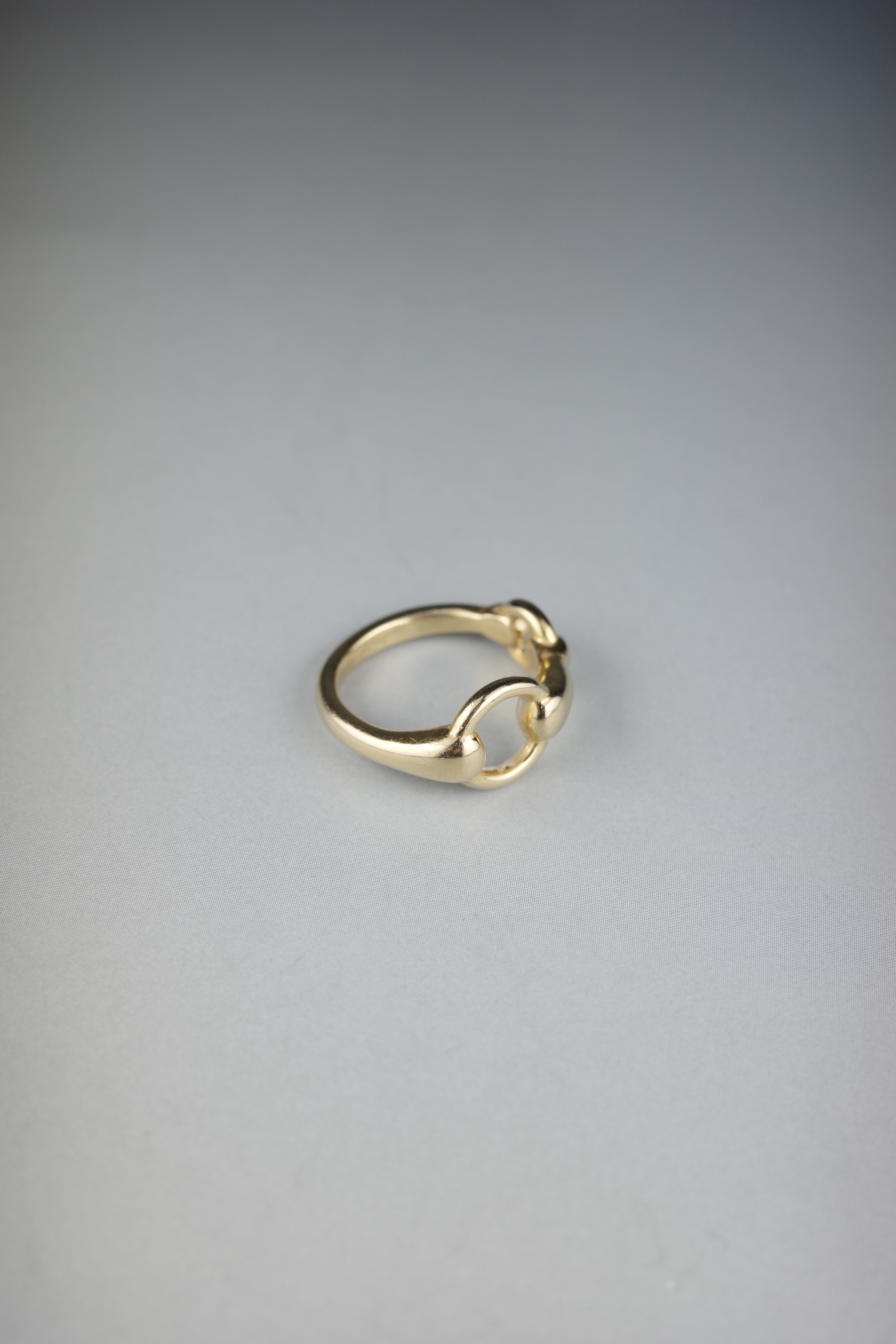 18金で仕立てられたヴィンテージエルメスの「ホースビット」リング。ブランドの原点である馬具の「馬銜(ハミ)」をモチーフにしたアシンメトリーなデザインが特徴的なデザイン。18金イエローゴールドモデル特有の圧倒的な気品は、シルバーとは一線を画す輝きを放ちます。当時限られた顧客にしかオーダー出来なかったとされる、極めて希少なヴィンテージピース。