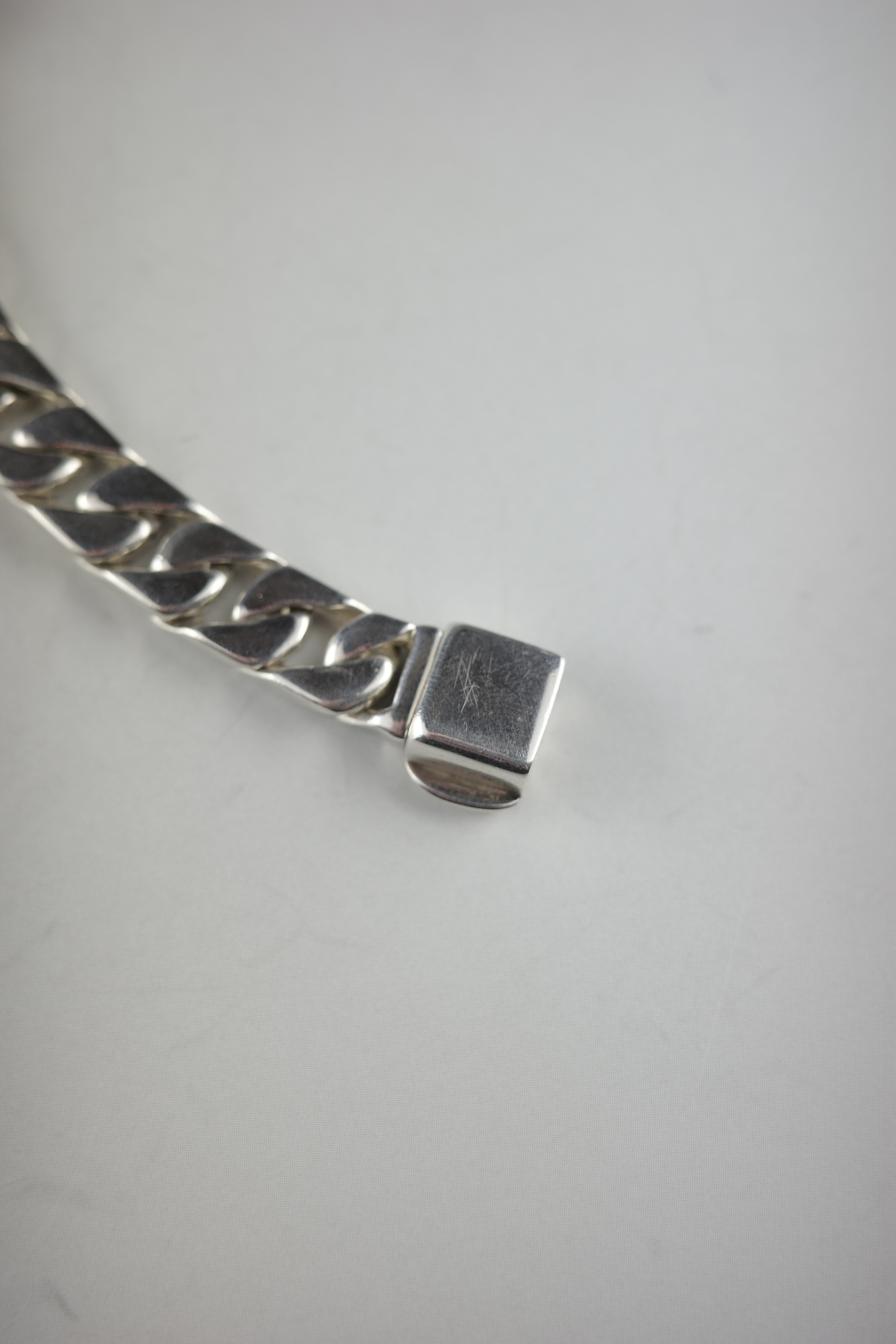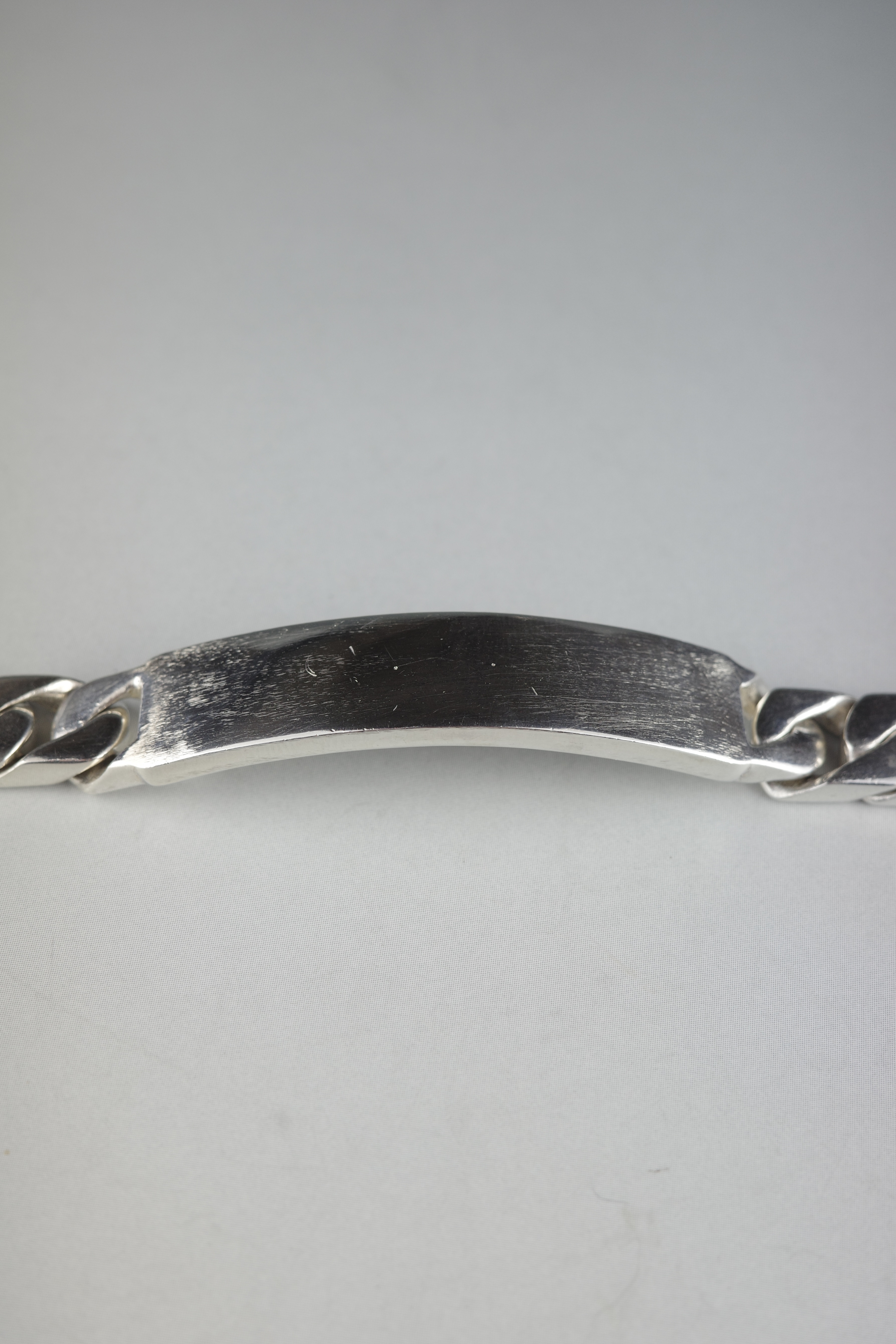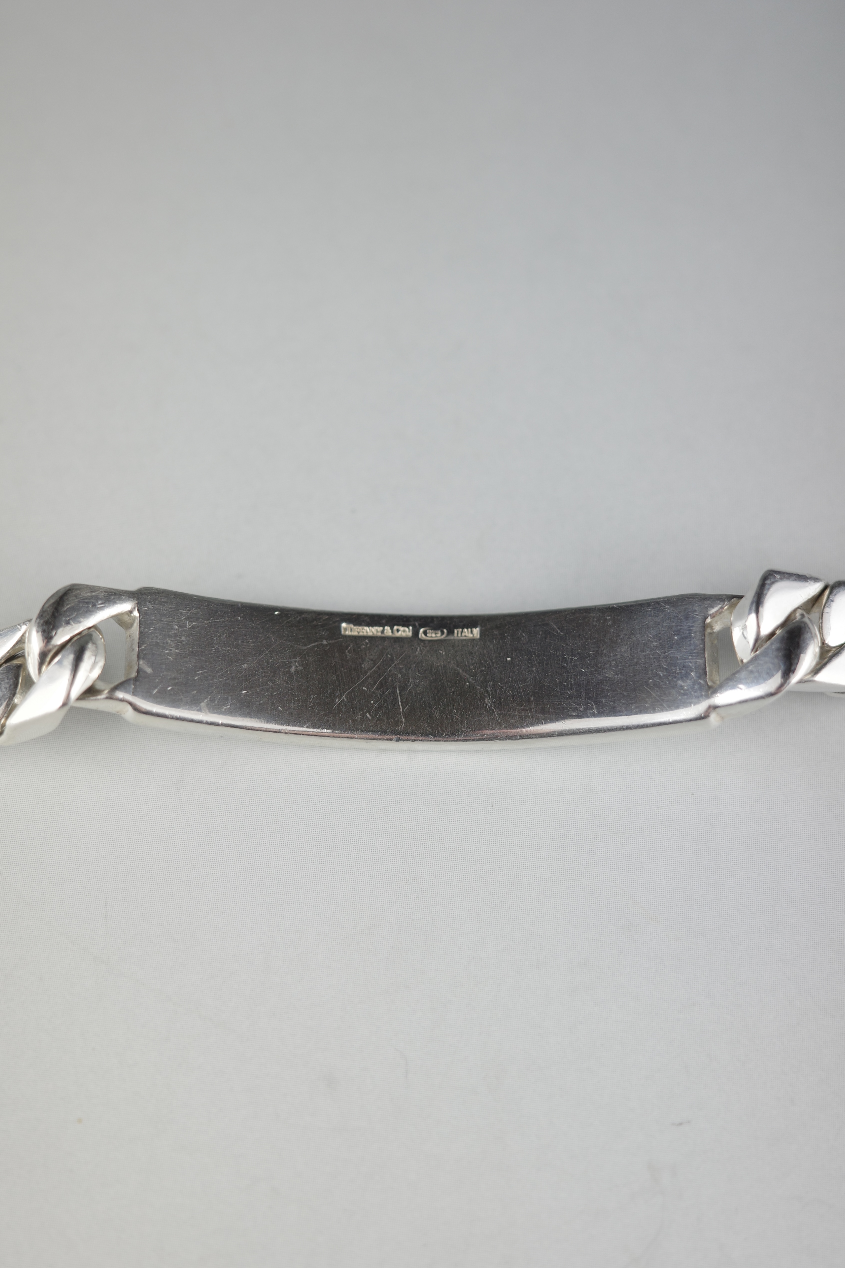 ティファニーのヴィンテージIDブレスレット。滑らかに磨き込まれたシルバーと重厚な喜平チェーンが織りなす存在感は、シンプルでありながら格別の気品を放ちます。長い時を経て纏った艶やかな風合いはヴィンテージならではの魅力で、現行モデルにはない奥ゆかしいラグジュアリーを感じさせる仕上がり。カジュアルからドレススタイルまで幅広く合わせられる、タイムレスな逸品です。