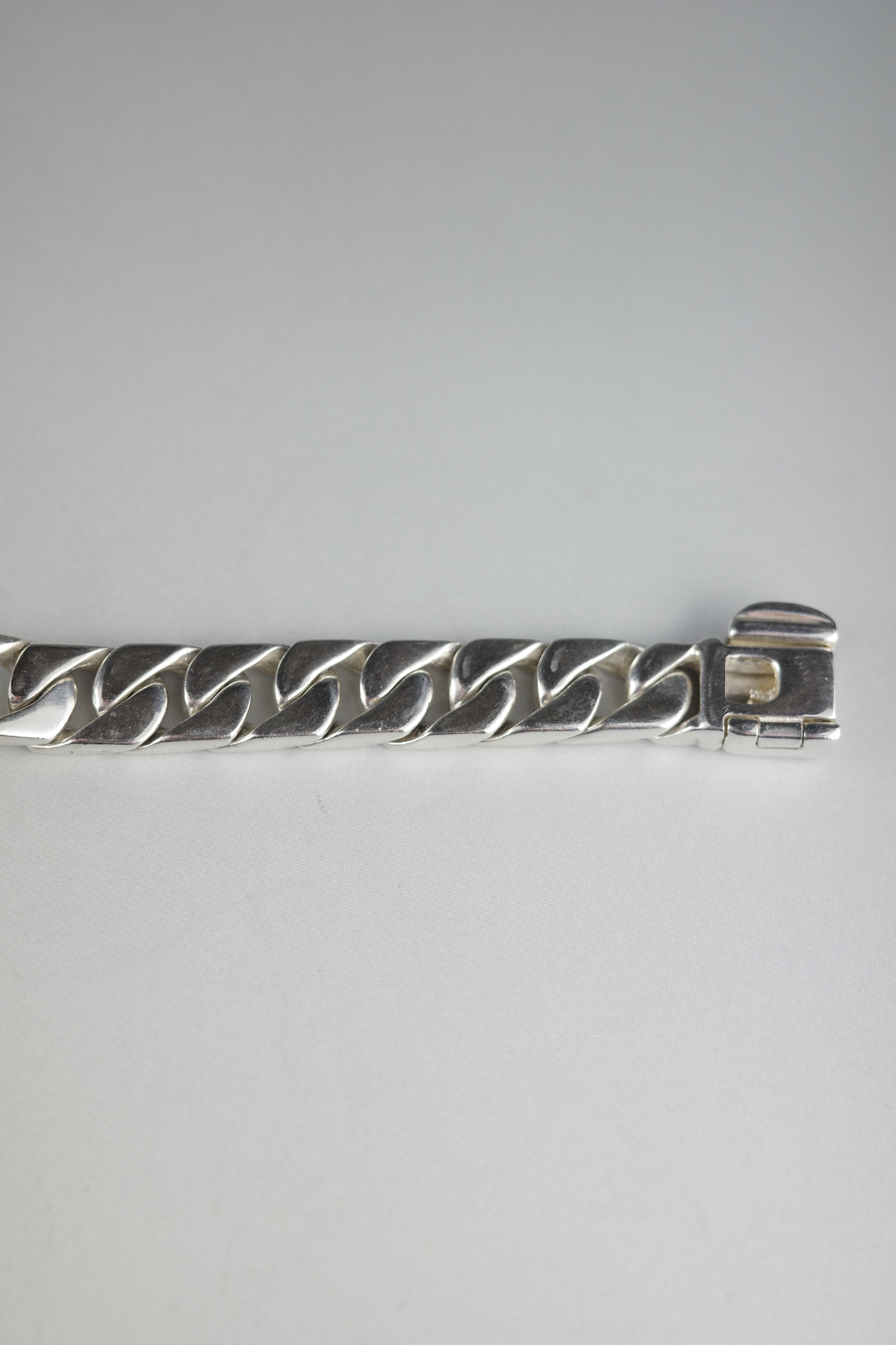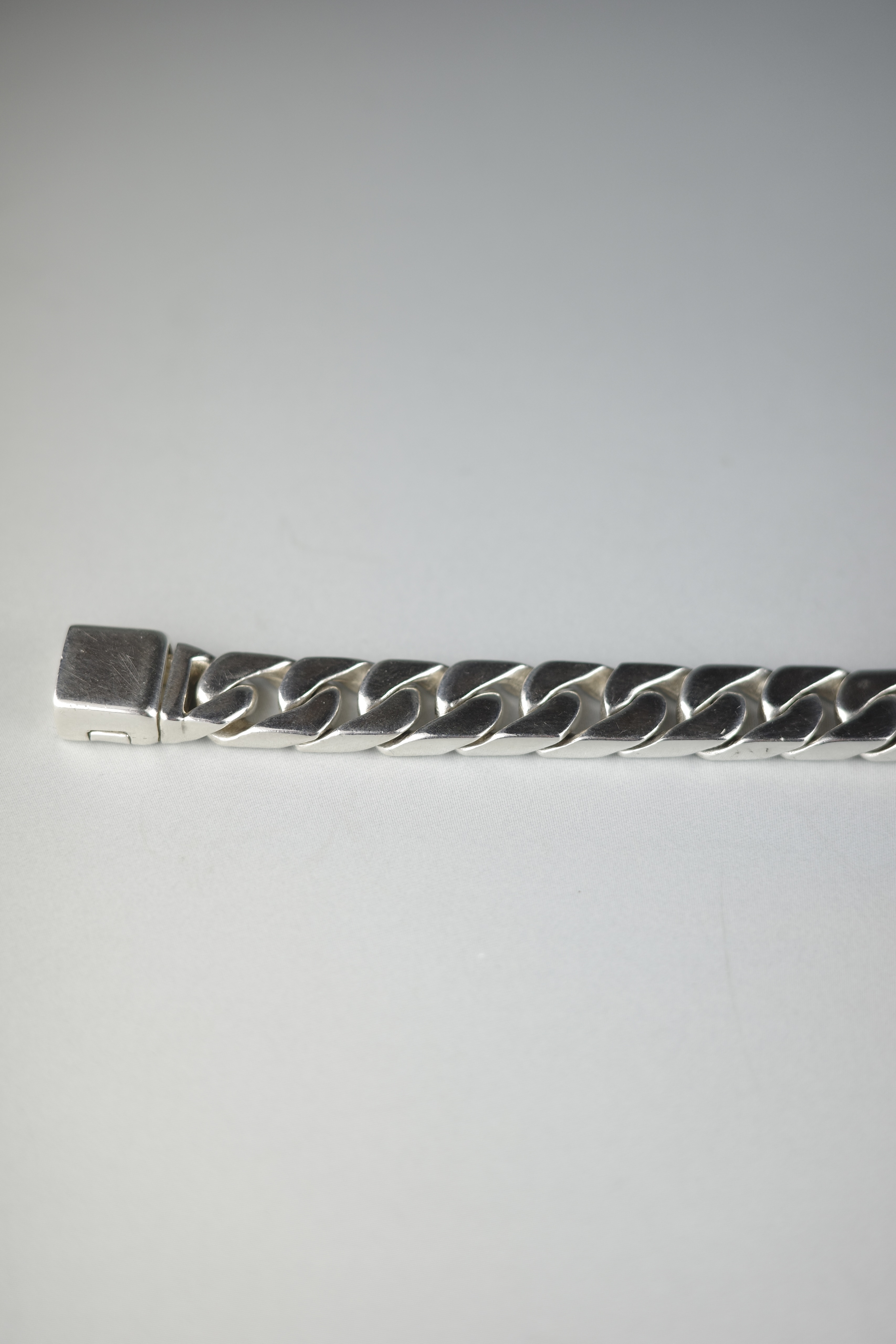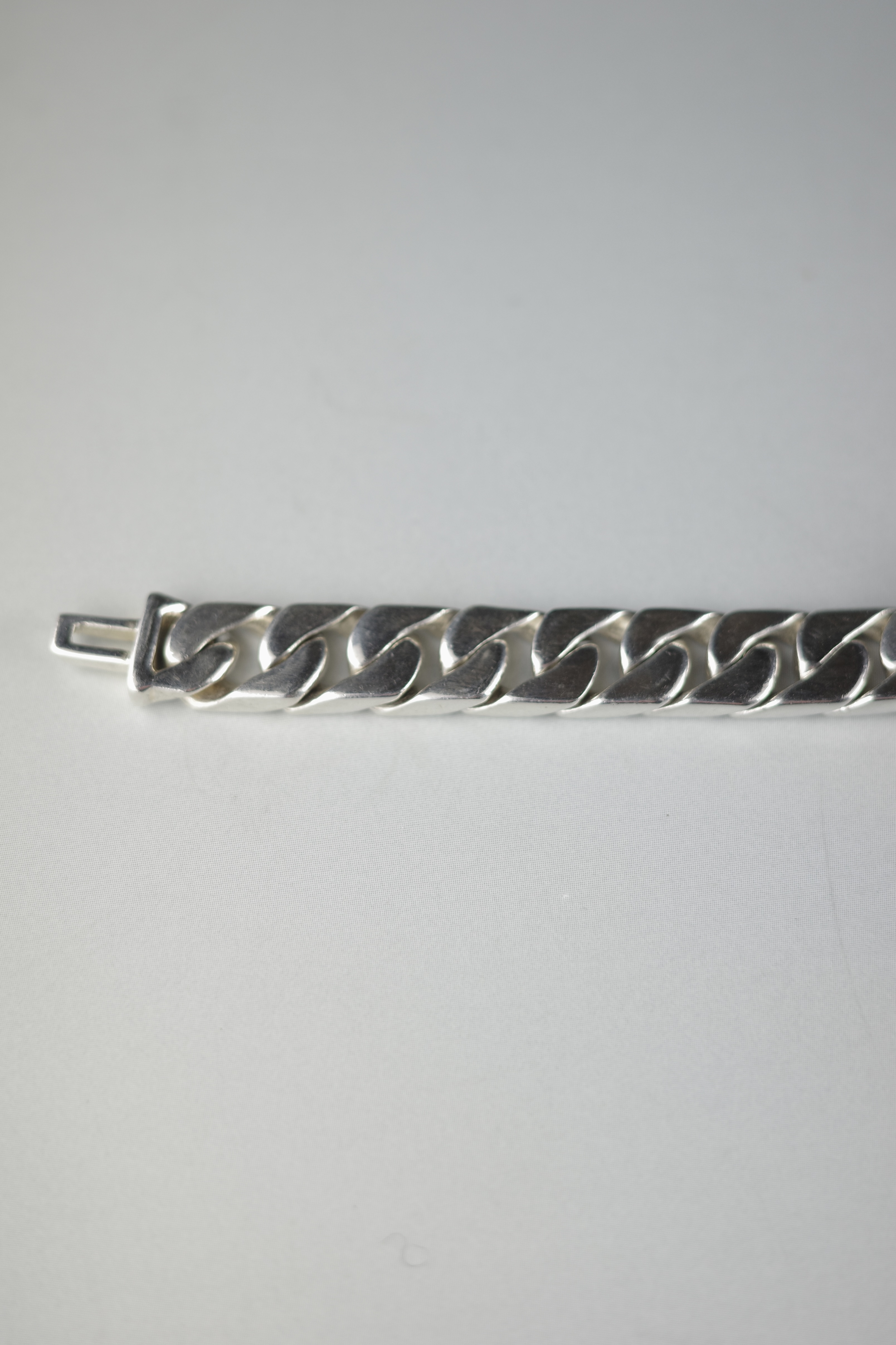 ティファニーのヴィンテージIDブレスレット。滑らかに磨き込まれたシルバーと重厚な喜平チェーンが織りなす存在感は、シンプルでありながら格別の気品を放ちます。長い時を経て纏った艶やかな風合いはヴィンテージならではの魅力で、現行モデルにはない奥ゆかしいラグジュアリーを感じさせる仕上がり。カジュアルからドレススタイルまで幅広く合わせられる、タイムレスな逸品です。