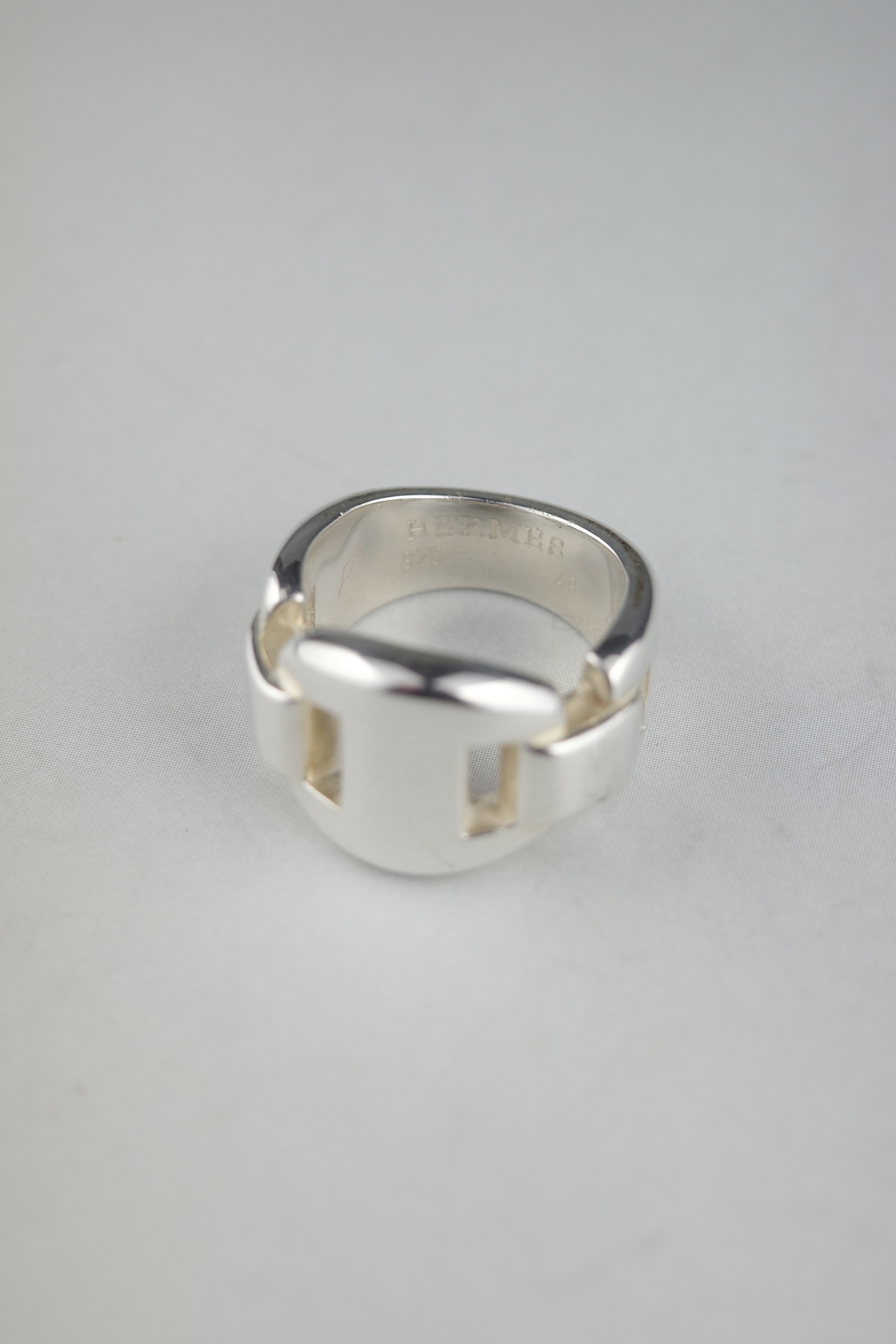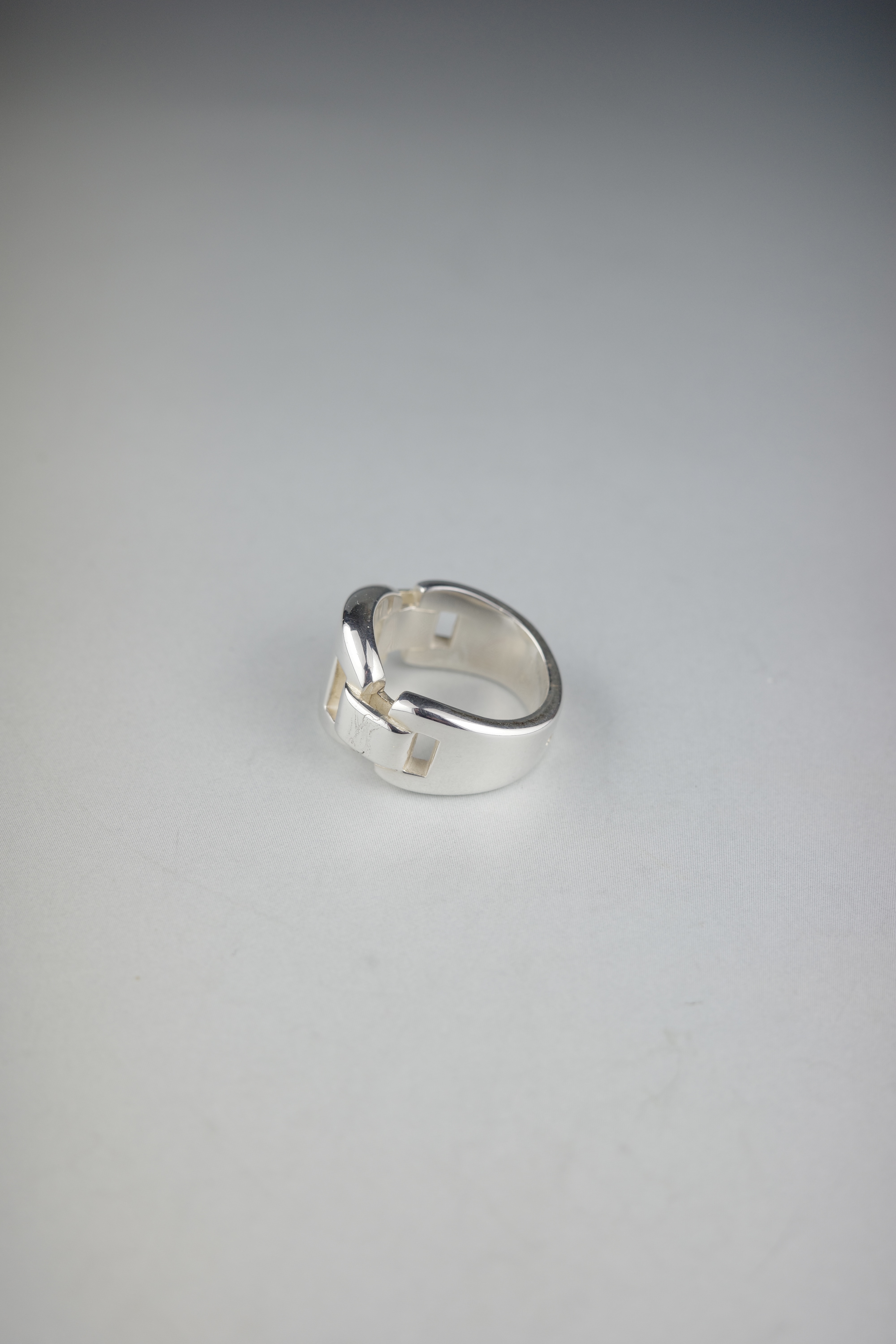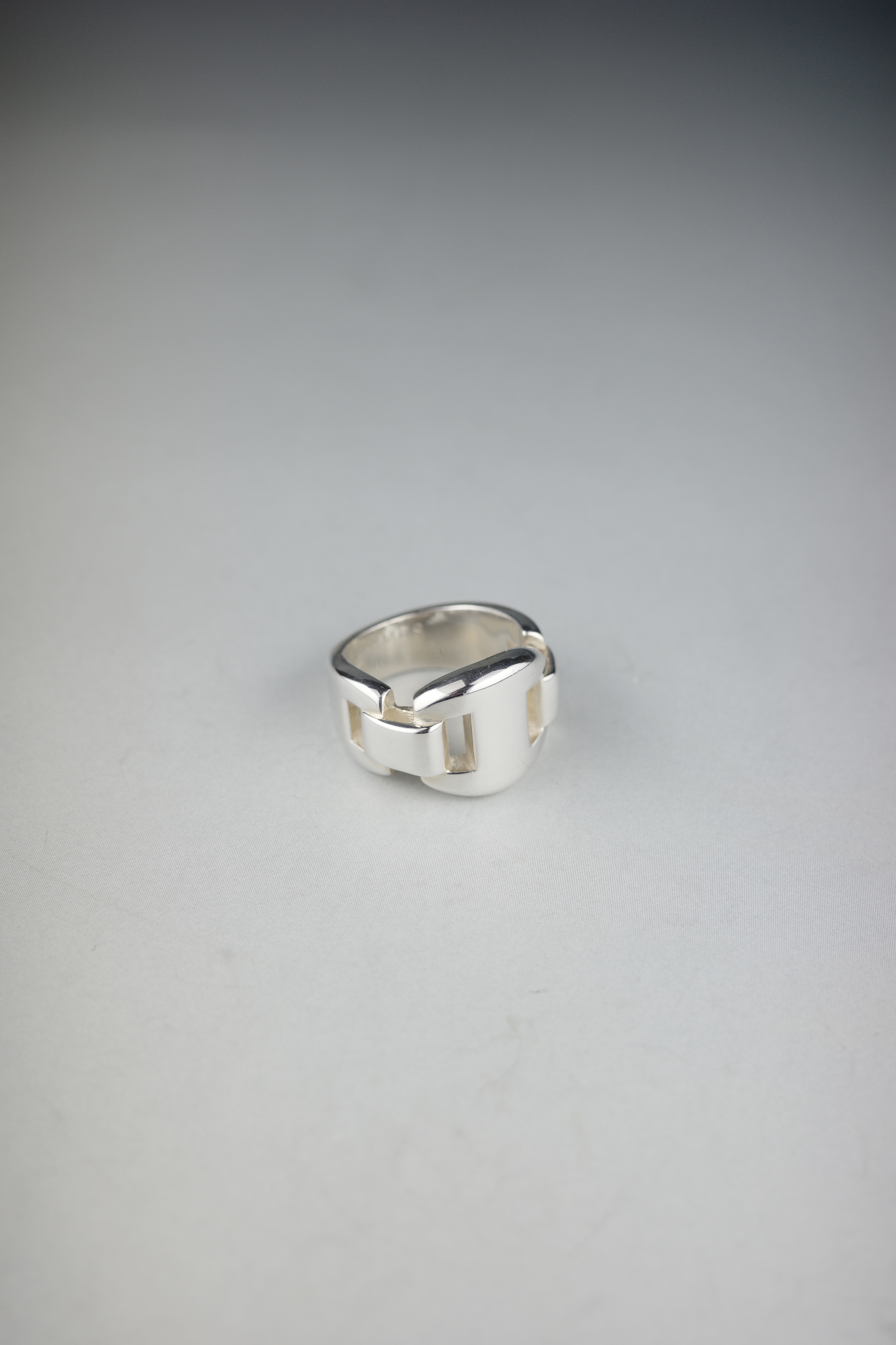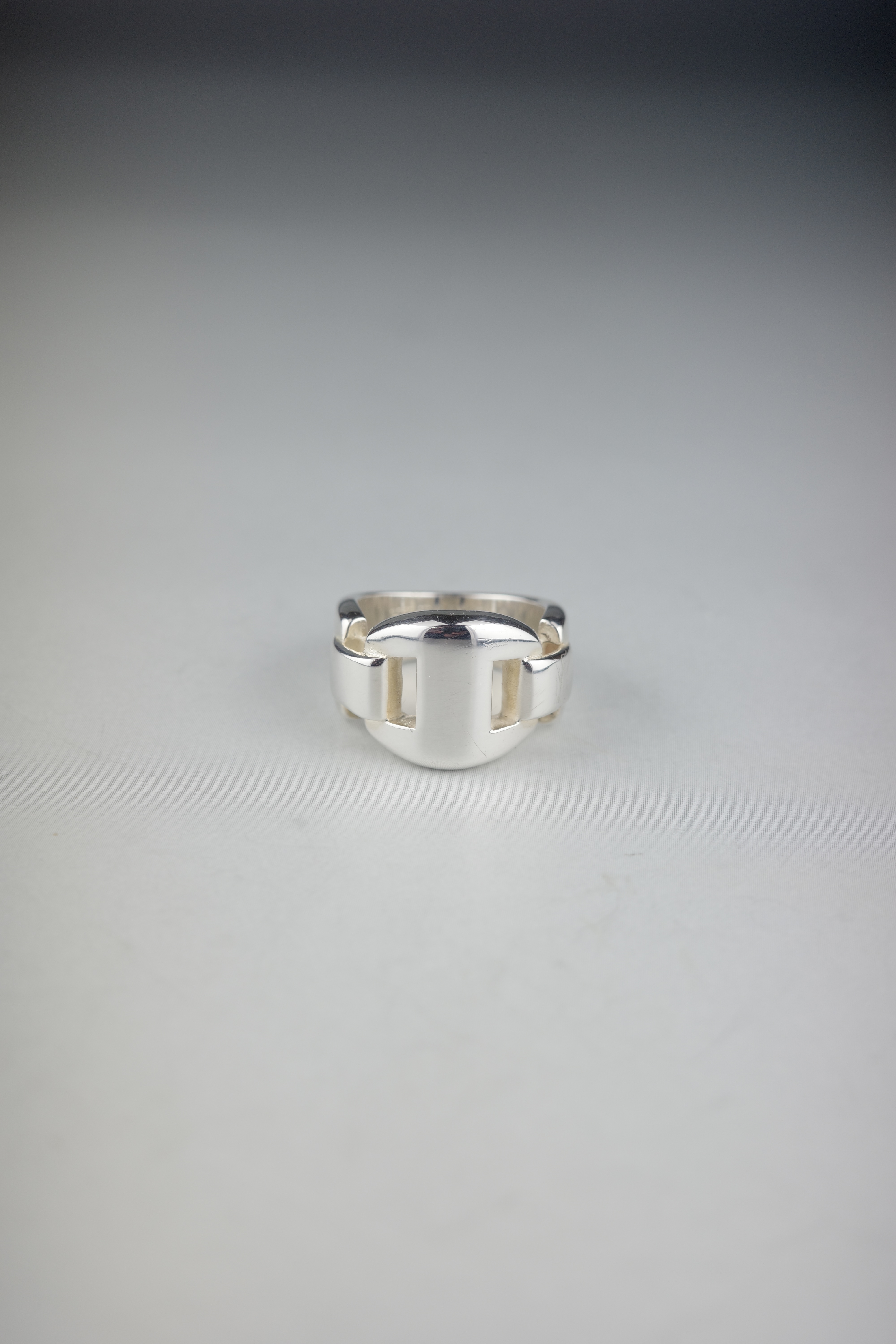 ギリシア神話に登場するエチオピアの王妃に由来する、ヴィンテージエルメスの「カシオペア」リング。エルメスを象徴する“H”モチーフのコマを連ね、まるでバックルのように構築されたデザインが特徴的。程よいボリューム感と、シルバー特有の重厚な存在感を持ちながらも、直線的で無駄のない造形により、無骨さの中に洗練された上品さを感じさせるアイテム。