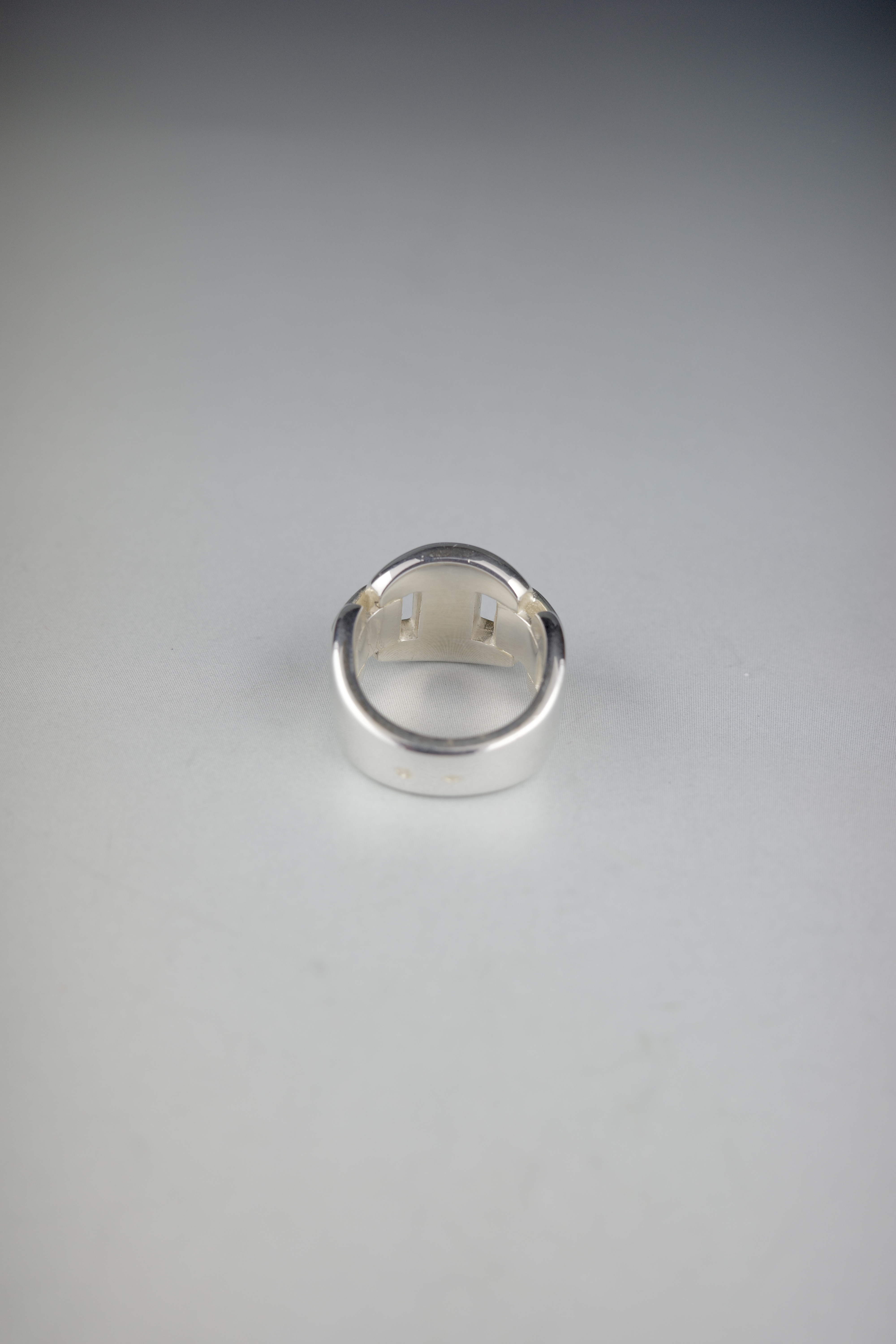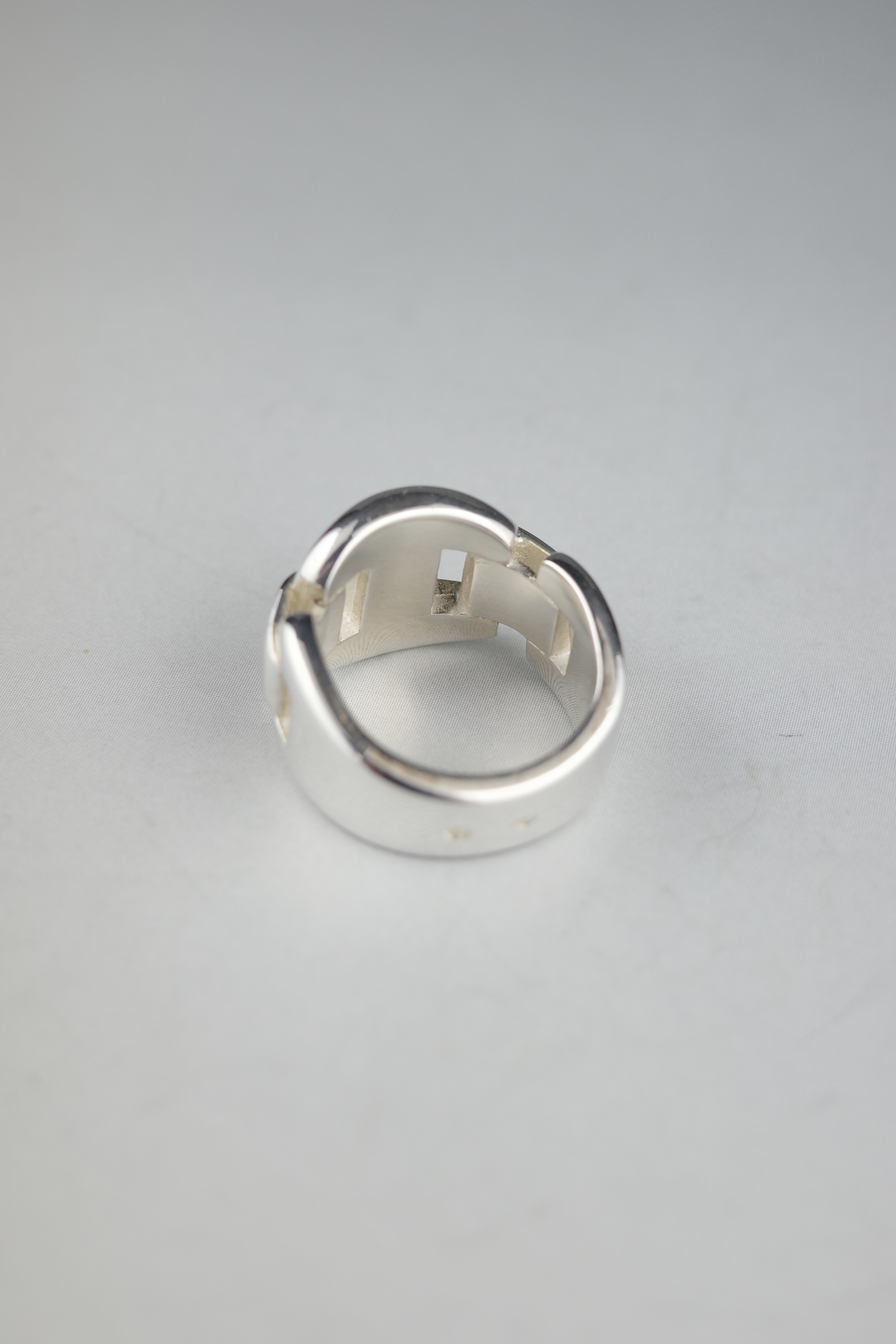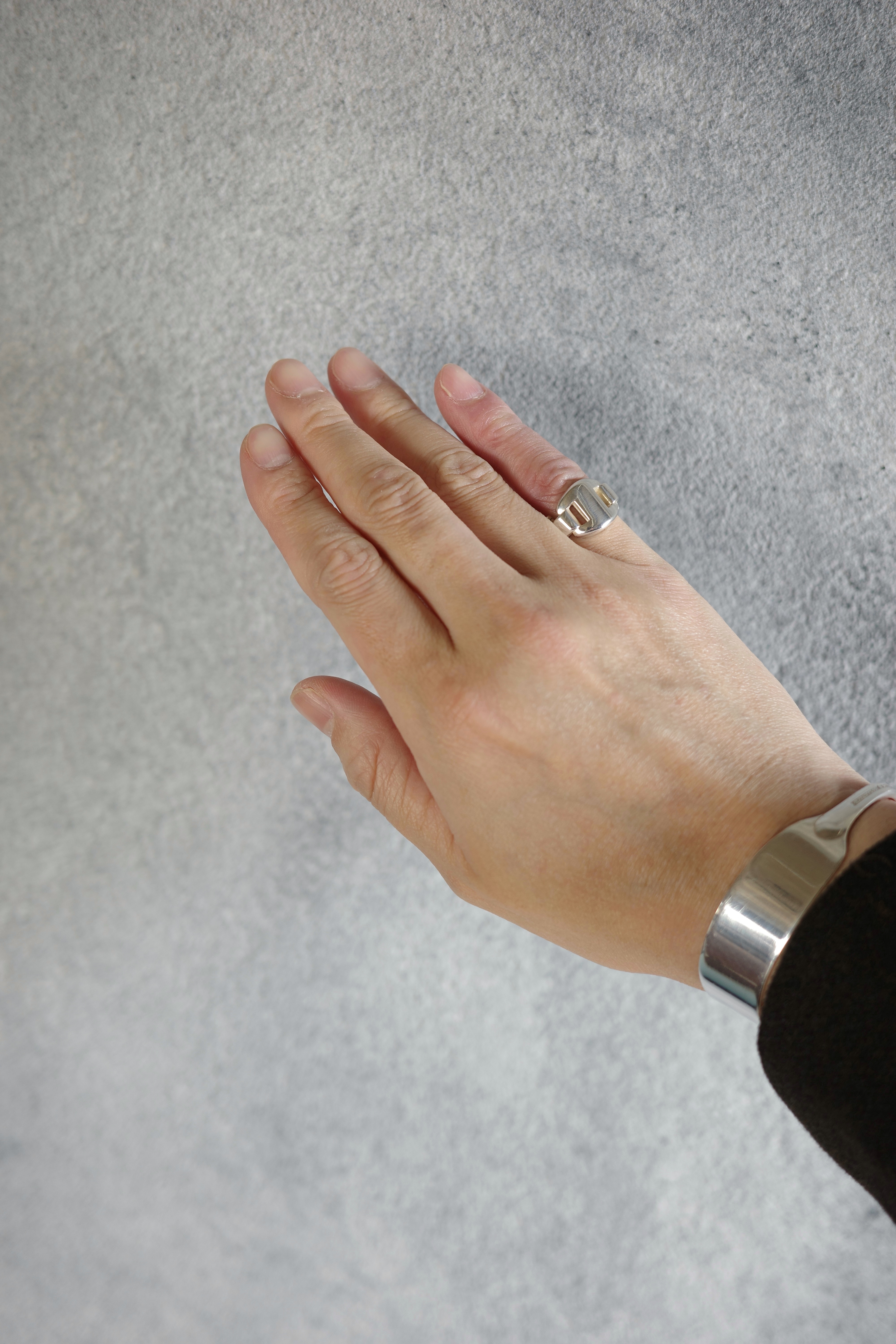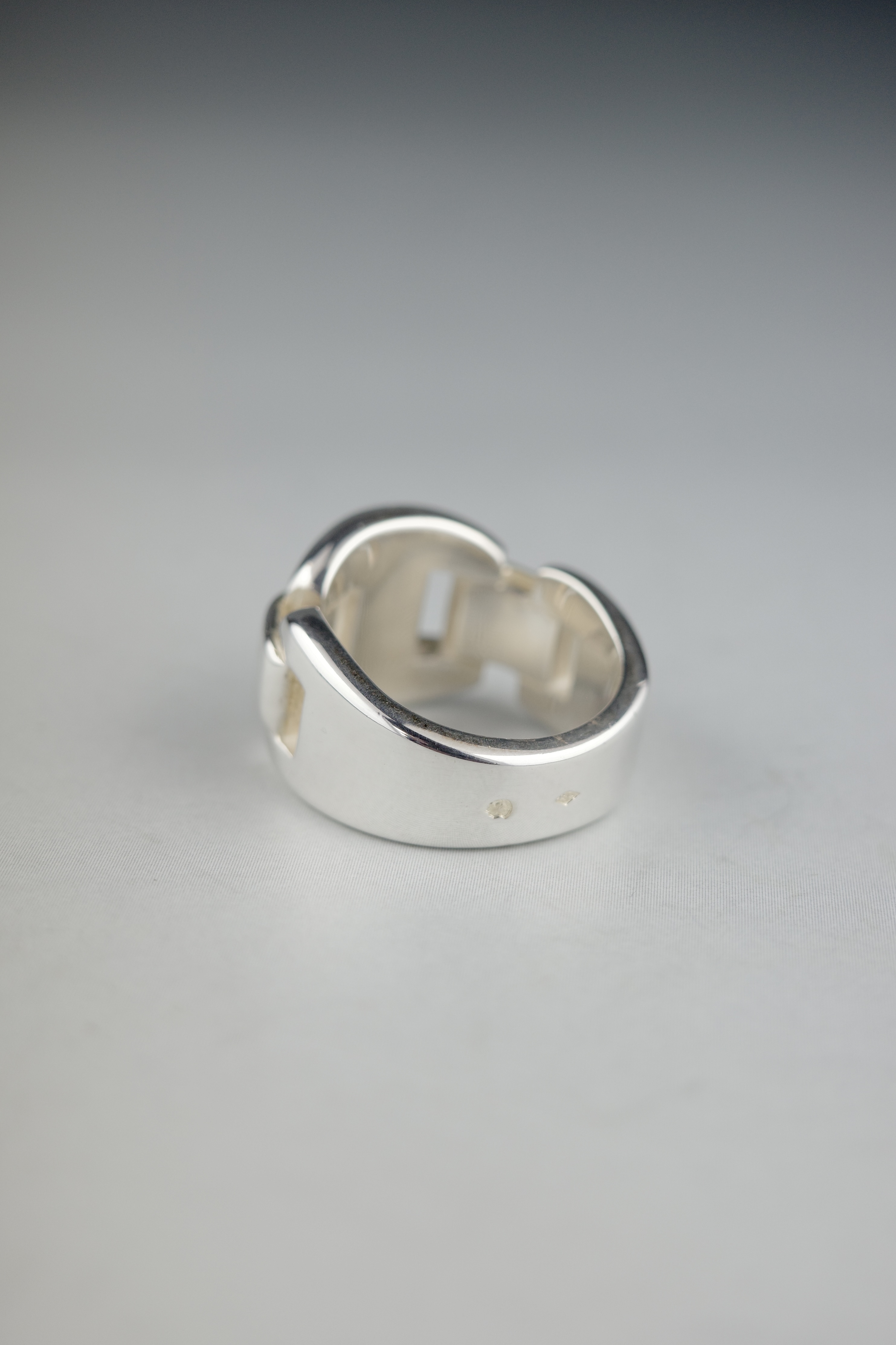 ギリシア神話に登場するエチオピアの王妃に由来する、ヴィンテージエルメスの「カシオペア」リング。エルメスを象徴する“H”モチーフのコマを連ね、まるでバックルのように構築されたデザインが特徴的。程よいボリューム感と、シルバー特有の重厚な存在感を持ちながらも、直線的で無駄のない造形により、無骨さの中に洗練された上品さを感じさせるアイテム。