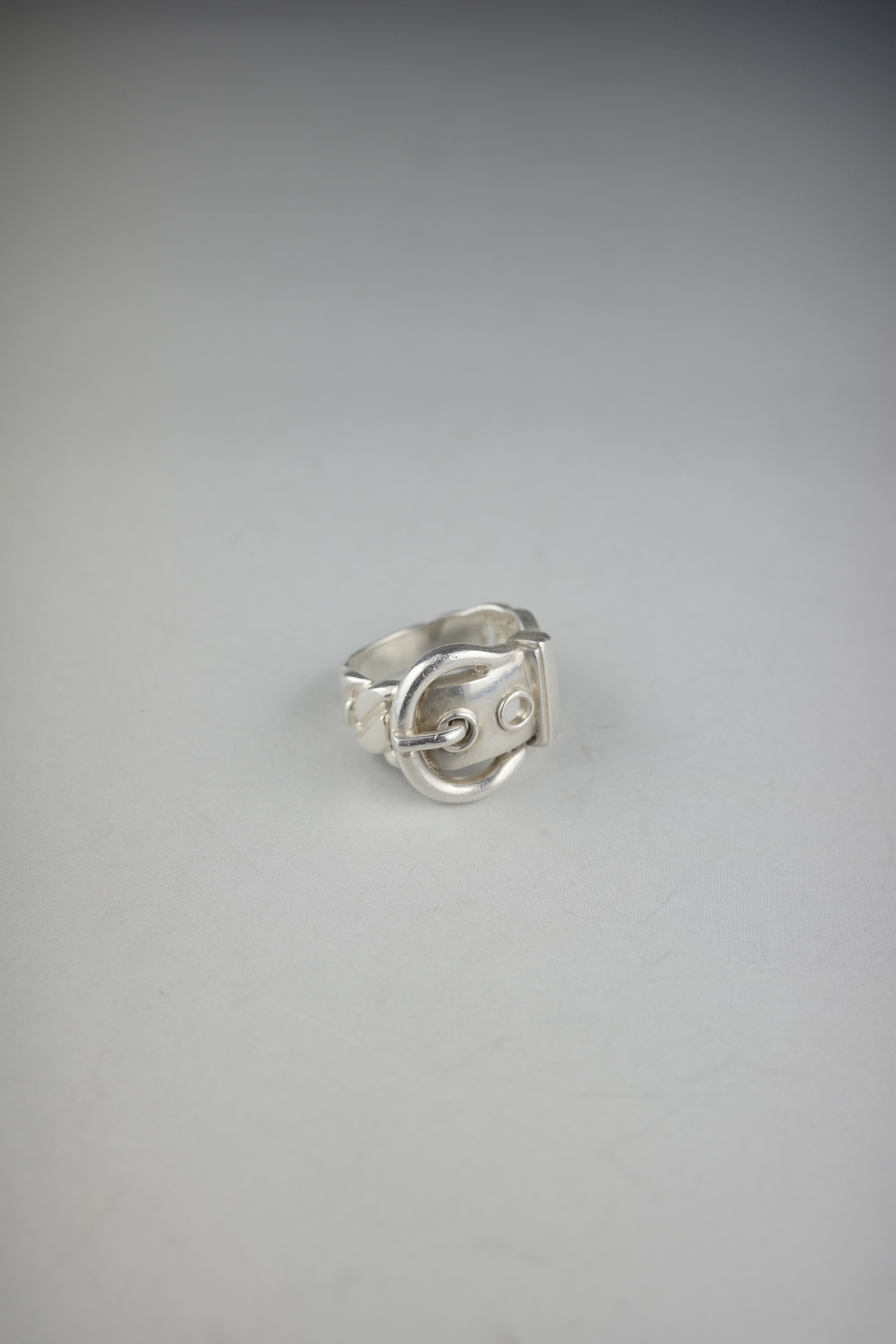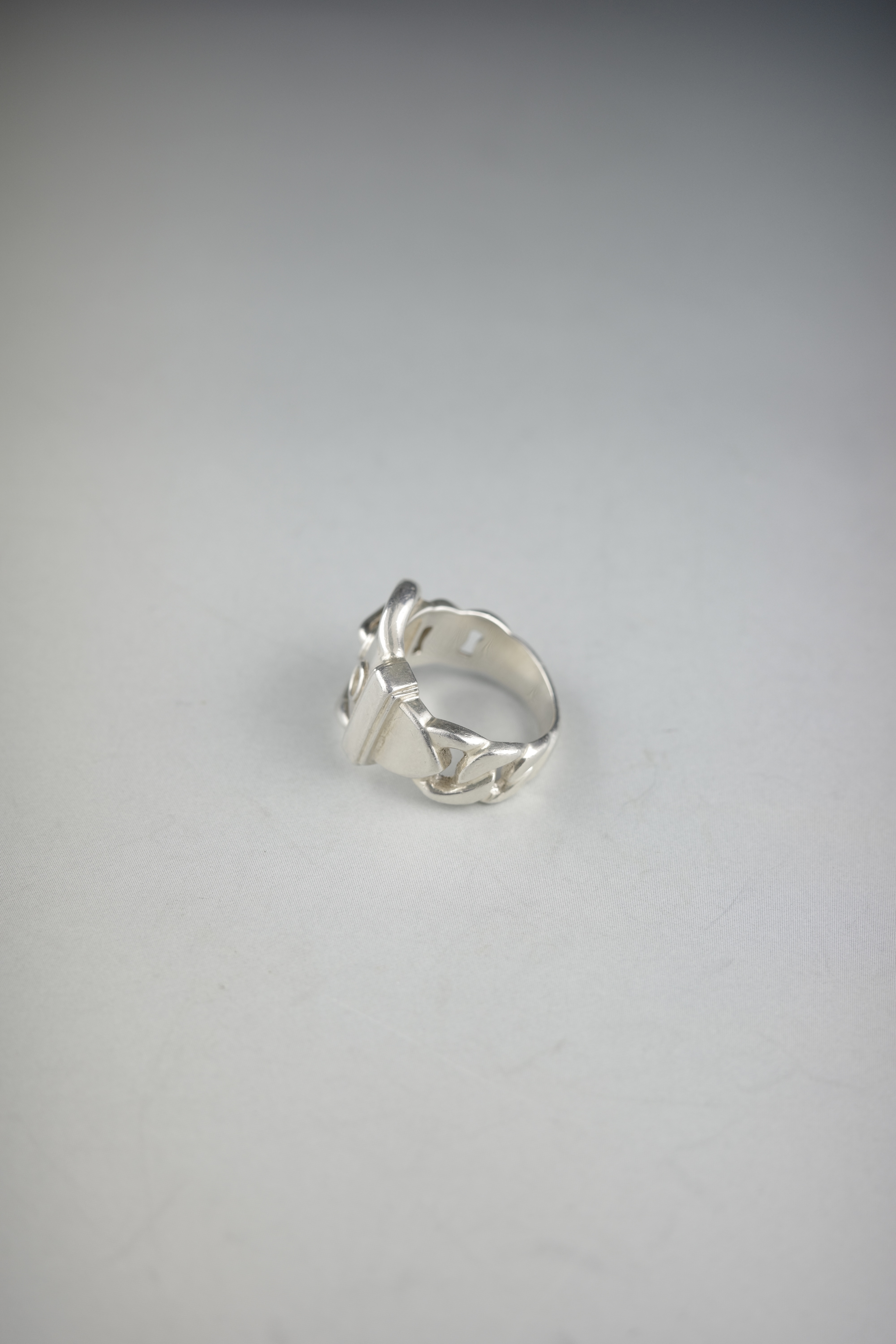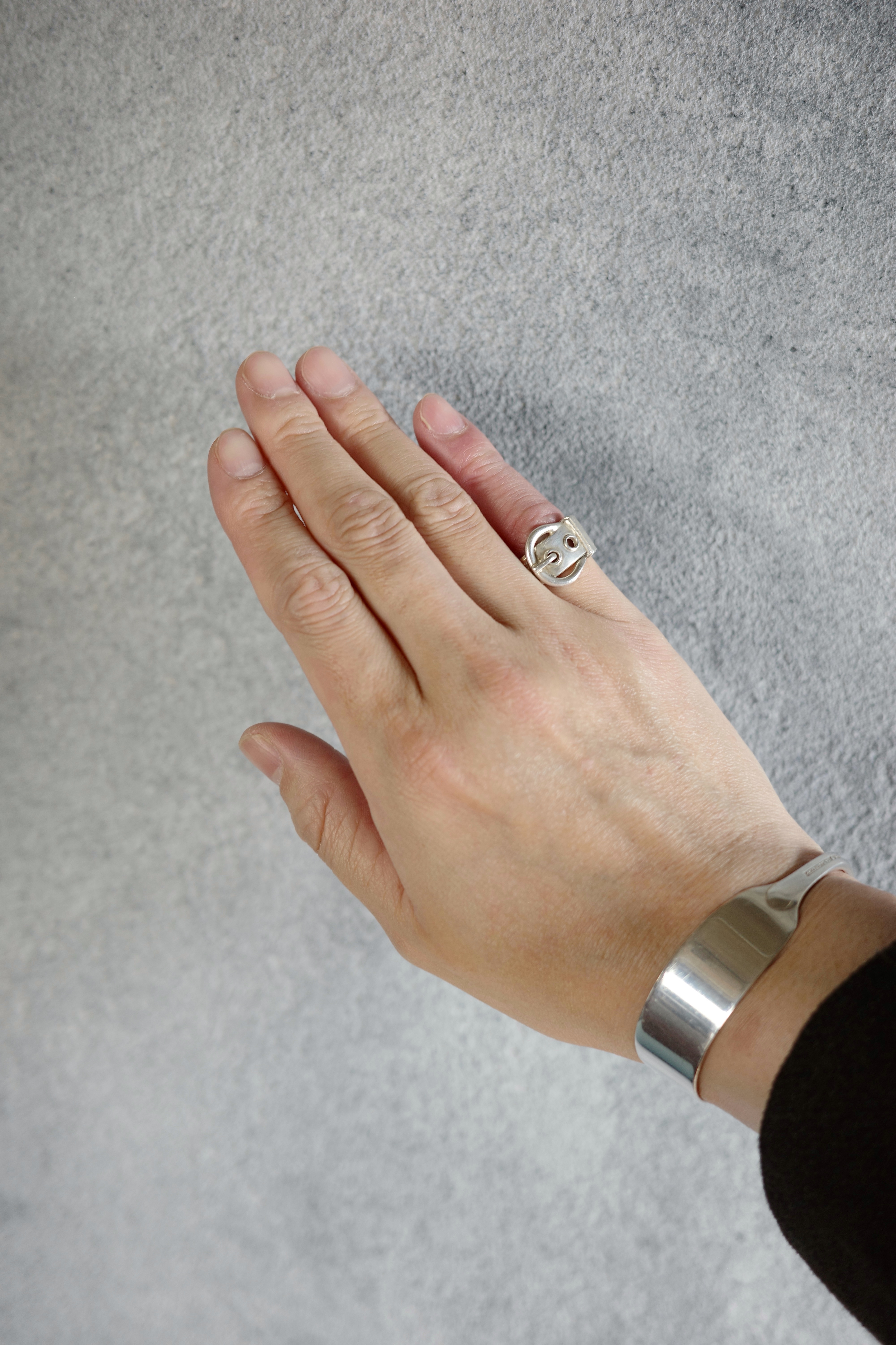 ブレスレットでも高い人気を誇る、エルメスの代表的モチーフ「ブックルセリエ」リング。“Sellier(セリエ)”とはフランス語で馬具師を意味し、馬具製作に用いられる堅牢な革の縫製技術や構造美に由来しています。バックルや金具を思わせる立体的なフォルムは、エルメスが培ってきた馬具製作の歴史を色濃く反映したデザイン。程よいボリューム感とシルバーの重厚さを備えながら、指に乗せるとどこか品のある佇まいを見せてくれるアイテム。