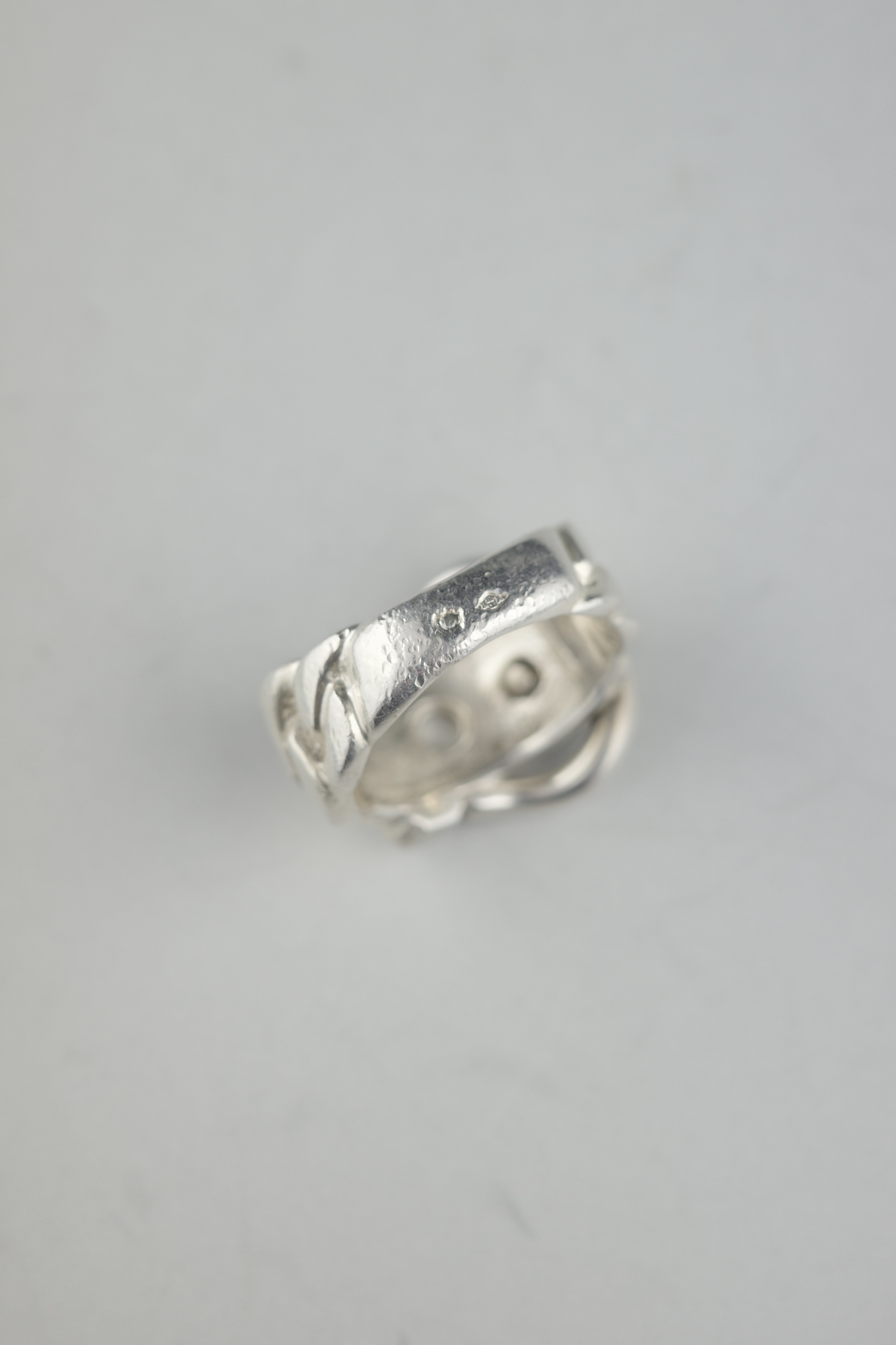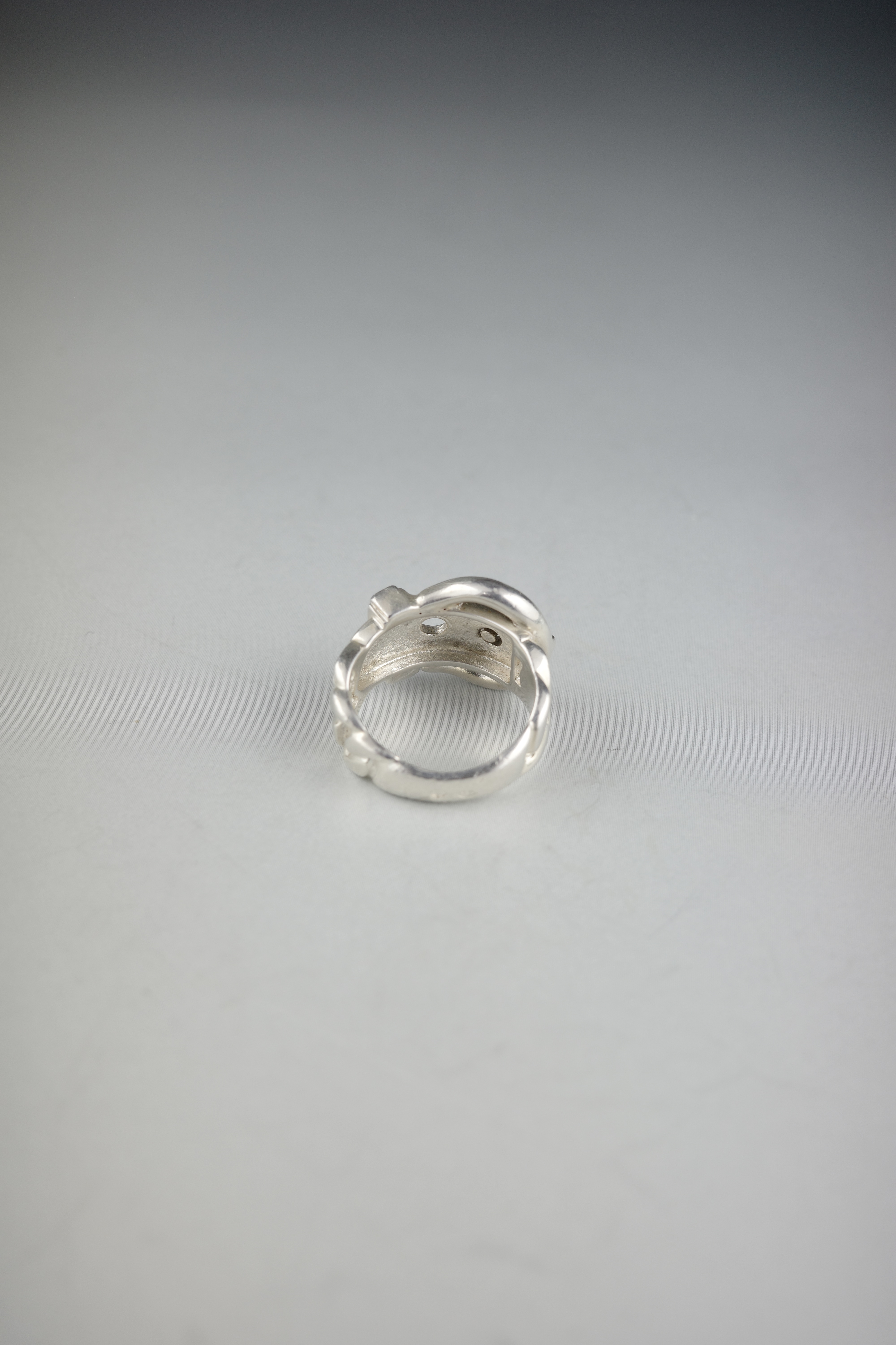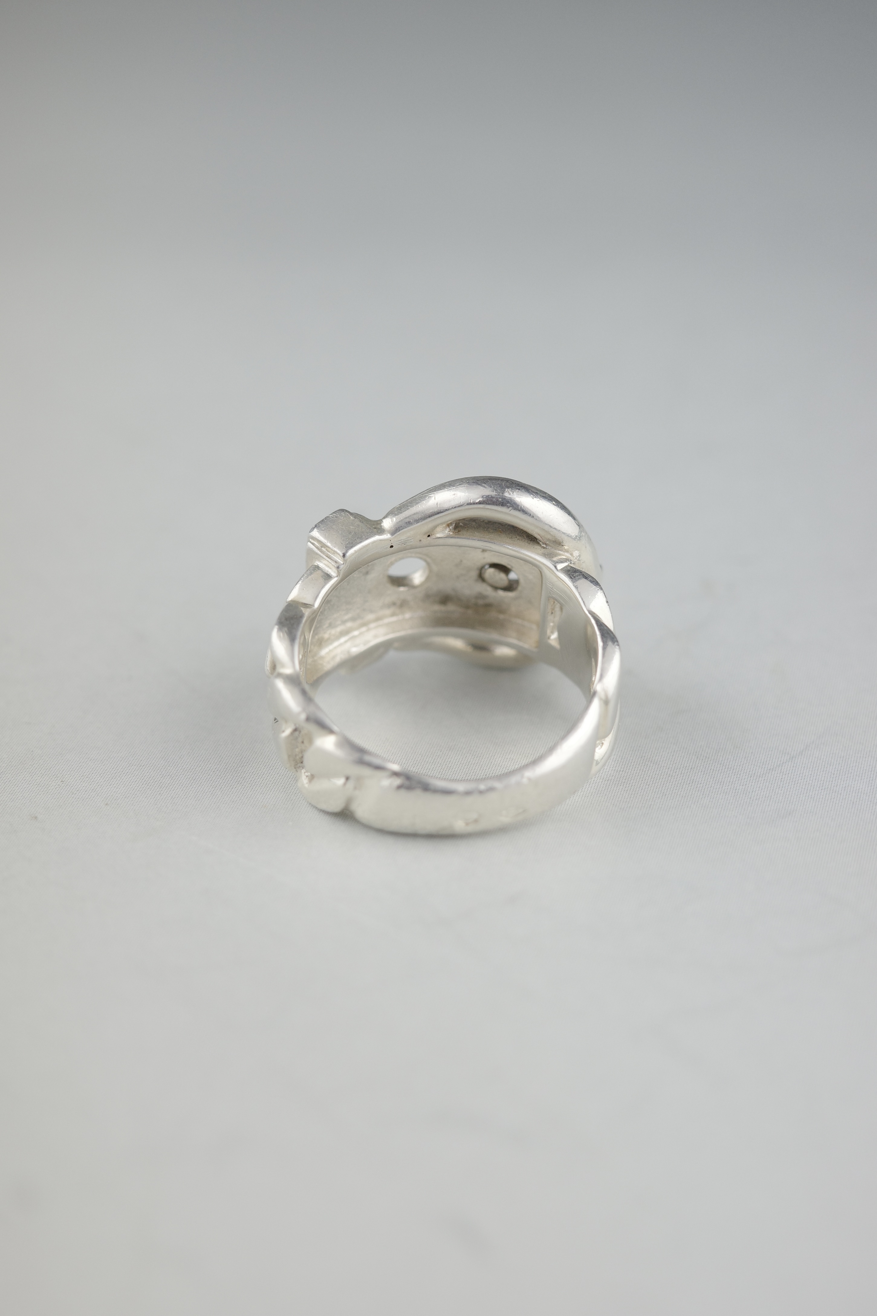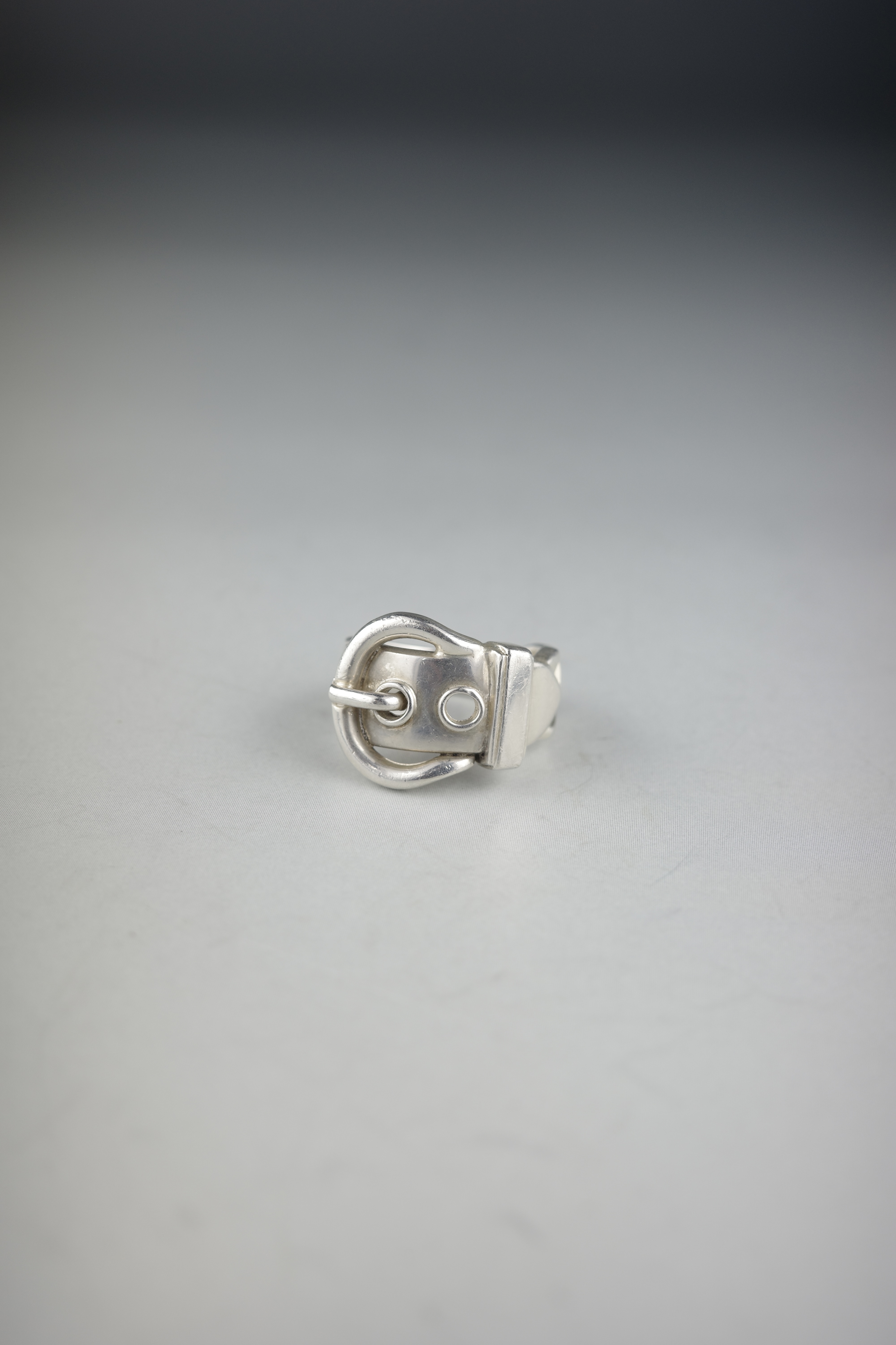 ブレスレットでも高い人気を誇る、エルメスの代表的モチーフ「ブックルセリエ」リング。“Sellier(セリエ)”とはフランス語で馬具師を意味し、馬具製作に用いられる堅牢な革の縫製技術や構造美に由来しています。バックルや金具を思わせる立体的なフォルムは、エルメスが培ってきた馬具製作の歴史を色濃く反映したデザイン。程よいボリューム感とシルバーの重厚さを備えながら、指に乗せるとどこか品のある佇まいを見せてくれるアイテム。