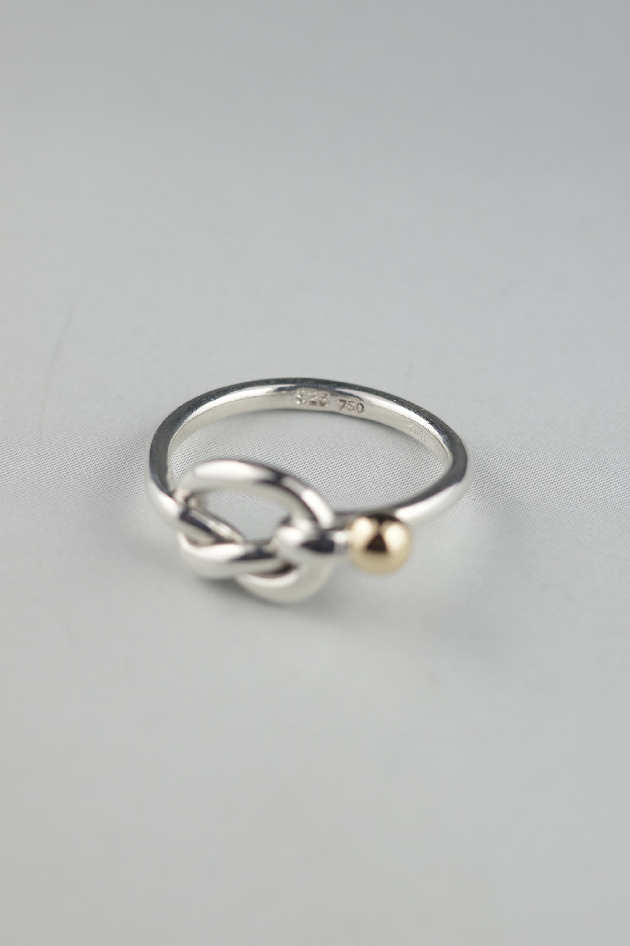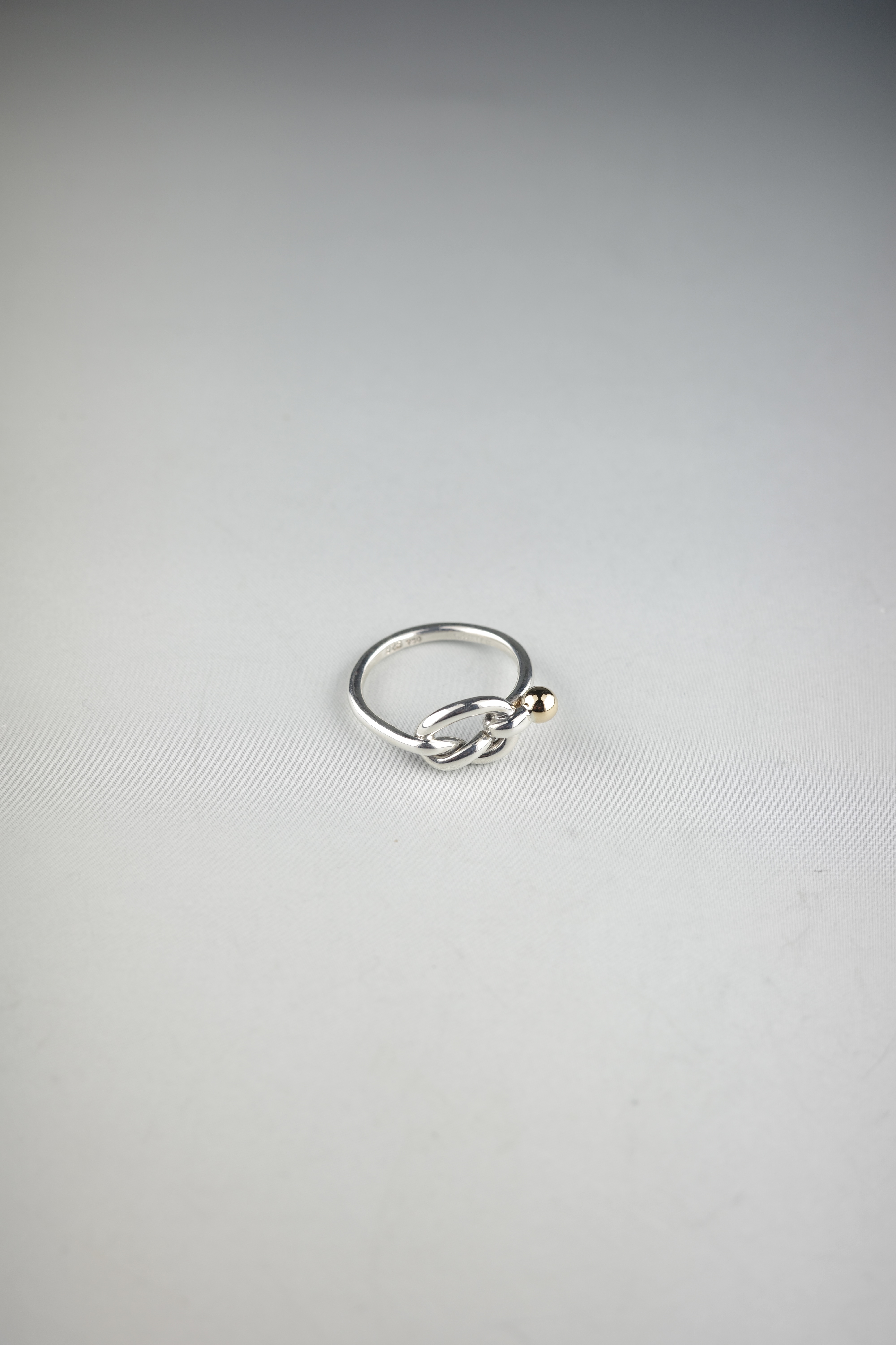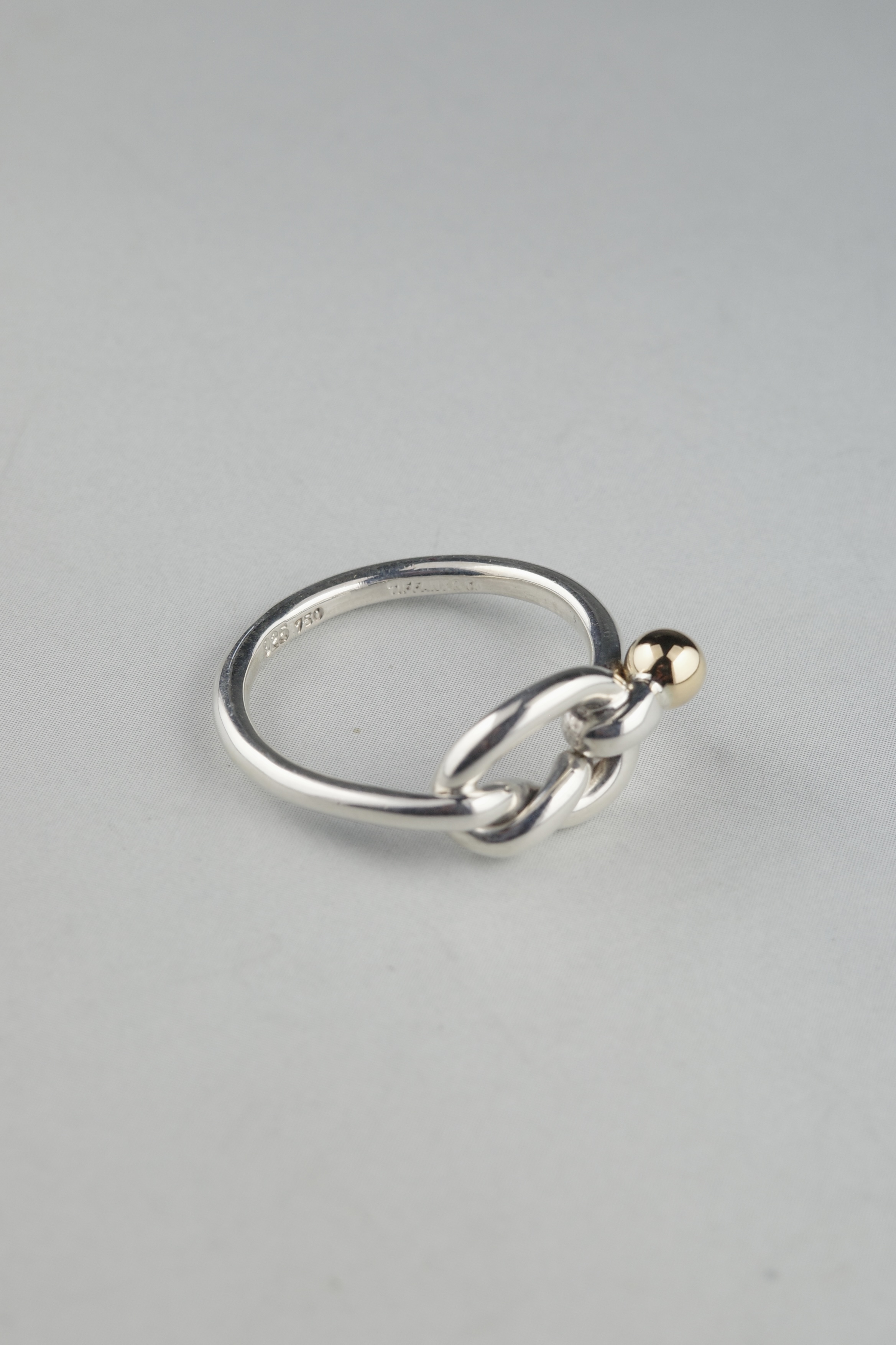 “結び目”をモチーフにした、ティファニーの名作ラブノットリング。絡み合うシルバーのラインに、アクセントとなるK18ゴールドのボール。異素材のコントラストが立体感を生み、指元にさりげない華やかさを添えてくれます。ラブノットは“永遠の絆”や“愛の結びつき”を象徴するデザイン。意味合いも含め、長く選ばれ続けているモデルです。甘くなりすぎない造形と、程よいボリューム感。ヴィンテージならではの柔らかな丸みと風合いも相まって、現行とはまた違った深みを感じられるアイテムです。