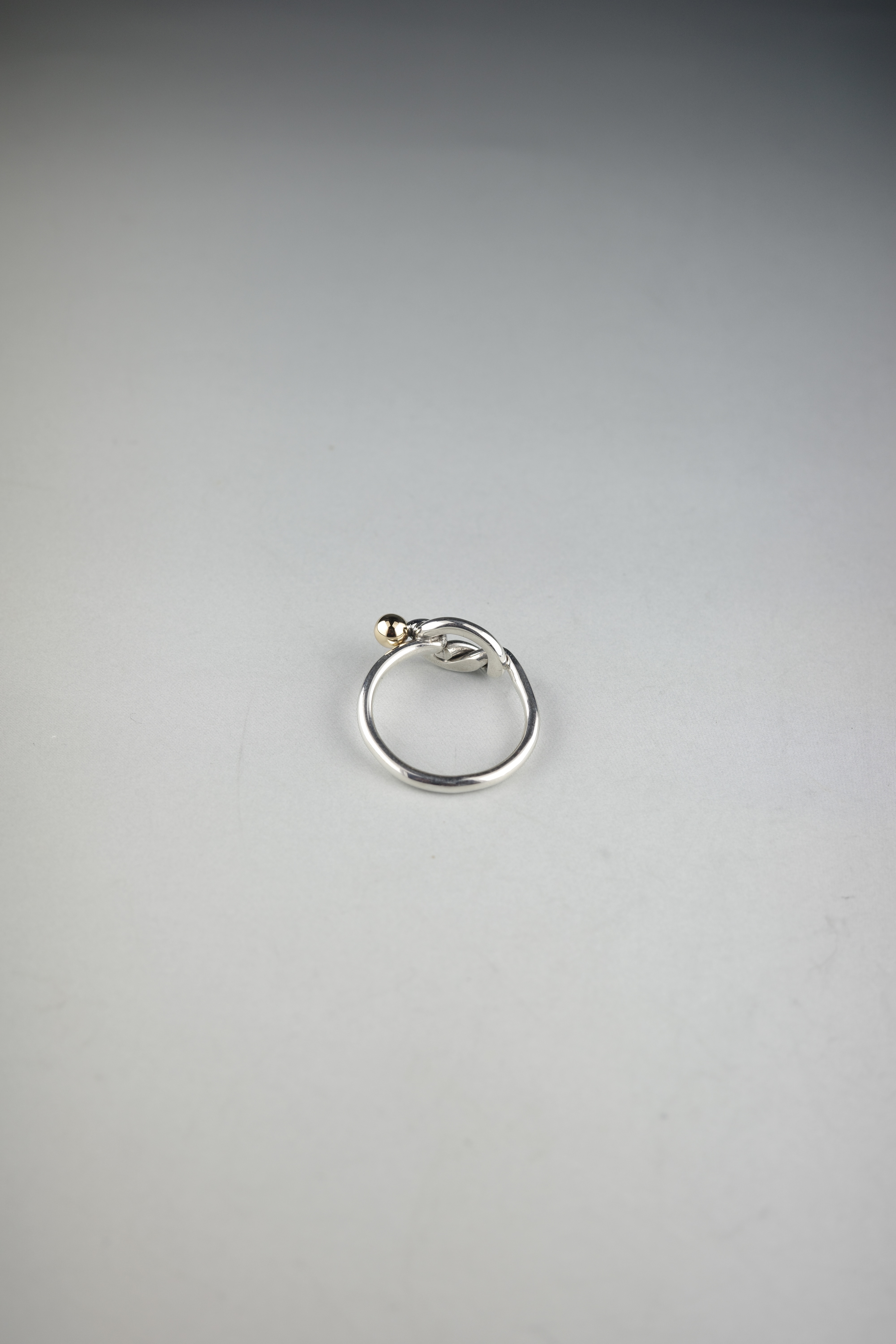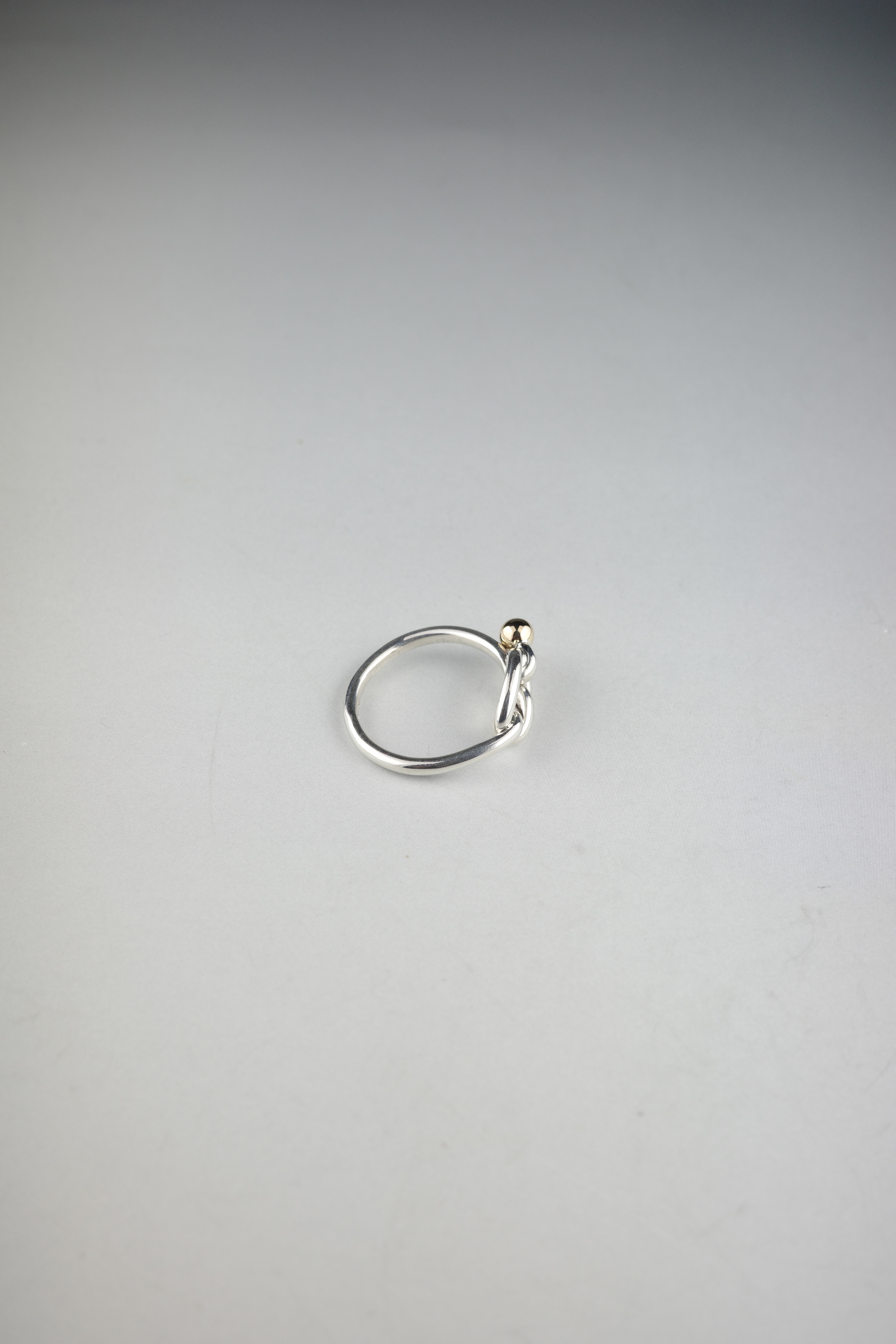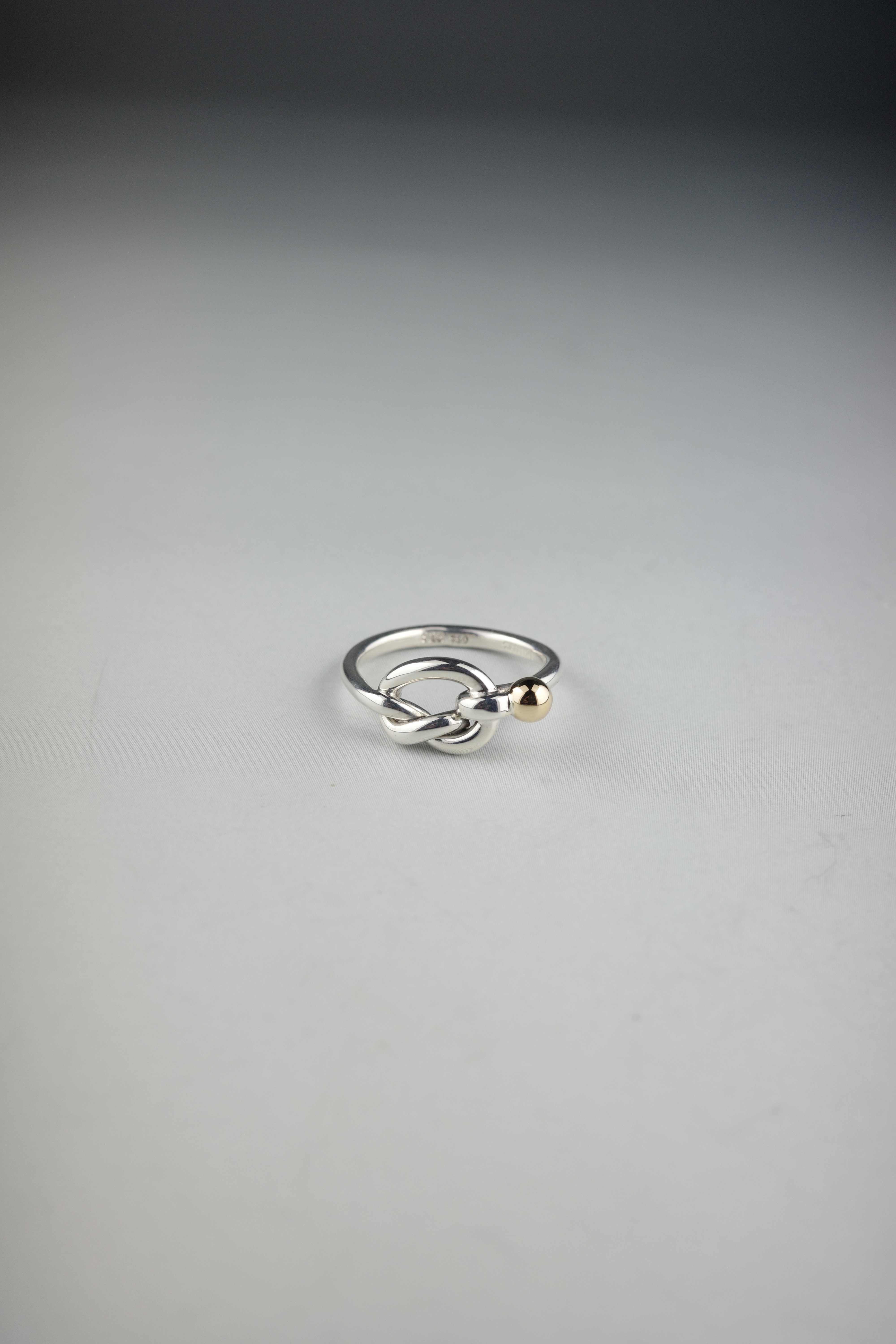 “結び目”をモチーフにした、ティファニーの名作ラブノットリング。絡み合うシルバーのラインに、アクセントとなるK18ゴールドのボール。異素材のコントラストが立体感を生み、指元にさりげない華やかさを添えてくれます。ラブノットは“永遠の絆”や“愛の結びつき”を象徴するデザイン。意味合いも含め、長く選ばれ続けているモデルです。甘くなりすぎない造形と、程よいボリューム感。ヴィンテージならではの柔らかな丸みと風合いも相まって、現行とはまた違った深みを感じられるアイテムです。