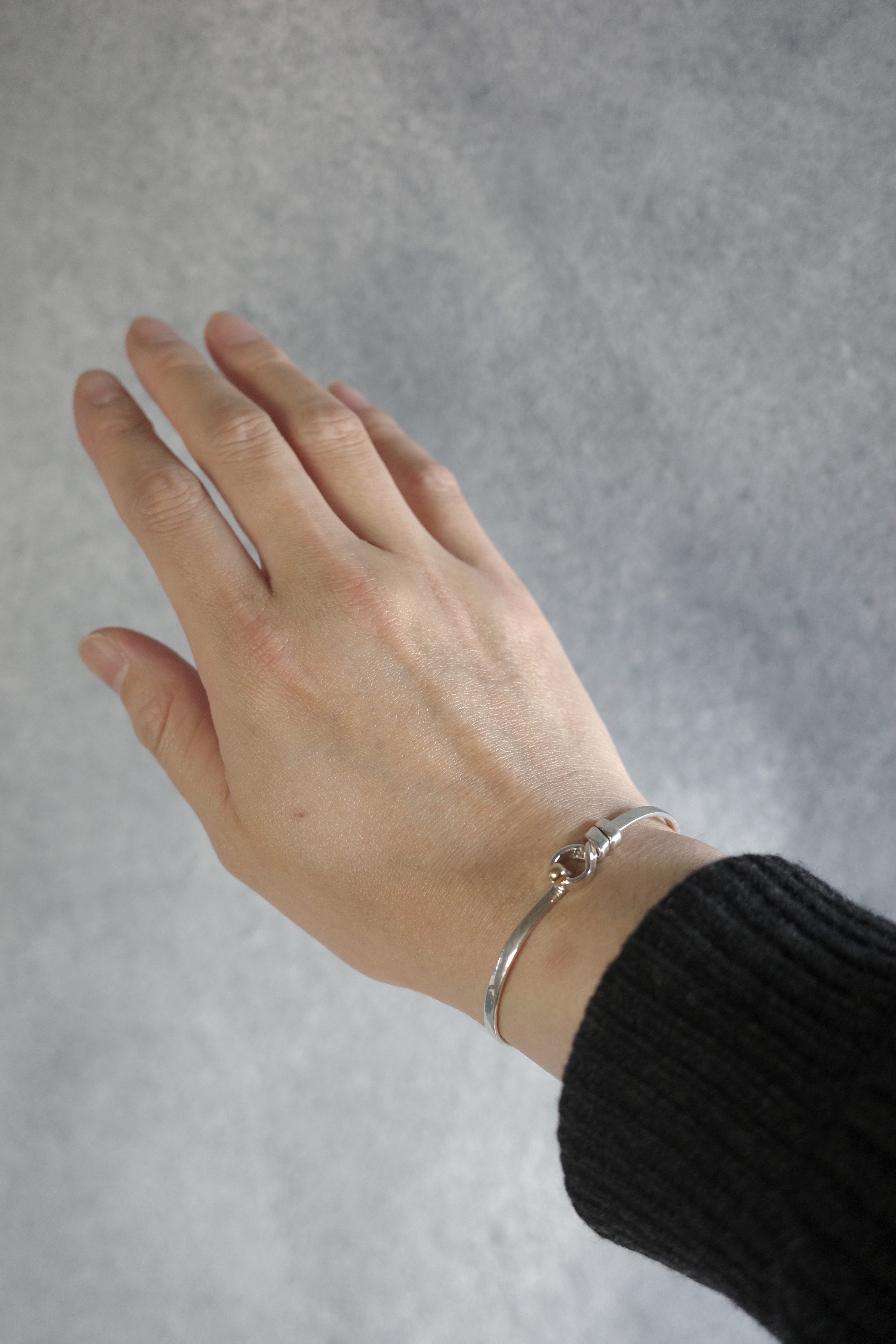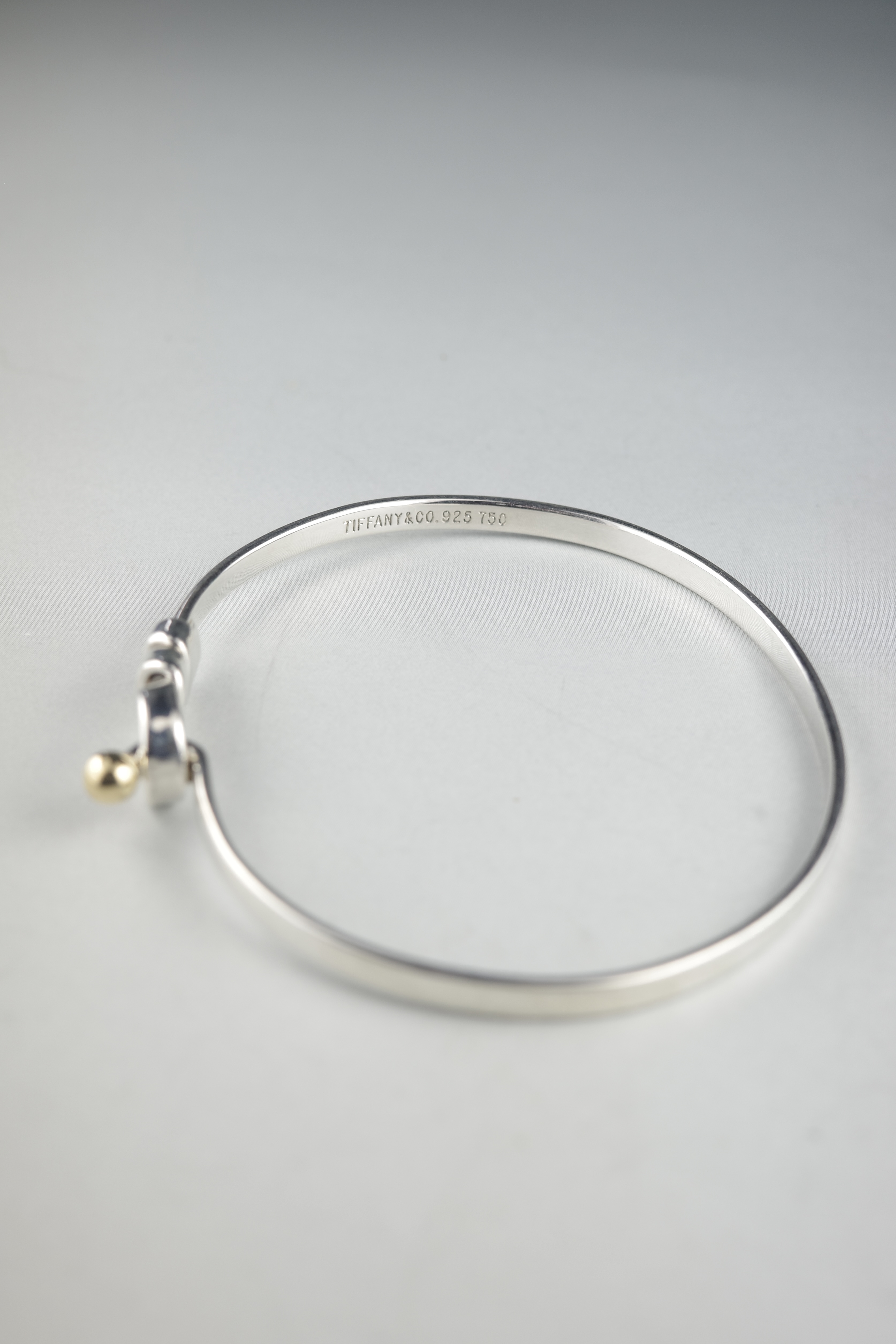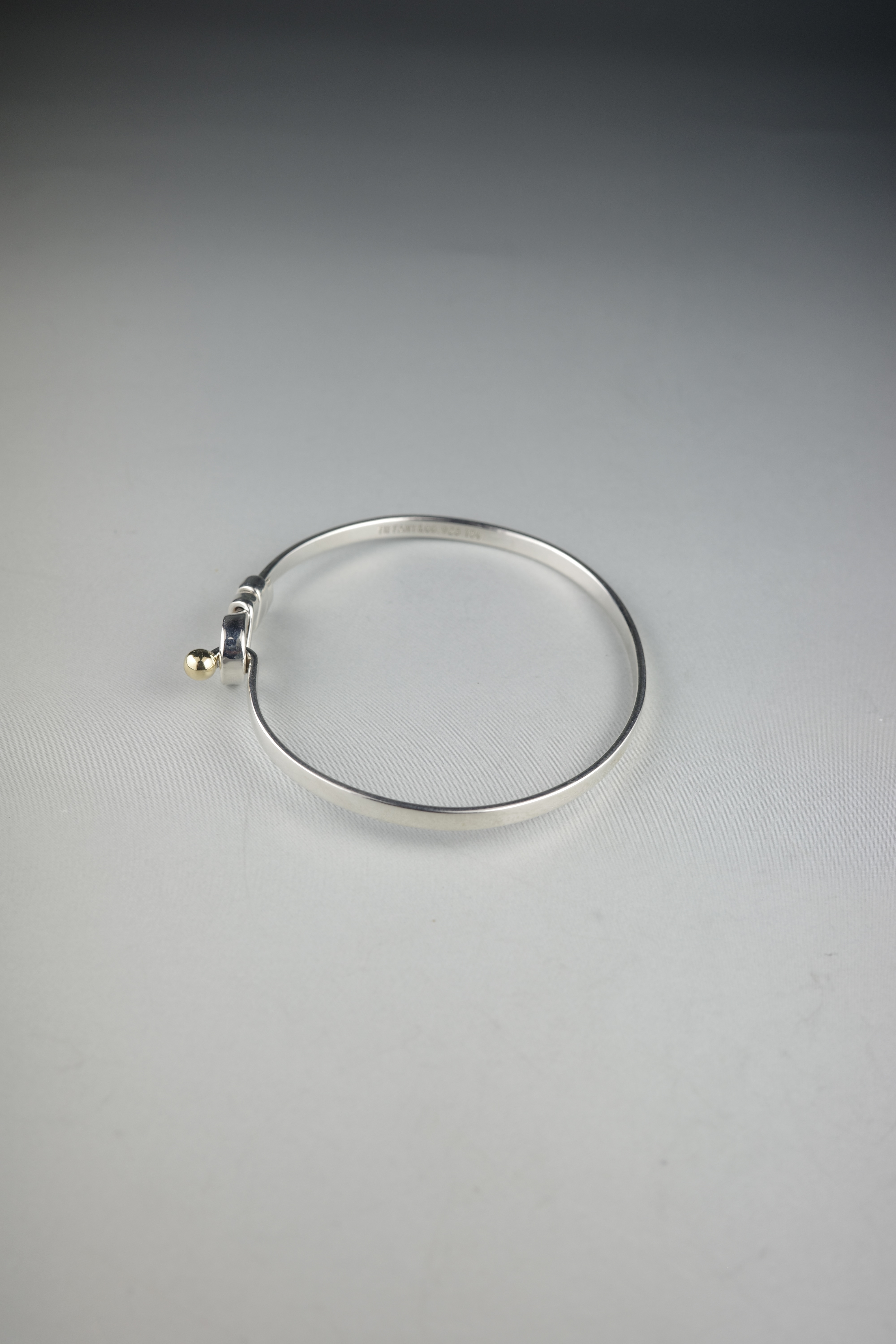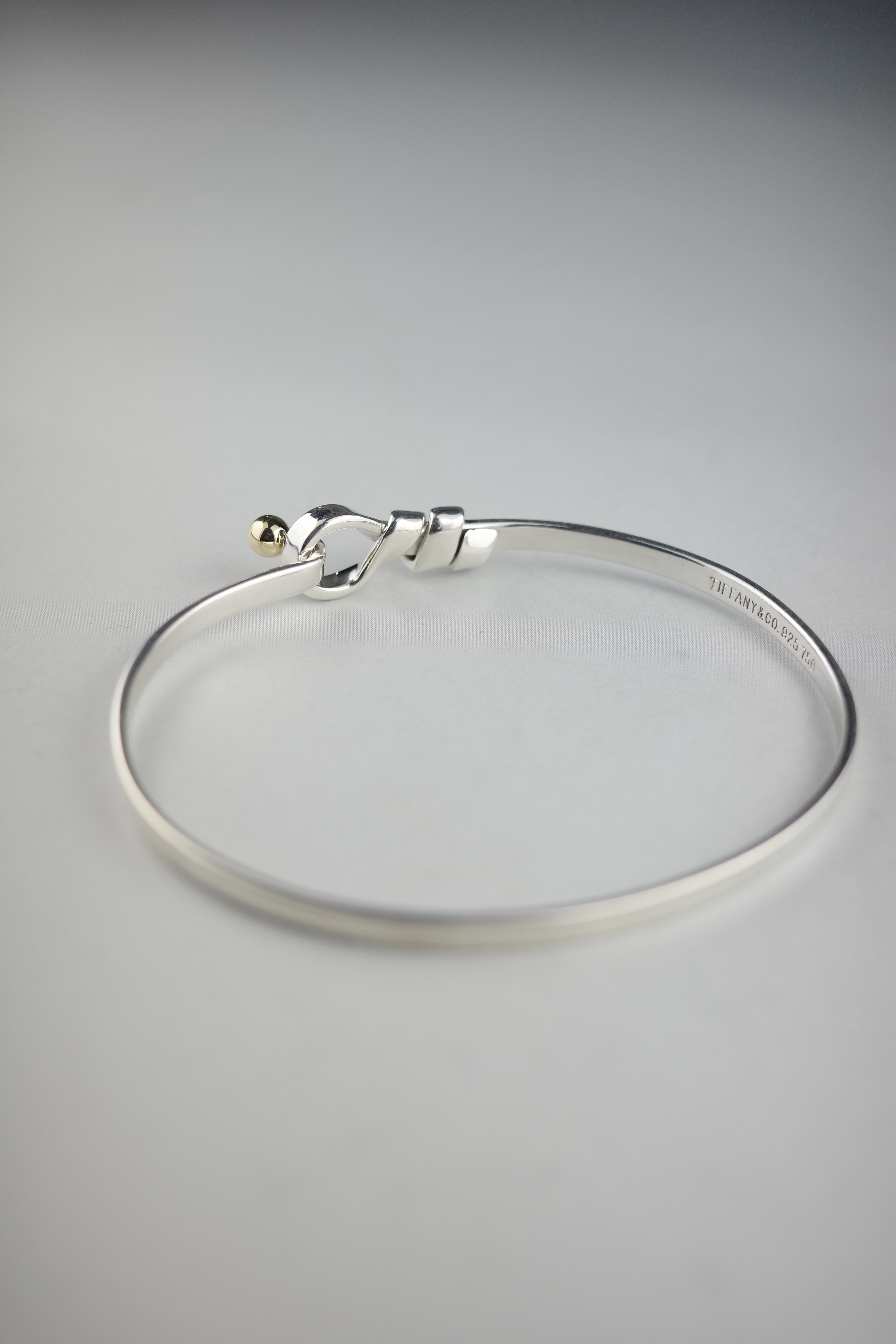 ティファニーを代表する名作「フック&アイ」コレクション。スターリングシルバーの端正なバングルに、ワンポイントであしらわれたゴールドボールが印象的なデザインです。無駄を削ぎ落としたミニマルなフォルムにフックモチーフの立体感、シルバーとゴールドのコンビネーションが、シンプルでありながら程よく個性を演出します。細身で洗練されたシルエットは、単体使いはもちろん、時計や他のブレスレットとの重ね付けにも好相性で使い勝手の良いアイテム。