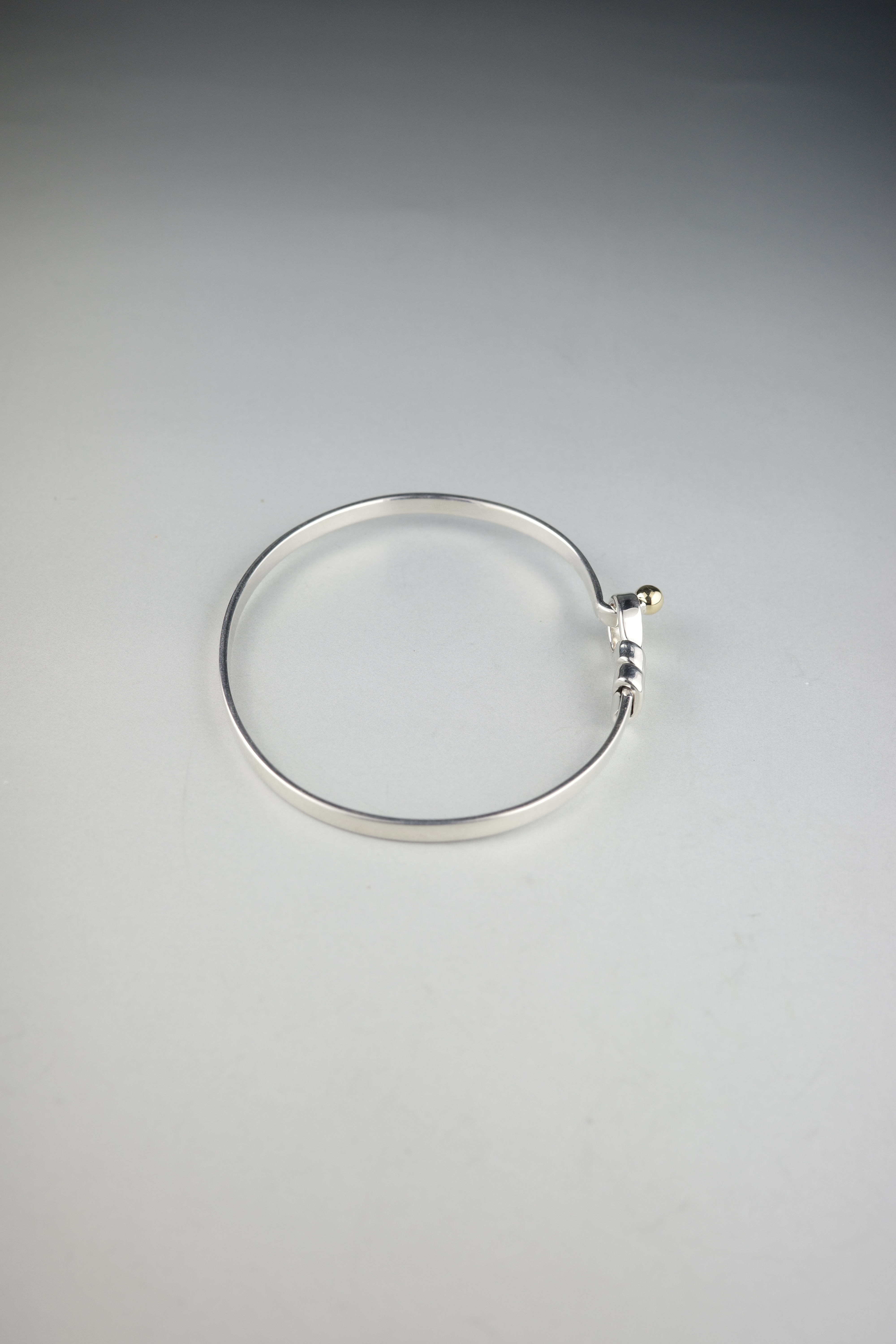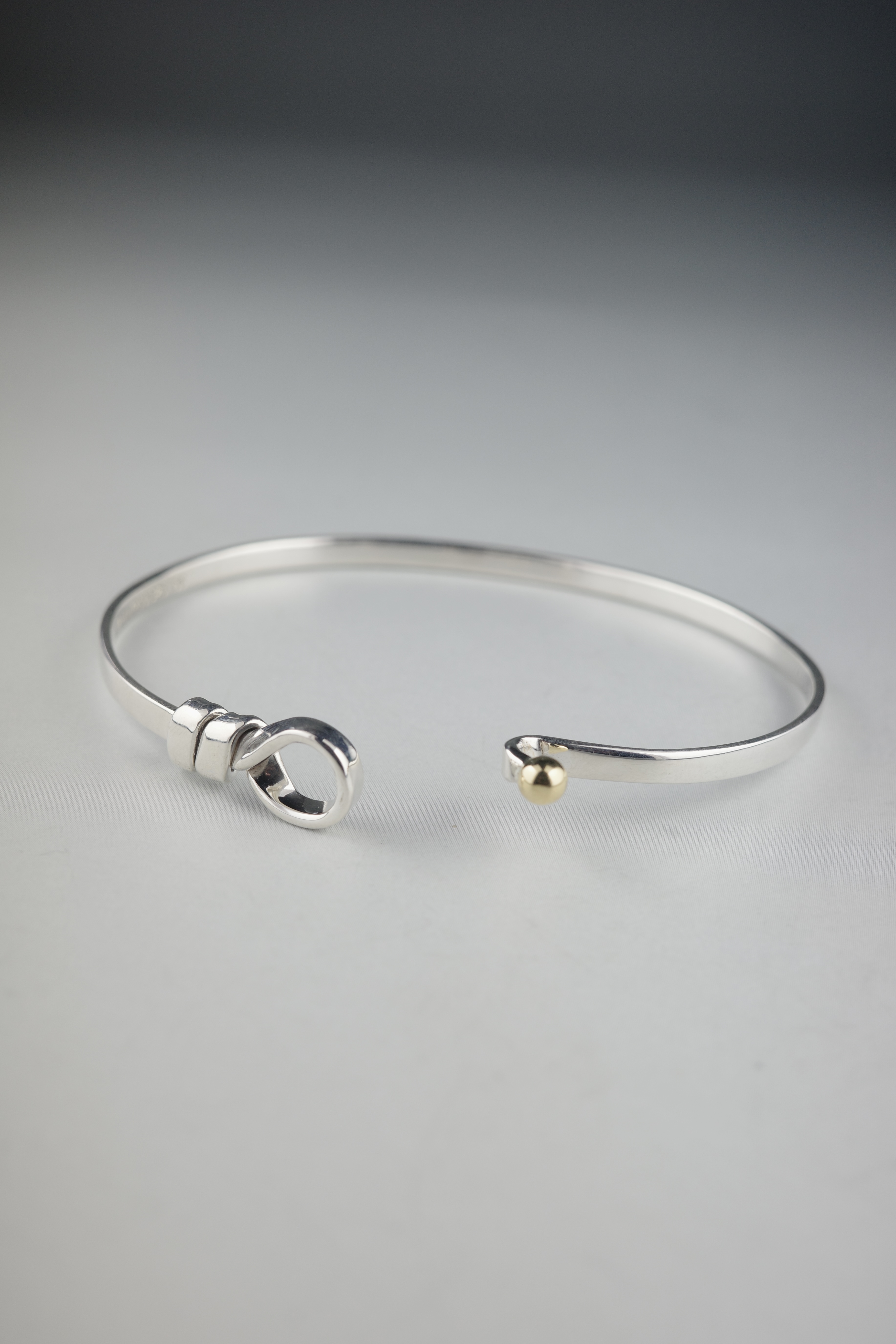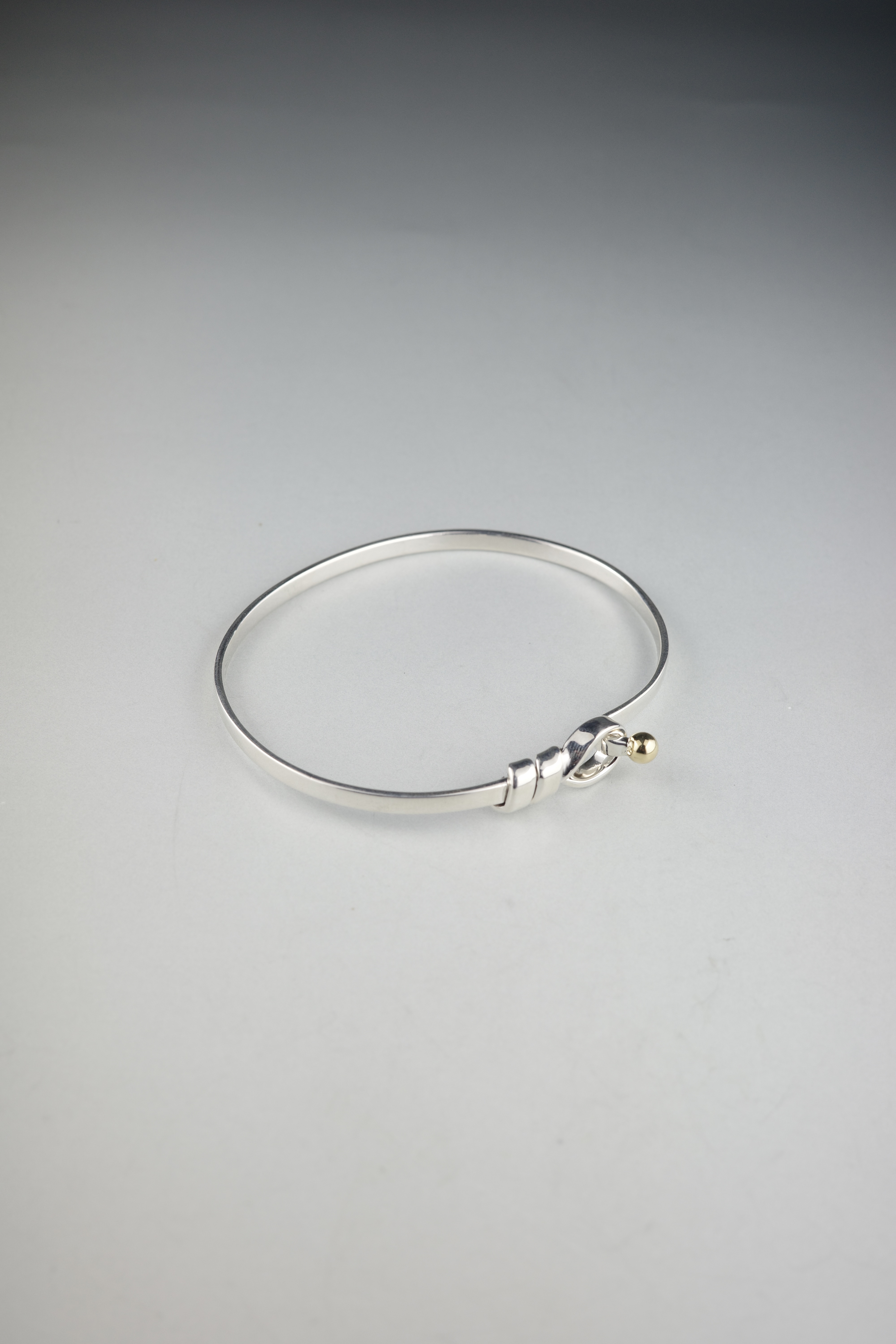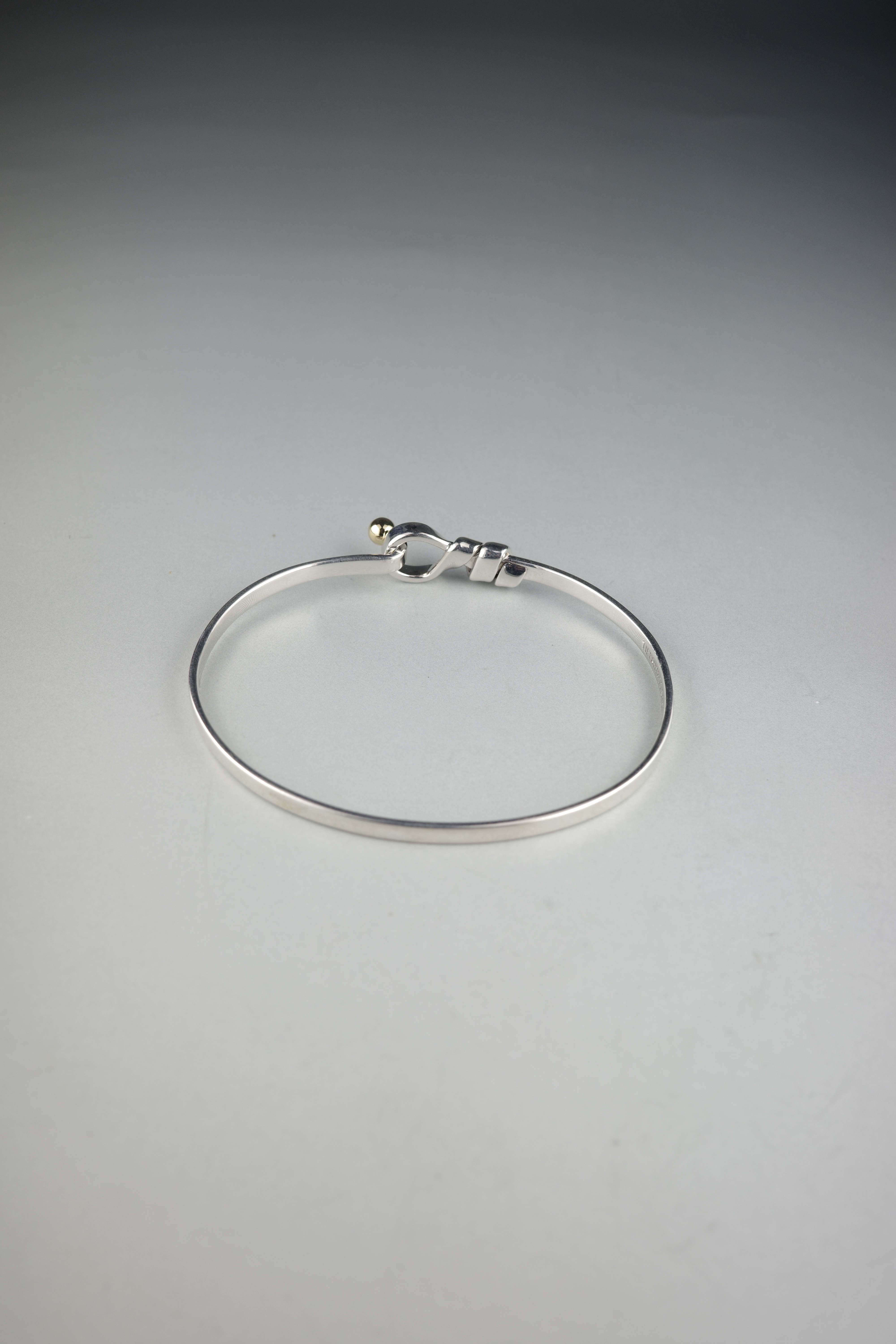 ティファニーを代表する名作「フック&アイ」コレクション。スターリングシルバーの端正なバングルに、ワンポイントであしらわれたゴールドボールが印象的なデザインです。無駄を削ぎ落としたミニマルなフォルムにフックモチーフの立体感、シルバーとゴールドのコンビネーションが、シンプルでありながら程よく個性を演出します。細身で洗練されたシルエットは、単体使いはもちろん、時計や他のブレスレットとの重ね付けにも好相性で使い勝手の良いアイテム。