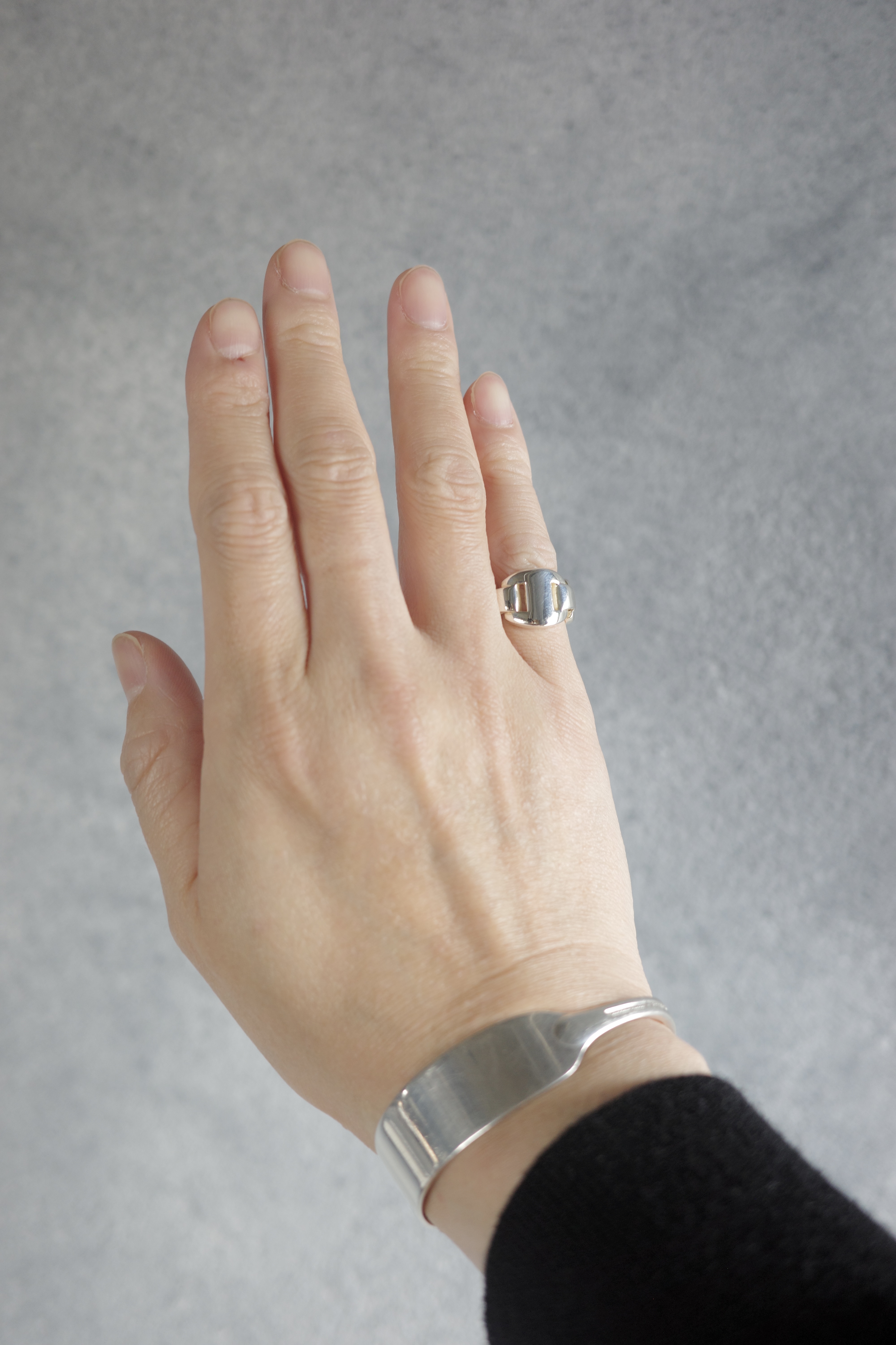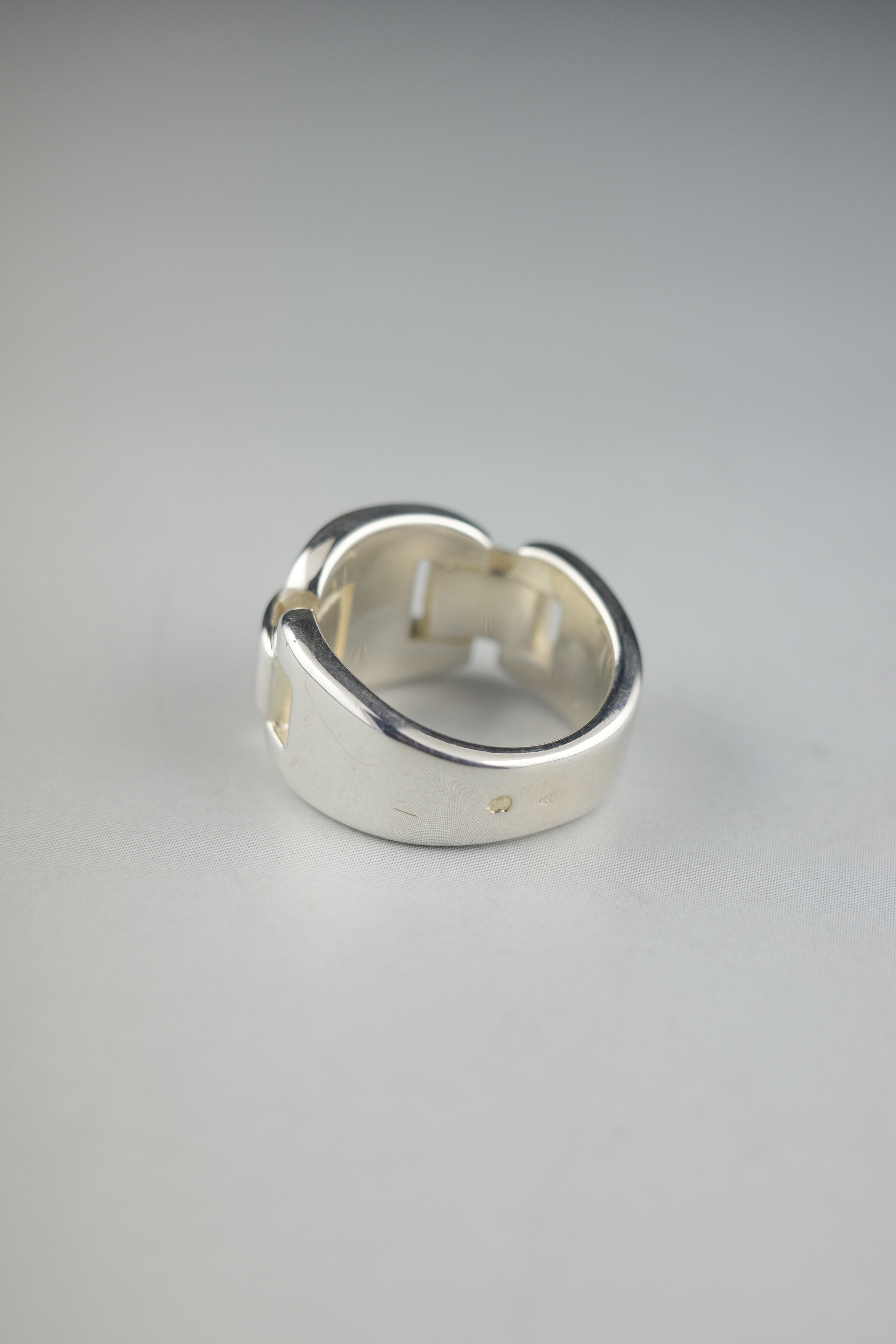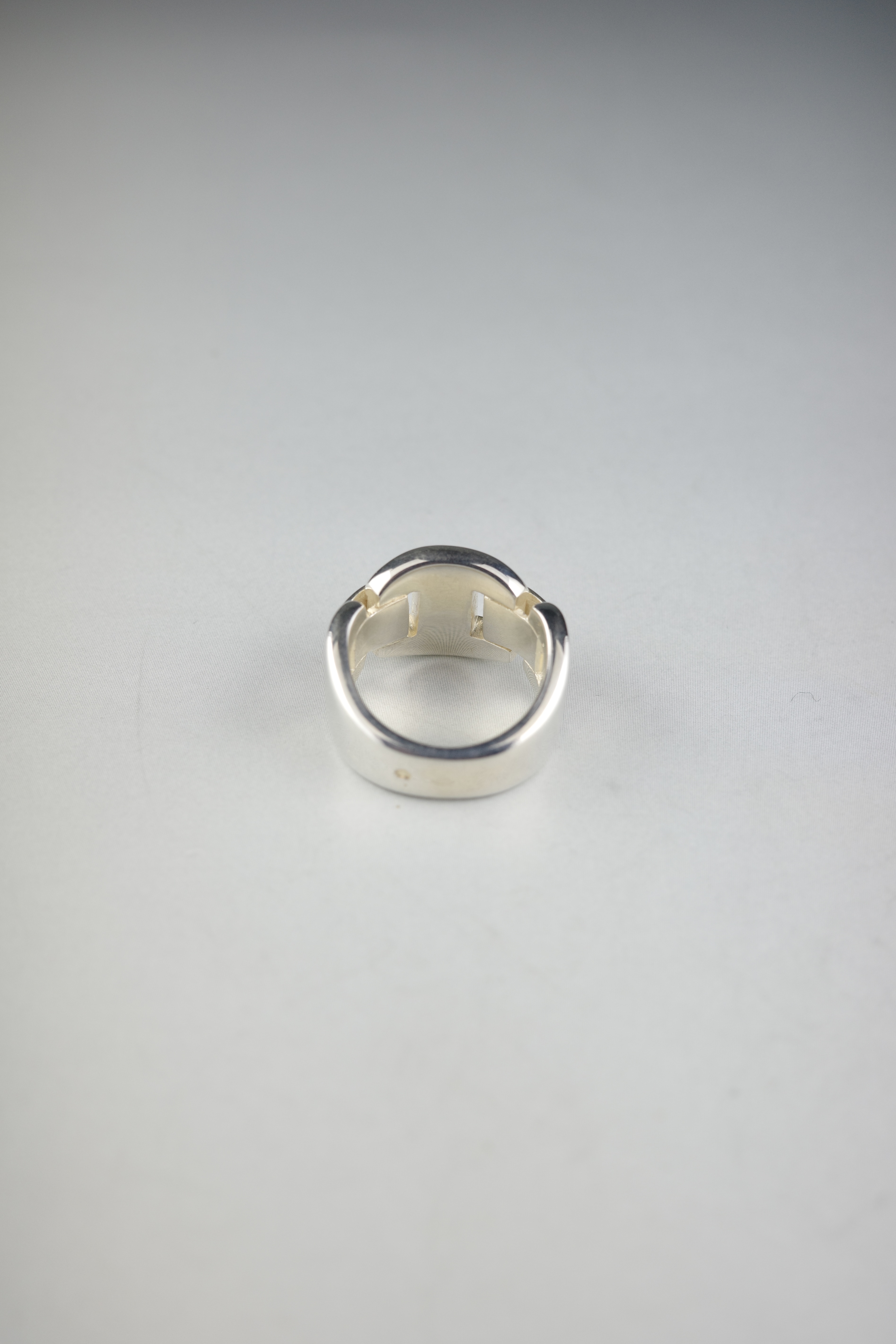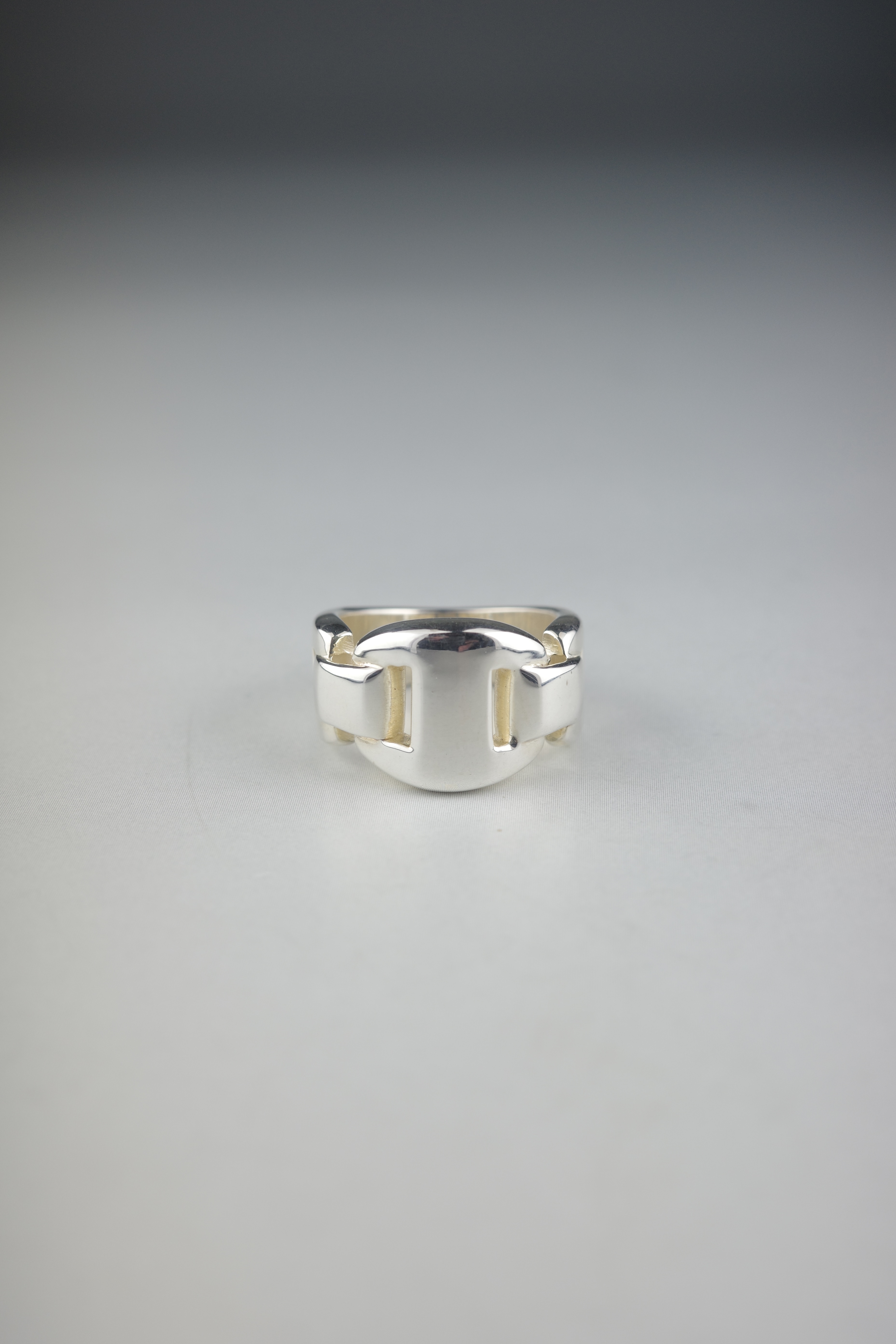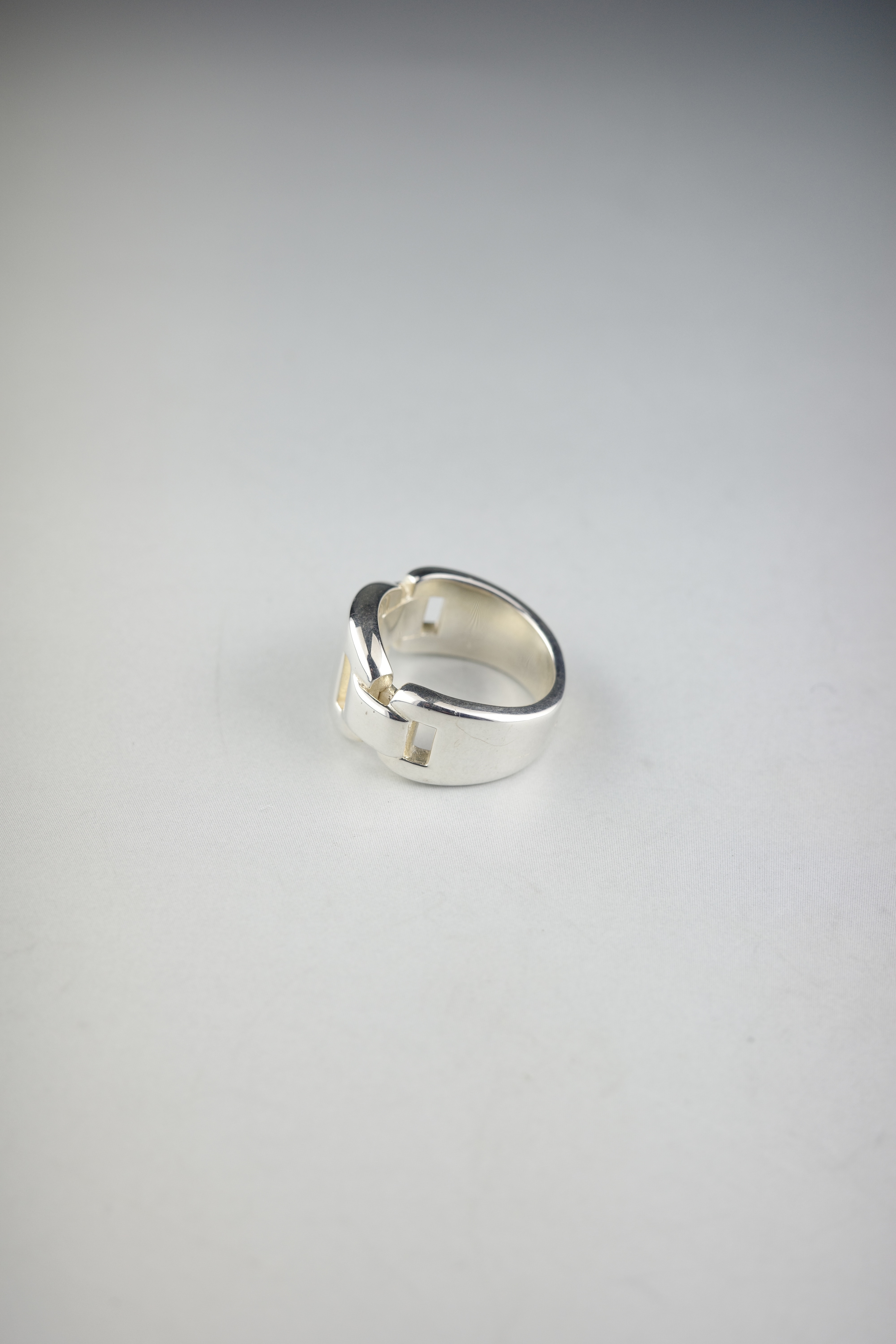 ギリシア神話に登場するエチオピアの王妃に由来する、ヴィンテージエルメスの「カシオペア」リング。エルメスを象徴する“H”モチーフのコマを連ね、まるでバックルのように構築されたデザインが特徴的。程よいボリューム感と、シルバー特有の重厚な存在感を持ちながらも、直線的で無駄のない造形により、無骨さの中に洗練された上品さを感じさせるアイテム。