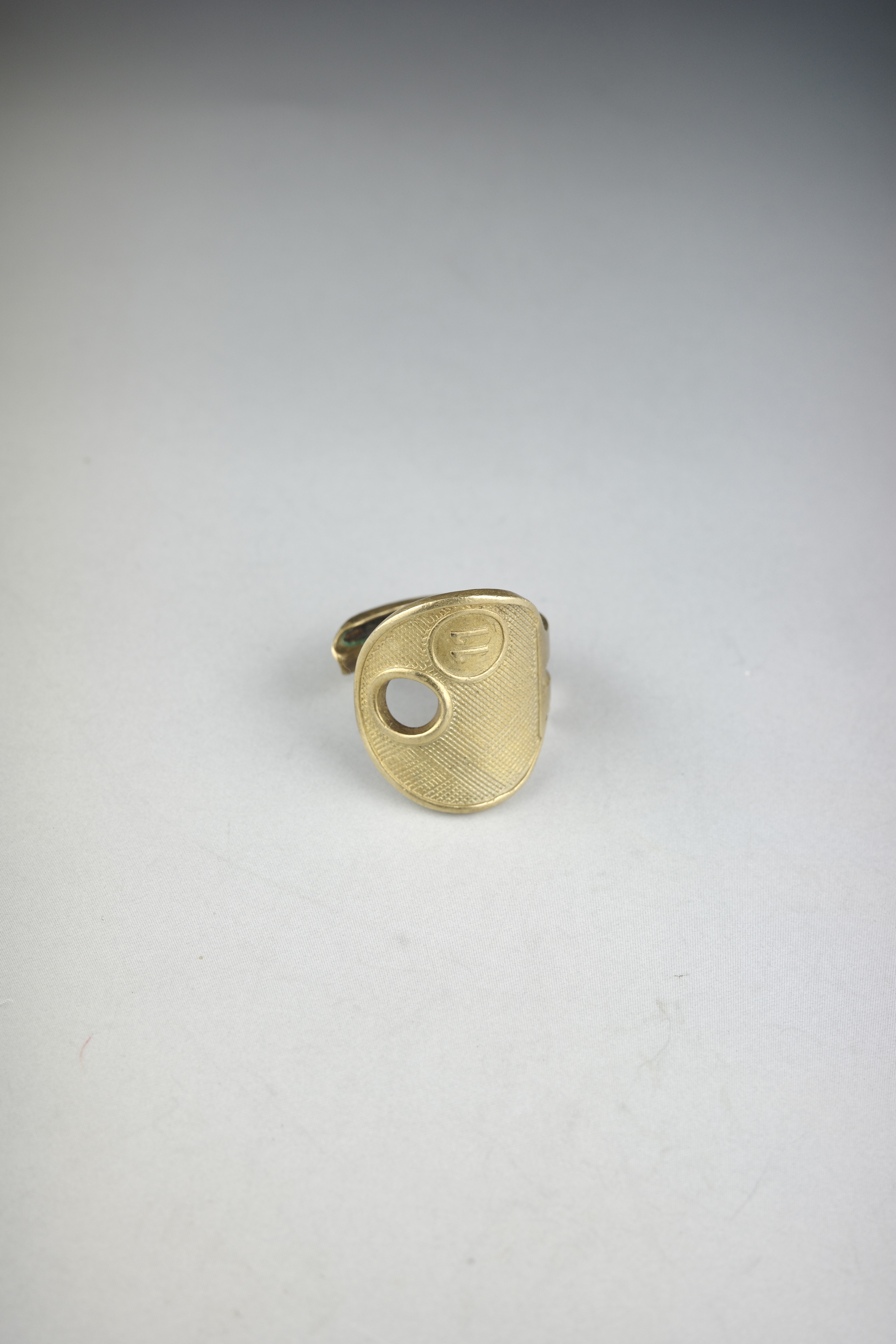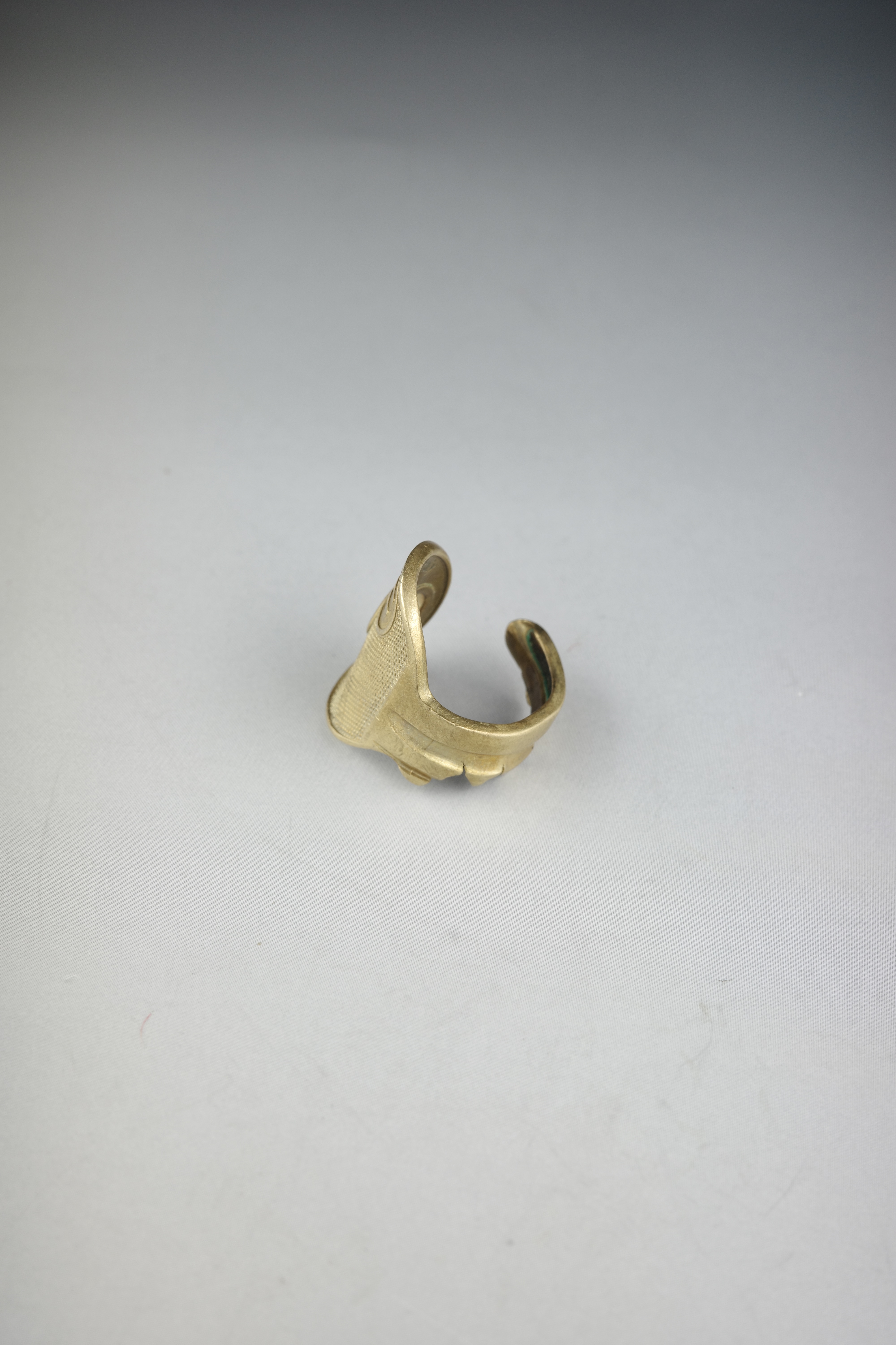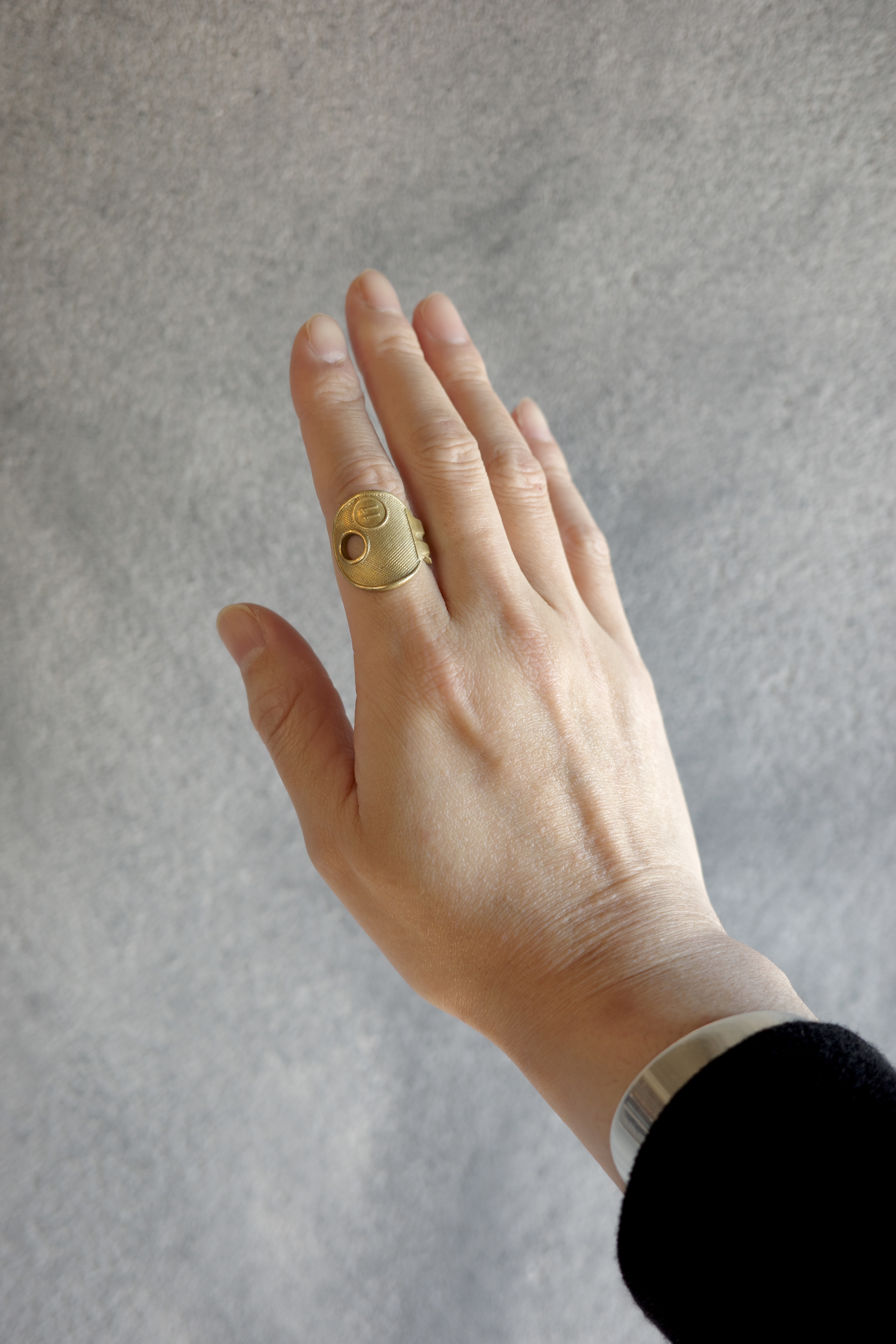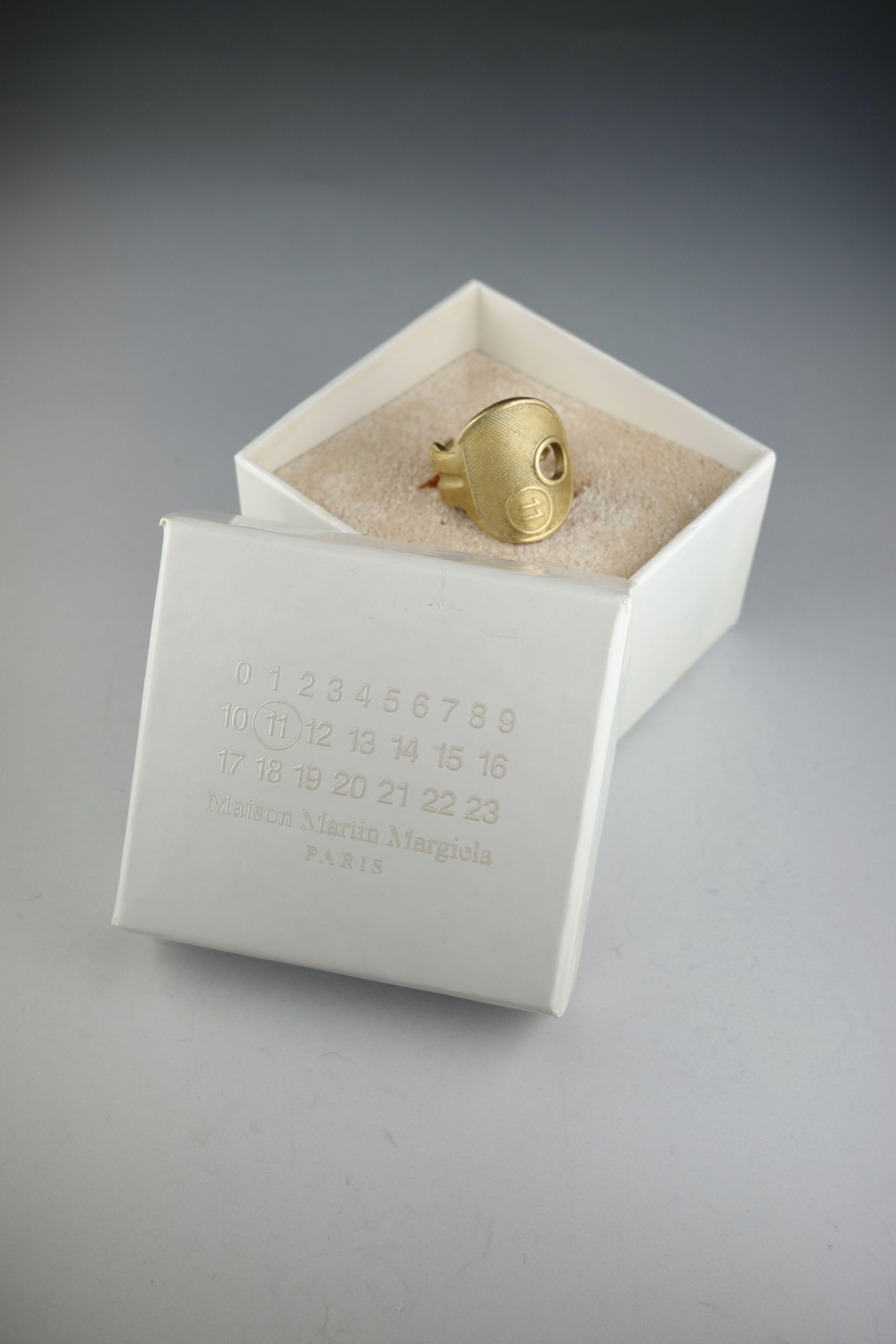 鍵そのものを大胆に曲げ、リングへと昇華させたMaison Martin Margielaのキー・モチーフリング。実在する日用品をジュエリーとして再構築する、マルジェラらしいコンセプチュアルなアプローチが感じられるデザインです。鍵のヘッド部分をトップに据え、シャフト部分をそのまま曲げてリングへと形成したユニークな造形。表面には細かなテクスチャー加工が施されており、真鍮特有の温かみあるゴールドトーンと相まって、ヴィンテージライクな雰囲気を演出しています。トップにはMaison Martin Margielaを象徴するナンバリングモチーフがあしらわれており、「11」はジュエリーラインを示す番号。ブランドの世界観を象徴するアイコニックなディテールとして、さりげないアクセントとなっています。