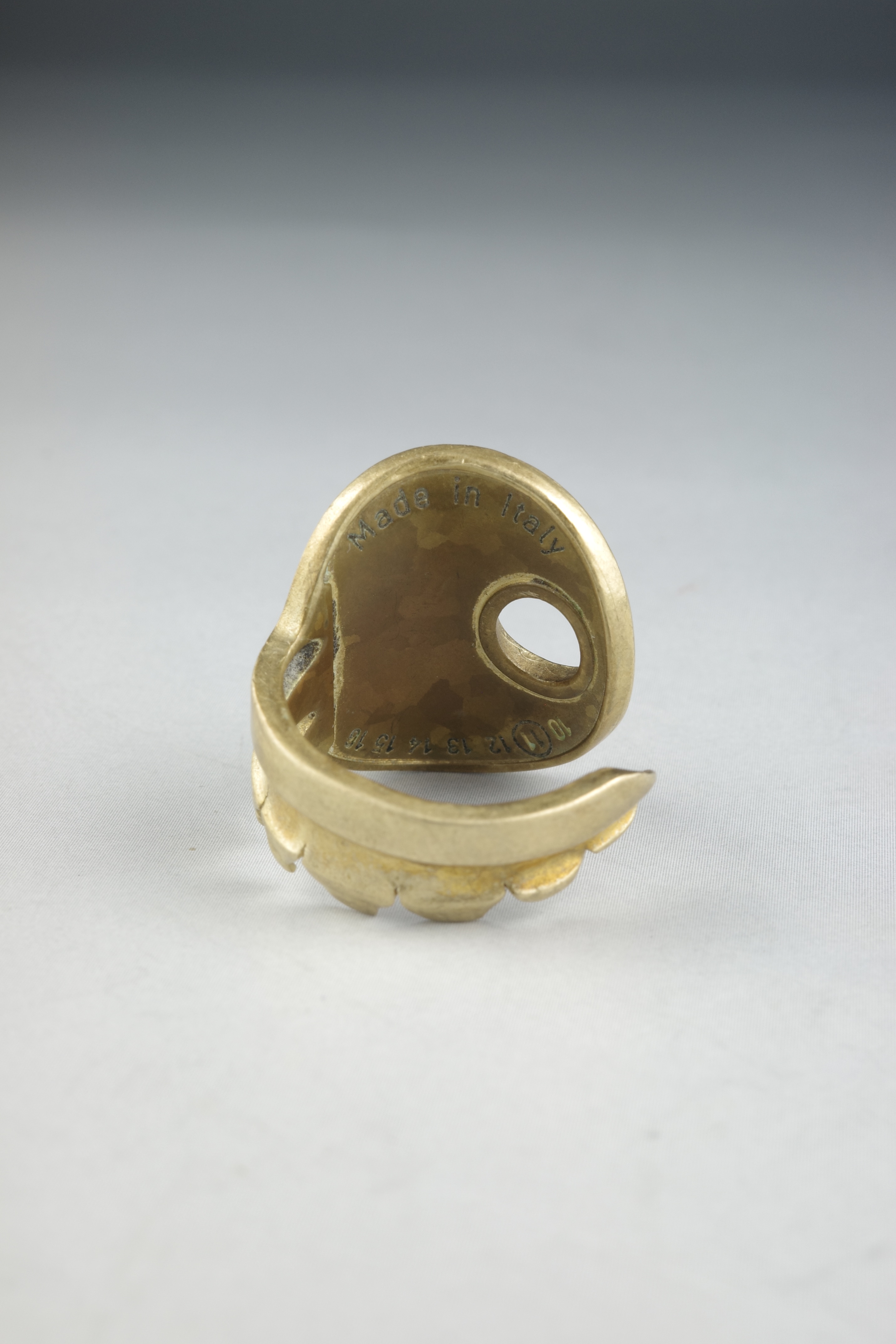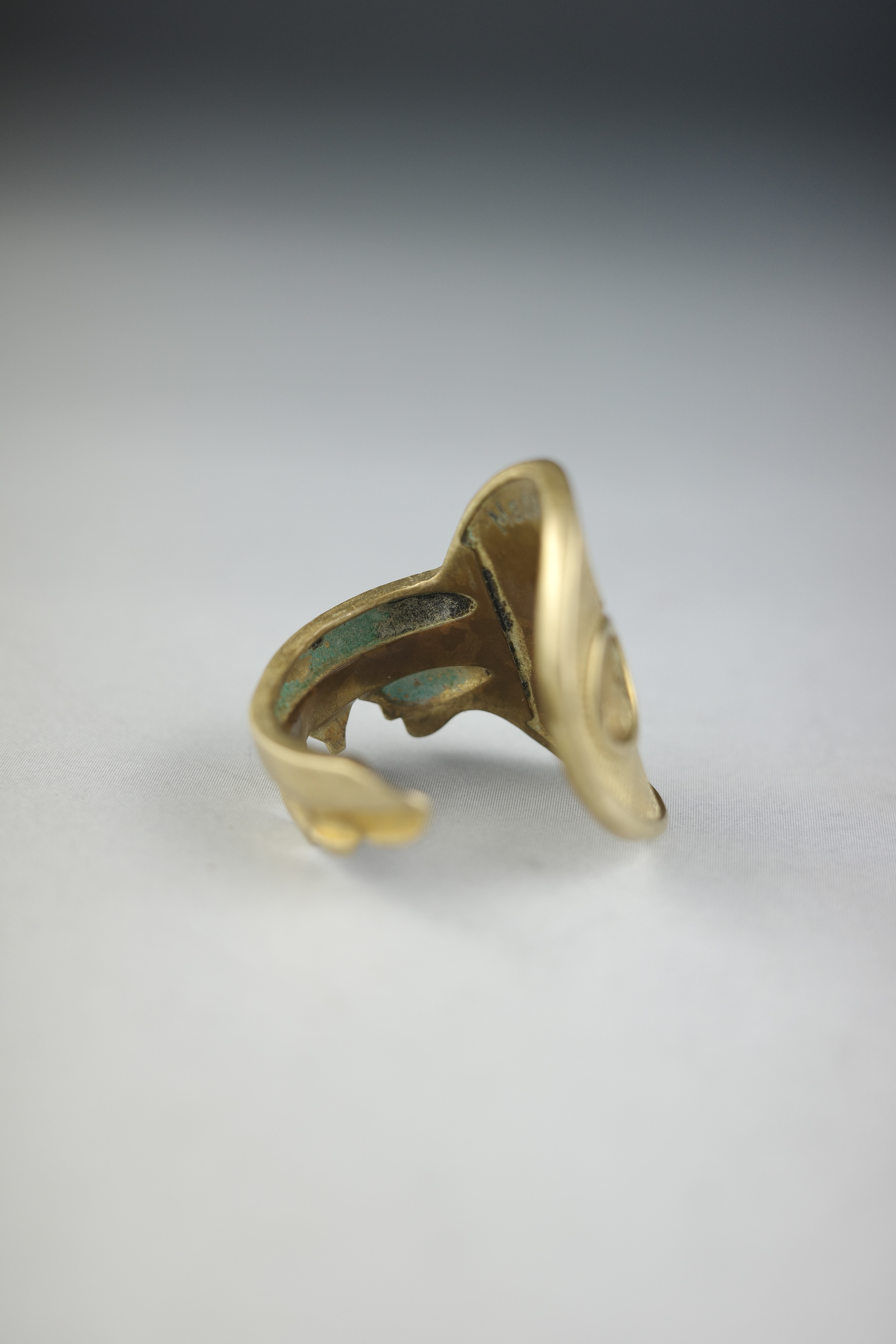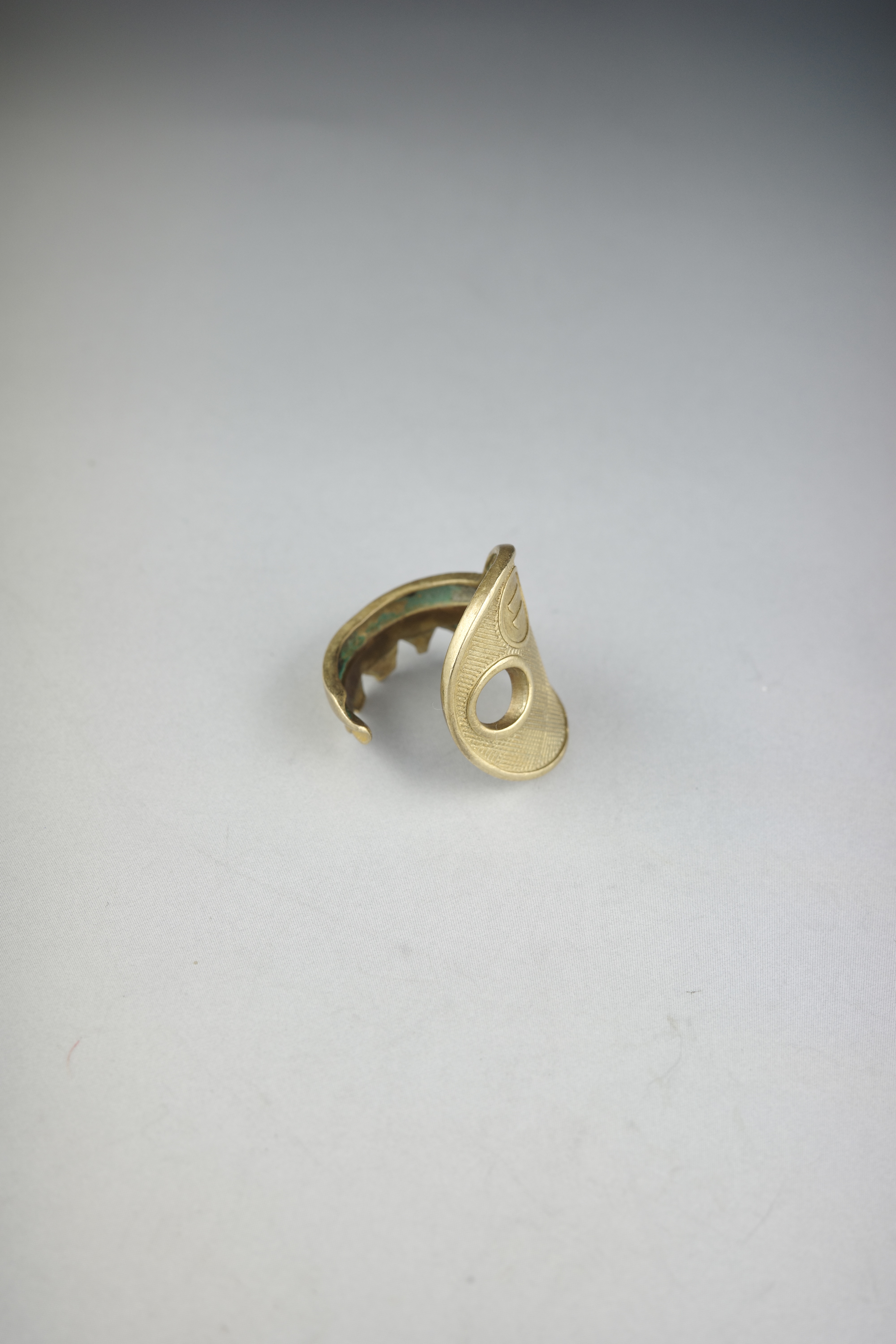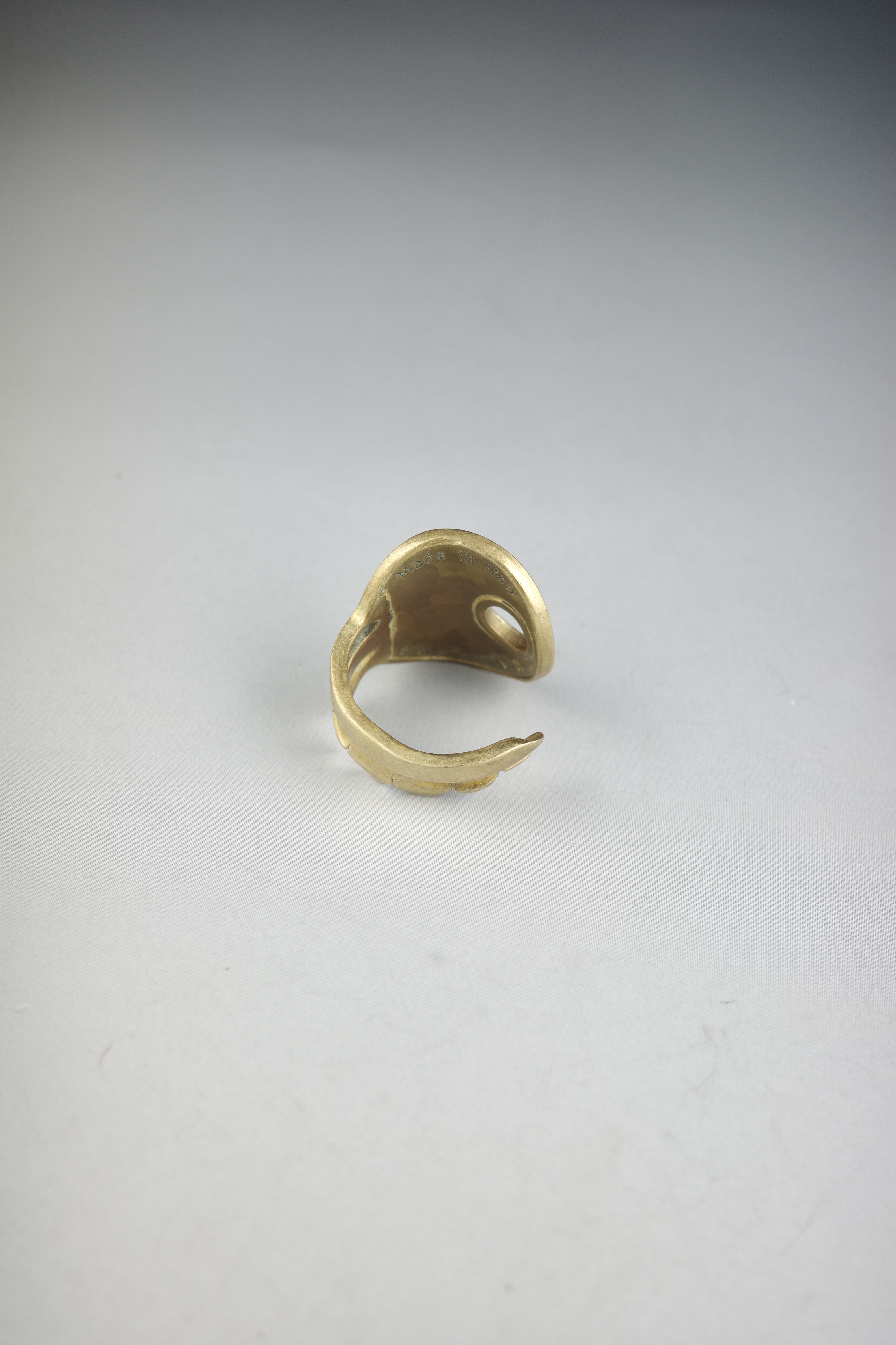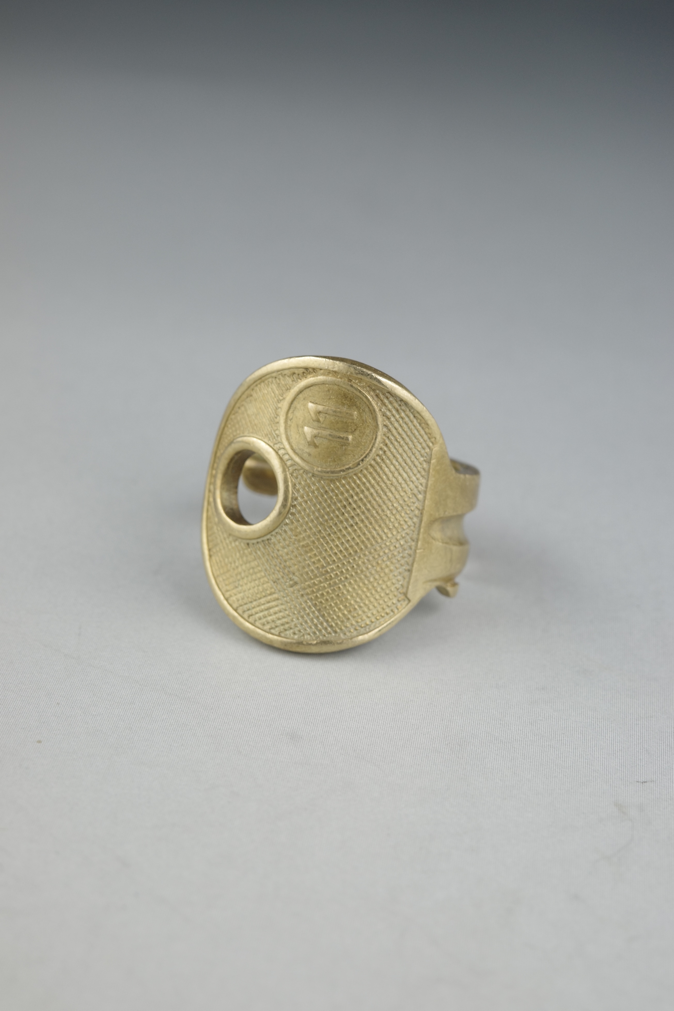 鍵そのものを大胆に曲げ、リングへと昇華させたMaison Martin Margielaのキー・モチーフリング。実在する日用品をジュエリーとして再構築する、マルジェラらしいコンセプチュアルなアプローチが感じられるデザインです。鍵のヘッド部分をトップに据え、シャフト部分をそのまま曲げてリングへと形成したユニークな造形。表面には細かなテクスチャー加工が施されており、真鍮特有の温かみあるゴールドトーンと相まって、ヴィンテージライクな雰囲気を演出しています。トップにはMaison Martin Margielaを象徴するナンバリングモチーフがあしらわれており、「11」はジュエリーラインを示す番号。ブランドの世界観を象徴するアイコニックなディテールとして、さりげないアクセントとなっています。