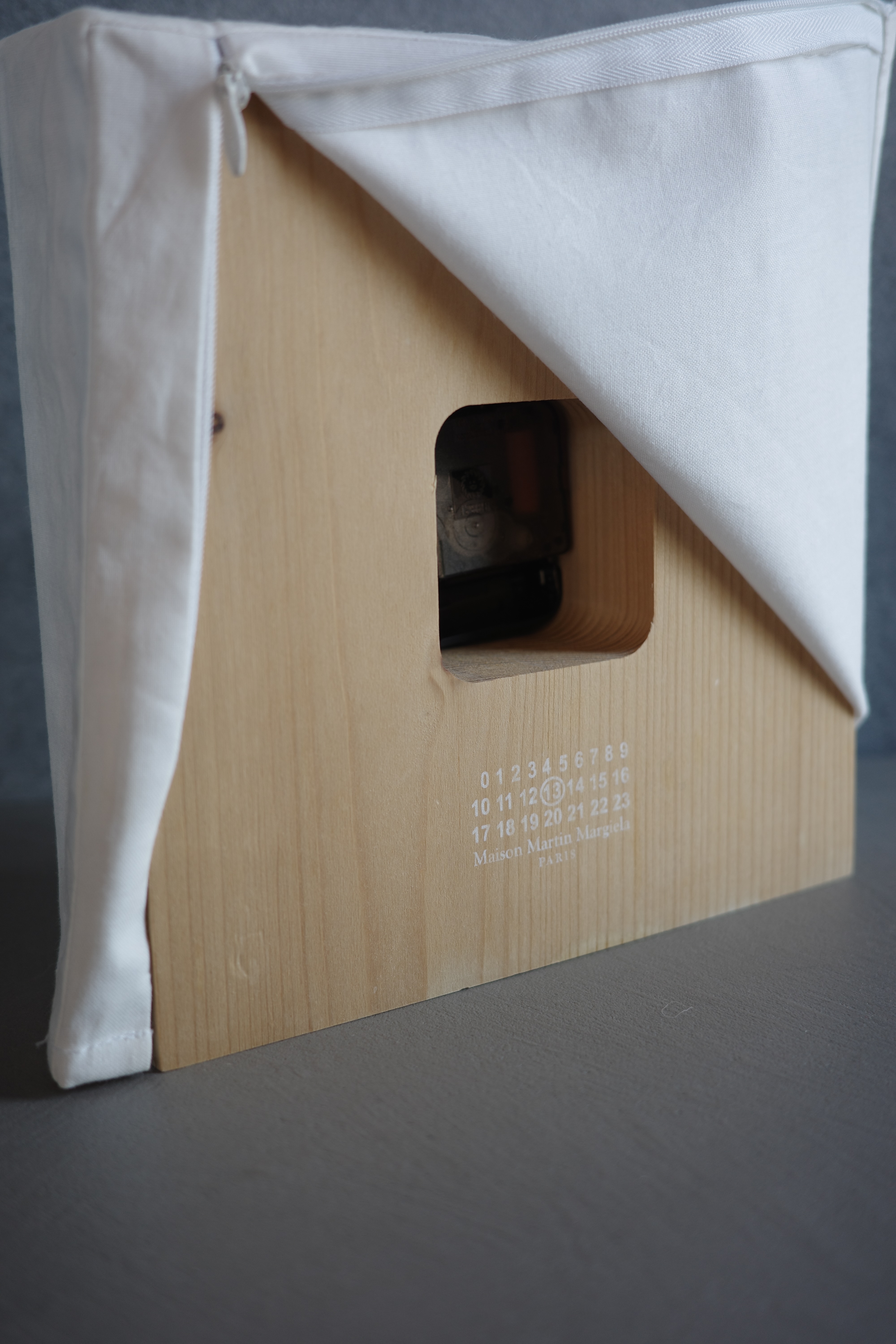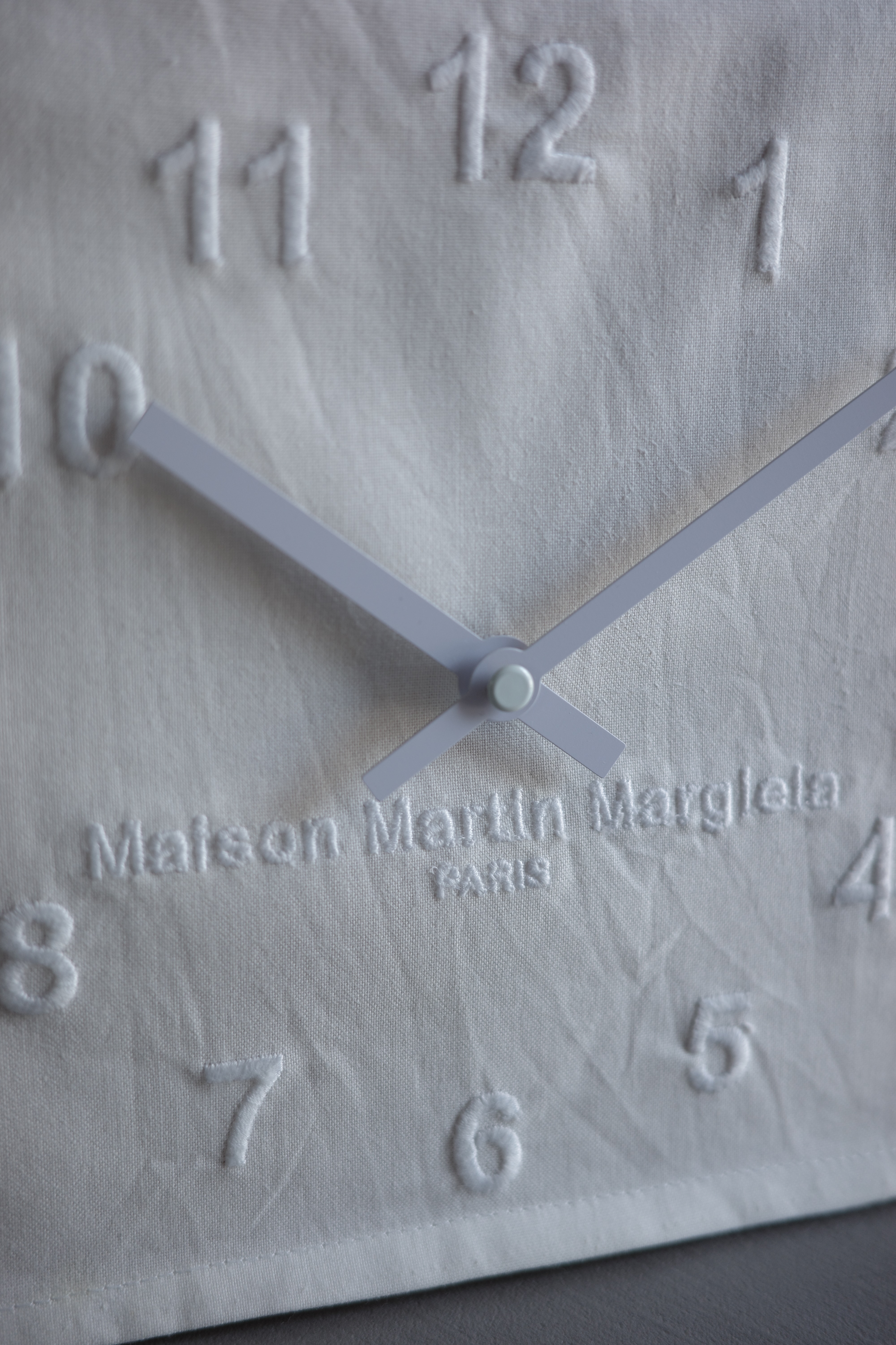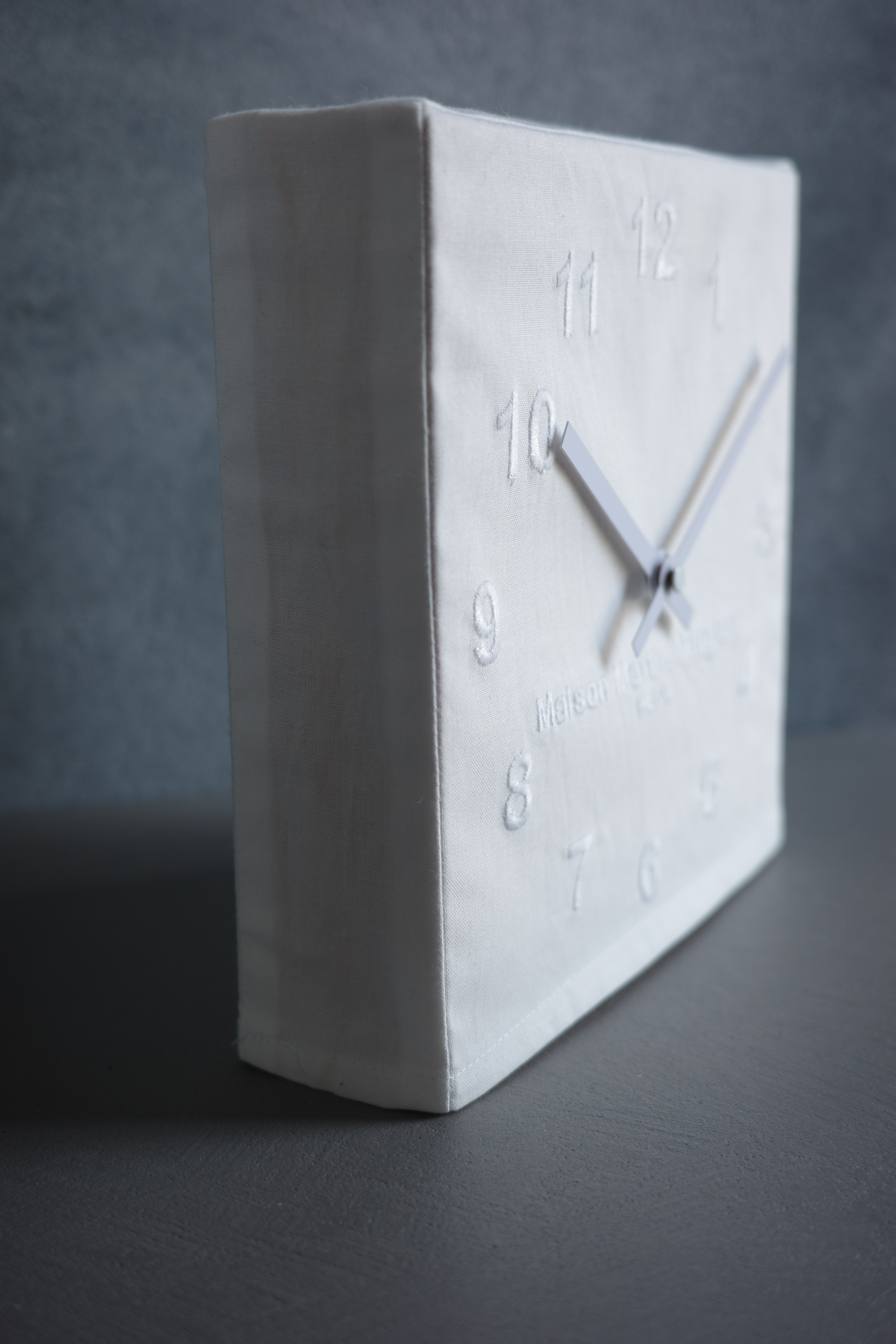 Maison Martin Margielaのライン‘13’ 「オブジェと出版物のコレクション」のアーカイヴピース。土台にはパイン材が使用されており、覆われている布地にはMaison Martin Margielaロゴと文字盤が刺繍されています。オールホワイトで統一された当時のマルジェラらしいアイテム。