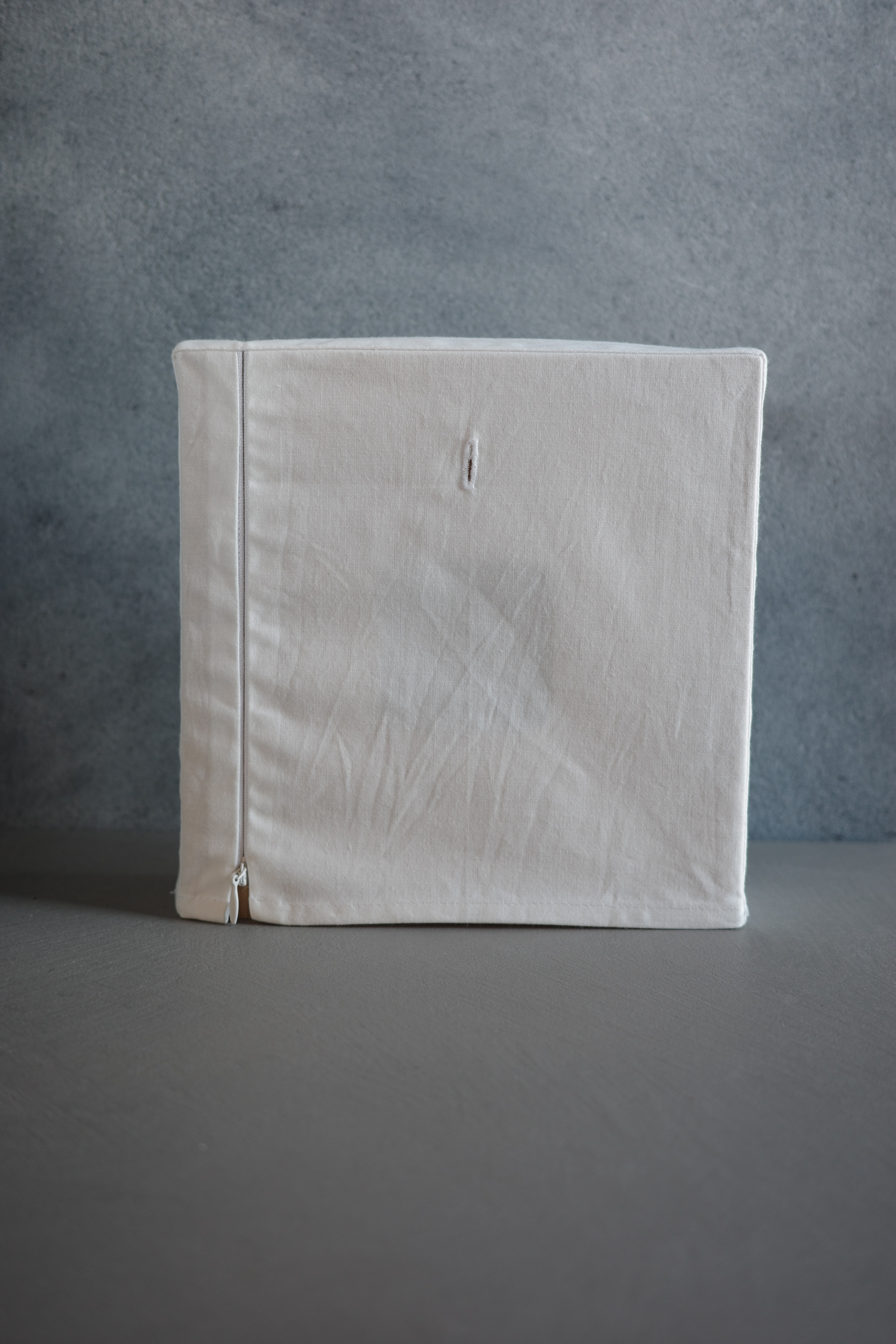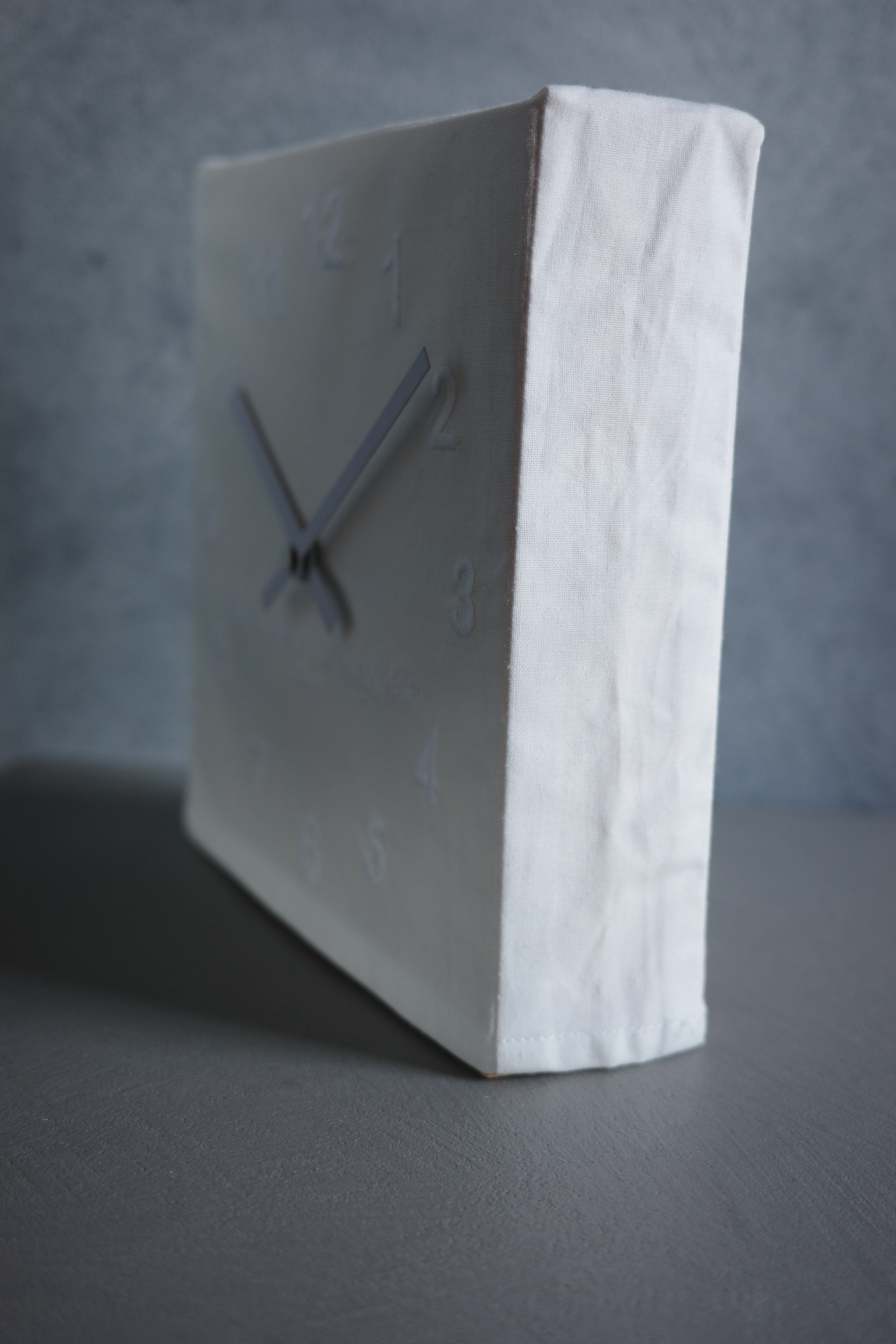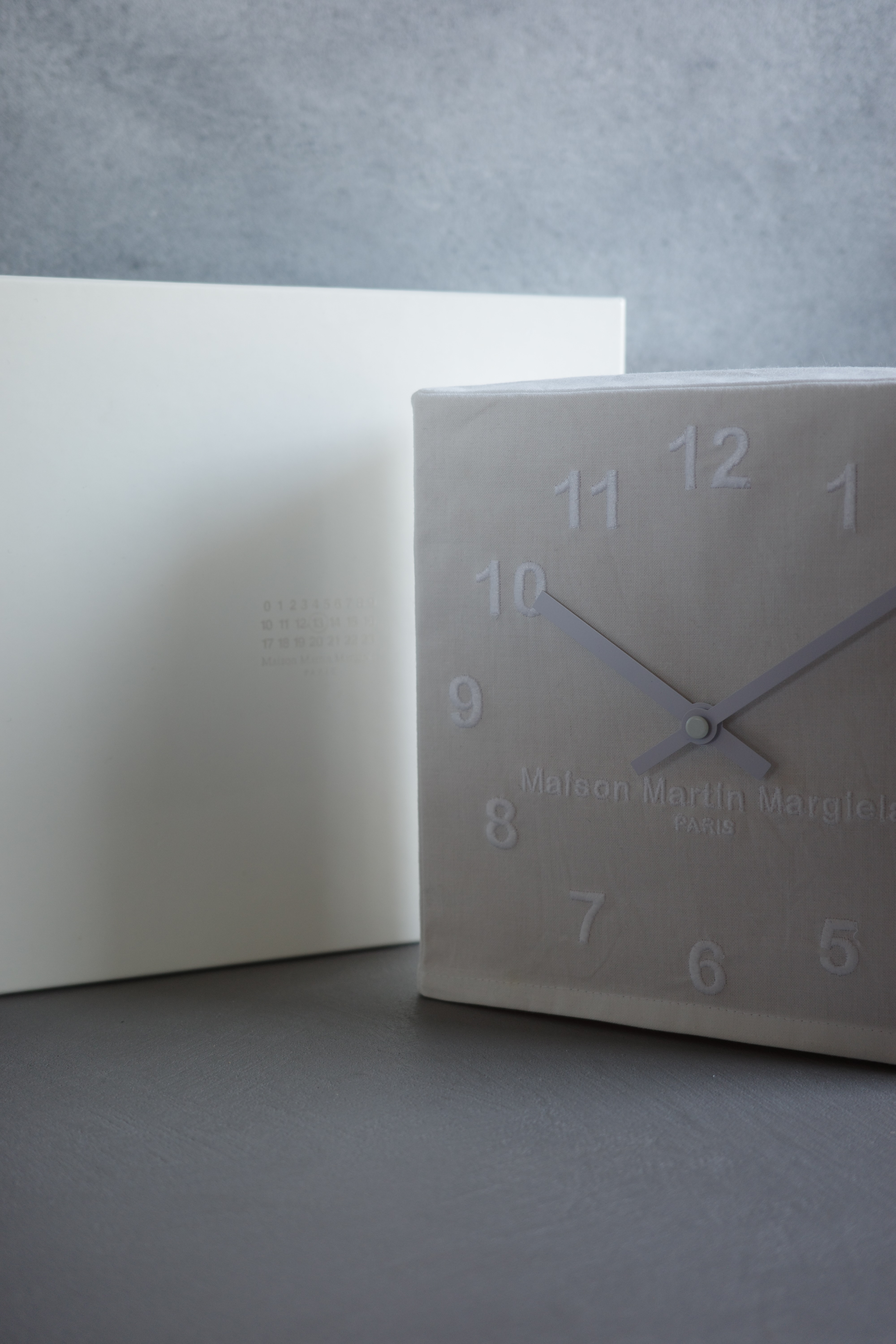Maison Martin Margielaのライン‘13’ 「オブジェと出版物のコレクション」のアーカイヴピース。土台にはパイン材が使用されており、覆われている布地にはMaison Martin Margielaロゴと文字盤が刺繍されています。オールホワイトで統一された当時のマルジェラらしいアイテム。