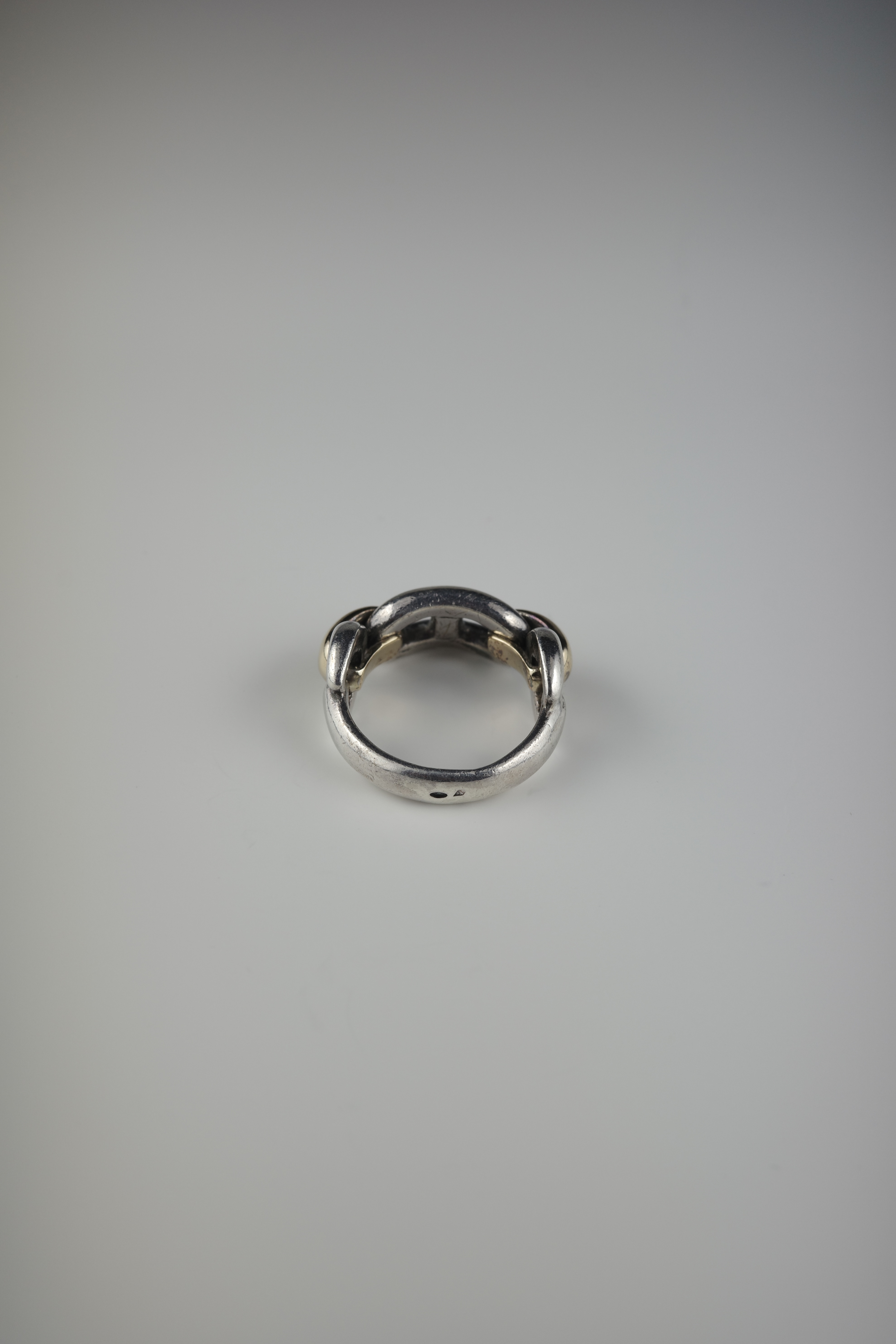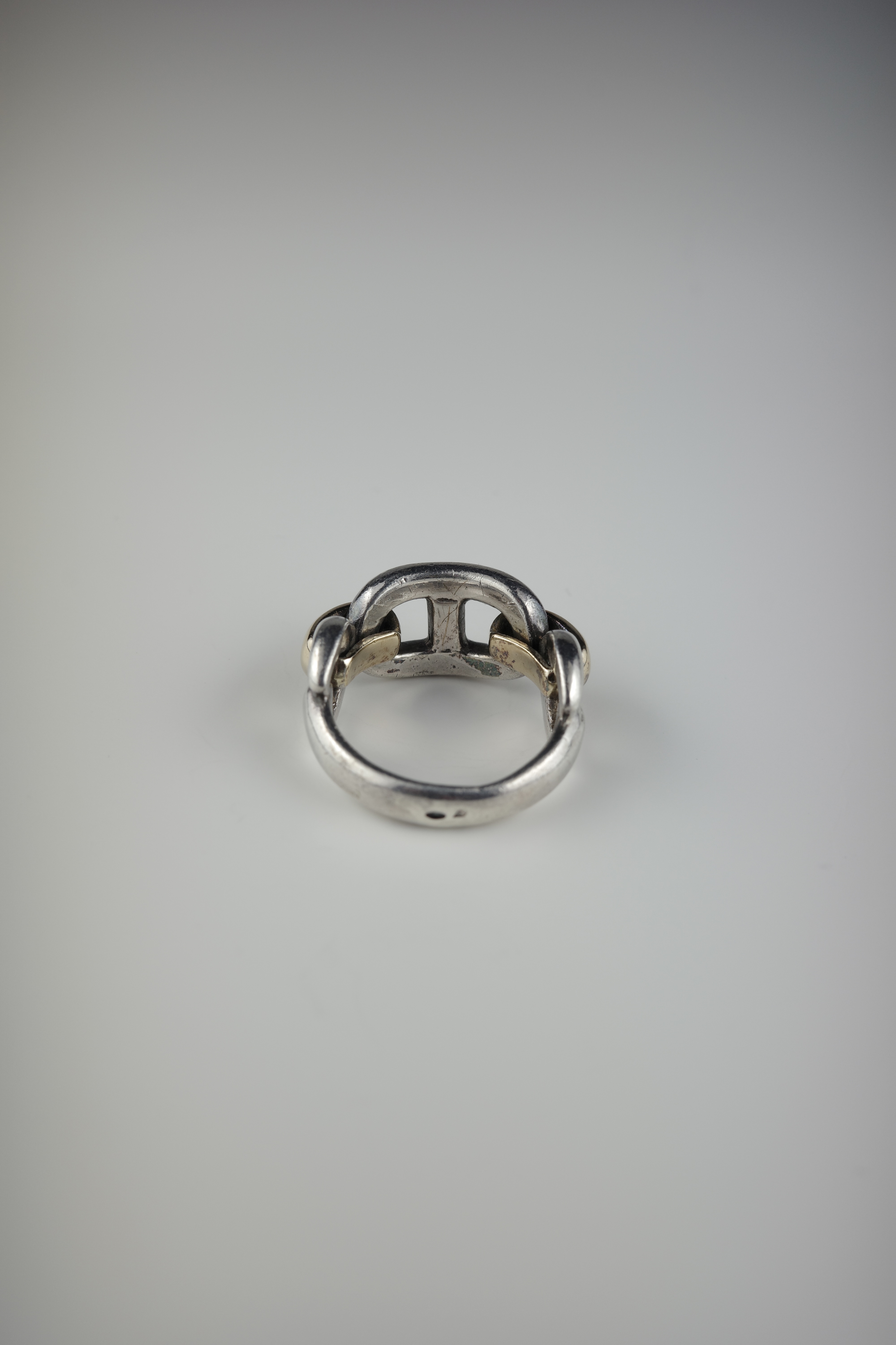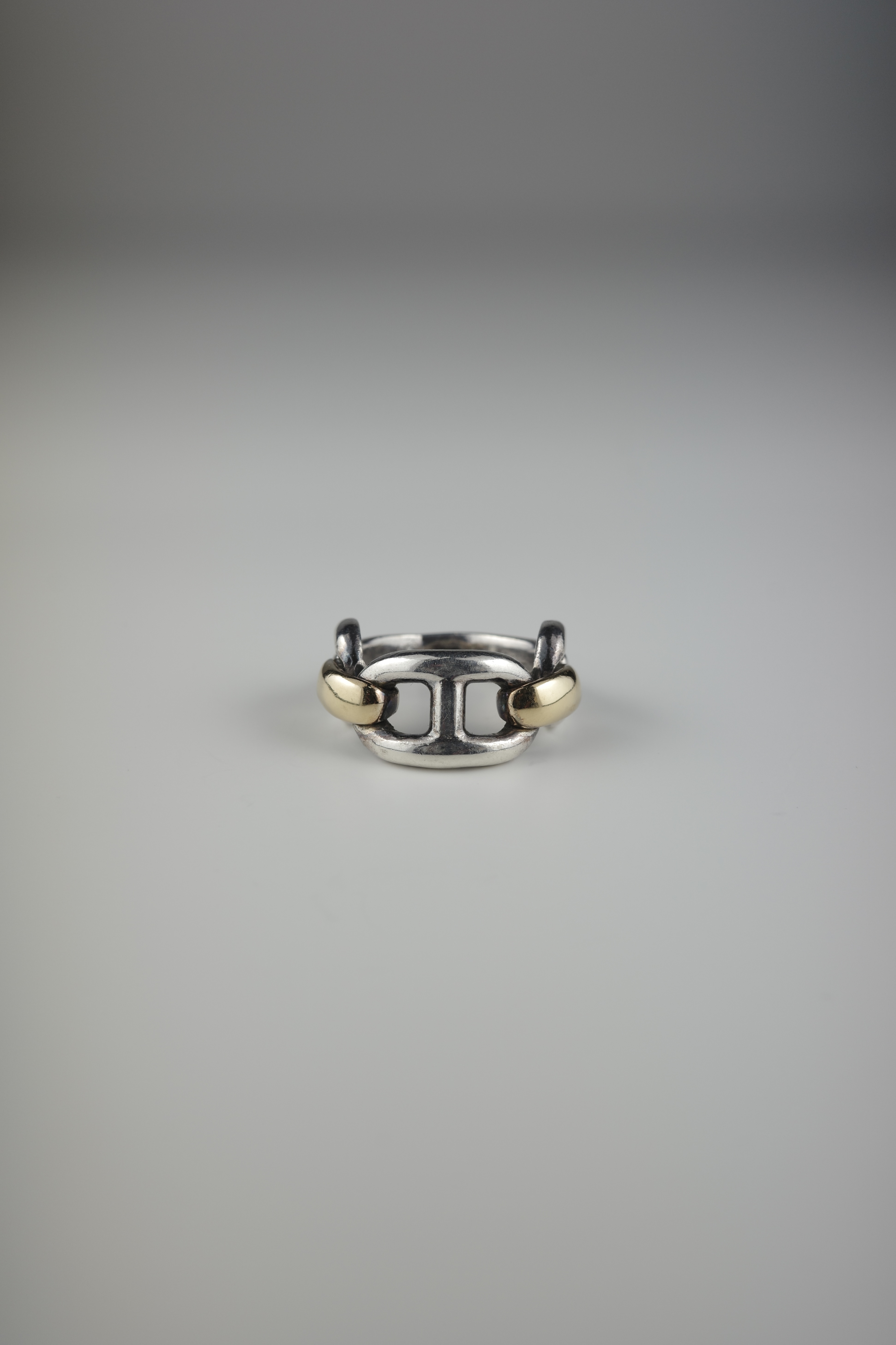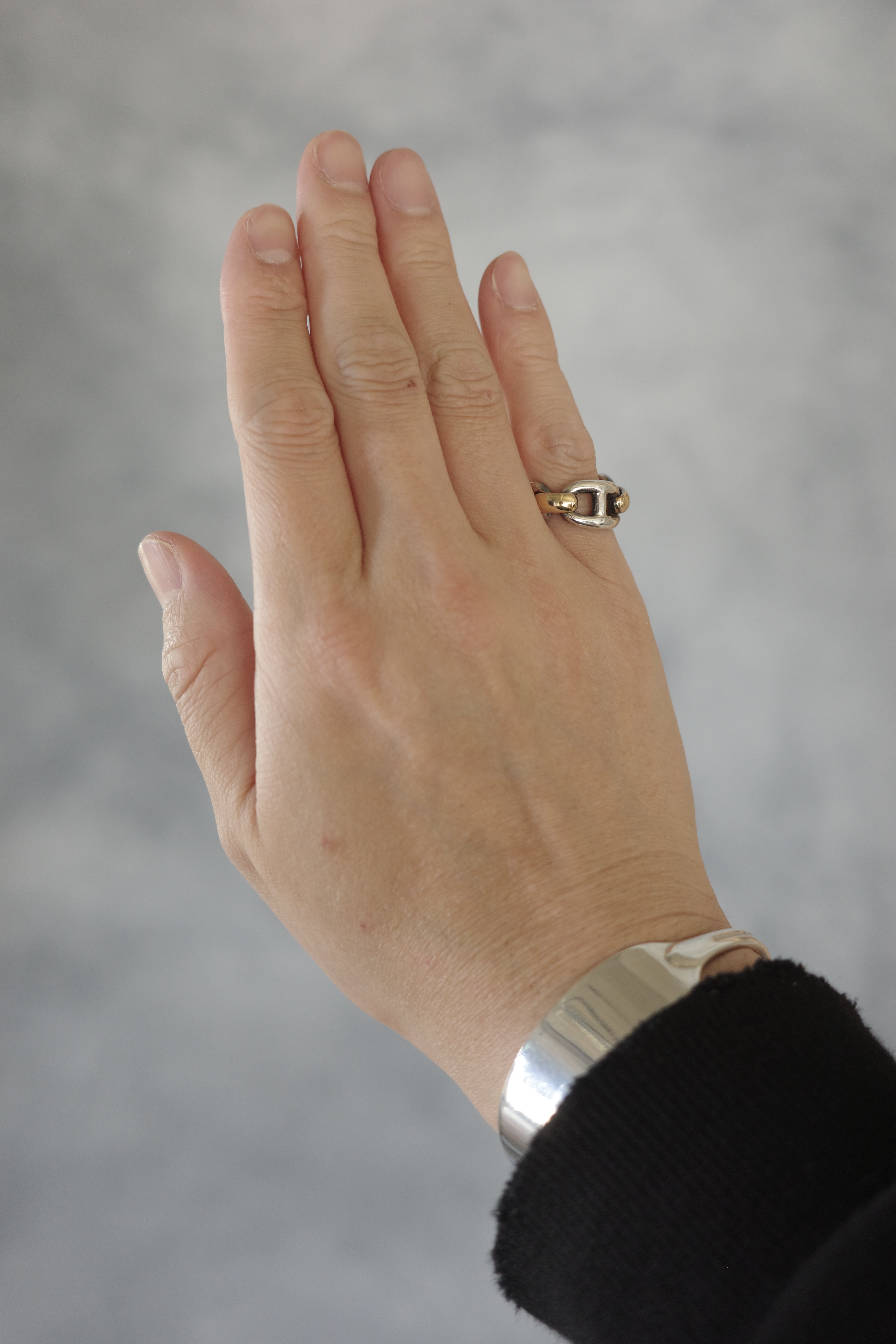 1938年の誕生以来、エルメスを象徴するアイコニックなデザイン「シェーヌダンクル」。その美しいチェーンリンクをそのまま指輪に落とし込んだ、希少な3連コンビリング。重厚感のあるシルバー925のリンクに、18Kイエローゴールドのアクセントを加えることで、クラシックでありながらもモダンな印象を併せ持つ逸品。シンプルなシェーヌダンクルリングとは異なり、ゴールドとのコンビネーションが放つ存在感は、装いにラグジュアリーな彩りを添えます。現在では製造されていないヴィンテージモデルのため、コレクターズアイテムとしても非常に価値の高いリング。