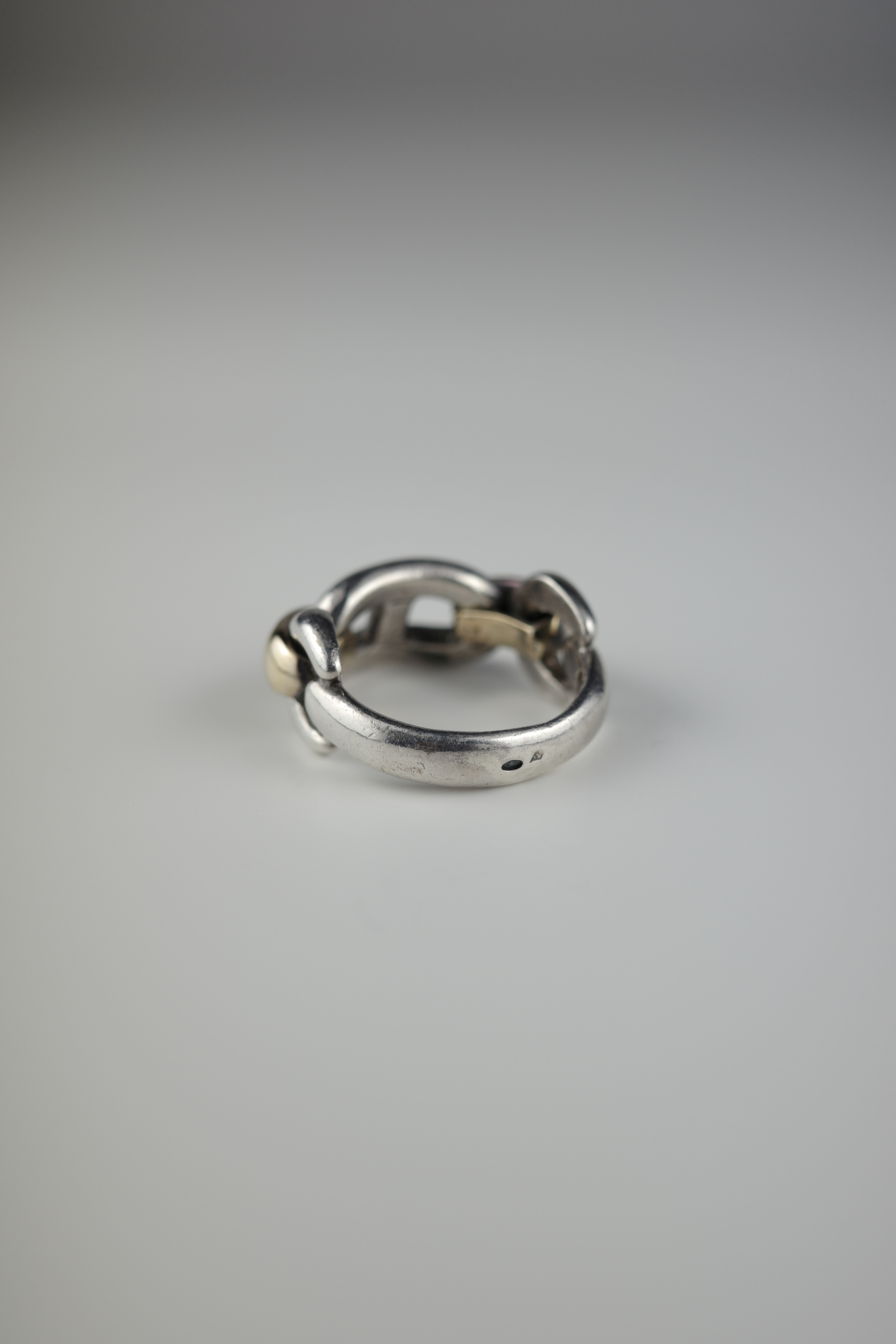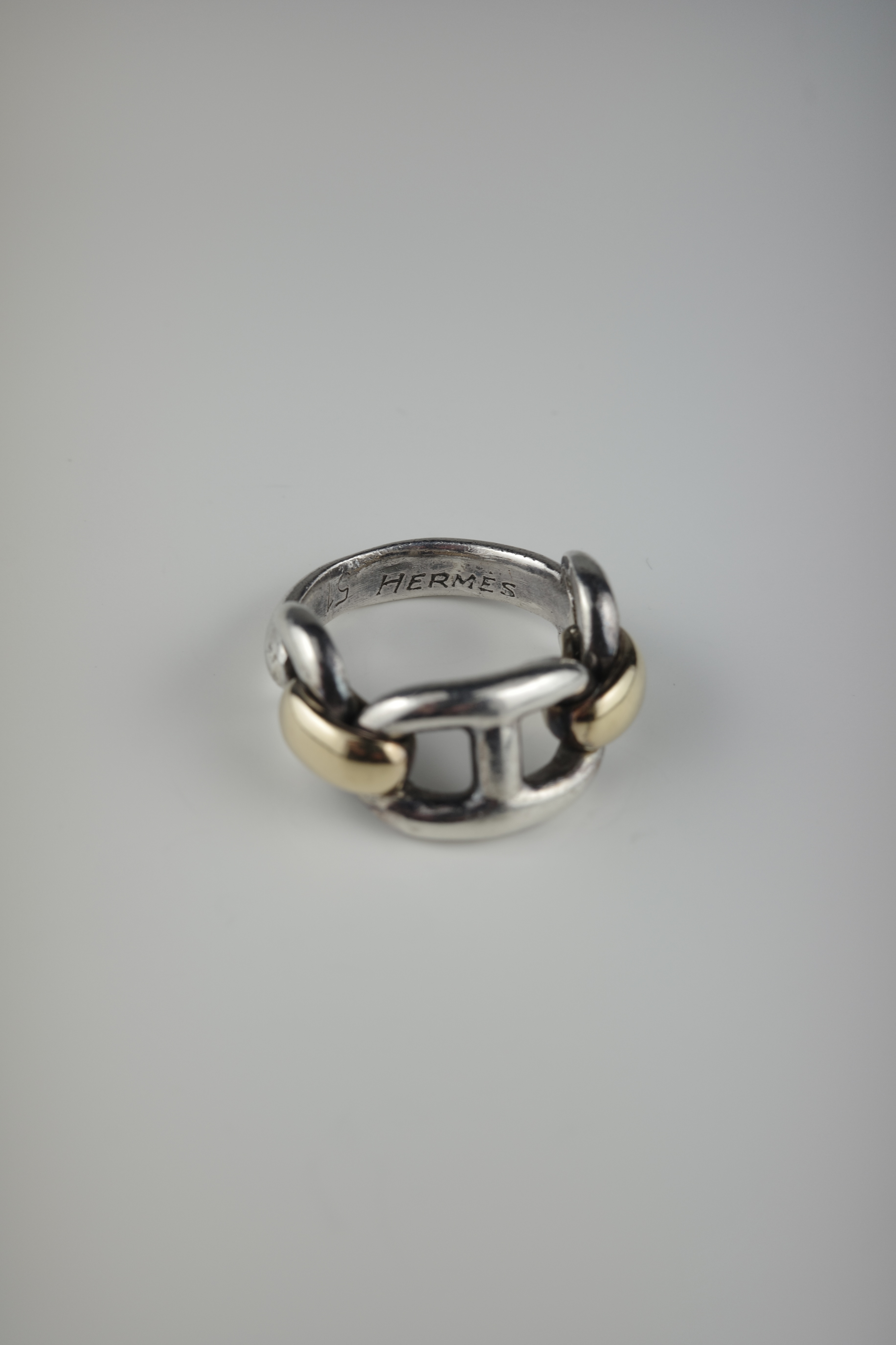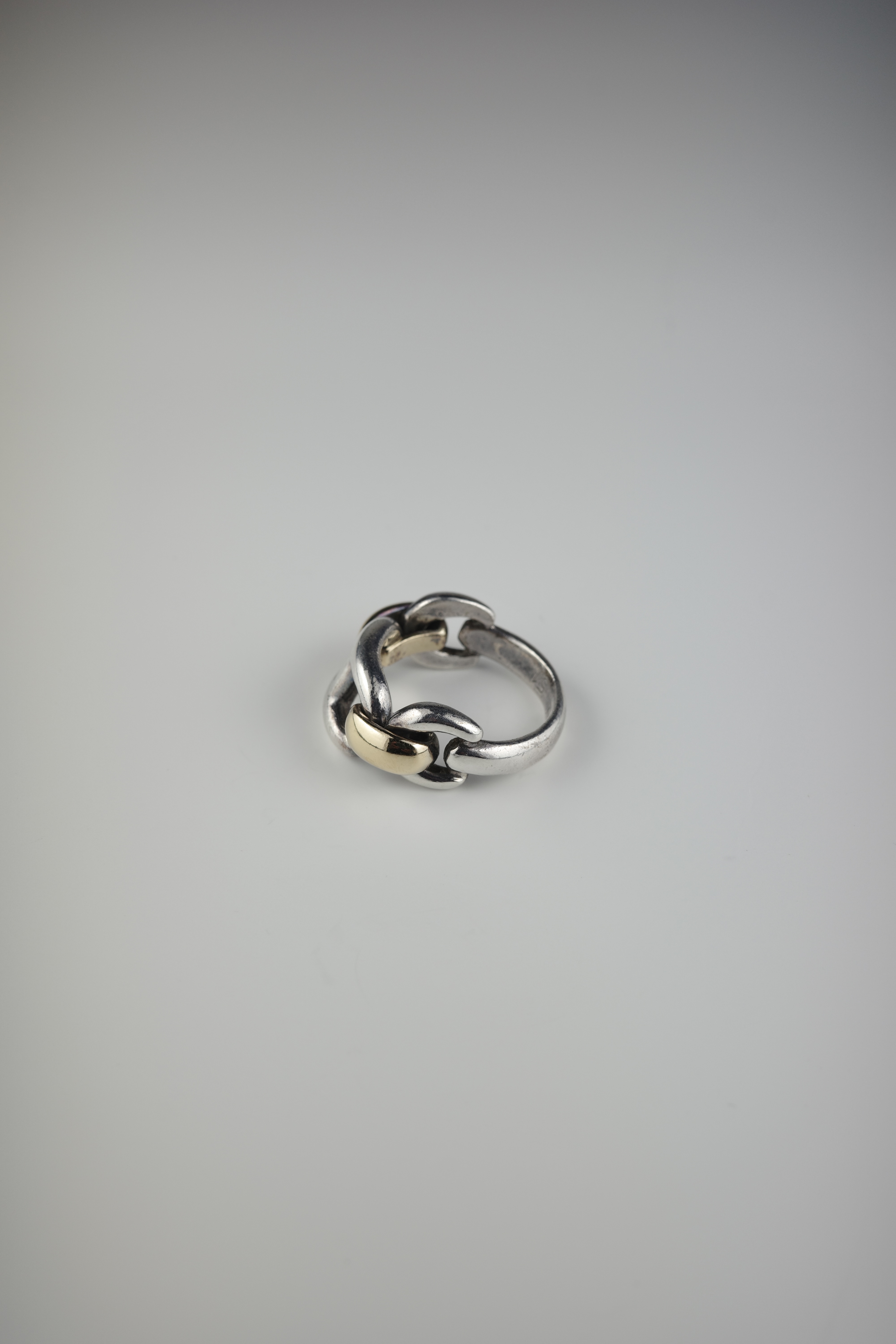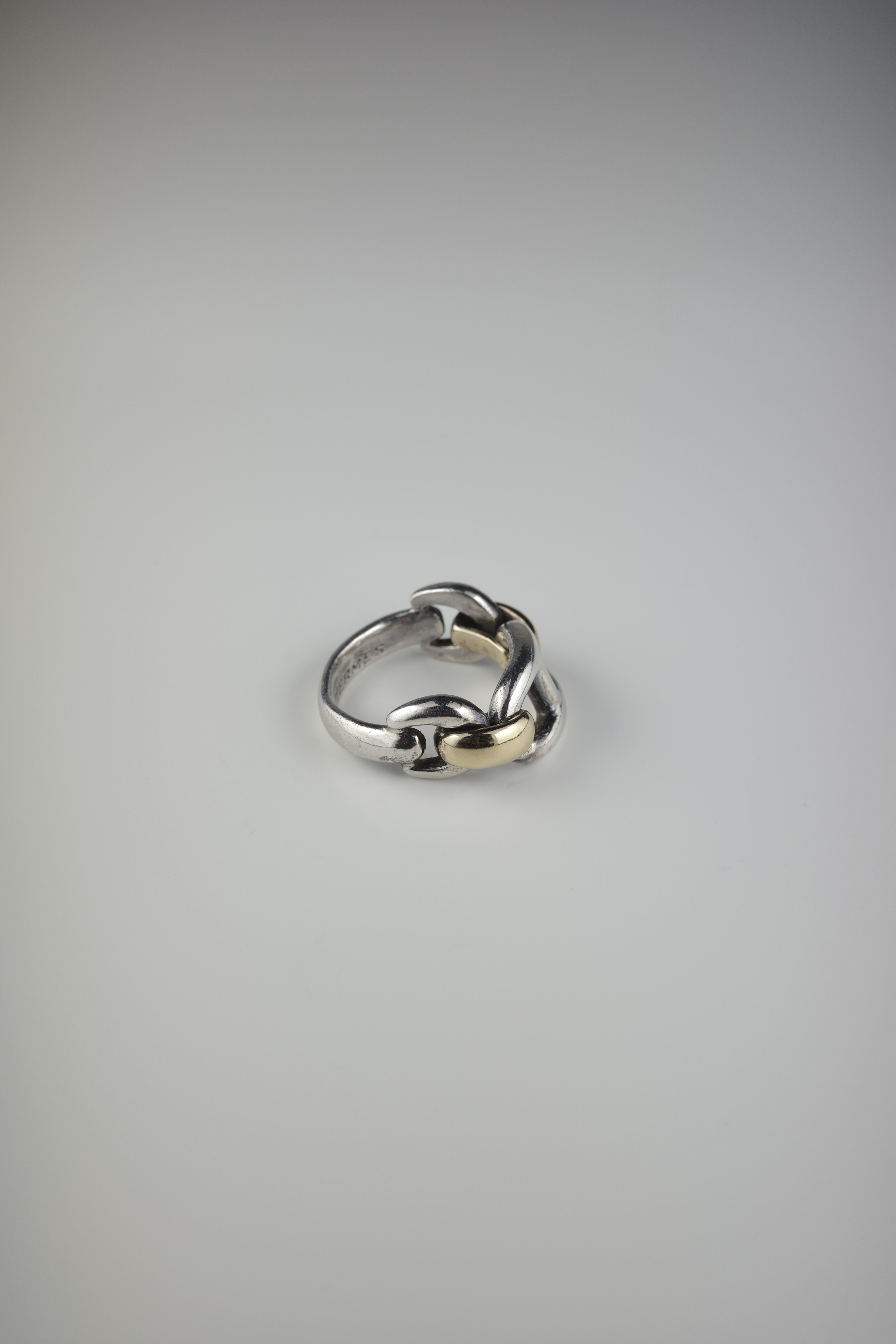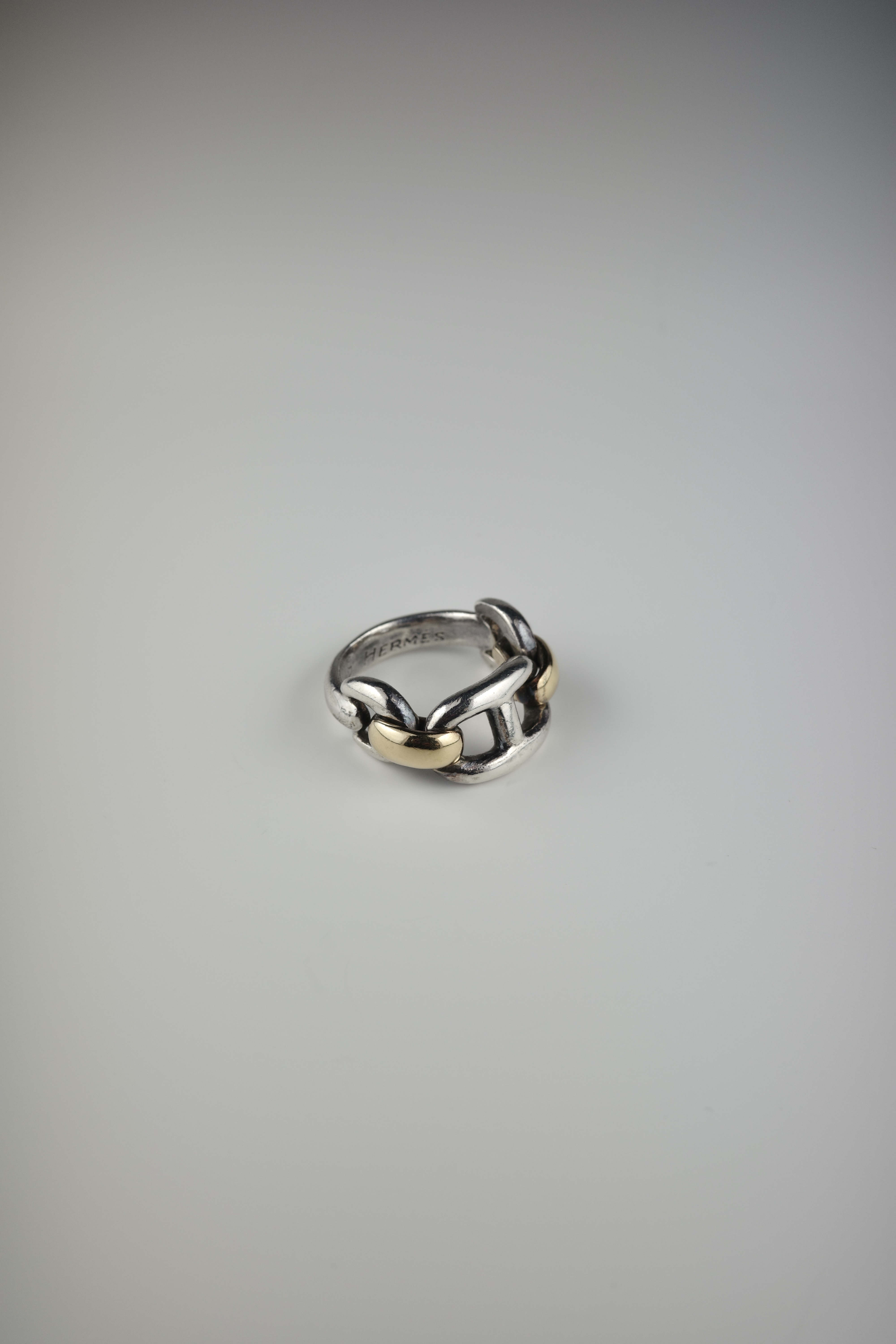 1938年の誕生以来、エルメスを象徴するアイコニックなデザイン「シェーヌダンクル」。その美しいチェーンリンクをそのまま指輪に落とし込んだ、希少な3連コンビリング。重厚感のあるシルバー925のリンクに、18Kイエローゴールドのアクセントを加えることで、クラシックでありながらもモダンな印象を併せ持つ逸品。シンプルなシェーヌダンクルリングとは異なり、ゴールドとのコンビネーションが放つ存在感は、装いにラグジュアリーな彩りを添えます。現在では製造されていないヴィンテージモデルのため、コレクターズアイテムとしても非常に価値の高いリング。