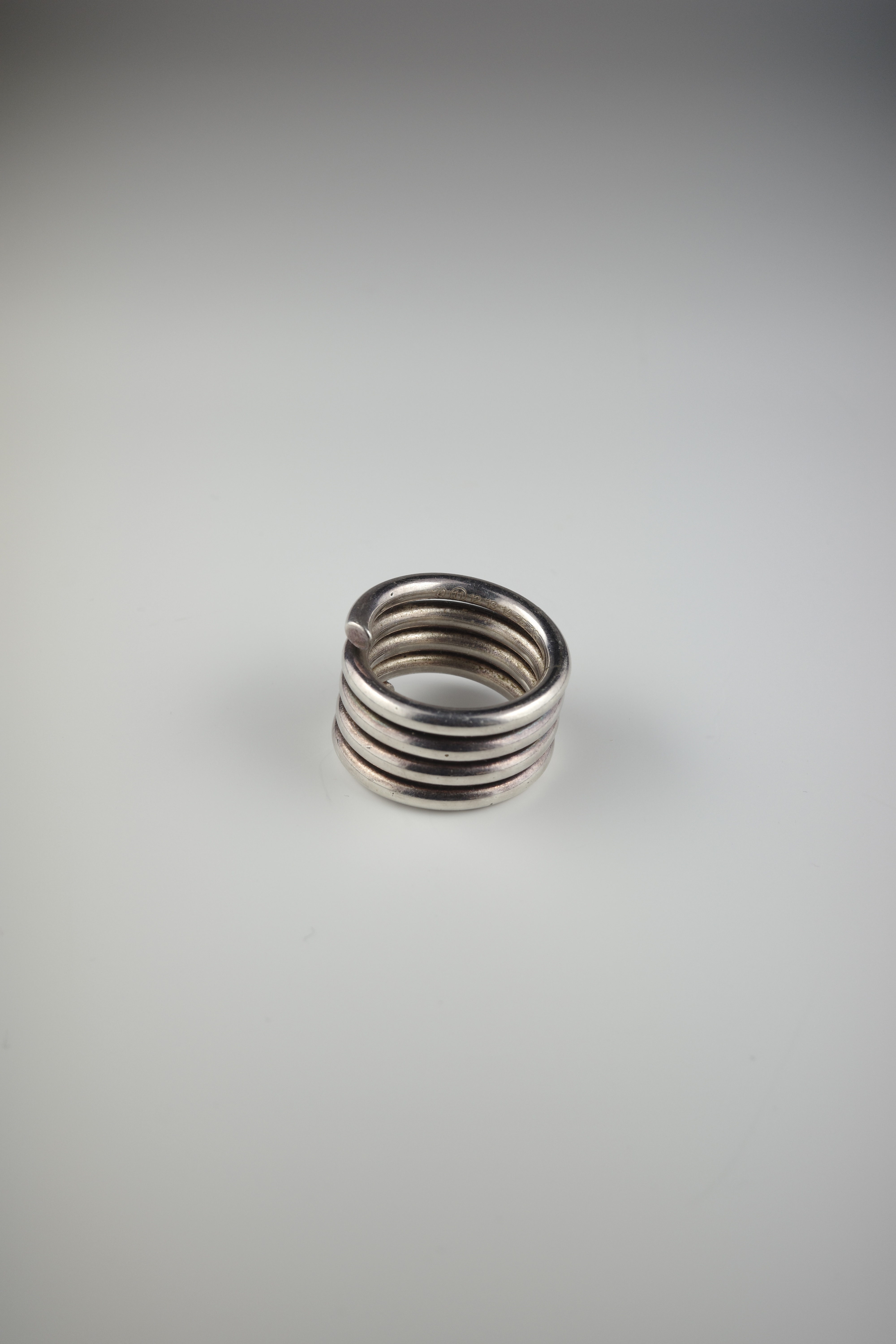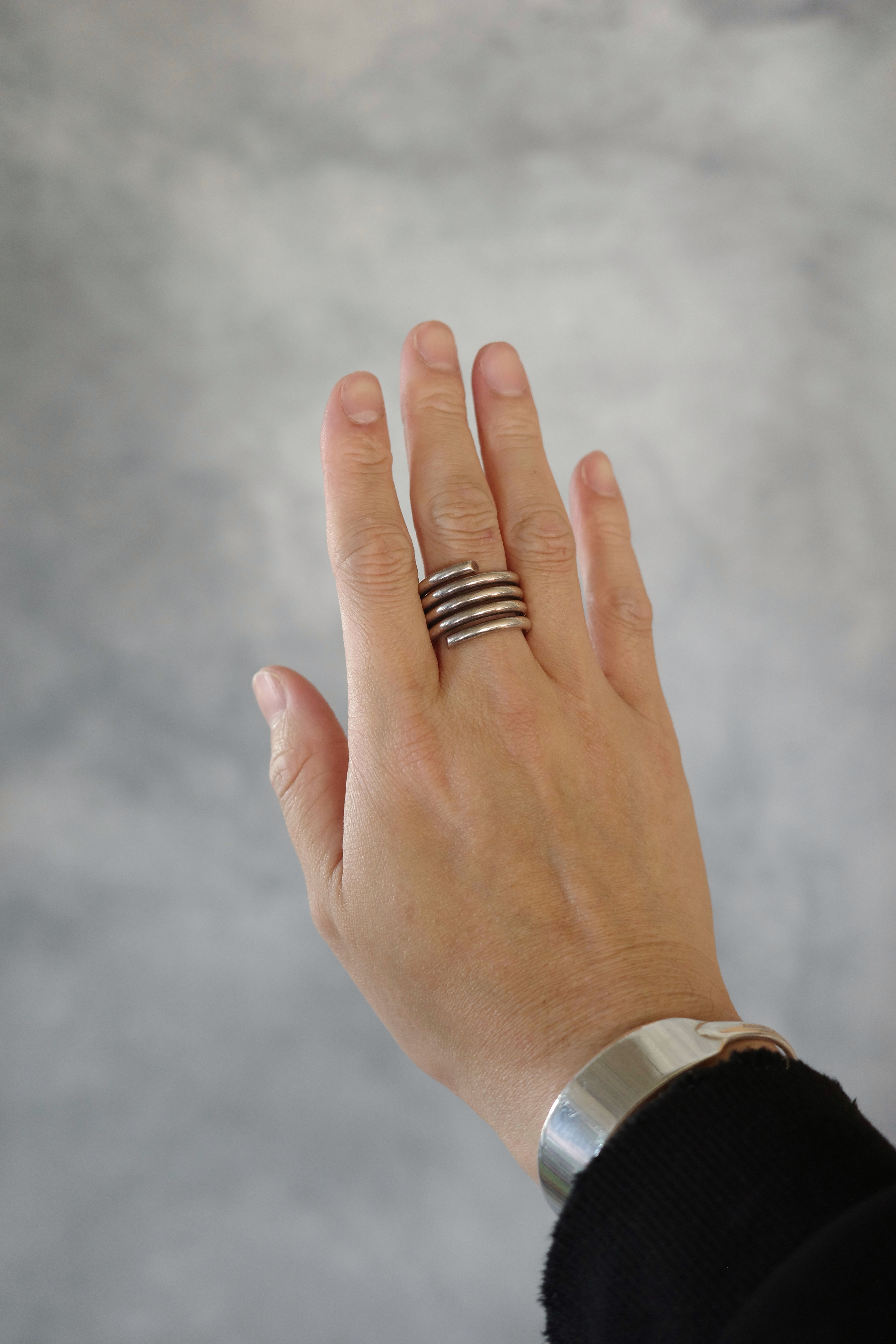 Maison Martin Margielaのコイルリング。一本の金属線を巻き上げたようなミニマルな構造で、日常的なモチーフを再構築する当時のマルジェラらしいデザインが際立つ一本。無駄を削ぎ落としたシンプルなフォルムながら、重なり合うラインが指元に奥行きと立体感を生み、さりげない存在感を演出してくれます。現行にはないMaison Martin Margiela時代ならではのアーカイブピースで、流通数も少なく希少性の高いアイテムです。