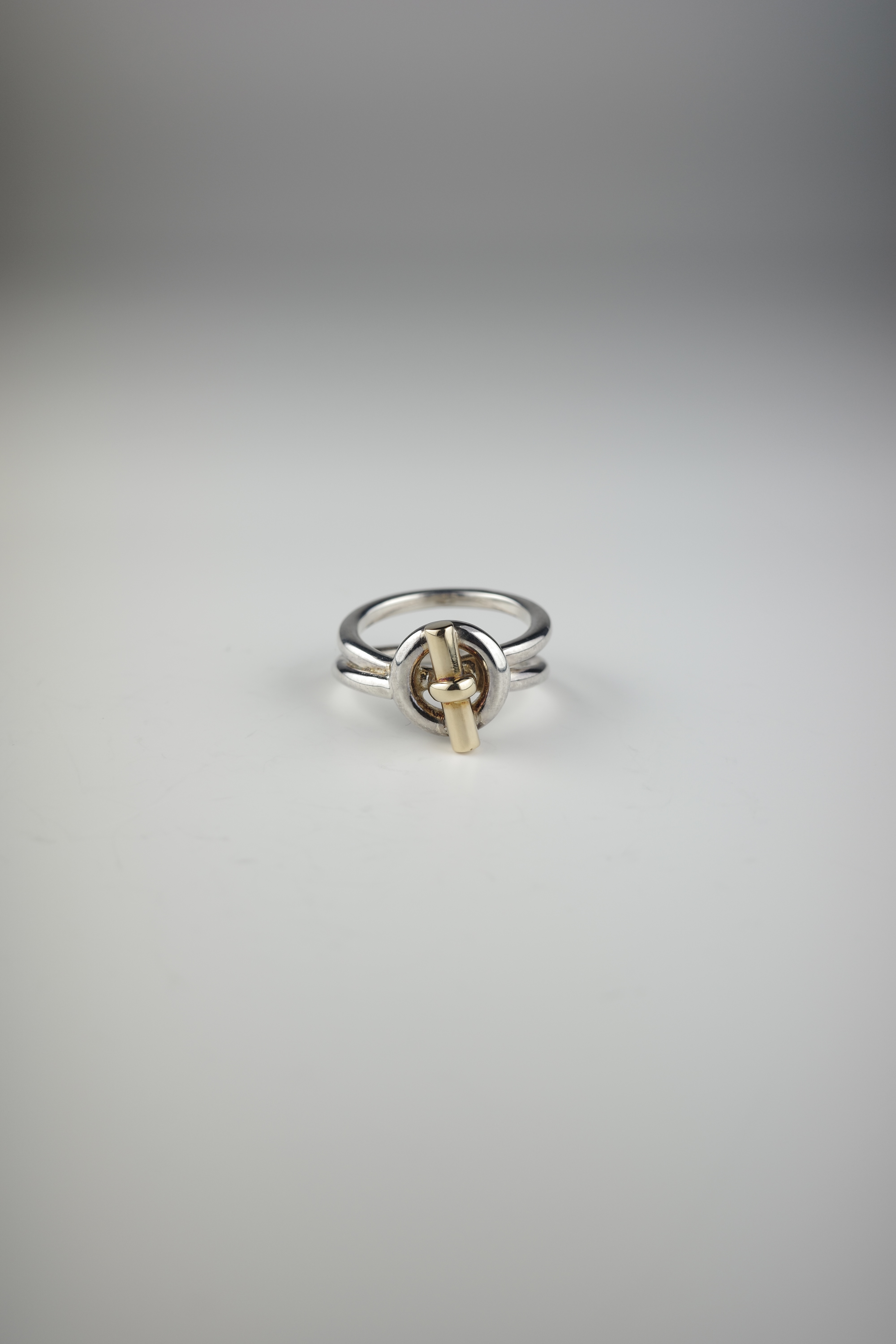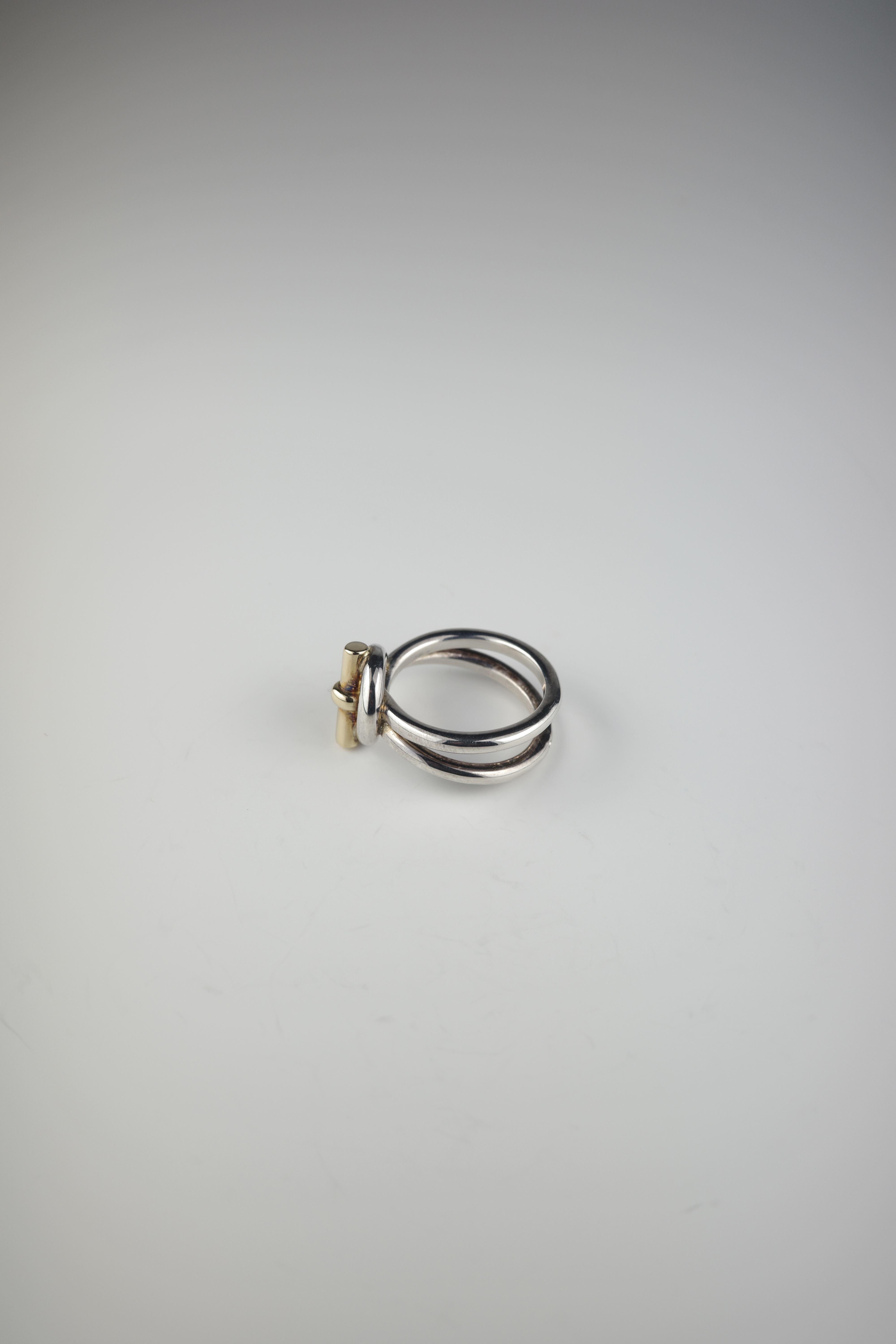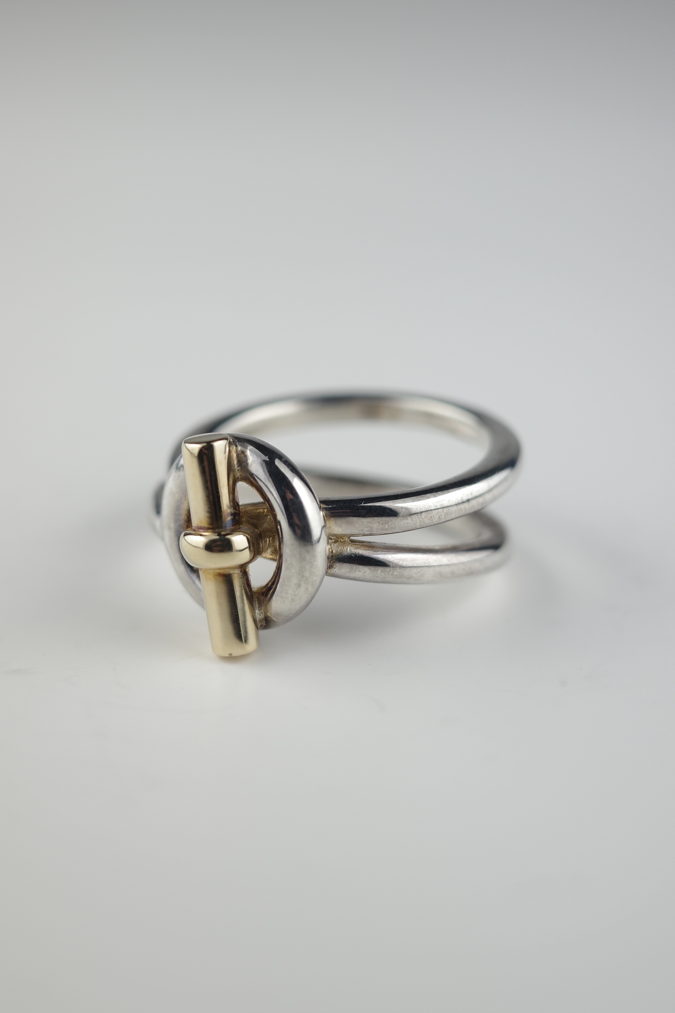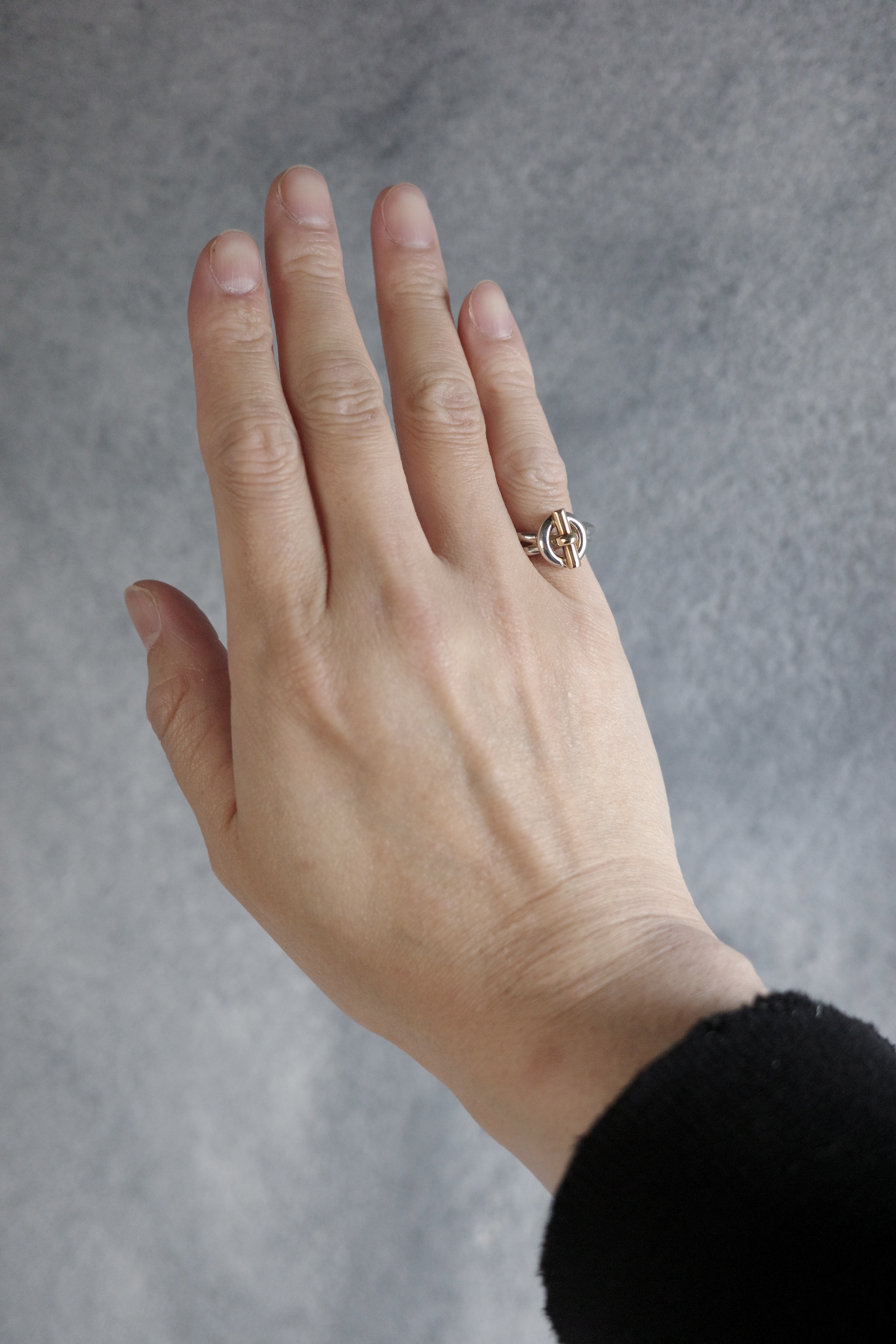 ブランドを象徴するトグルモチーフがあしらわれた「エシャペ」のコンビネーションリング。鮮やかなシルバーにゴールドカラーのトグルが映えるデザインで、洗練された存在感を放つ逸品。ミニマルで上品な仕上がりは、日常使いから特別なシーンまで幅広く活躍します。2連タイプのデザインは市場でも滅多に出回らない稀少性の高いヴィンテージピース。