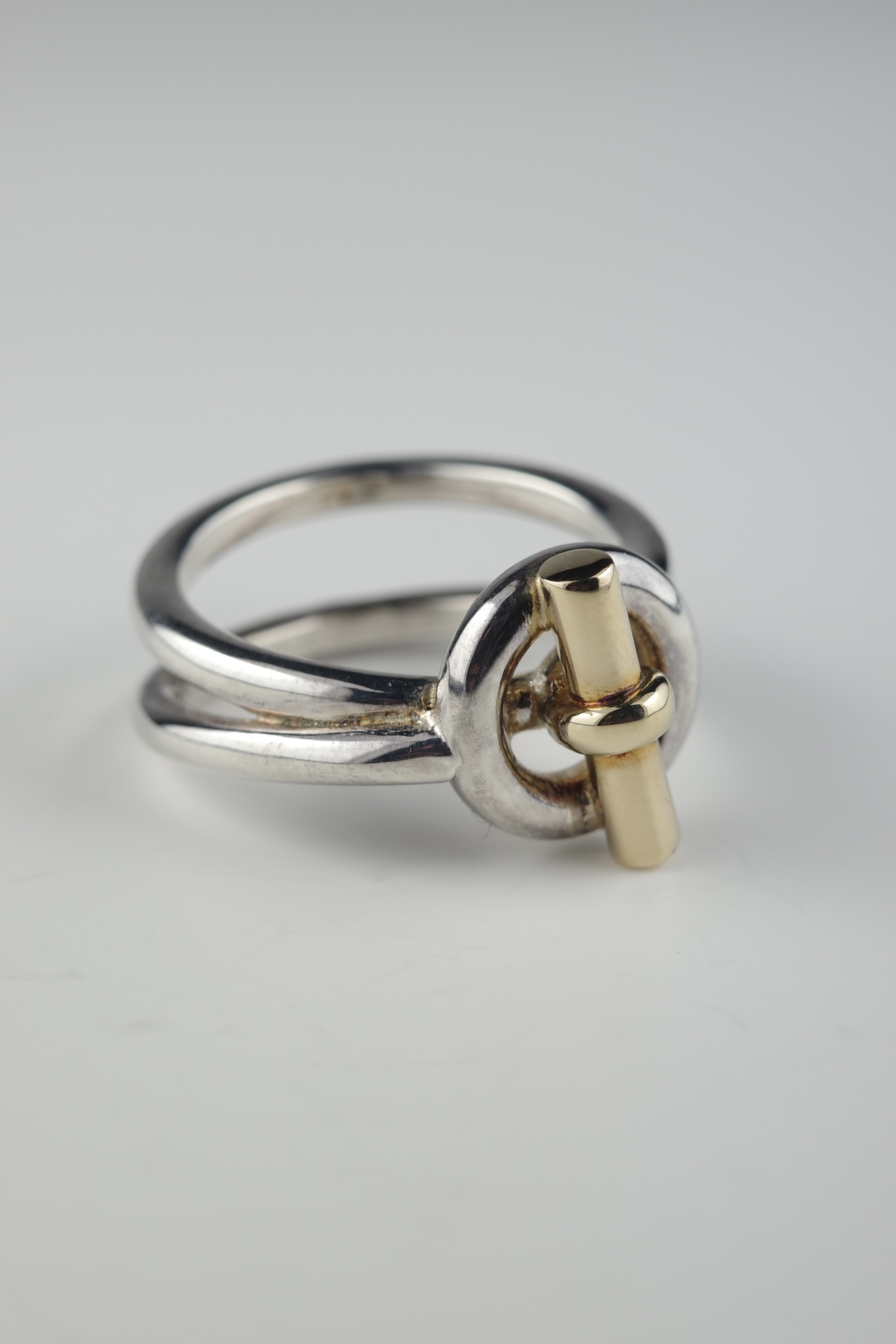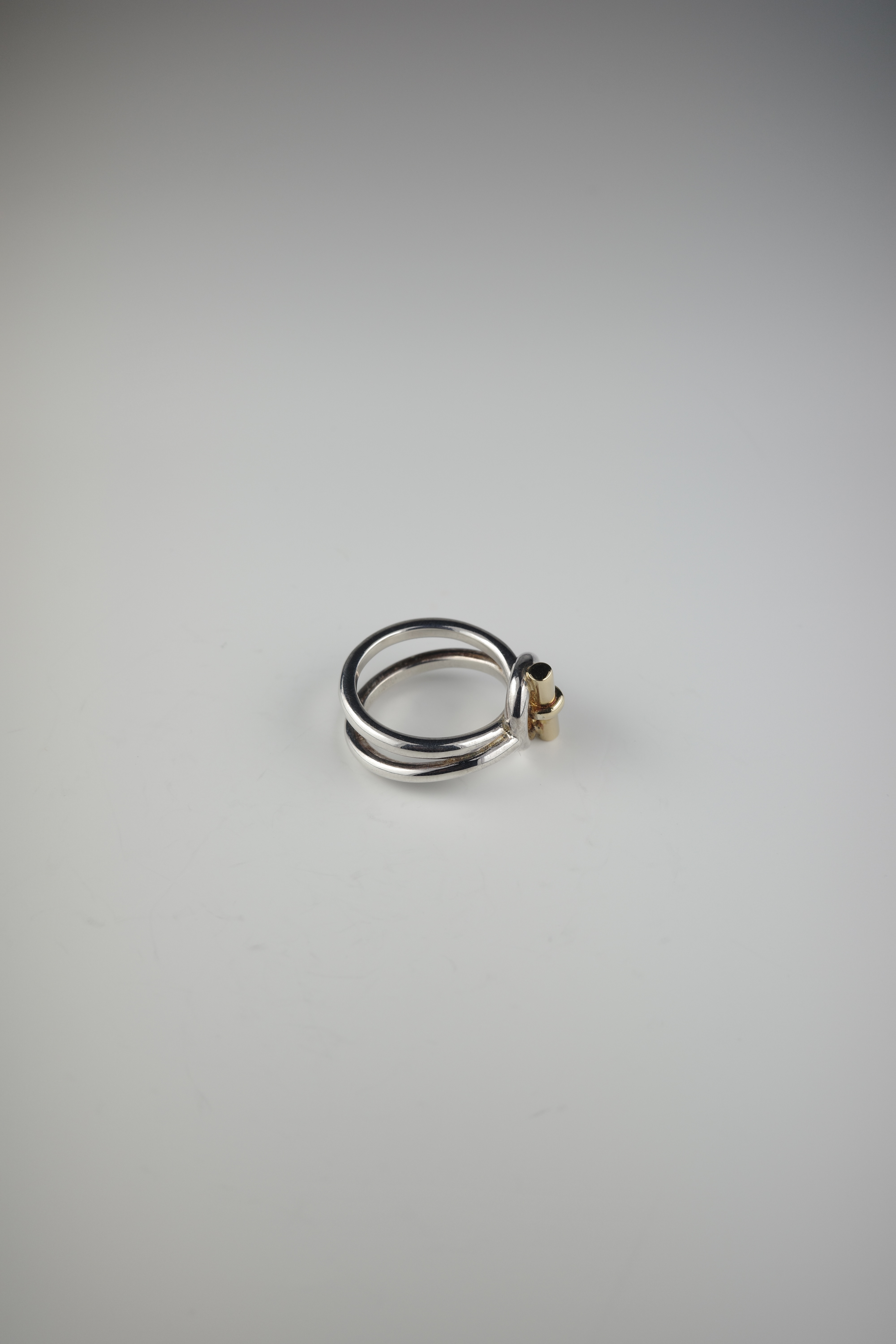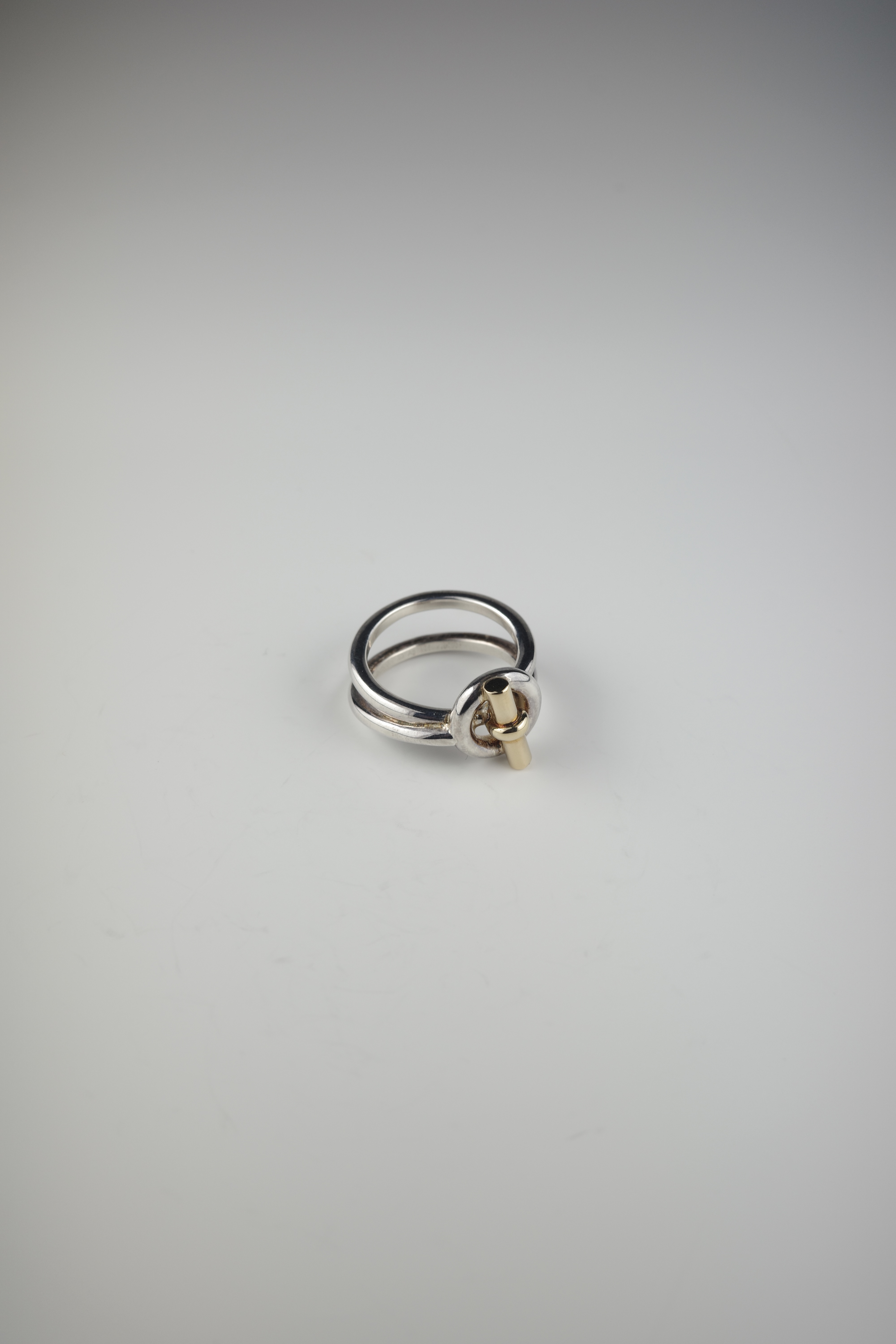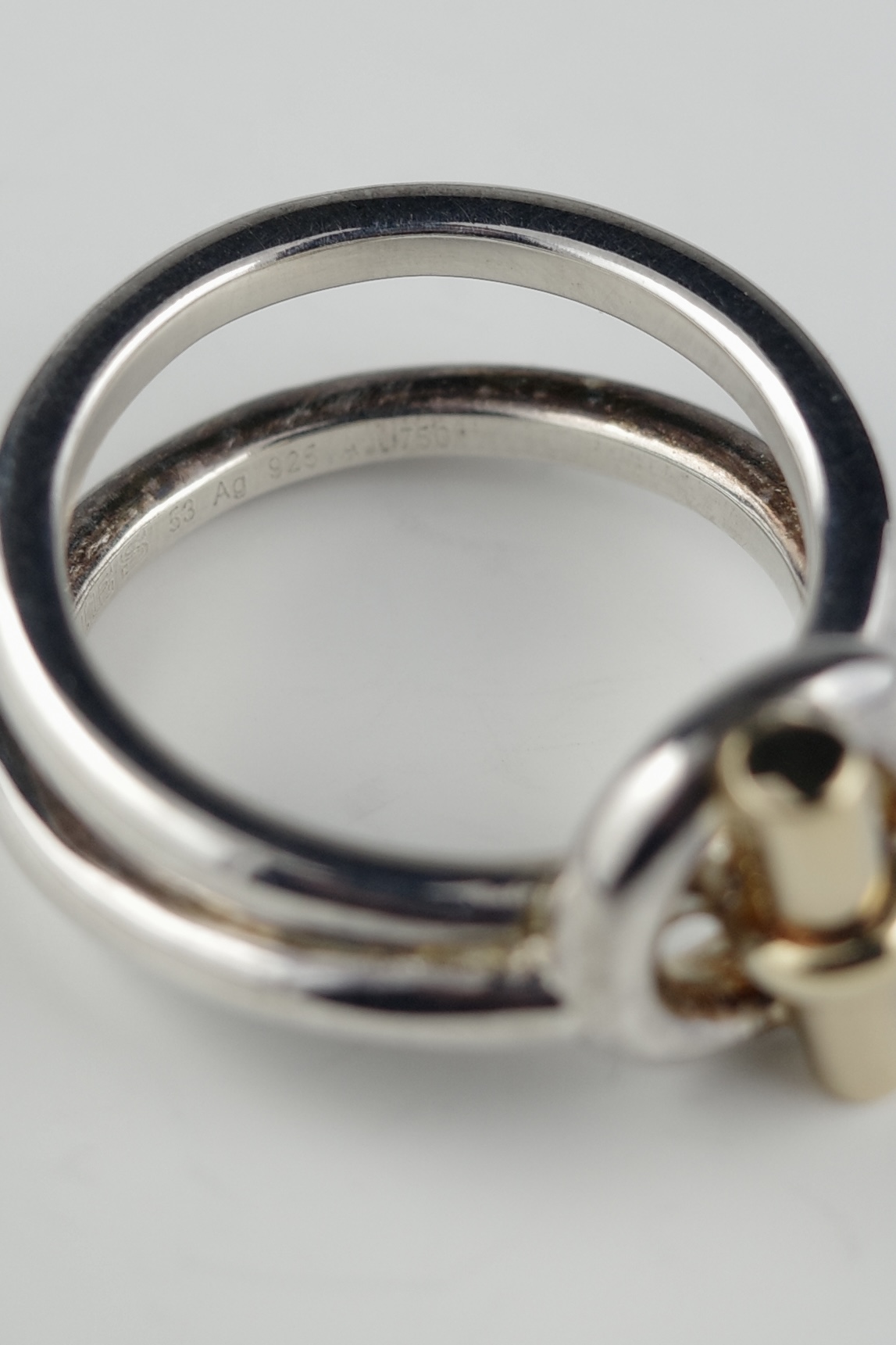 ブランドを象徴するトグルモチーフがあしらわれた「エシャペ」のコンビネーションリング。鮮やかなシルバーにゴールドカラーのトグルが映えるデザインで、洗練された存在感を放つ逸品。ミニマルで上品な仕上がりは、日常使いから特別なシーンまで幅広く活躍します。2連タイプのデザインは市場でも滅多に出回らない稀少性の高いヴィンテージピース。