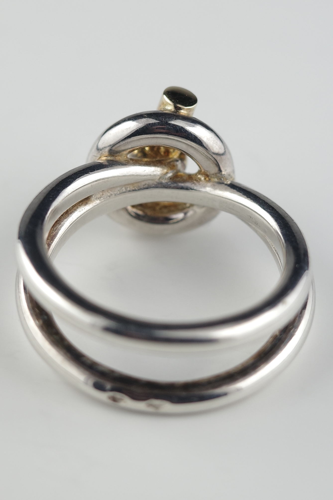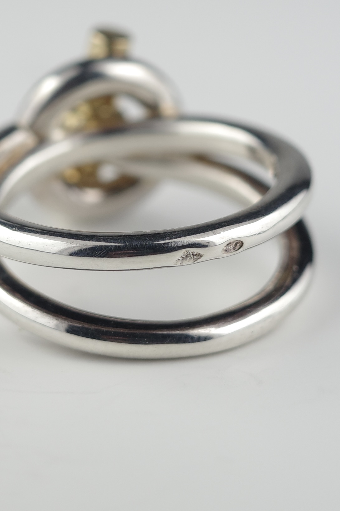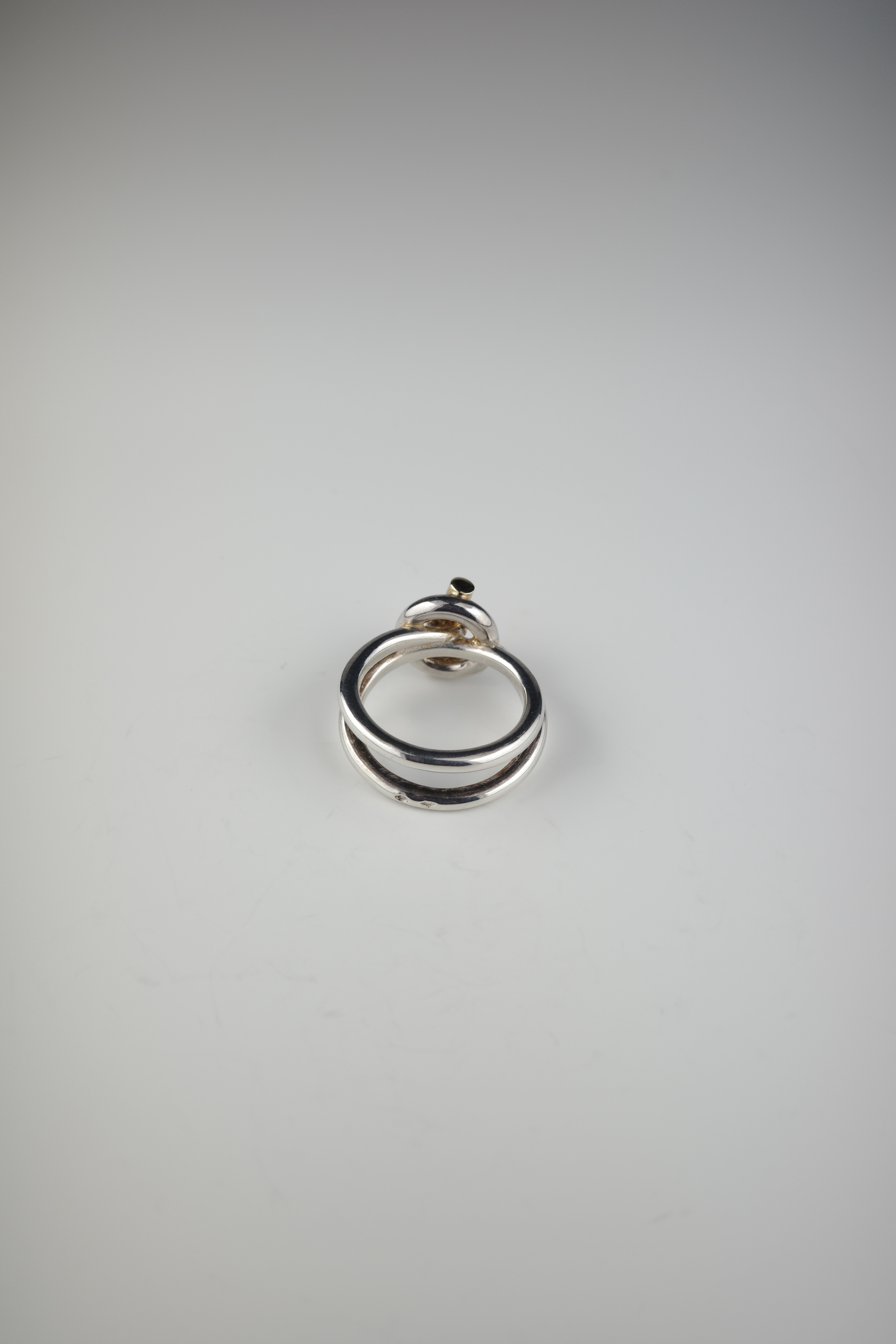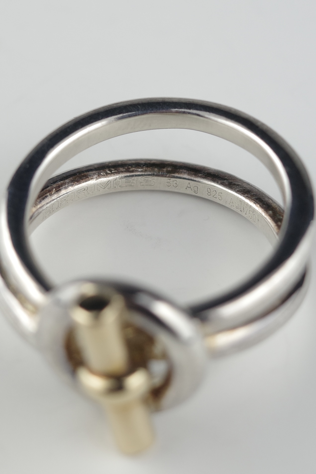 ブランドを象徴するトグルモチーフがあしらわれた「エシャペ」のコンビネーションリング。鮮やかなシルバーにゴールドカラーのトグルが映えるデザインで、洗練された存在感を放つ逸品。ミニマルで上品な仕上がりは、日常使いから特別なシーンまで幅広く活躍します。2連タイプのデザインは市場でも滅多に出回らない稀少性の高いヴィンテージピース。