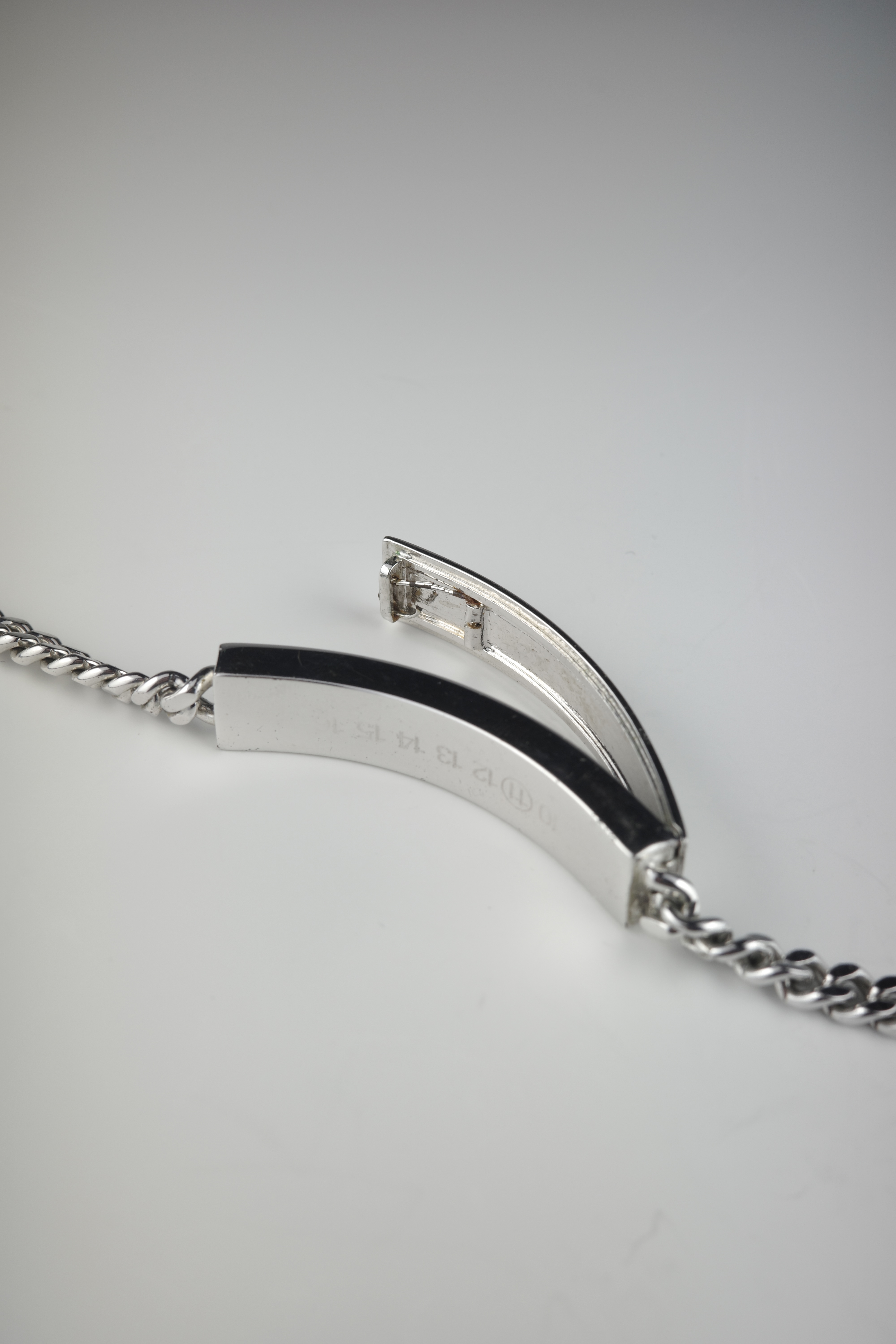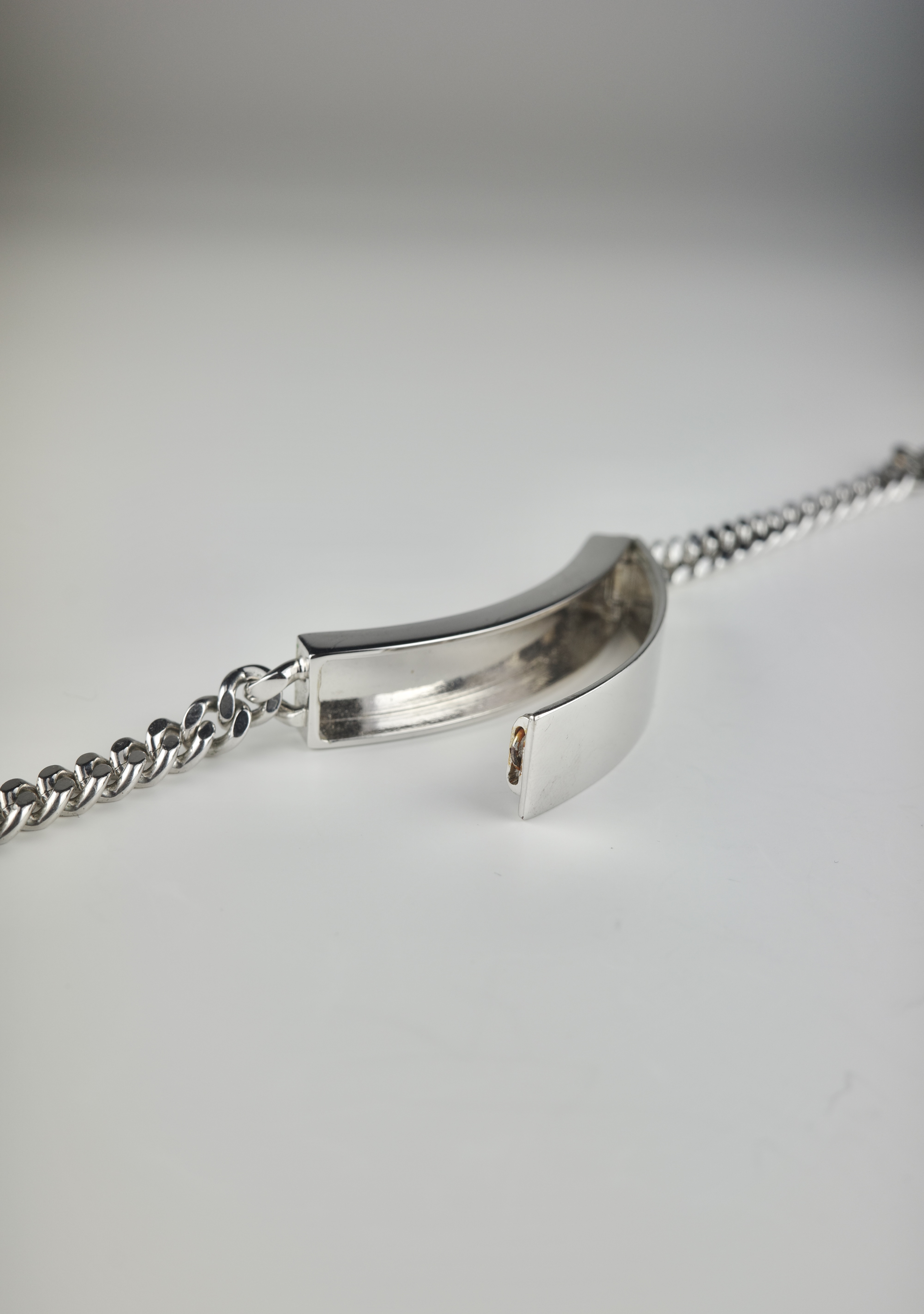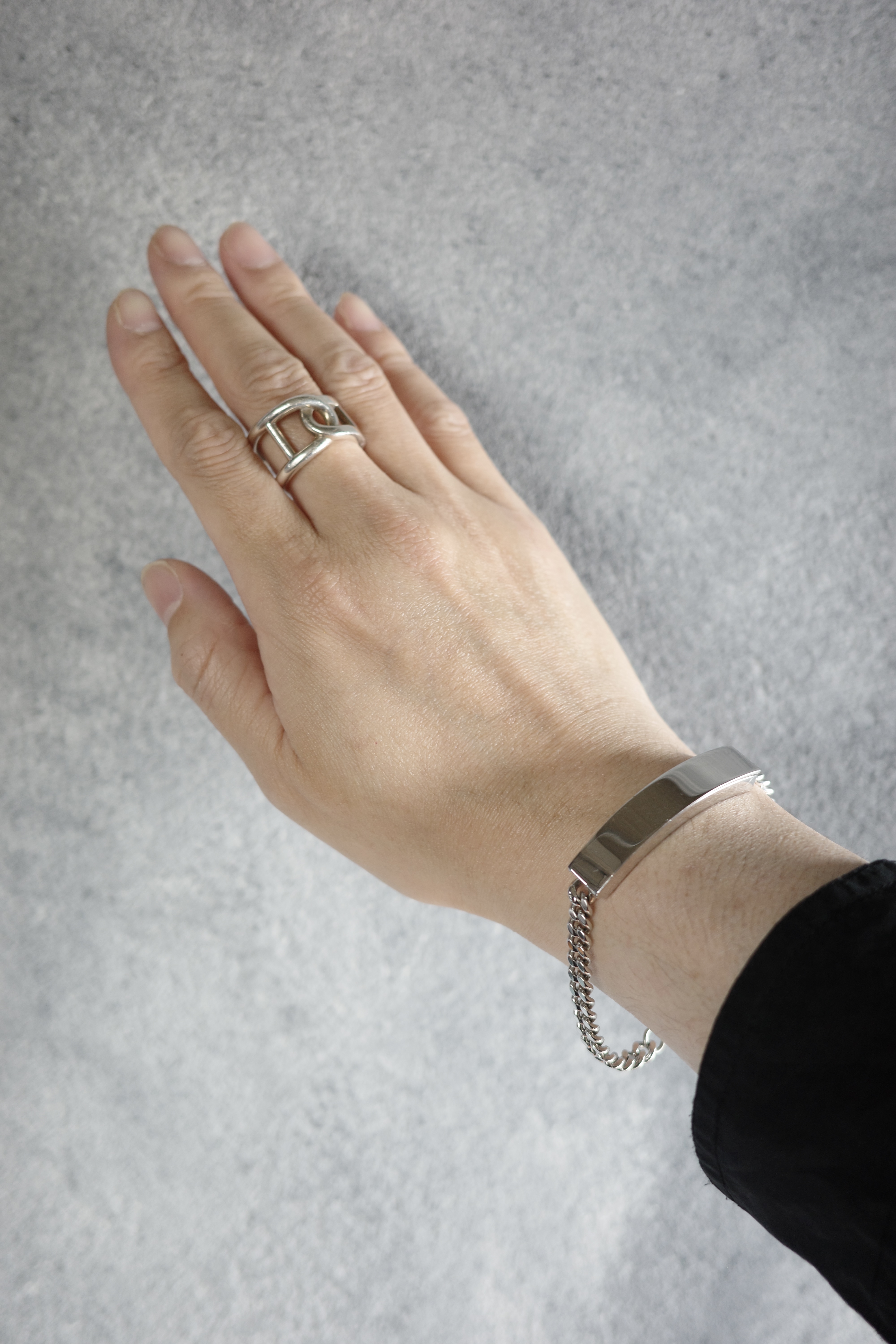 ミリタリー由来のIDタグをベースにしながら、ブランドらしいミニマルな解釈で再構築されたMaison Martin Margiela のIDブレスレット。刻印を排除したプレーンなプレートは、匿名性という同ブランドの思想を象徴するデザインとなっています。本アイテムは、IDプレート部分が開閉可能な構造となっており、内部に空間を持たせたユニークな仕様が特徴。ジュエリーとしての造形美に加え、ギミックとしての面白さも兼ね備えた、アーカイブならではのディテール。シンプルな中にも実験性を内包したマルジェラらしいアイテムです。