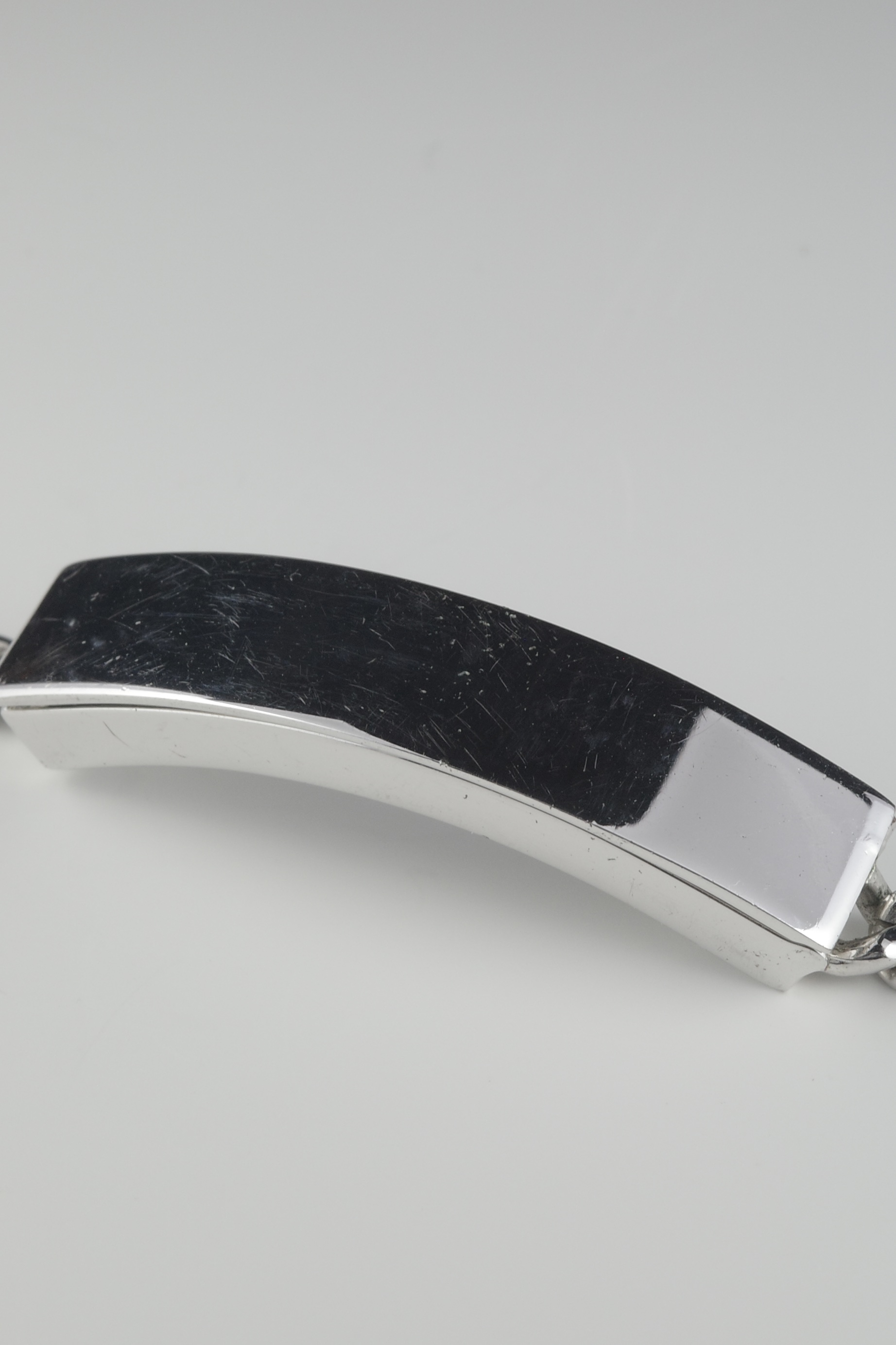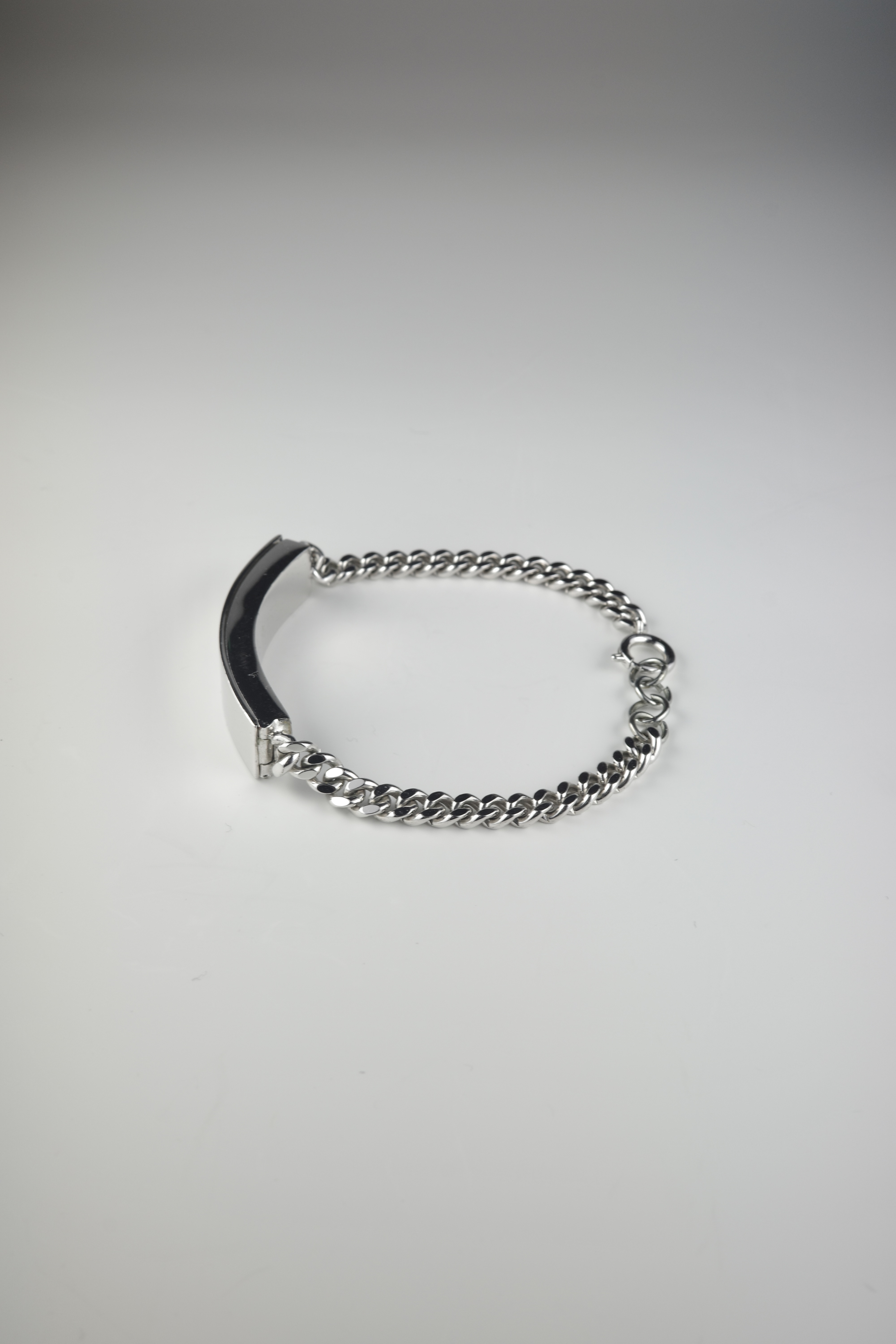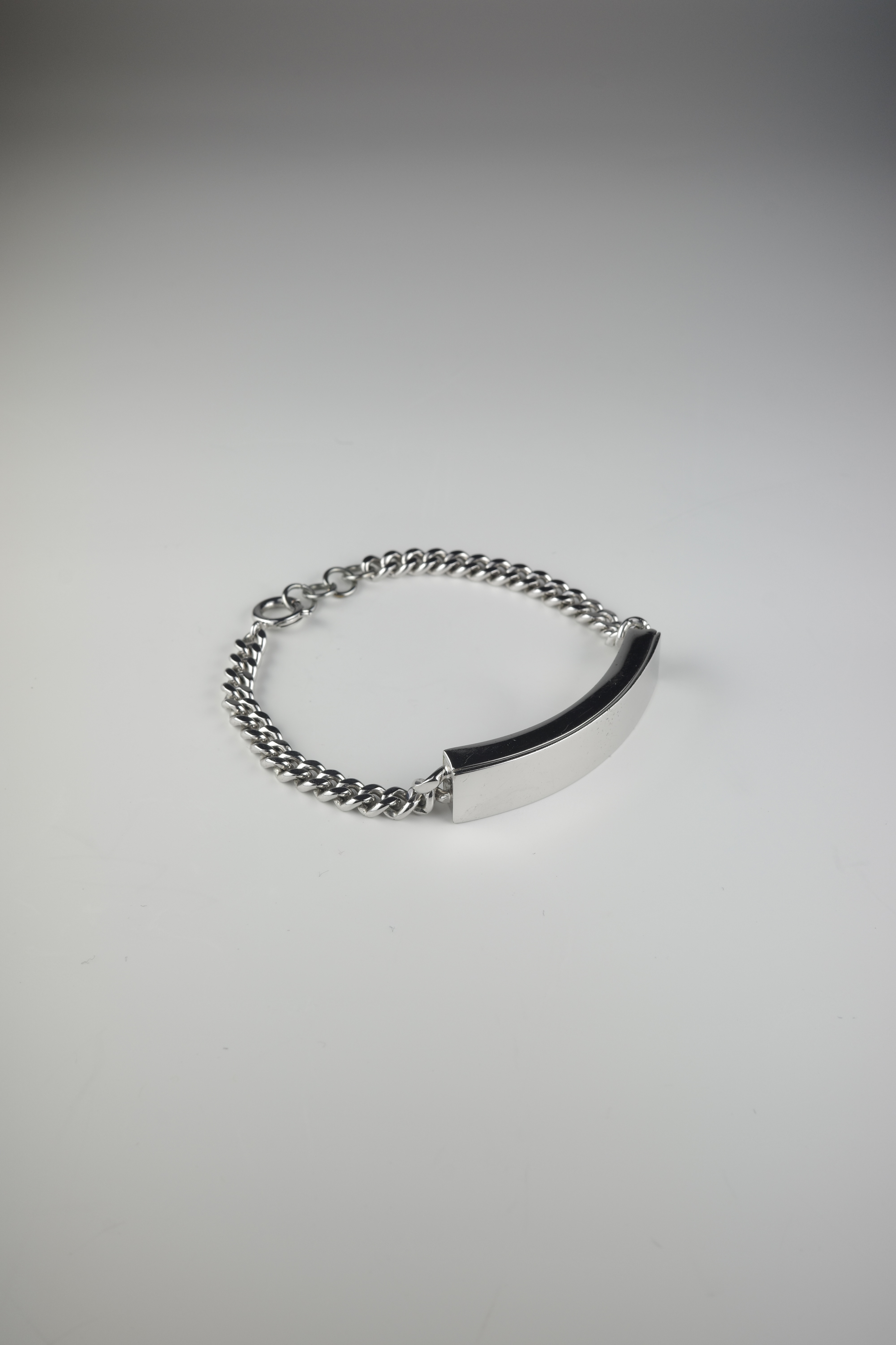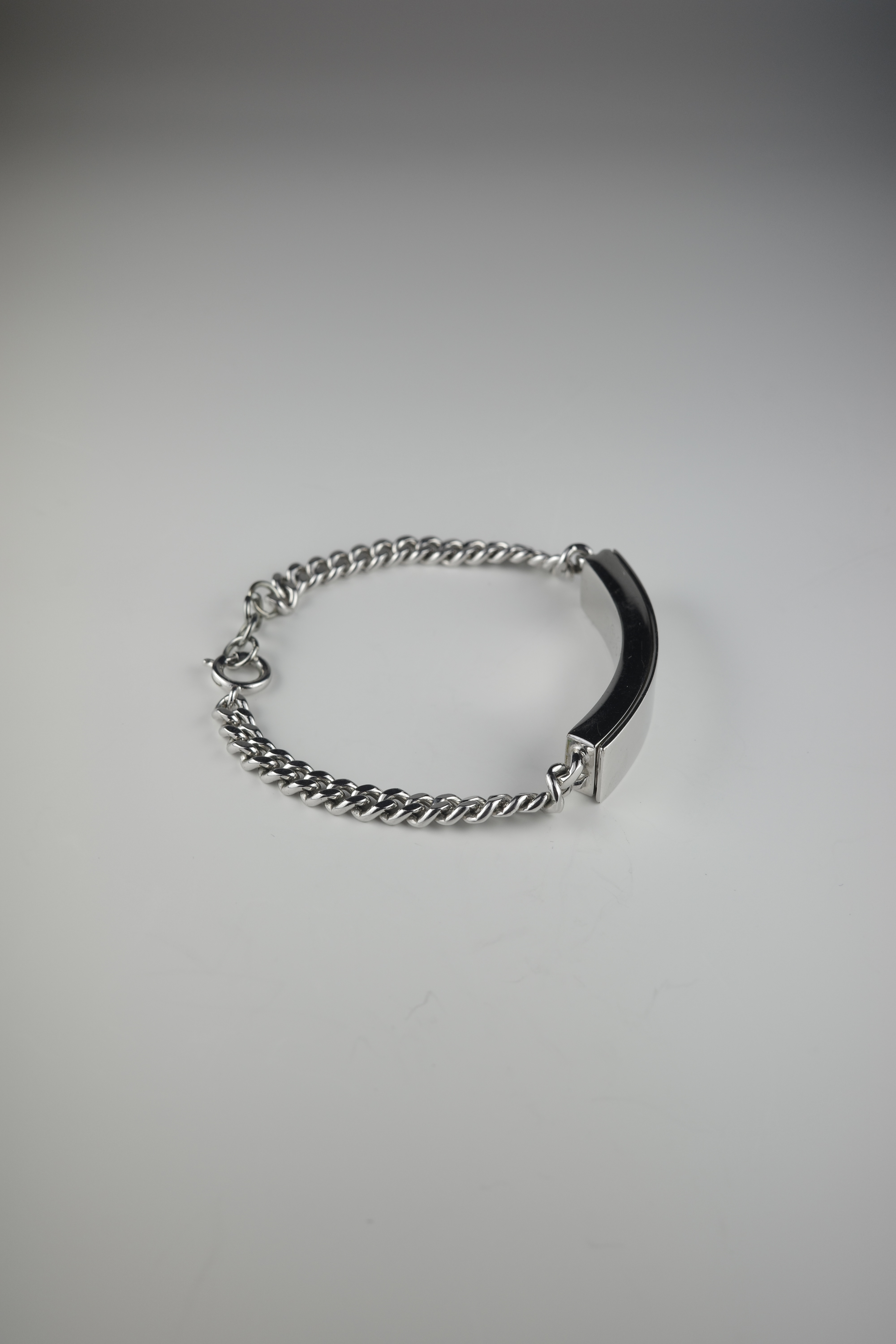 ミリタリー由来のIDタグをベースにしながら、ブランドらしいミニマルな解釈で再構築されたMaison Martin Margiela のIDブレスレット。刻印を排除したプレーンなプレートは、匿名性という同ブランドの思想を象徴するデザインとなっています。本アイテムは、IDプレート部分が開閉可能な構造となっており、内部に空間を持たせたユニークな仕様が特徴。ジュエリーとしての造形美に加え、ギミックとしての面白さも兼ね備えた、アーカイブならではのディテール。シンプルな中にも実験性を内包したマルジェラらしいアイテムです。