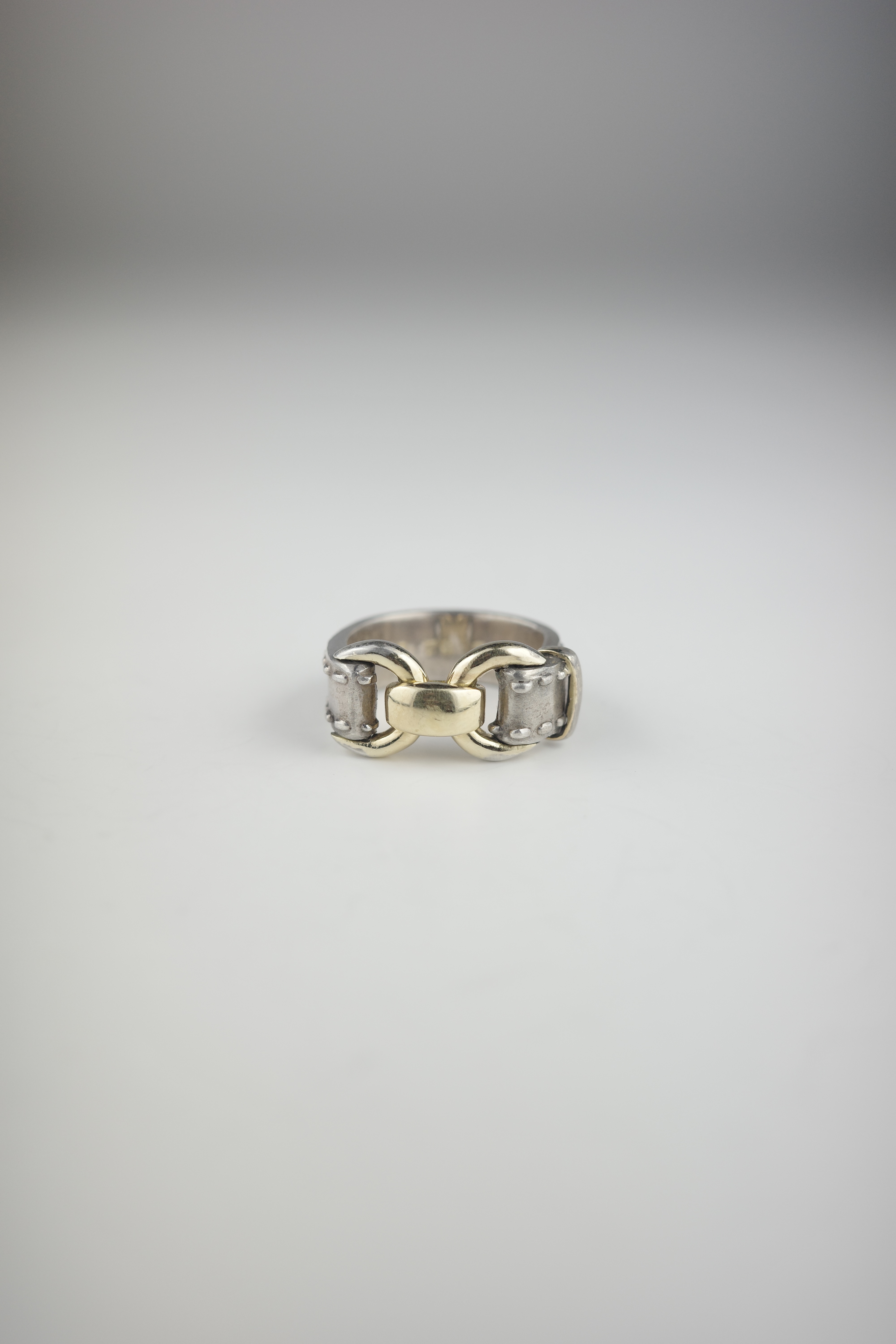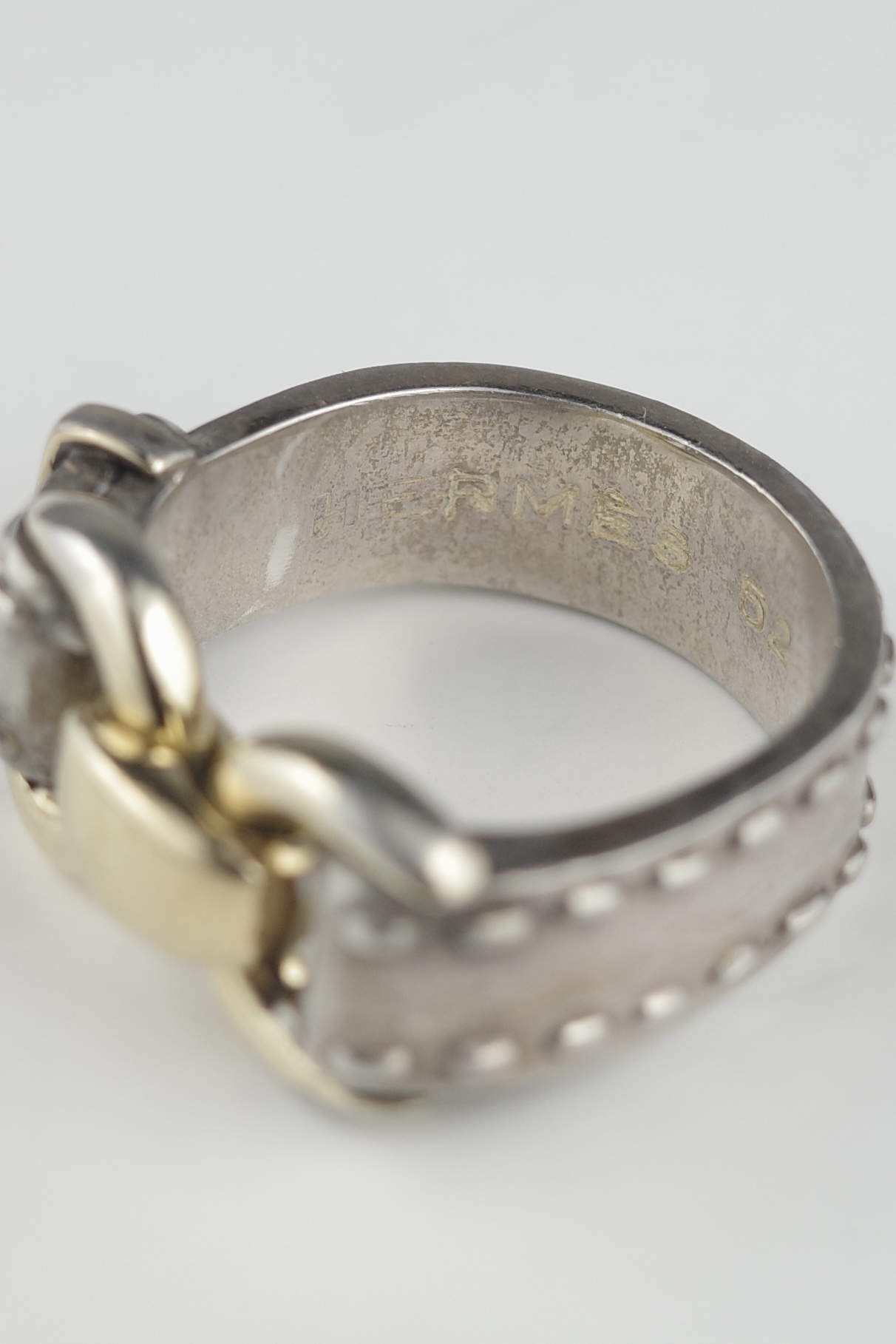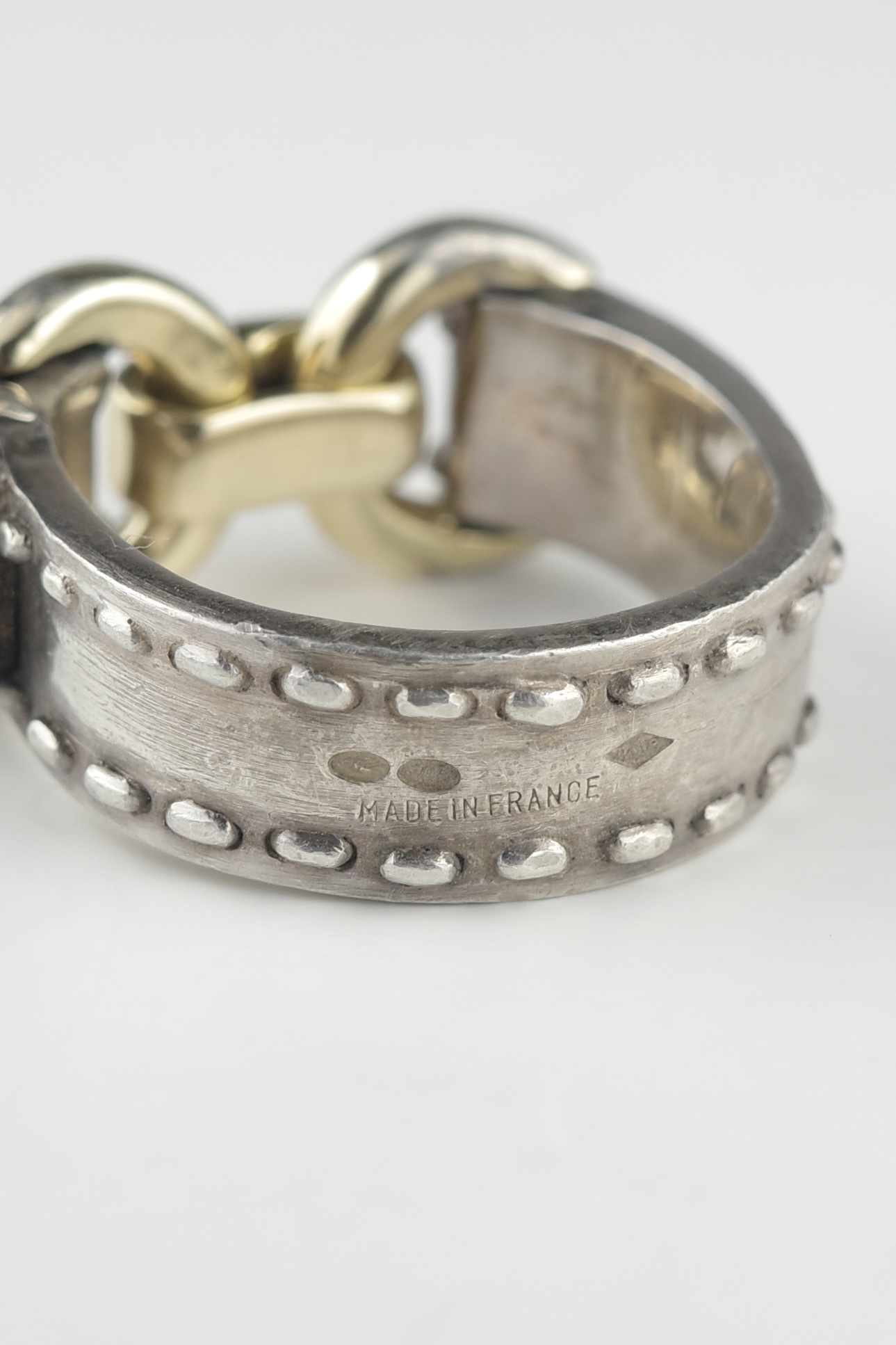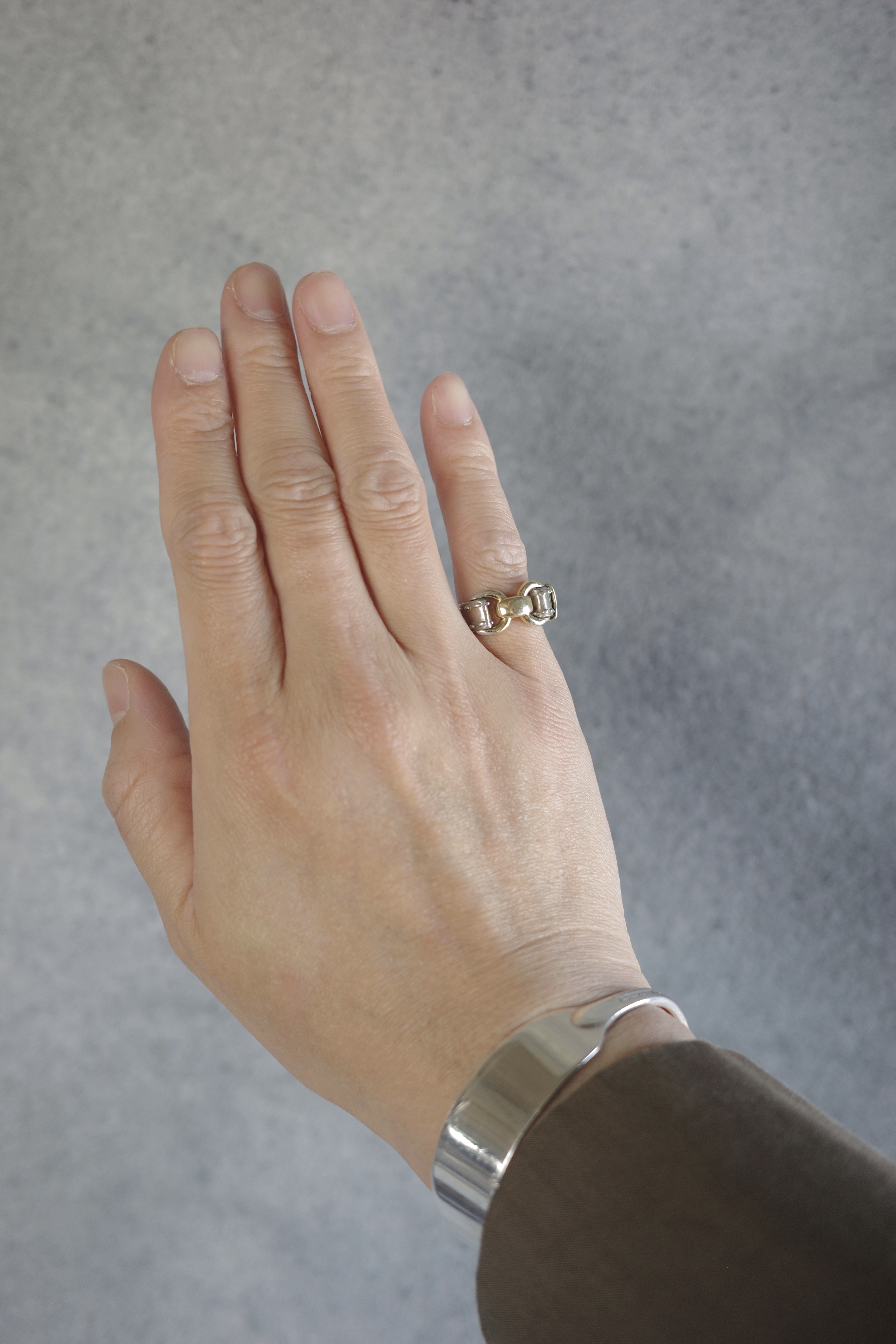 フロントに施された独特の金具モチーフが印象的な、Hermèsの「Montevideo(モンテヴィデオ)」リング。K18ゴールドとSV925シルバーによるコンビネーション仕様で、異なる素材が生み出すコントラストが美しく、程よいボリューム感がありながらも着用時のバランスが良い存在感のあるアイテム。モンテヴィデオはK18ゴールドの割合が違うモデルが存在し、こちらはゴールド部を多く配したタイプで希少な一本。ヴィンテージならではの経年変化により、現行品にはない柔らかな光沢と深みのある表情も魅力で、日常使いから特別なシーンまで幅広く活躍する、タイムレスなヴィンテージジュエリーです。