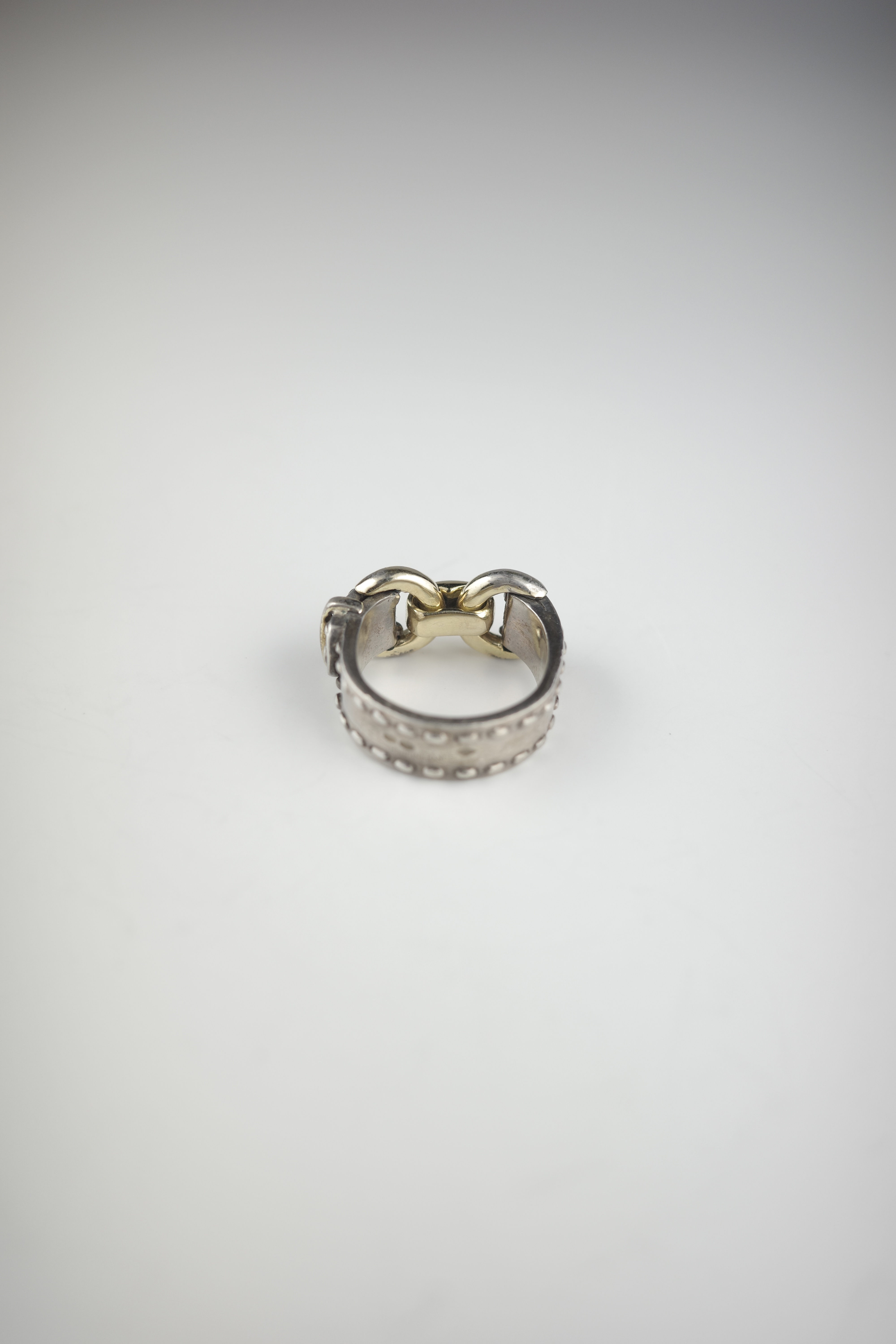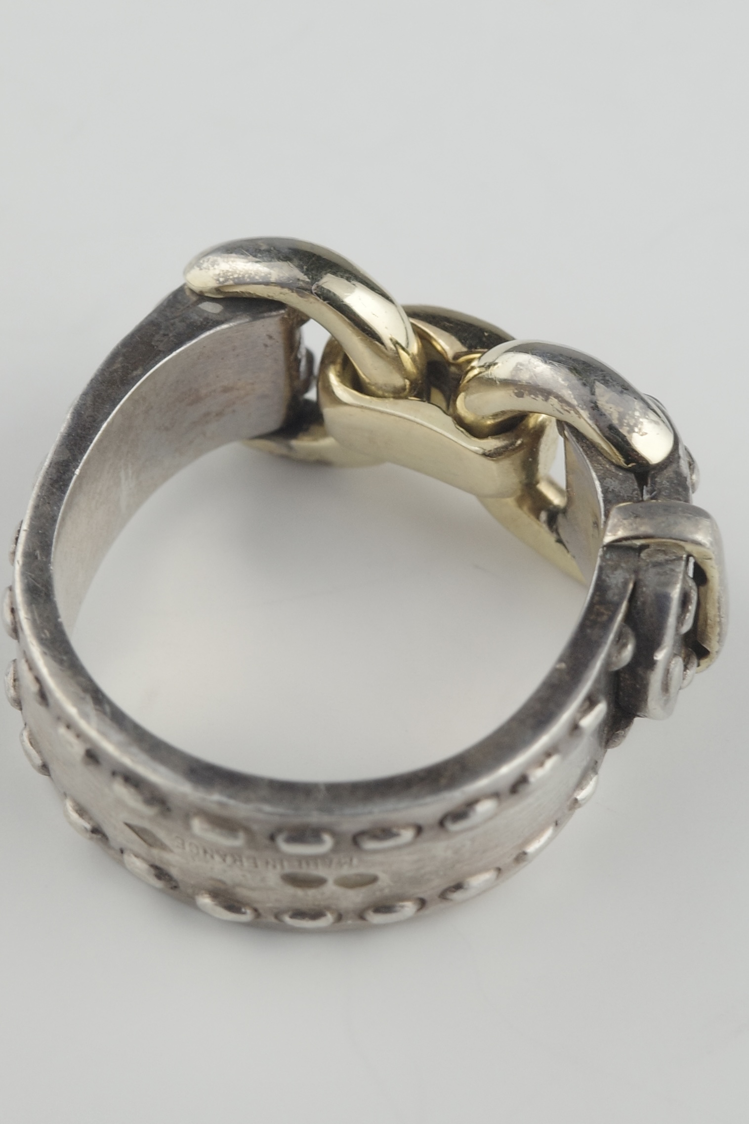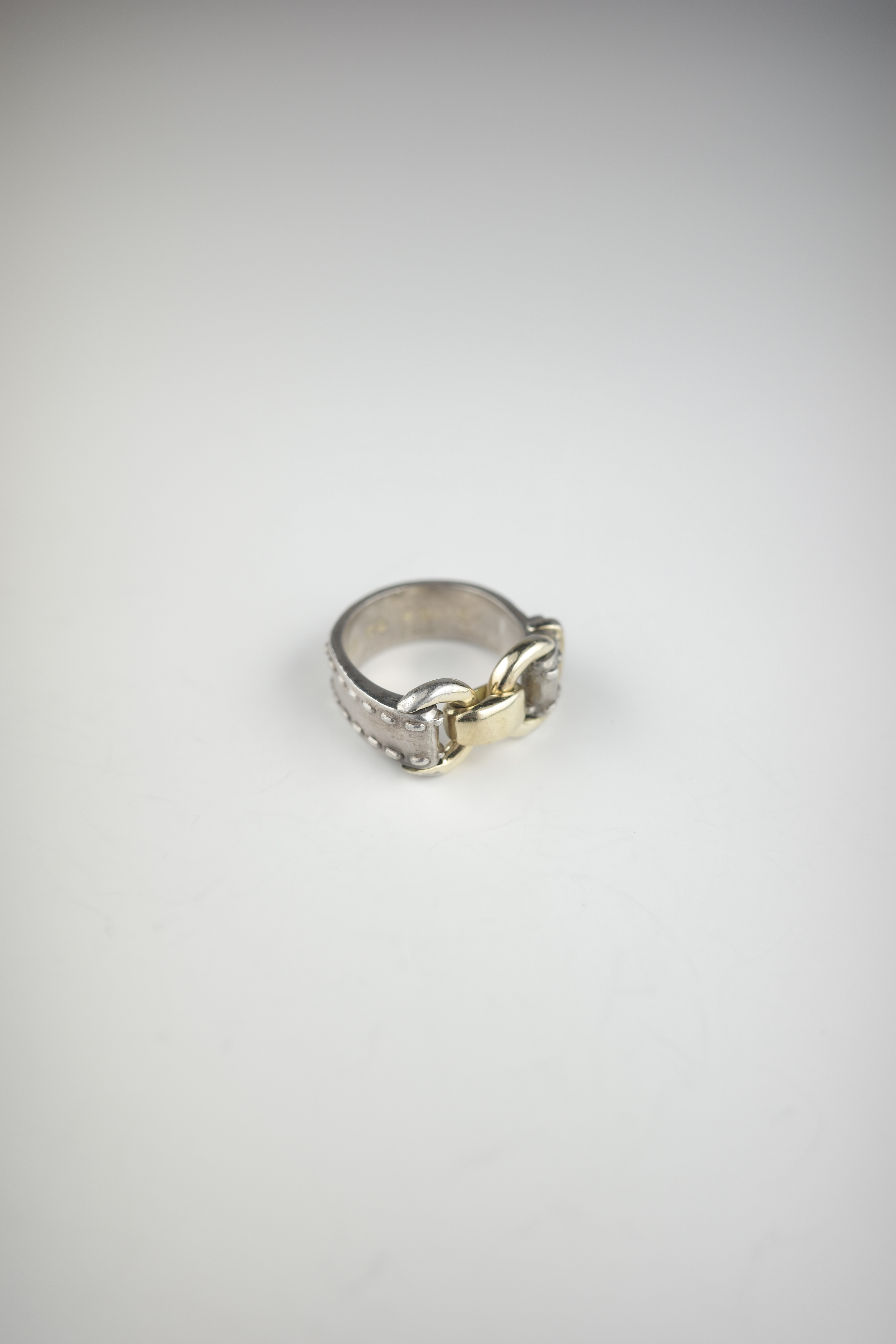 フロントに施された独特の金具モチーフが印象的な、Hermèsの「Montevideo(モンテヴィデオ)」リング。K18ゴールドとSV925シルバーによるコンビネーション仕様で、異なる素材が生み出すコントラストが美しく、程よいボリューム感がありながらも着用時のバランスが良い存在感のあるアイテム。モンテヴィデオはK18ゴールドの割合が違うモデルが存在し、こちらはゴールド部を多く配したタイプで希少な一本。ヴィンテージならではの経年変化により、現行品にはない柔らかな光沢と深みのある表情も魅力で、日常使いから特別なシーンまで幅広く活躍する、タイムレスなヴィンテージジュエリーです。
