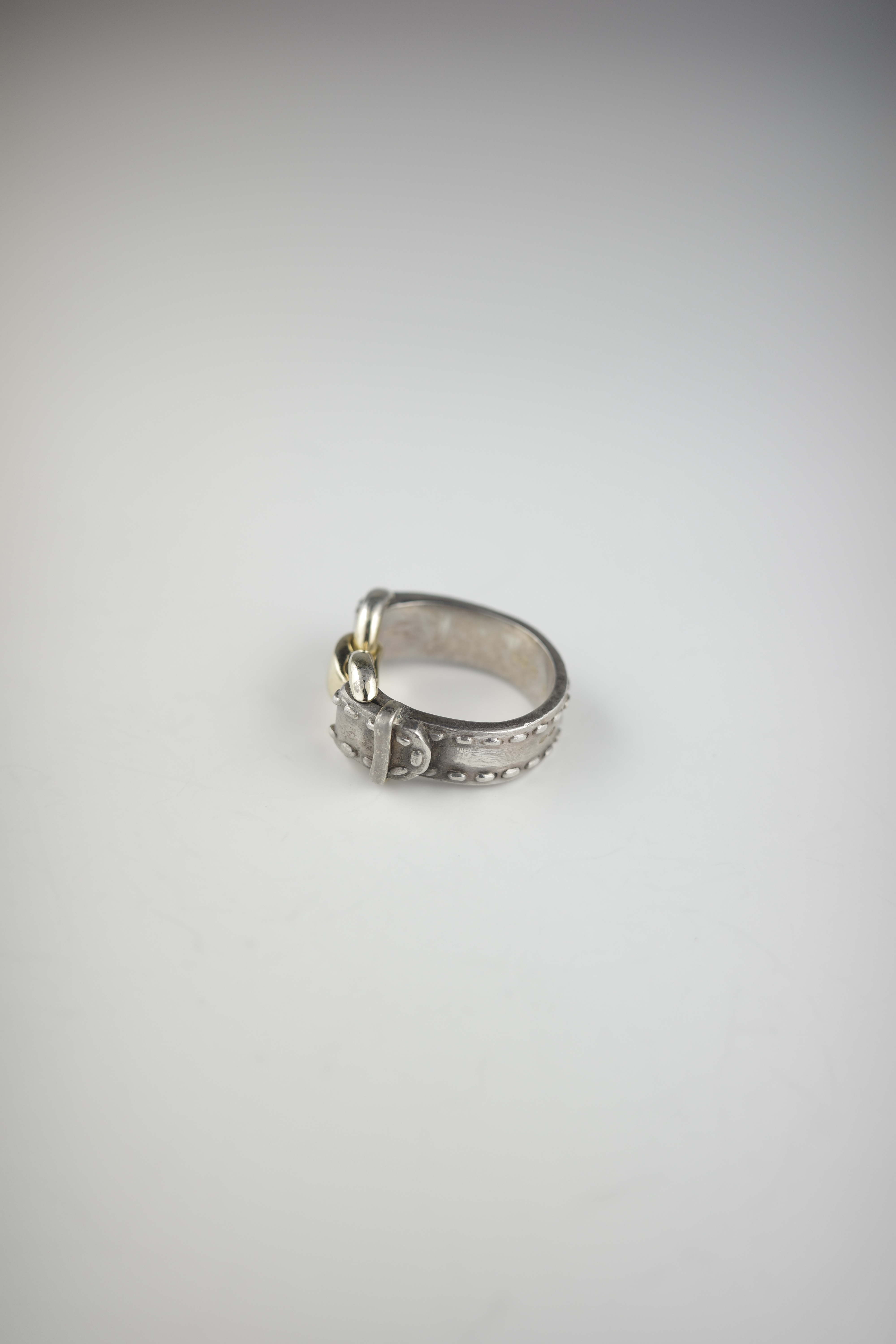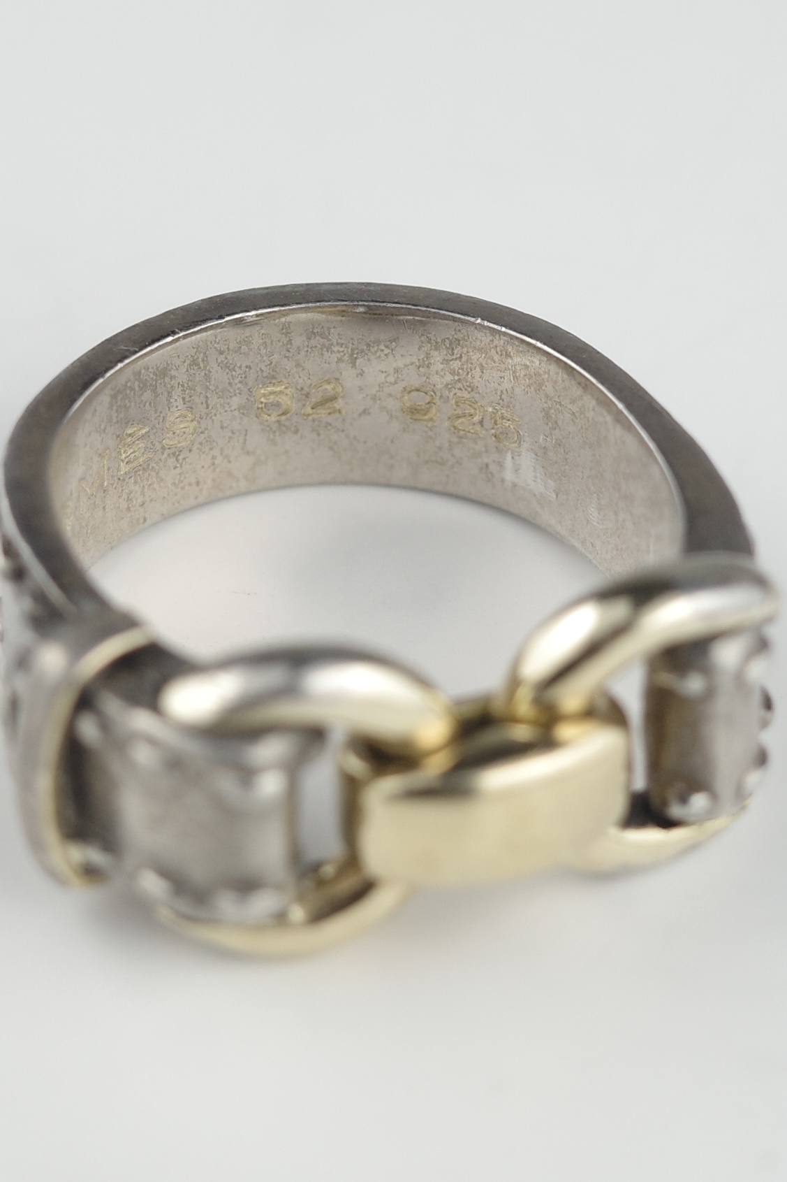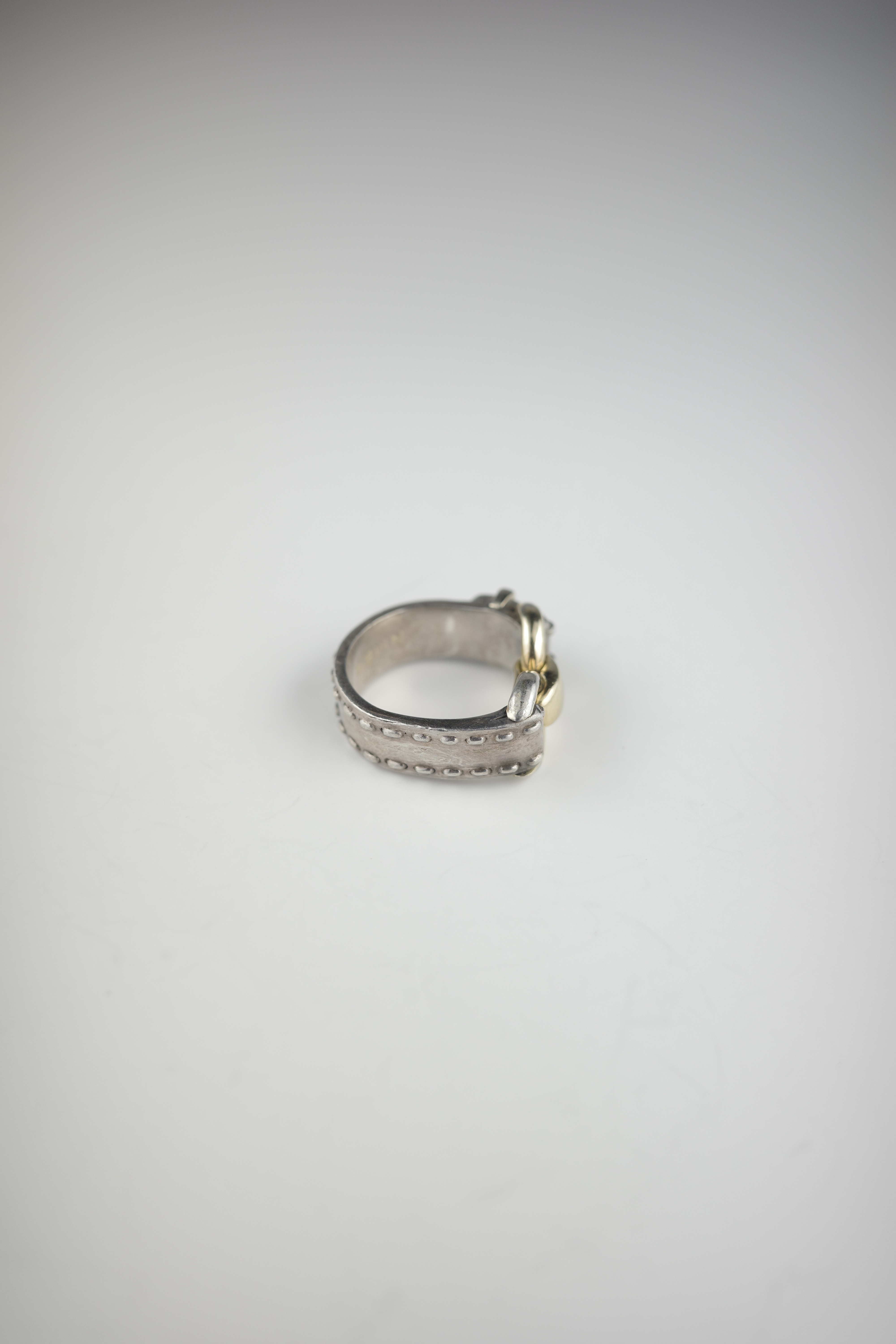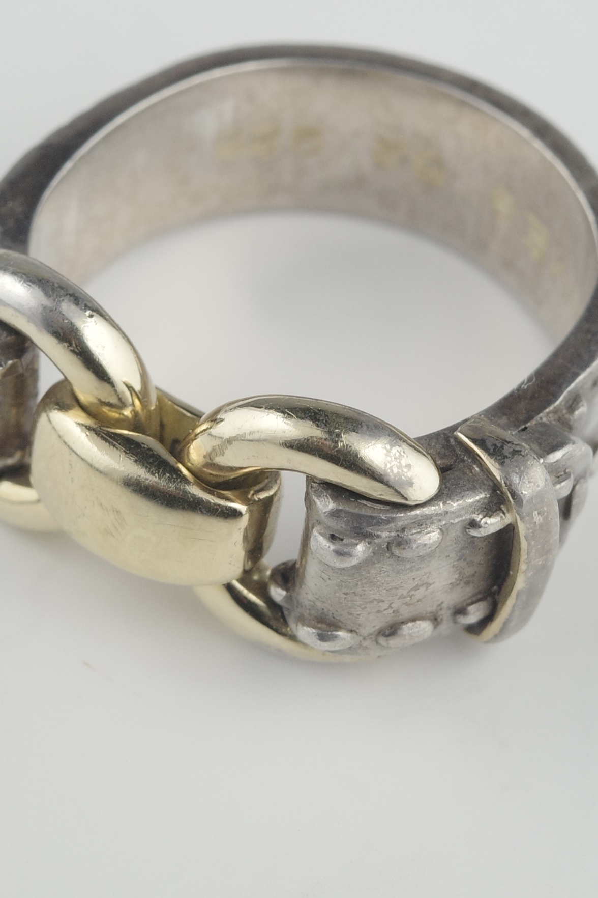 フロントに施された独特の金具モチーフが印象的な、Hermèsの「Montevideo(モンテヴィデオ)」リング。K18ゴールドとSV925シルバーによるコンビネーション仕様で、異なる素材が生み出すコントラストが美しく、程よいボリューム感がありながらも着用時のバランスが良い存在感のあるアイテム。モンテヴィデオはK18ゴールドの割合が違うモデルが存在し、こちらはゴールド部を多く配したタイプで希少な一本。ヴィンテージならではの経年変化により、現行品にはない柔らかな光沢と深みのある表情も魅力で、日常使いから特別なシーンまで幅広く活躍する、タイムレスなヴィンテージジュエリーです。