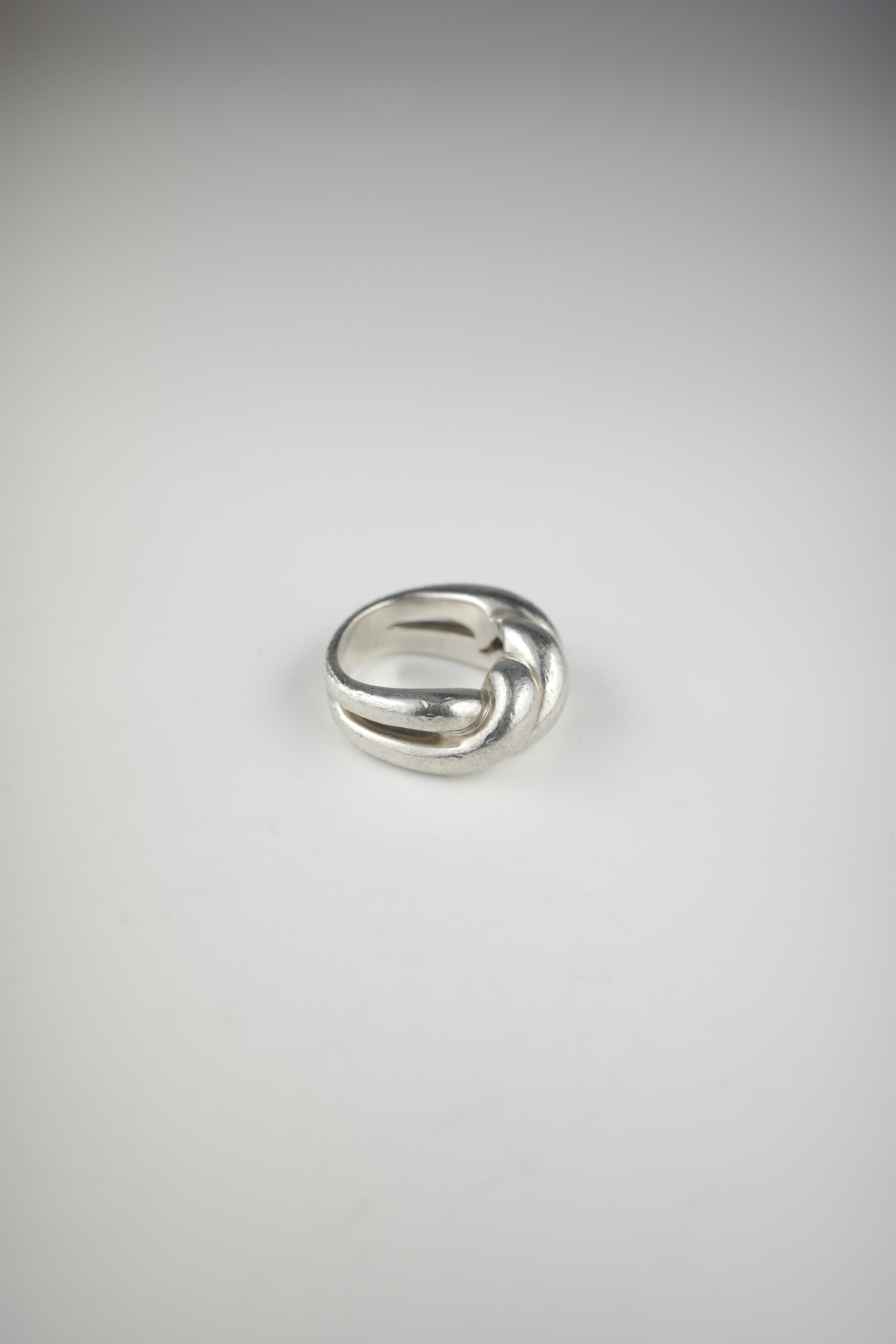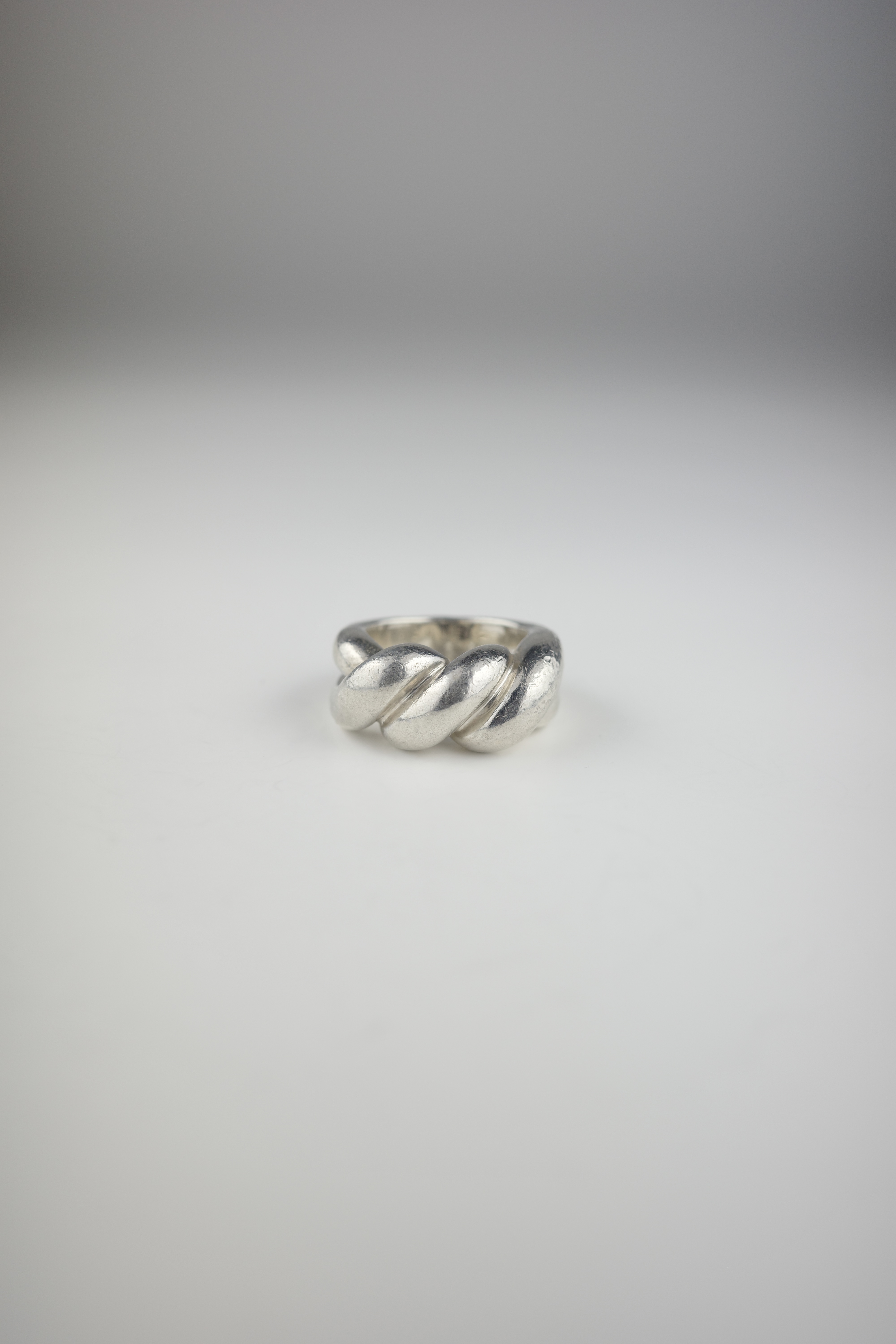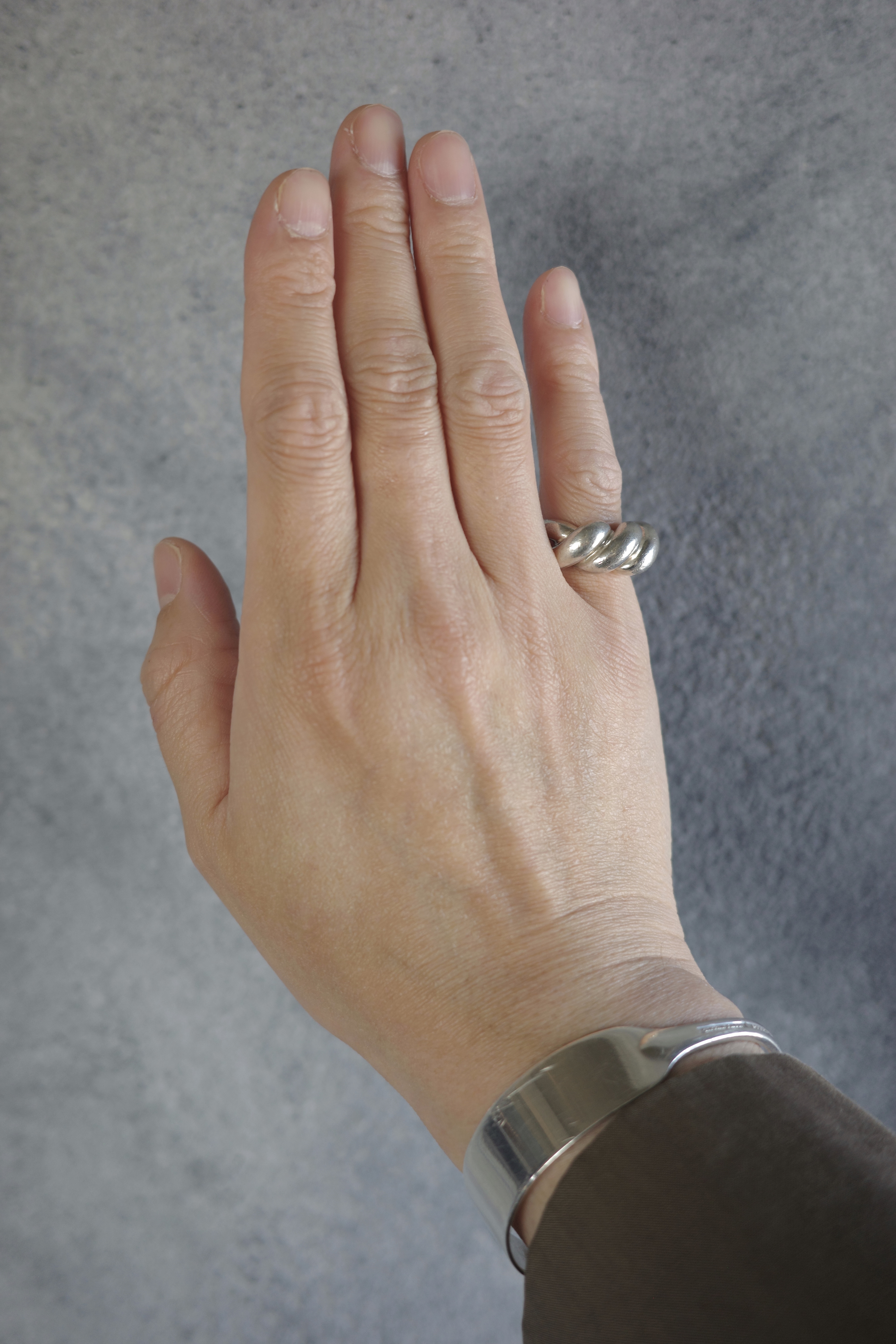 エルメスのヴィンテージのトルサードリング。「Torsade(トルサード)」はフランス語で“ねじれ”を意味し、その名の通りロープを撚り合わせたような立体感のあるデザインが特徴。エルメスらしい上質なシルバーの質感と、職人技が感じられる滑らかな曲線美が際立つ一本です。本個体は一般的に流通しているトルサードリングに比べ、ひと回りほどボリュームのあるラージタイプ。このサイズ感の個体は流通数が少なく、市場でも希少性の高いアイテムです。シンプルでありながら造形の完成度が高く、ヴィンテージエルメスならではの風格と、時代を超えて愛される普遍的な美しさを兼ね備えた逸品。